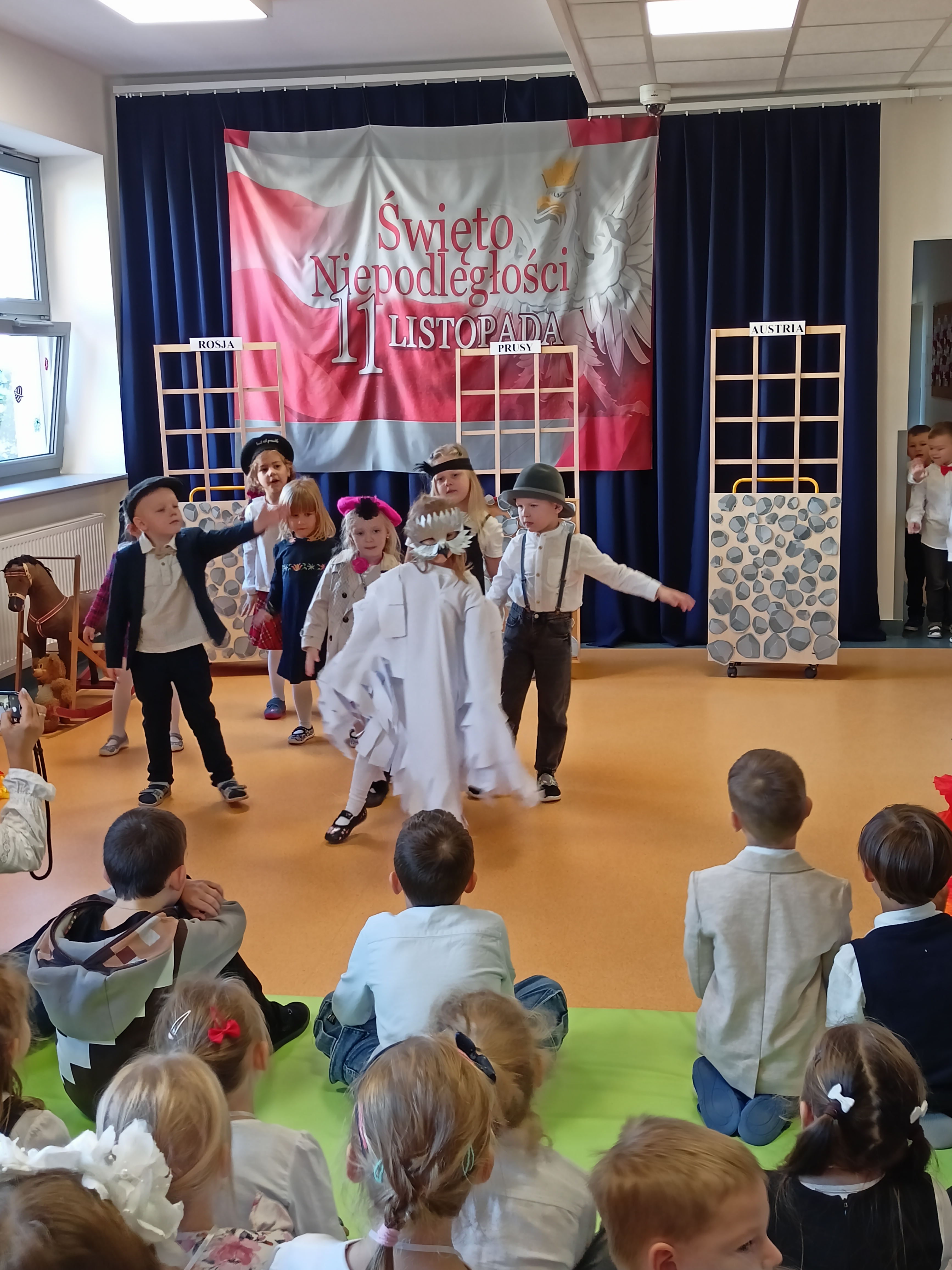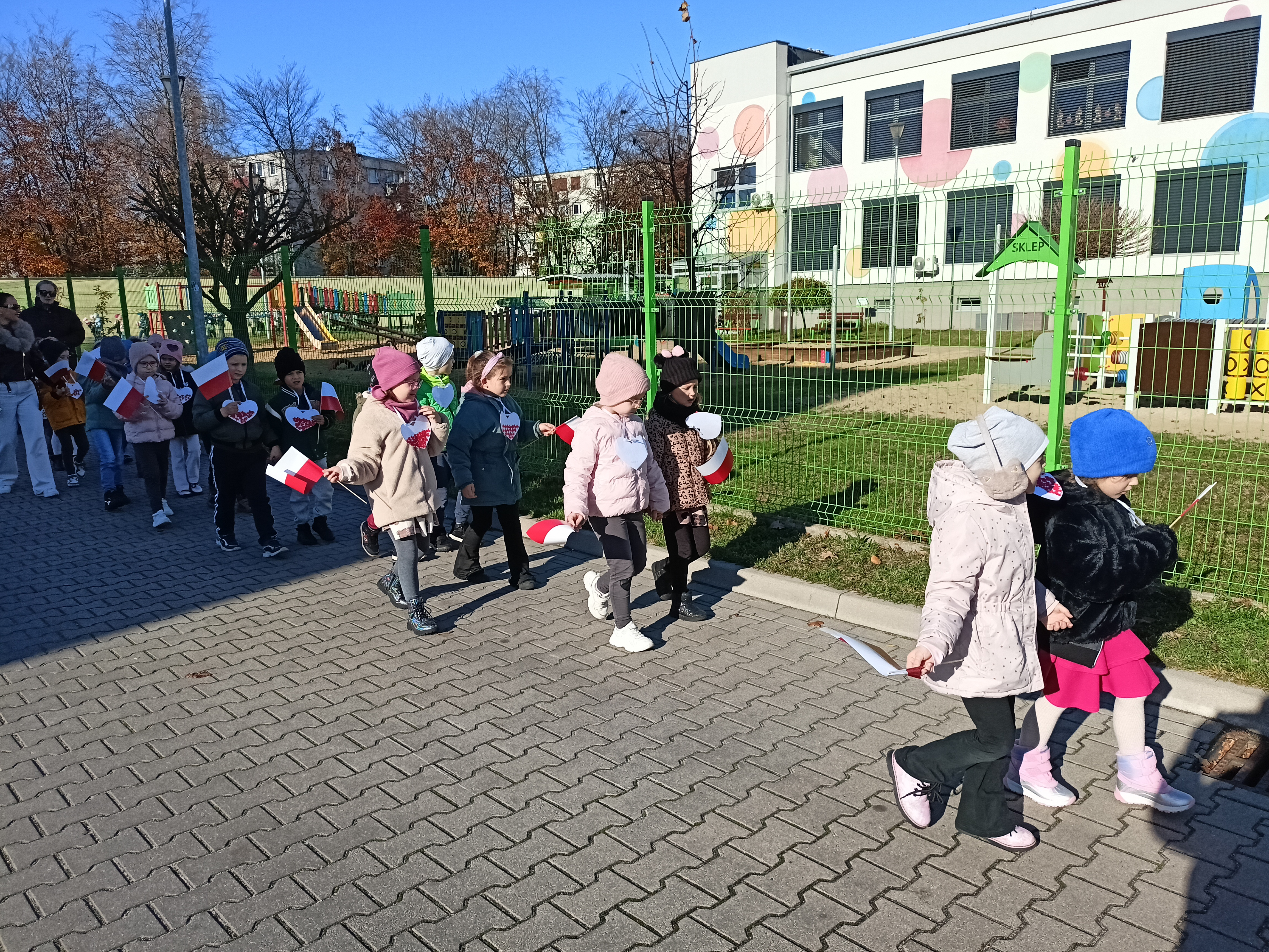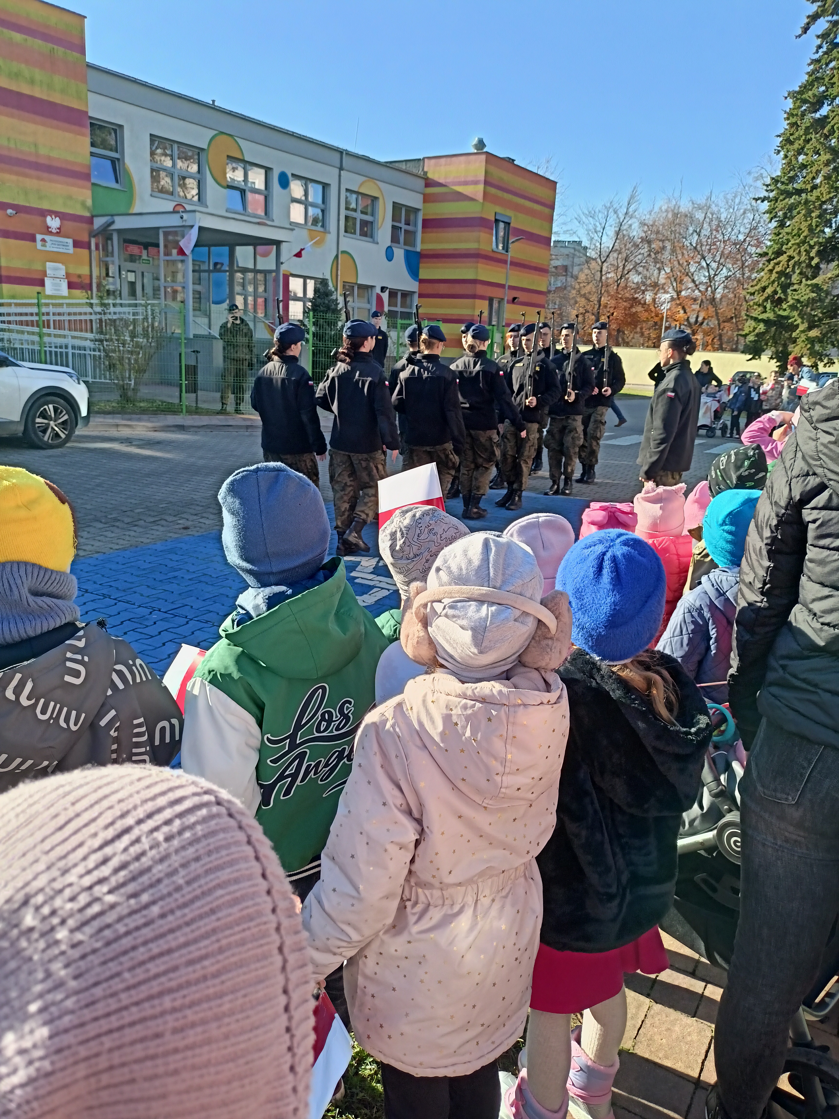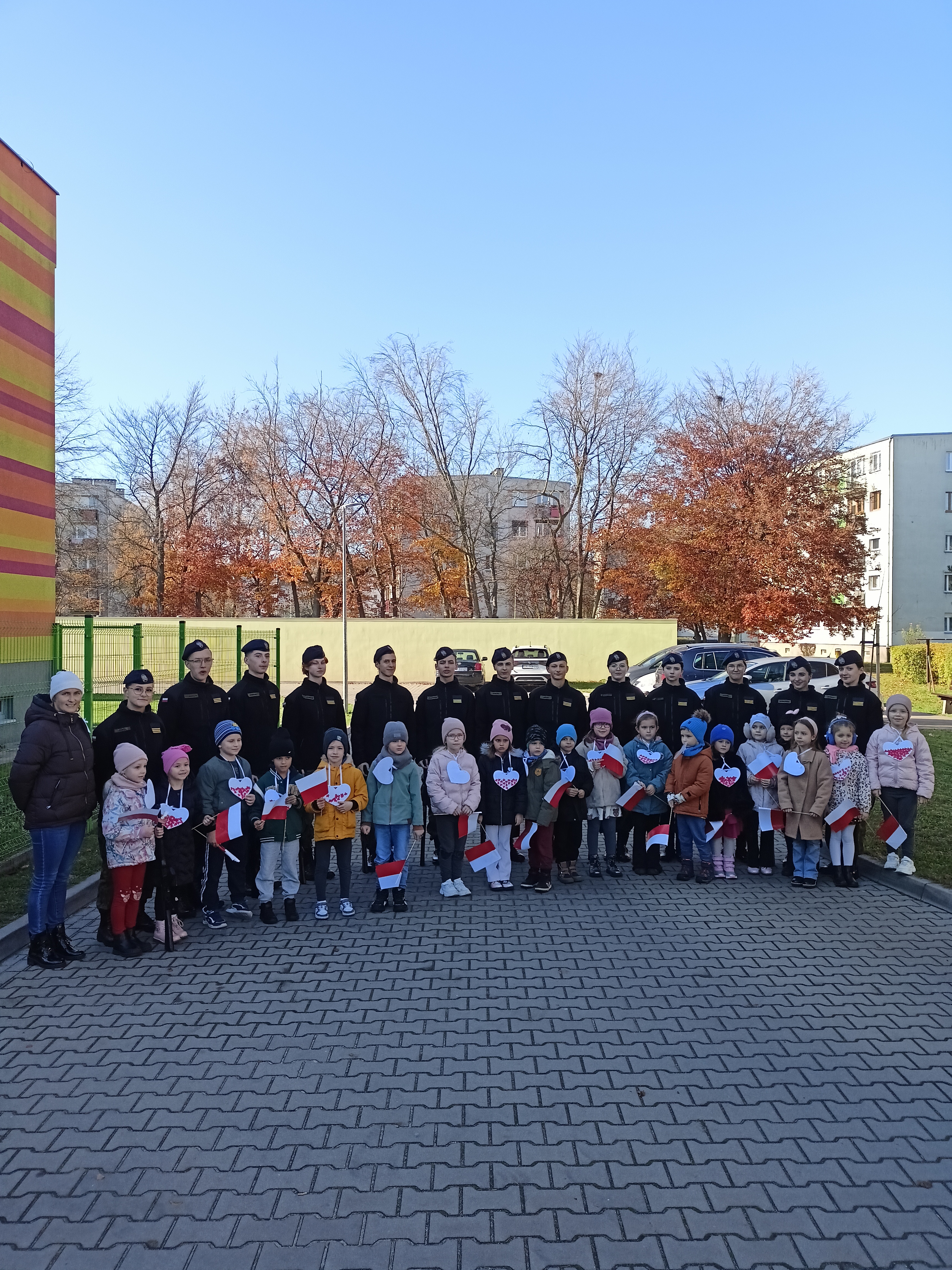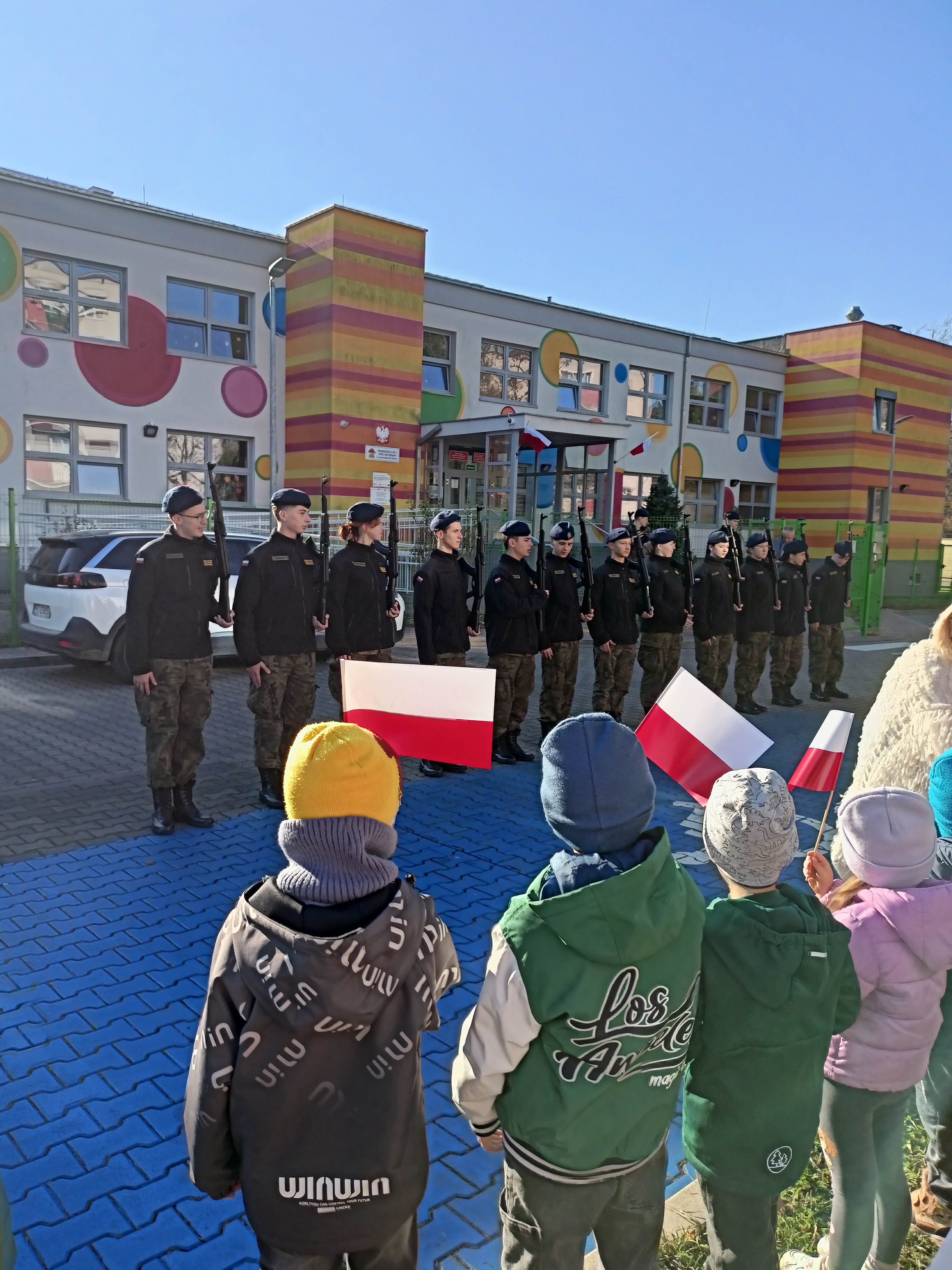 Dzieci z okazji Święta Niepodległości wzięły udział w uroczystym, pięknym przedstawieniu. Przed przedszkolem wspólnie odśpiewaliśmy hymn, a potem przeszliśmy wokół przedszkola. Na koniec odwiedzili nas uczniowie z klasy mundurowej, którzy przedstawili musztrę.