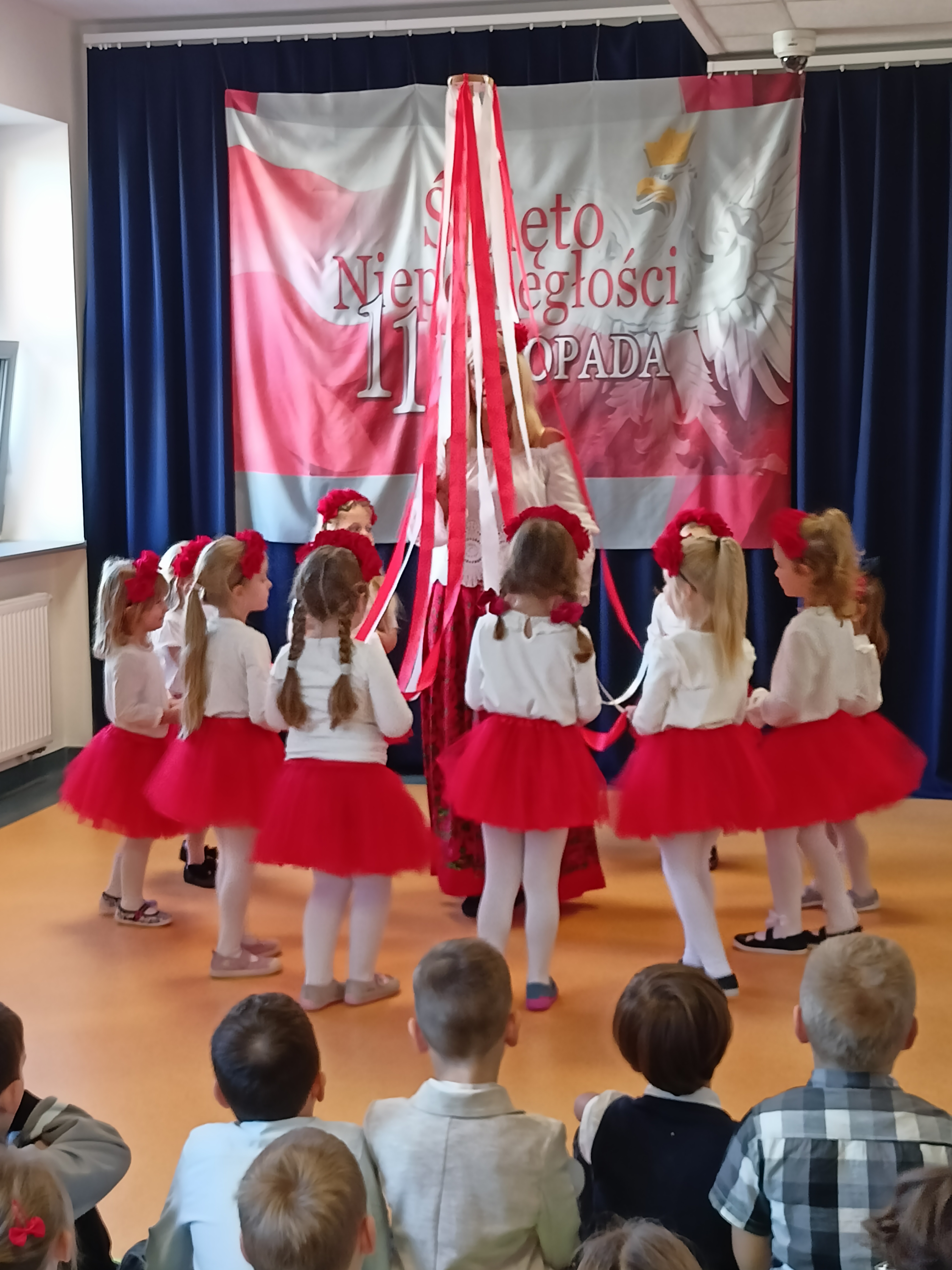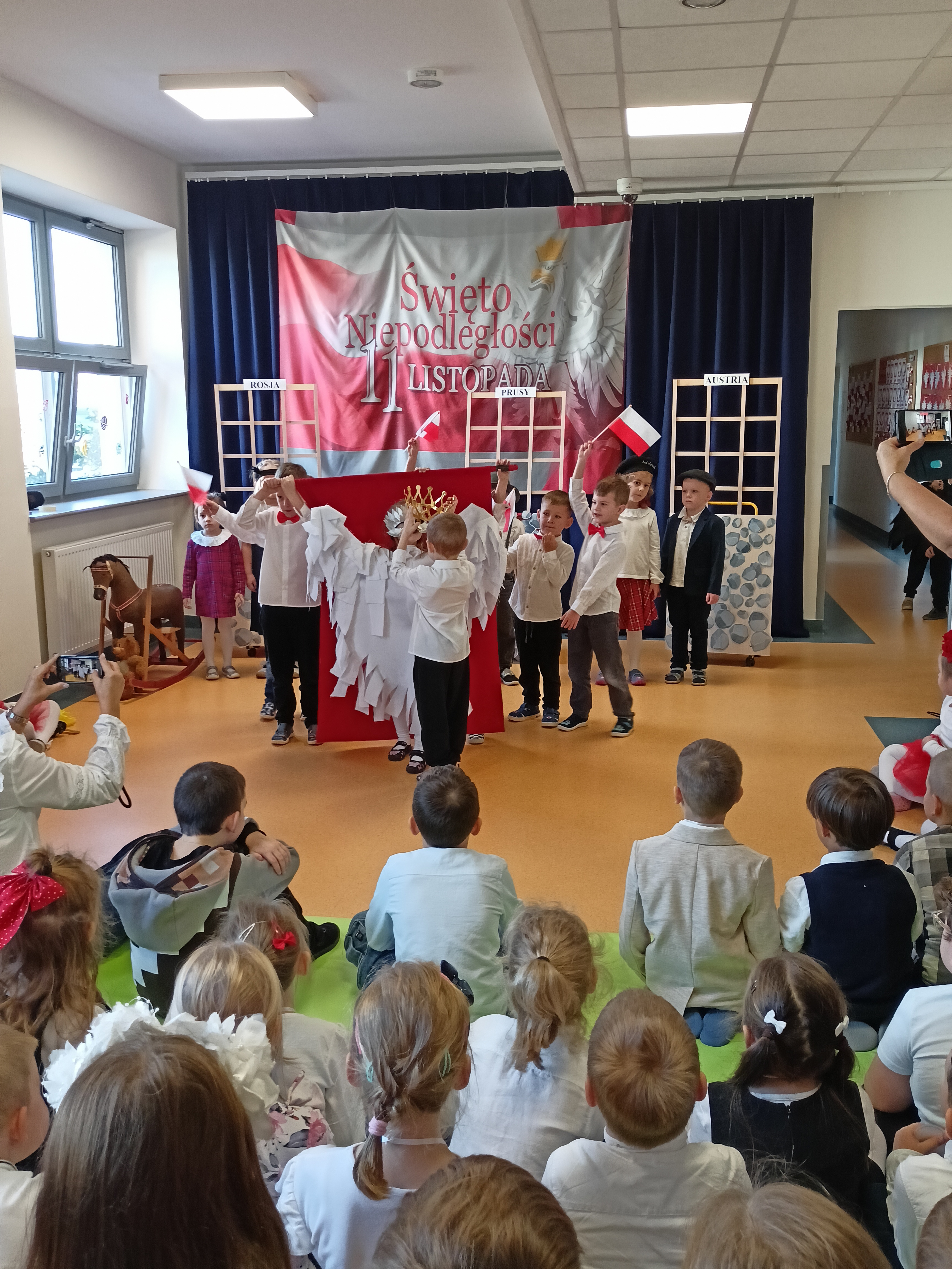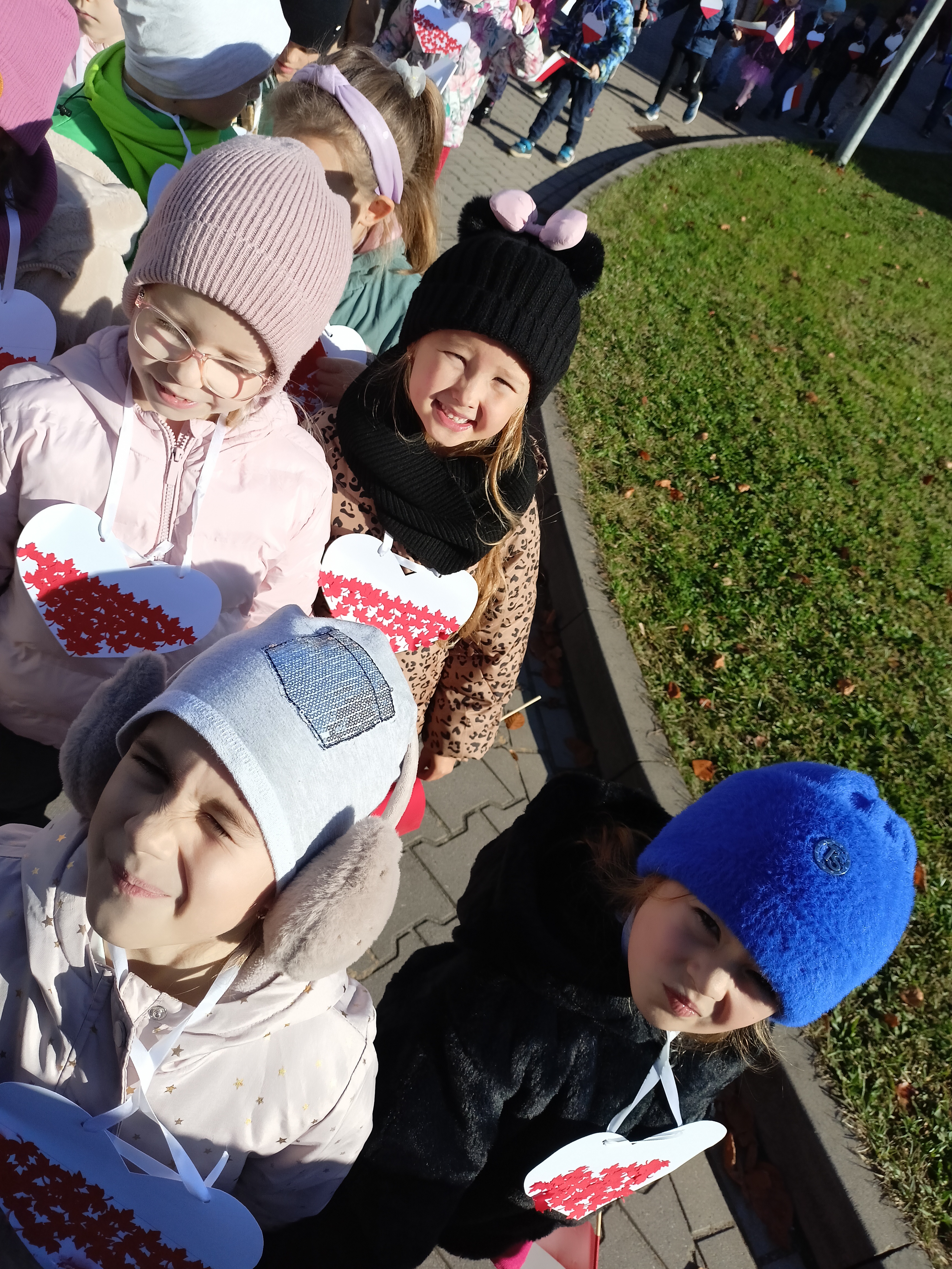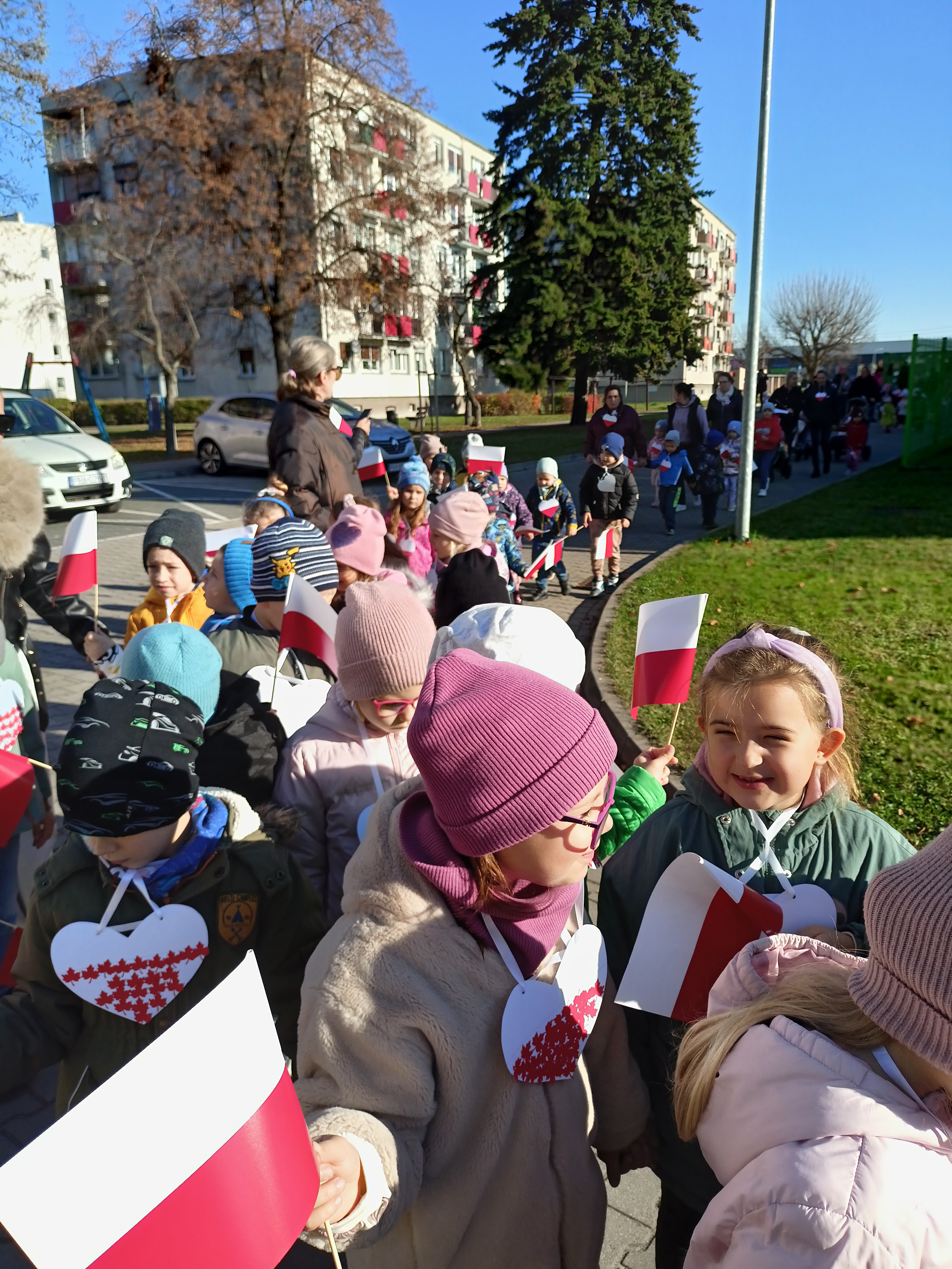 Dzieci z okazji Święta Niepodległości wzięły udział w uroczystym, pięknym przedstawieniu. Przed przedszkolem wspólnie odśpiewaliśmy hymn, a potem przeszliśmy wokół przedszkola. Na koniec odwiedzili nas uczniowie z klasy mundurowej, którzy przedstawili musztrę.