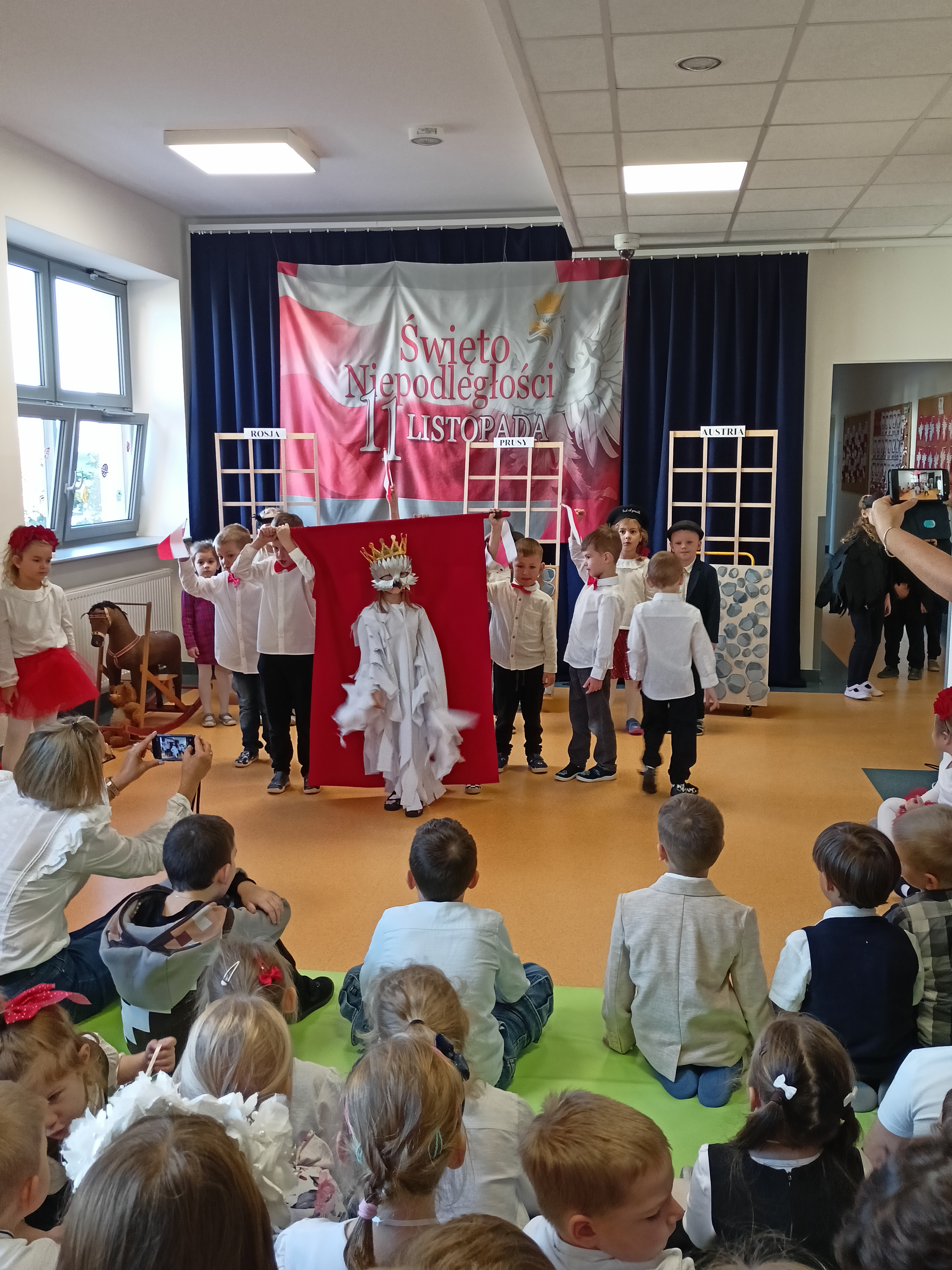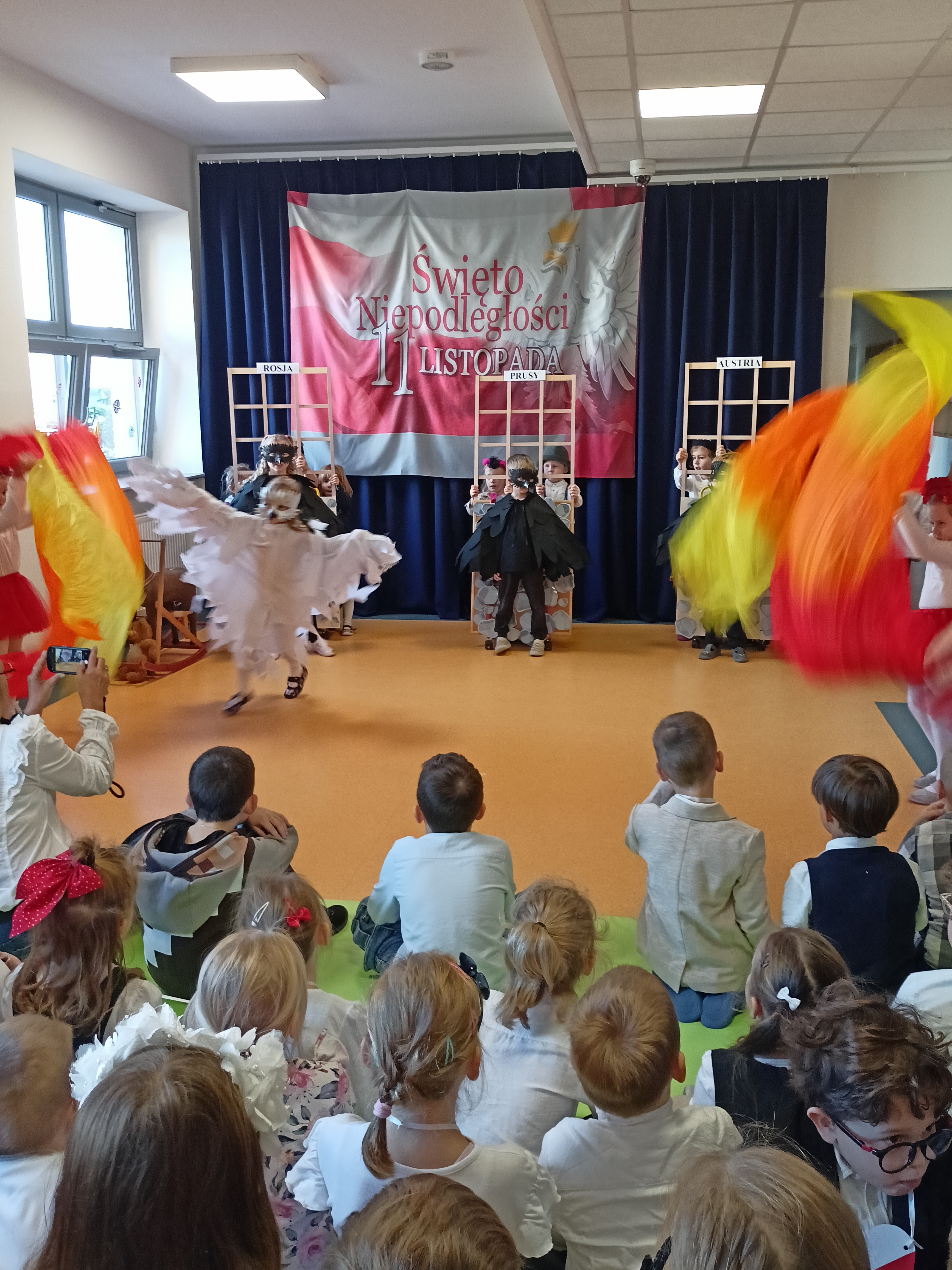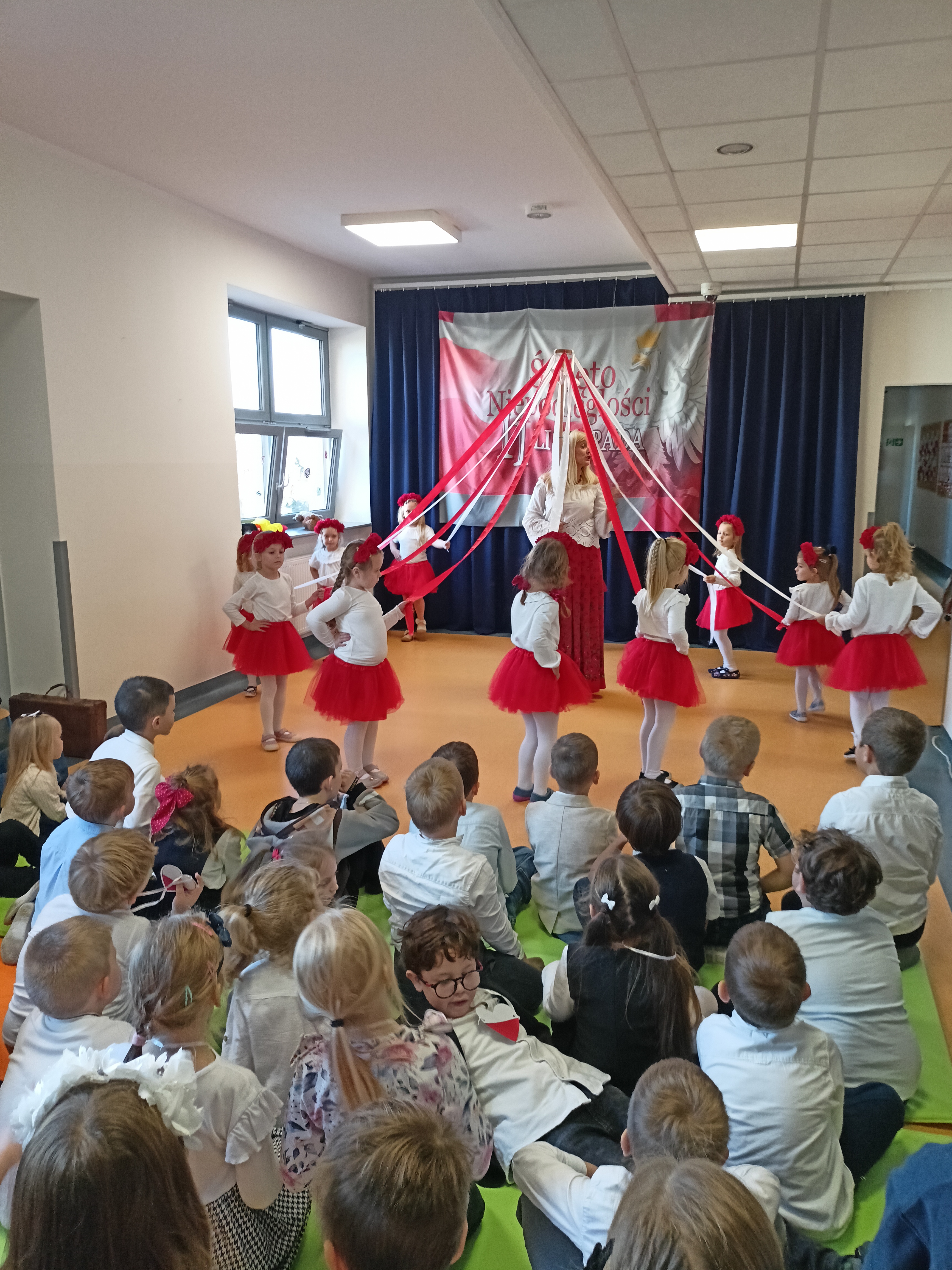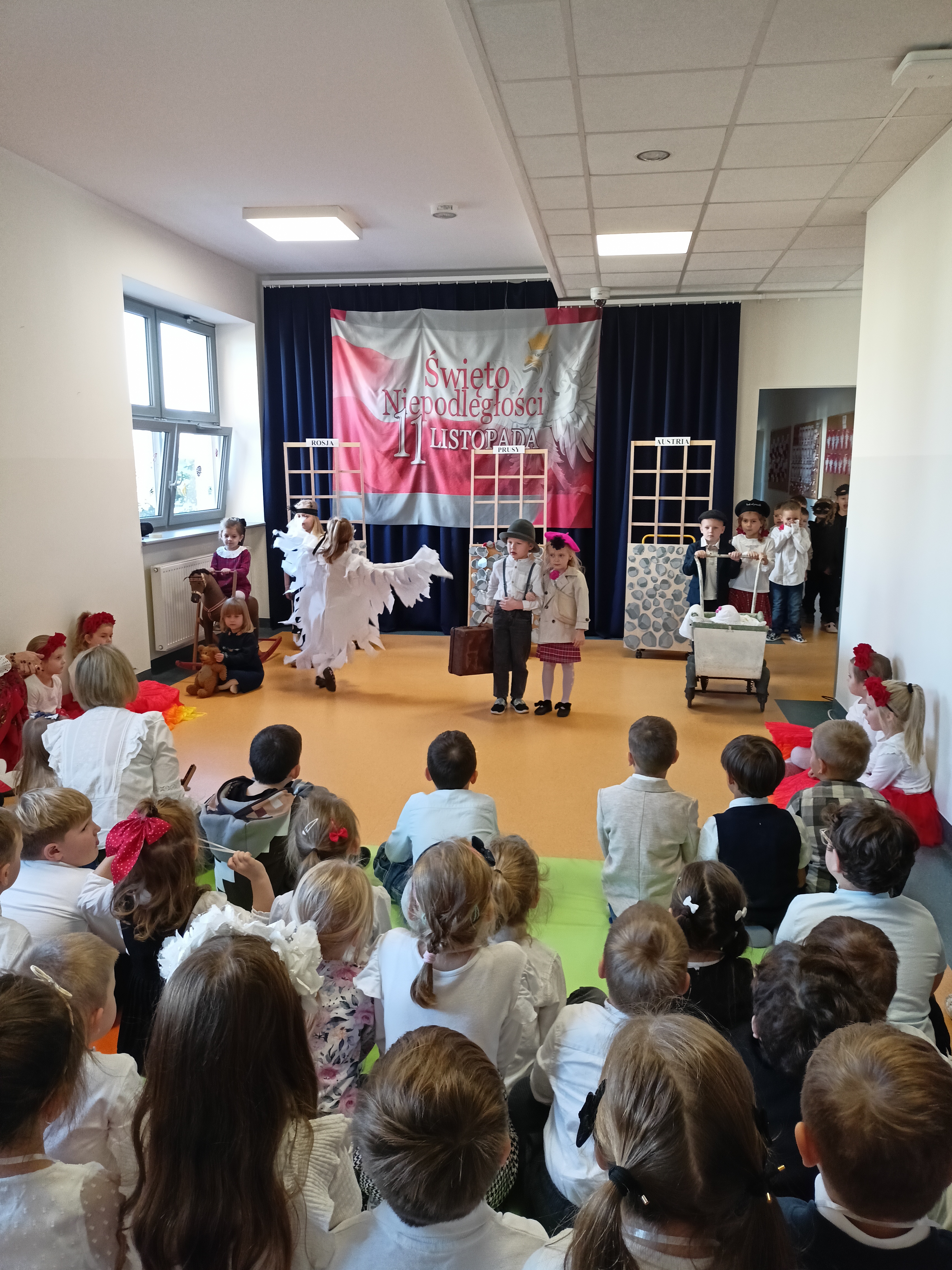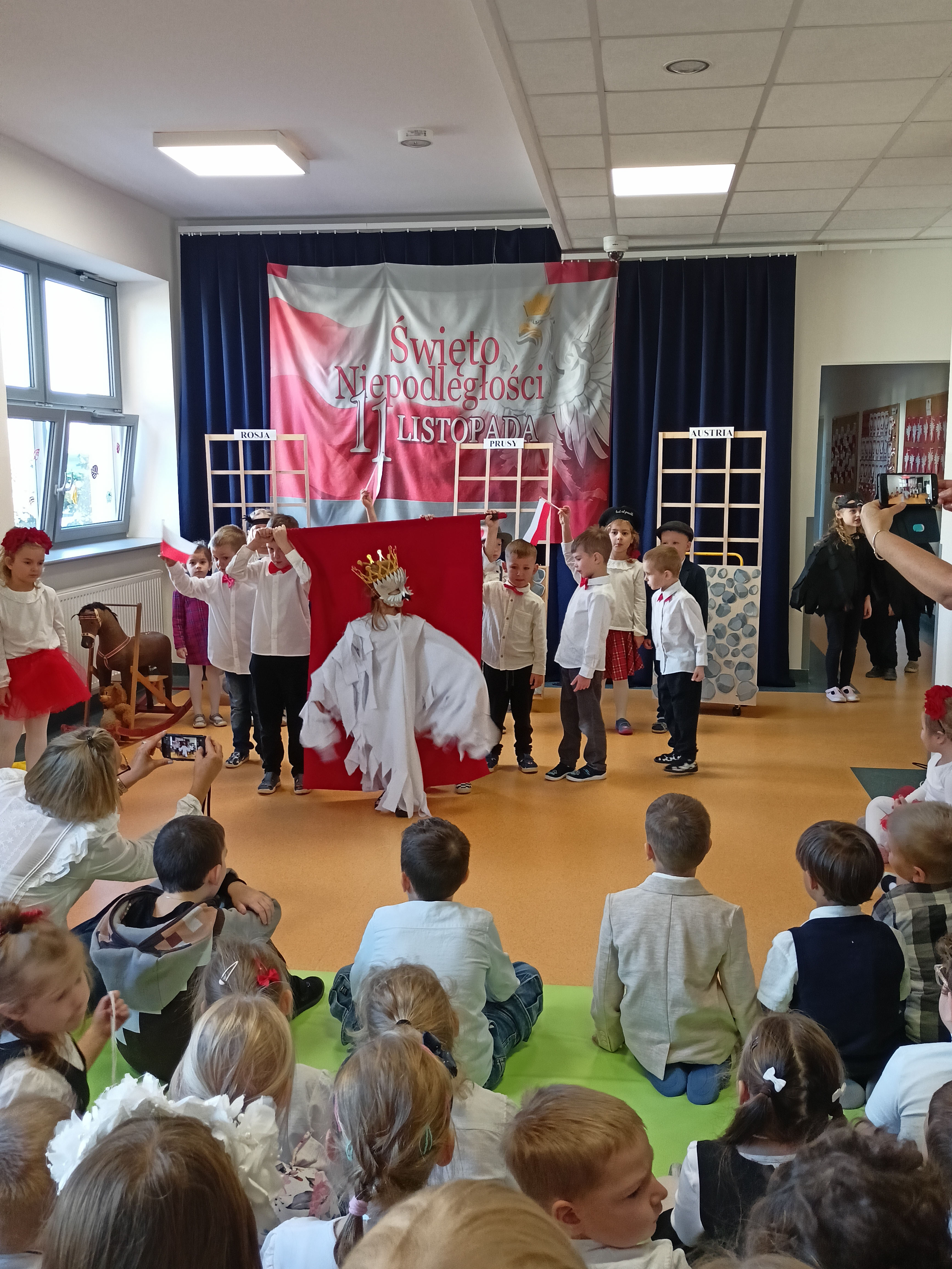 Dzieci z okazji Święta Niepodległości wzięły udział w uroczystym, pięknym przedstawieniu. Przed przedszkolem wspólnie odśpiewaliśmy hymn, a potem przeszliśmy wokół przedszkola. Na koniec odwiedzili nas uczniowie z klasy mundurowej, którzy przedstawili musztrę.
