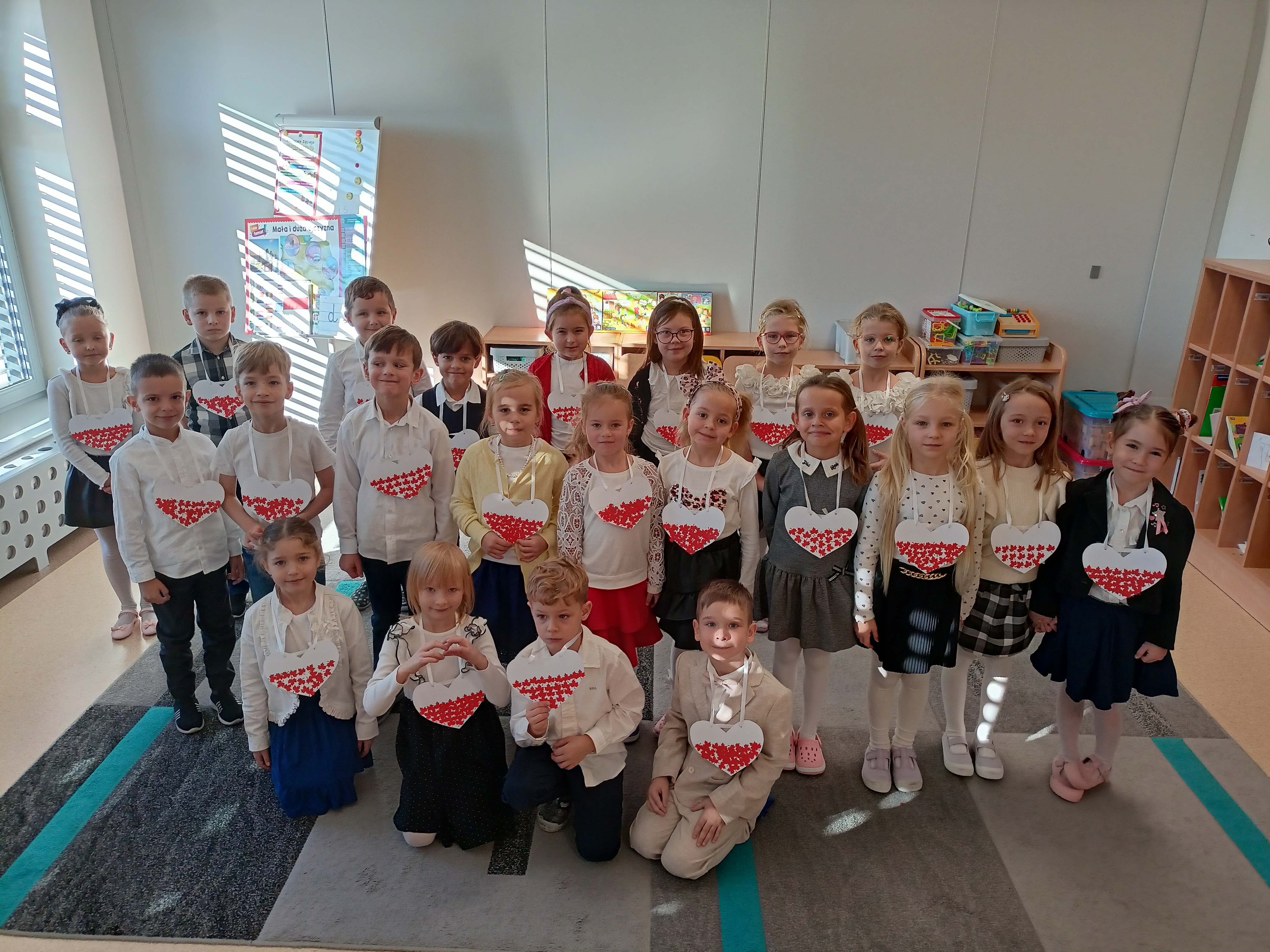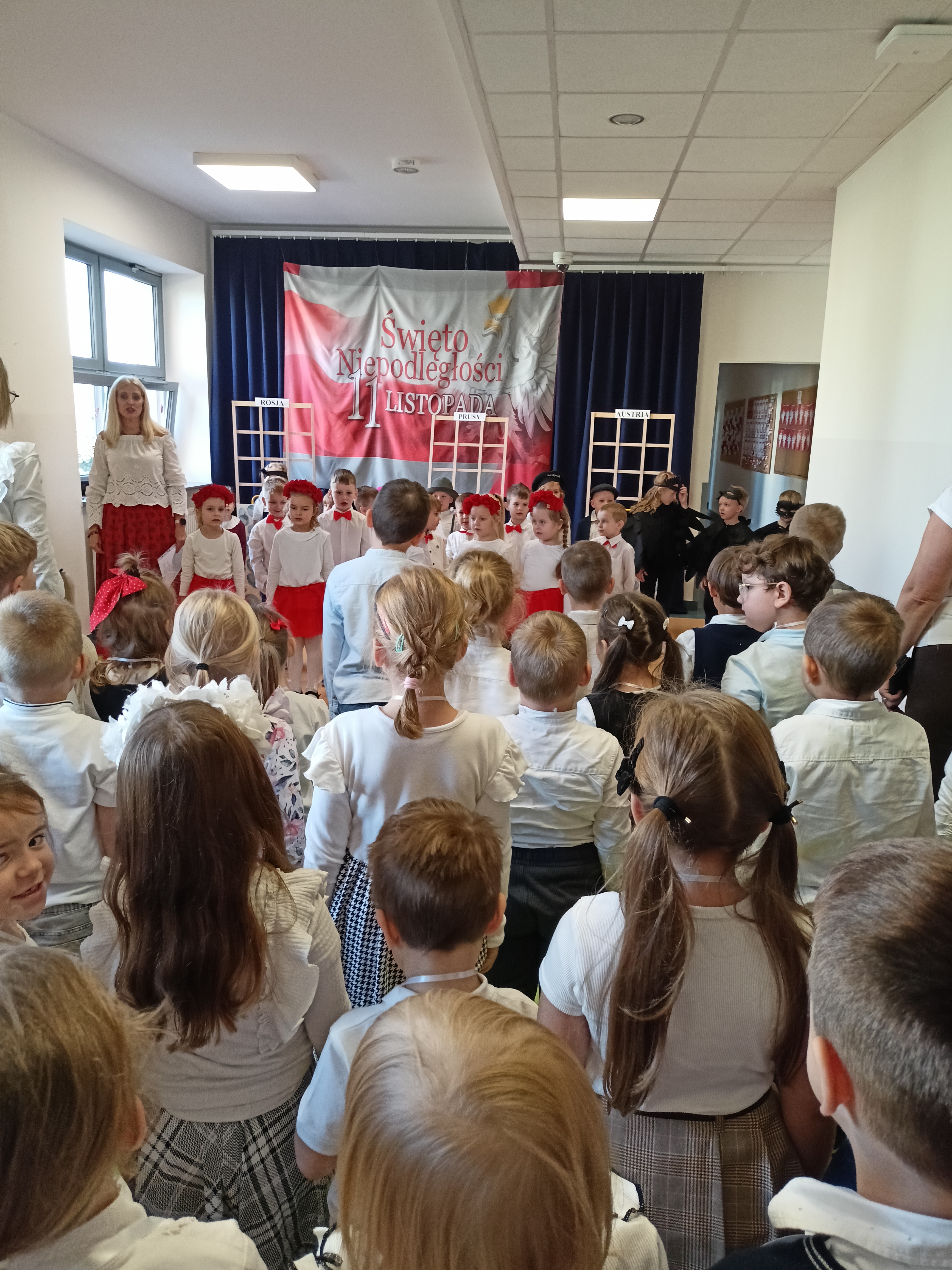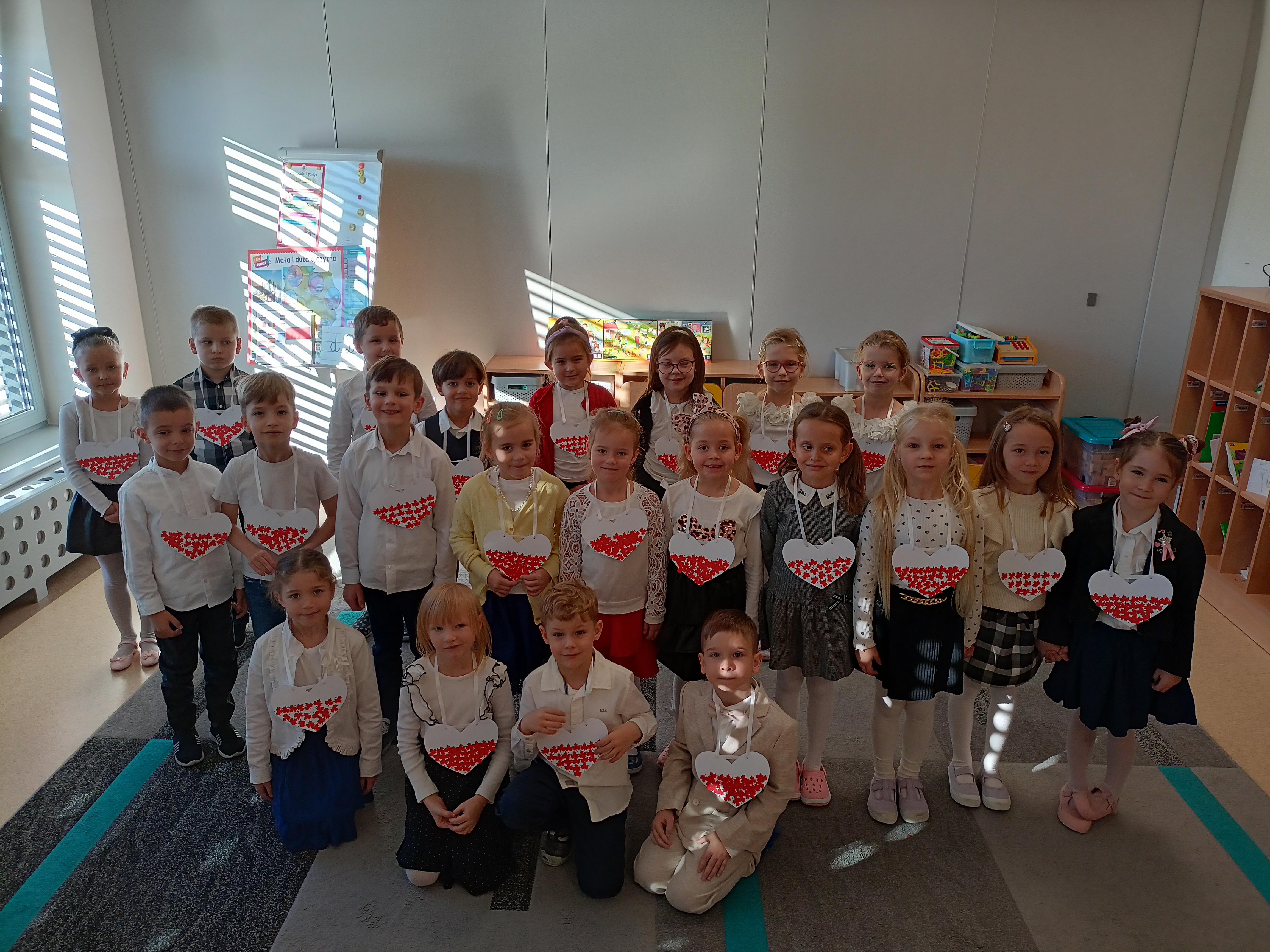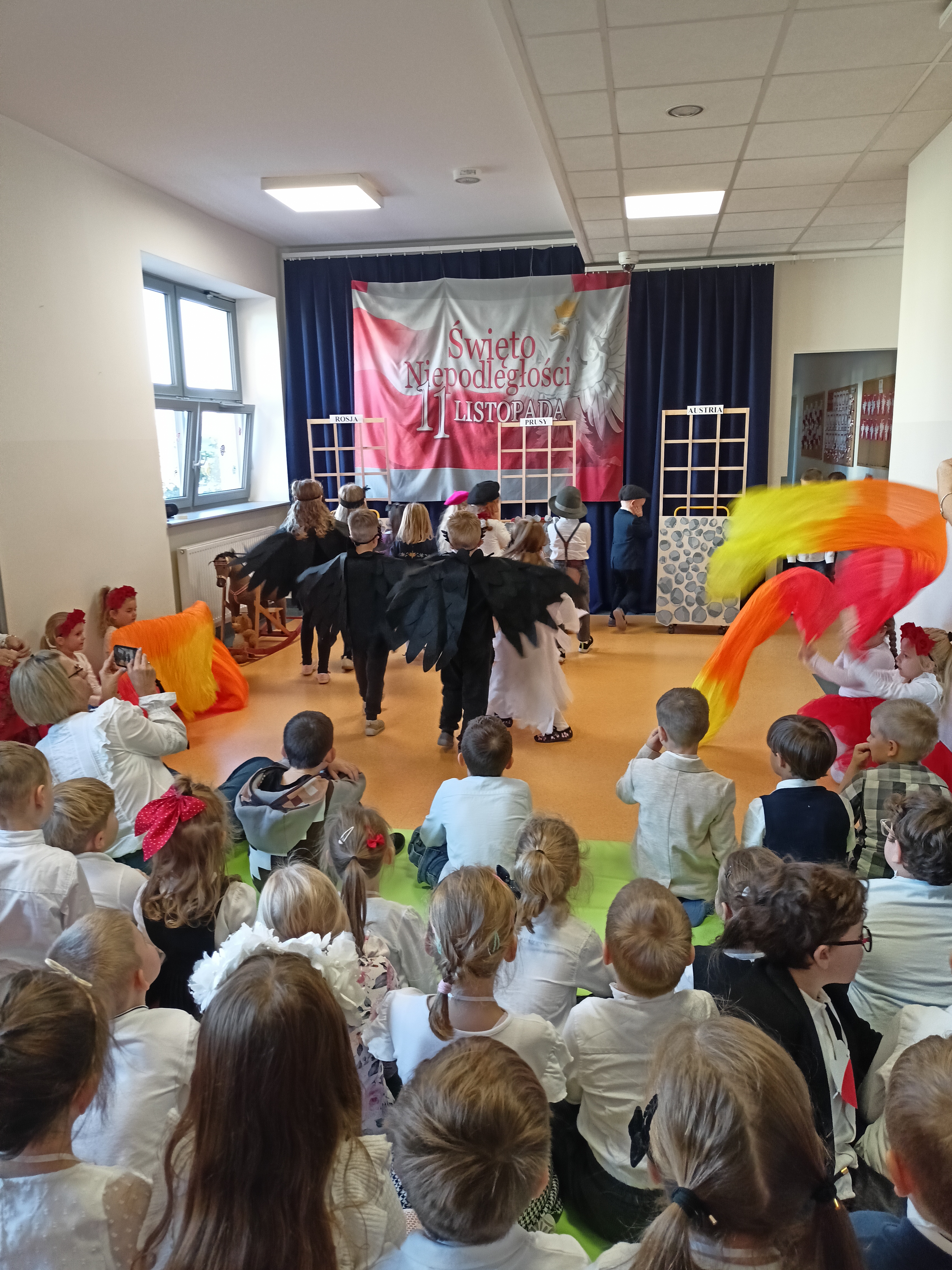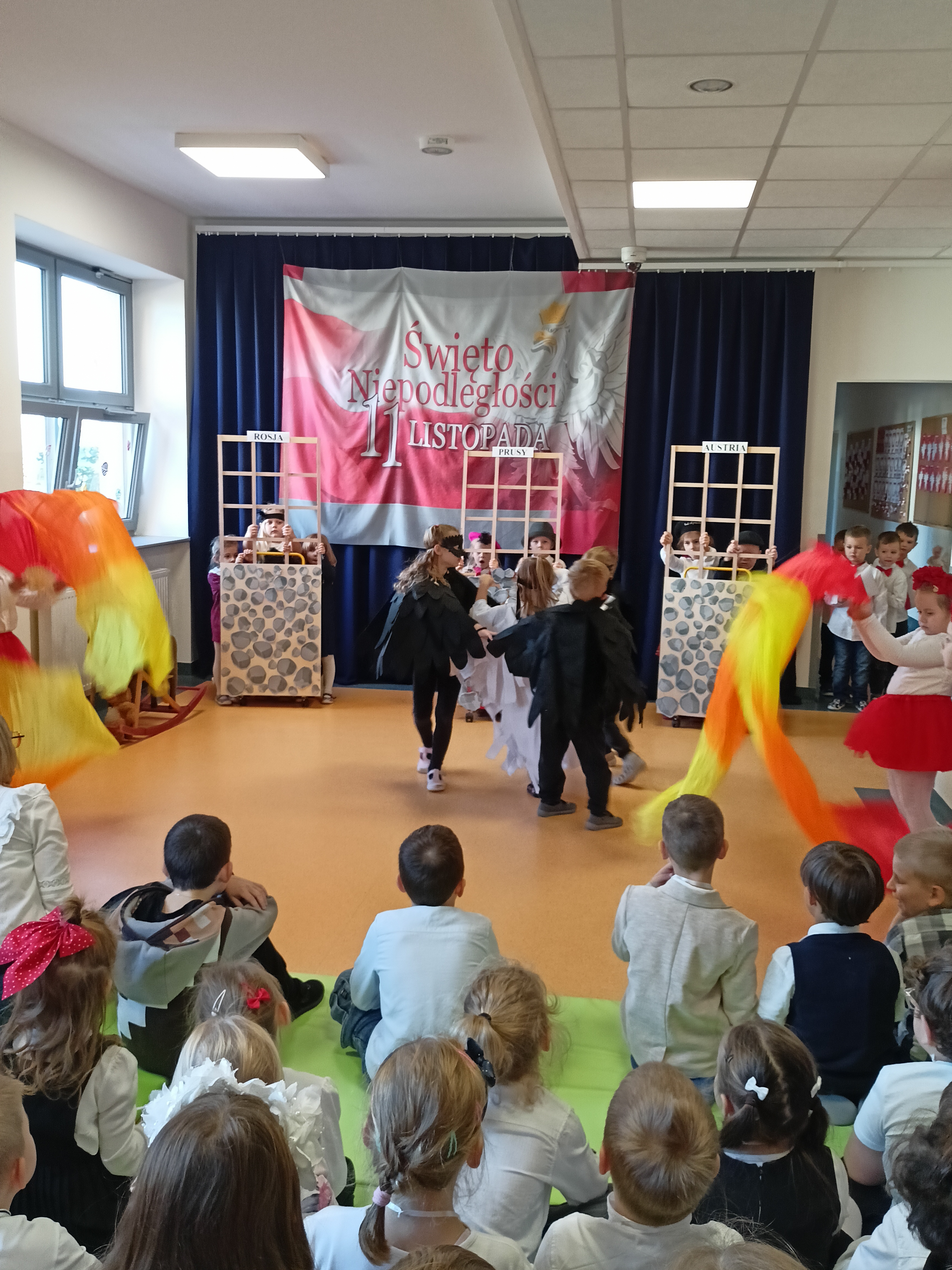 Dzieci z okazji Święta Niepodległości wzięły udział w uroczystym, pięknym przedstawieniu. Przed przedszkolem wspólnie odśpiewaliśmy hymn, a potem przeszliśmy wokół przedszkola. Na koniec odwiedzili nas uczniowie z klasy mundurowej, którzy przedstawili musztrę.