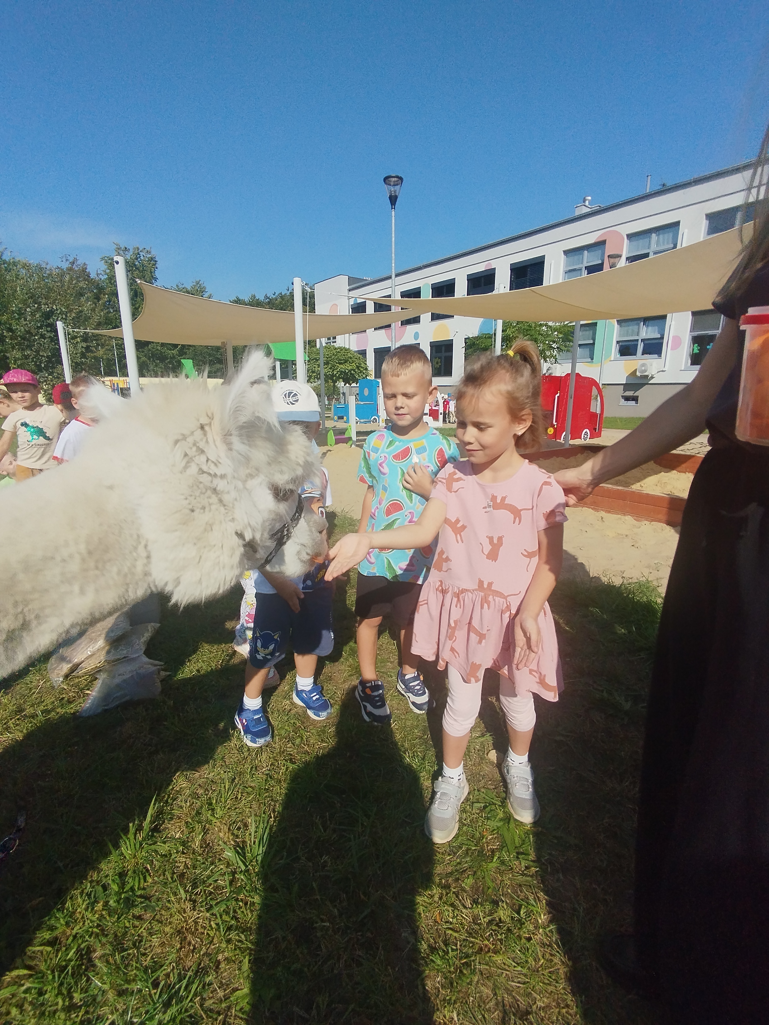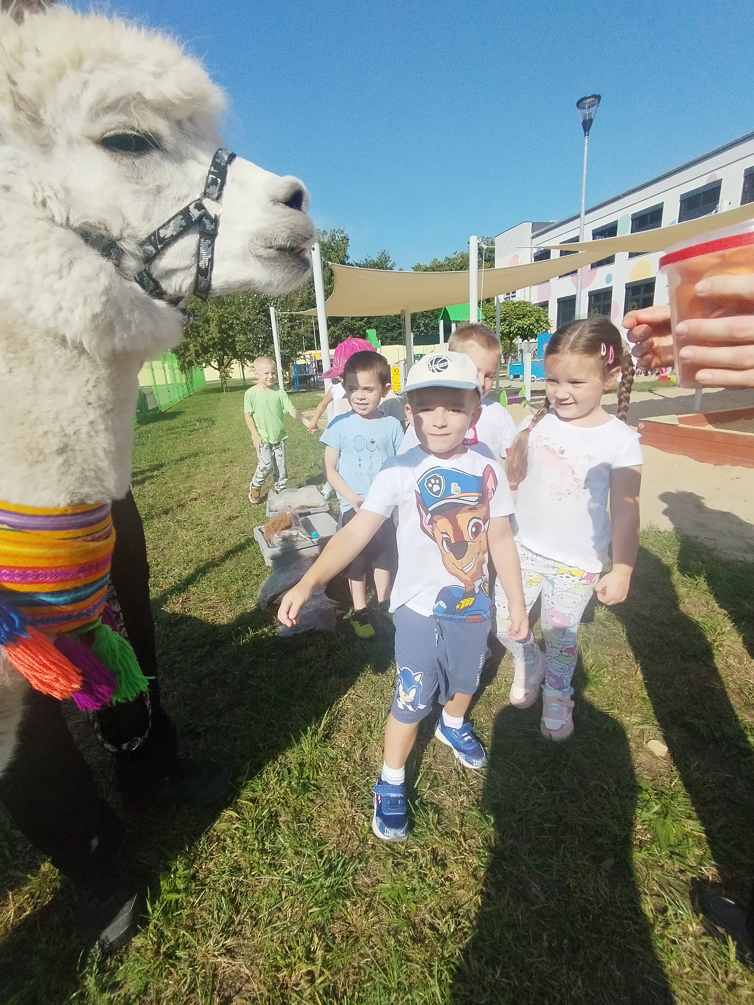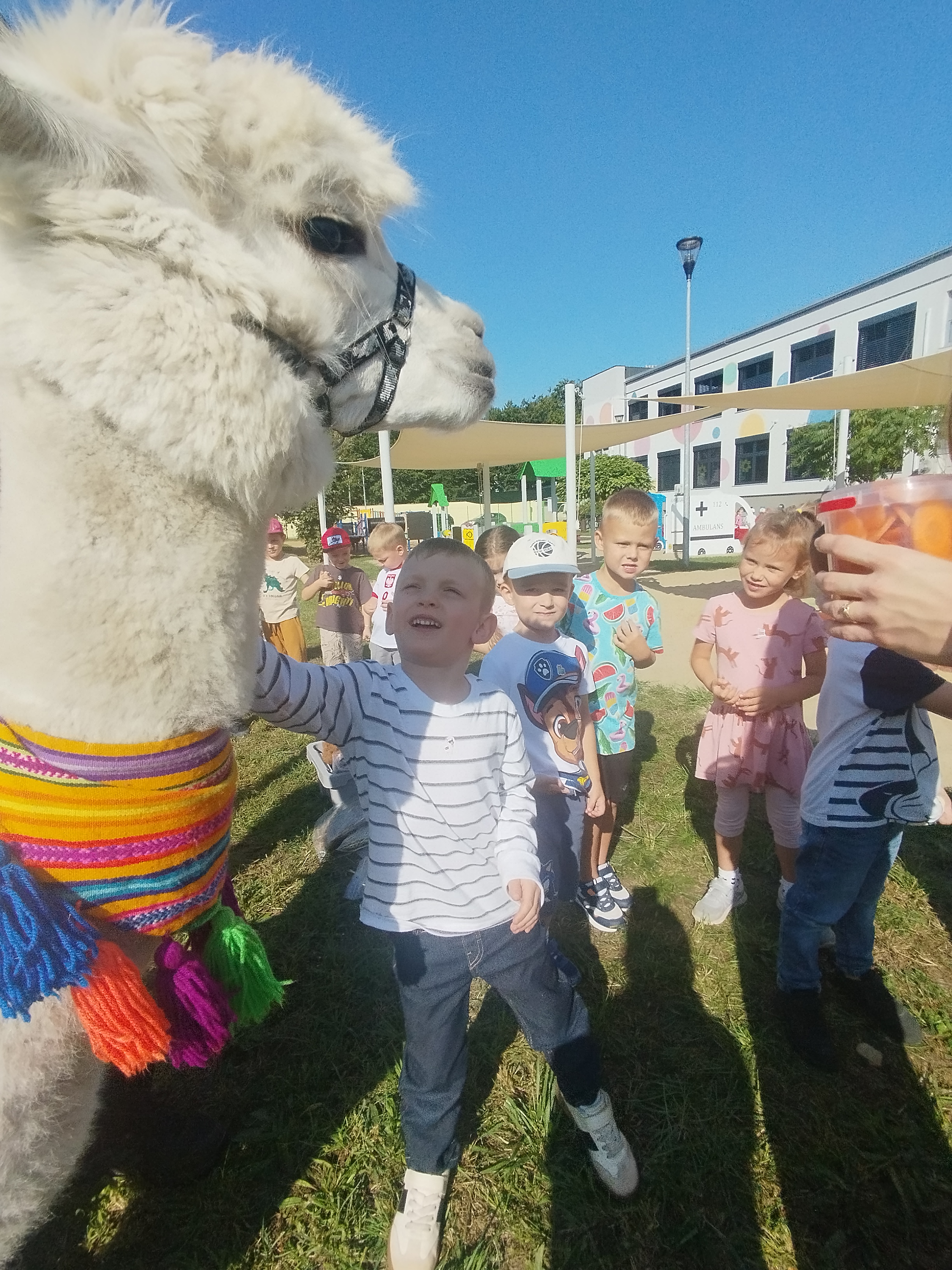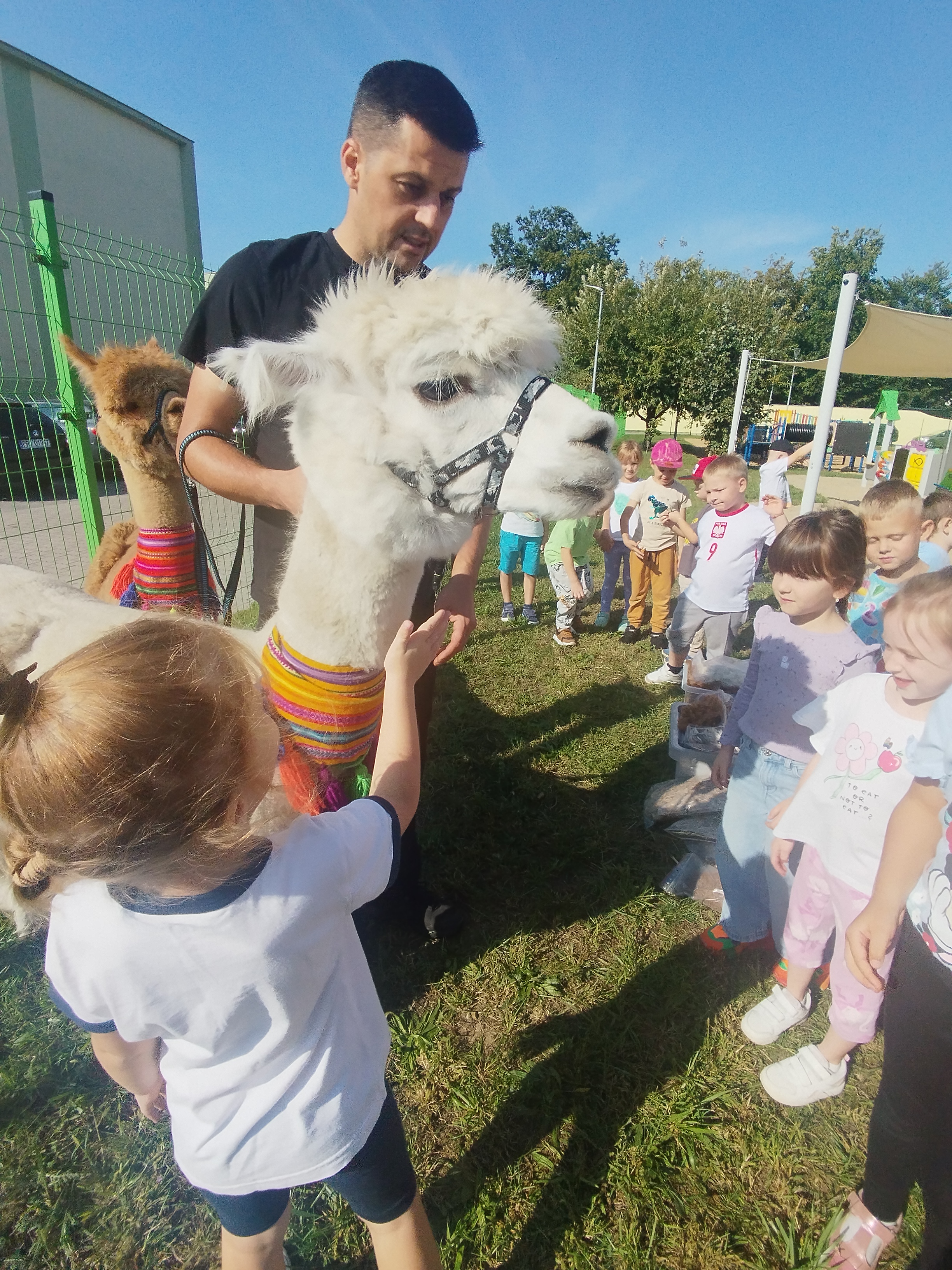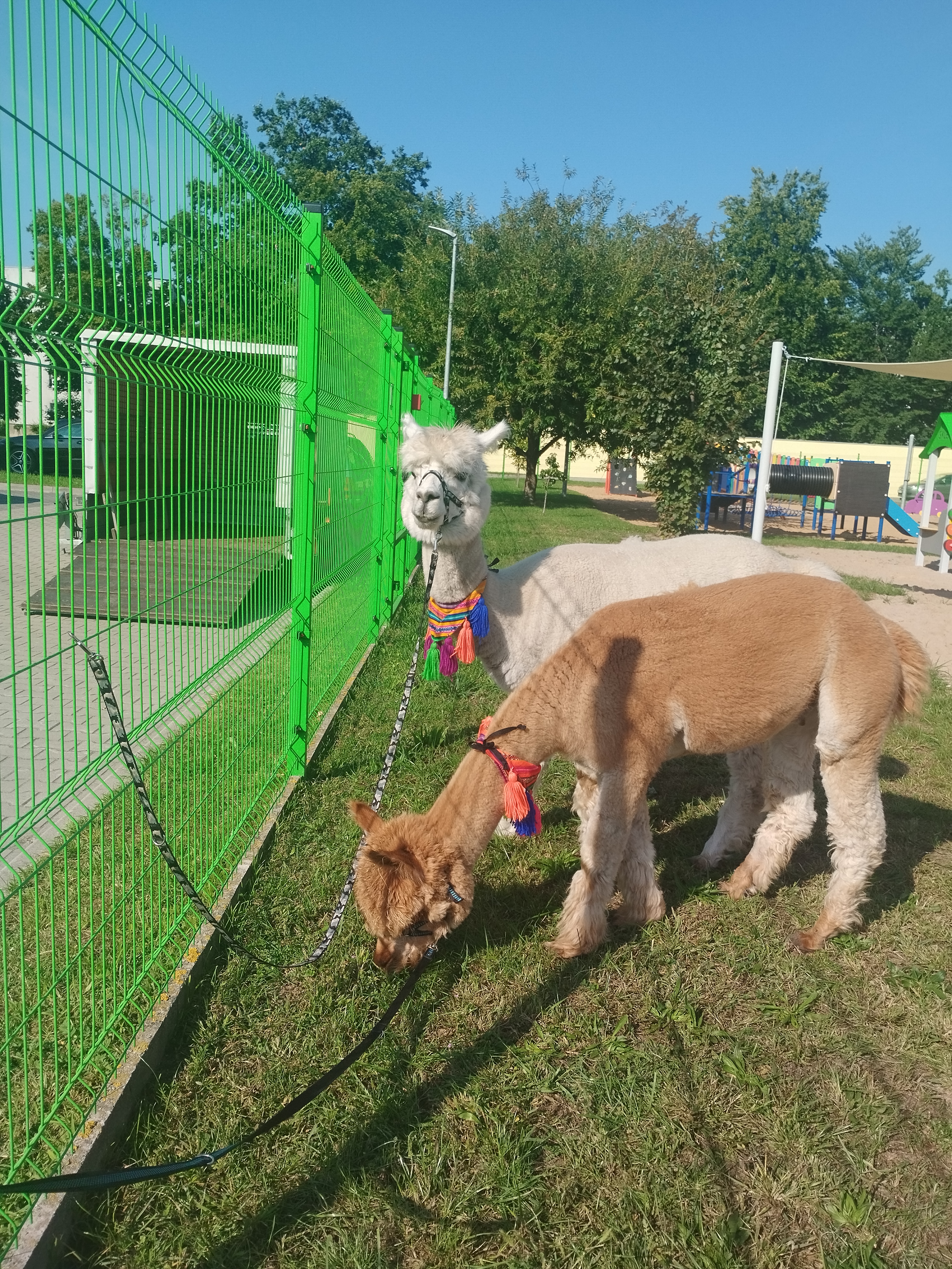 Wczoraj nasze przedszkole odwiedzili specjalni goście, byli to Leon i Śnieżek. Alpaki były bardzo przyjazne i mięciutkie. Dowiedzieliśmy się co lubią jeść i co można wykonać z ich futerka.