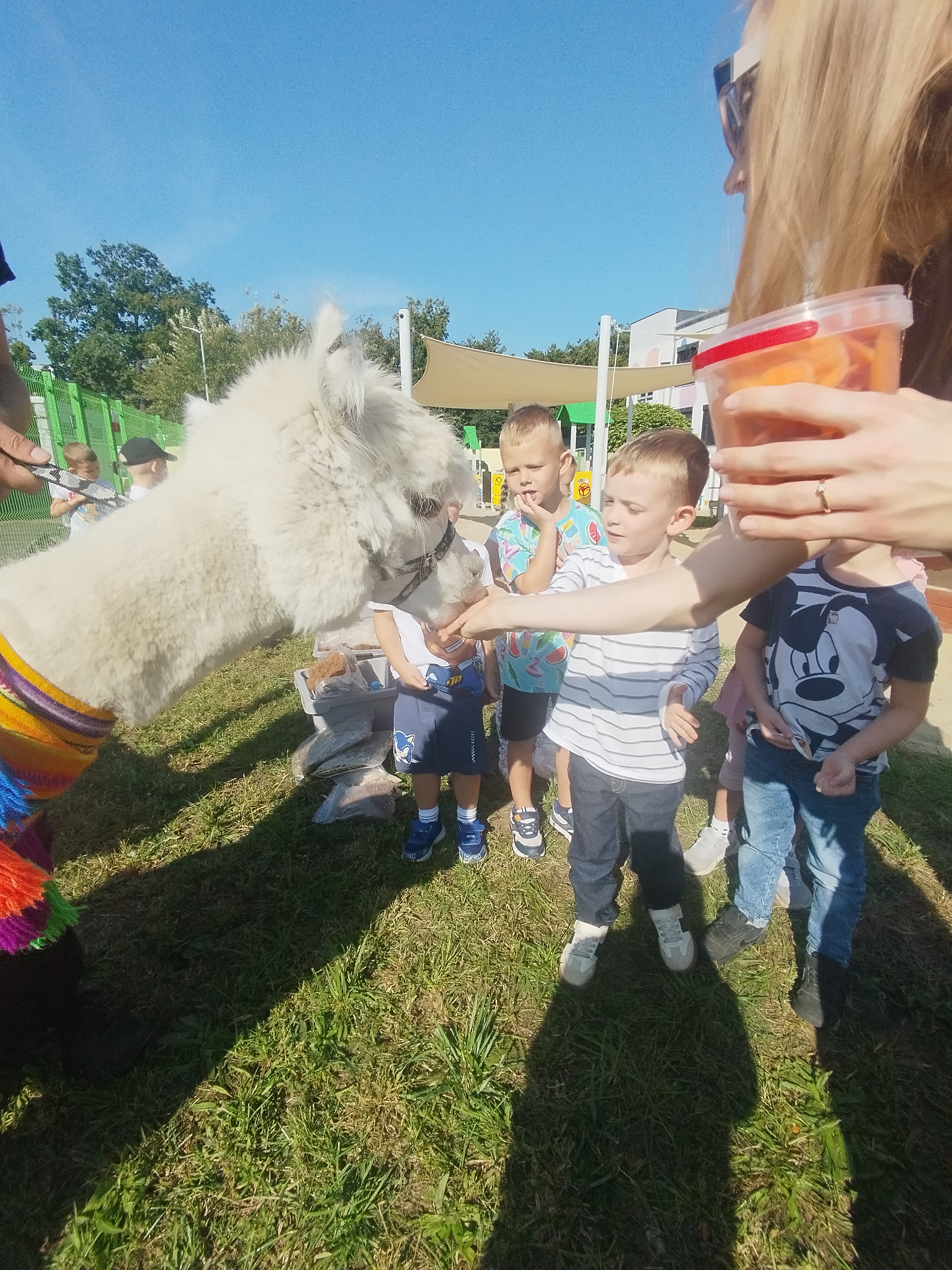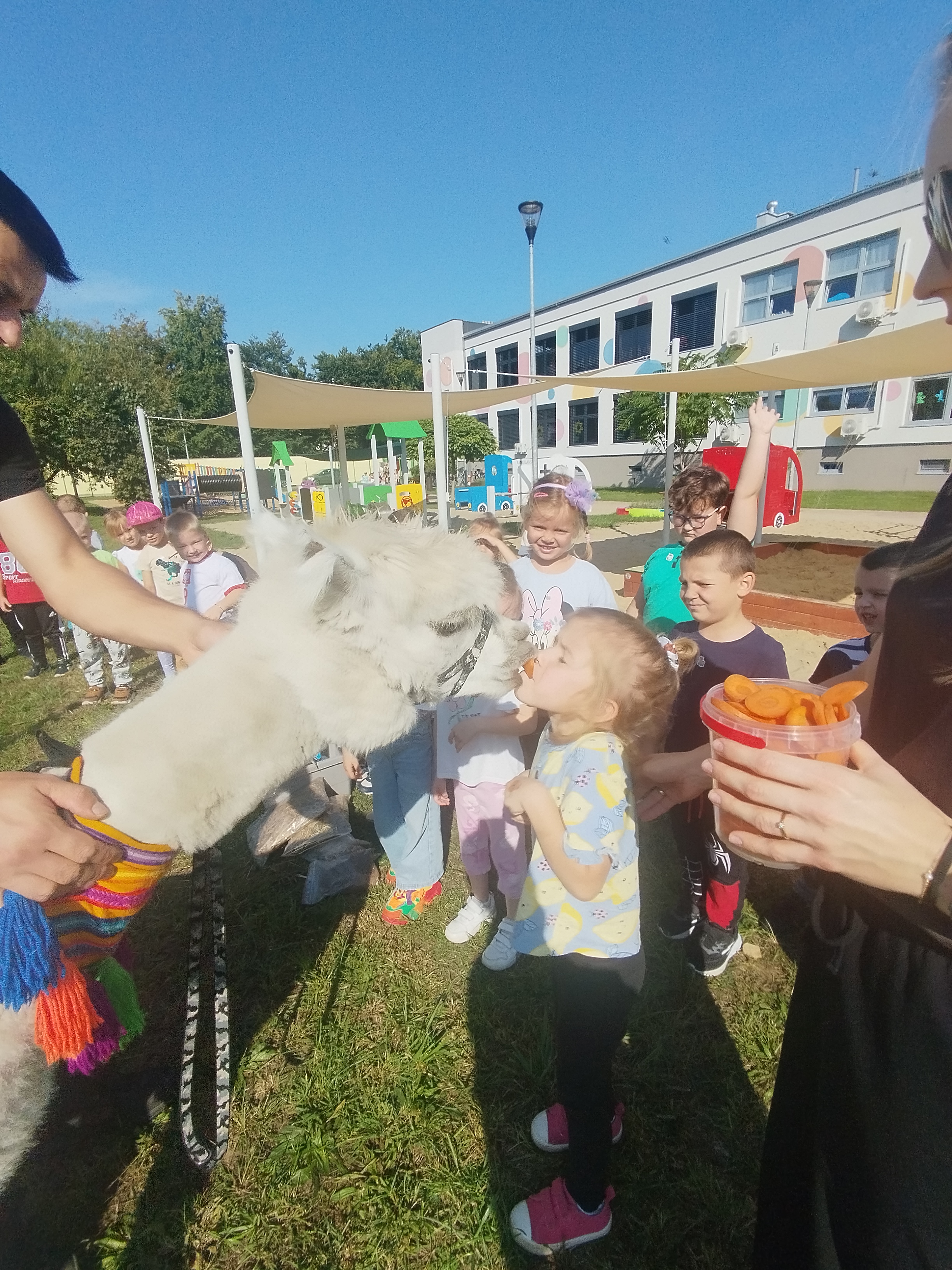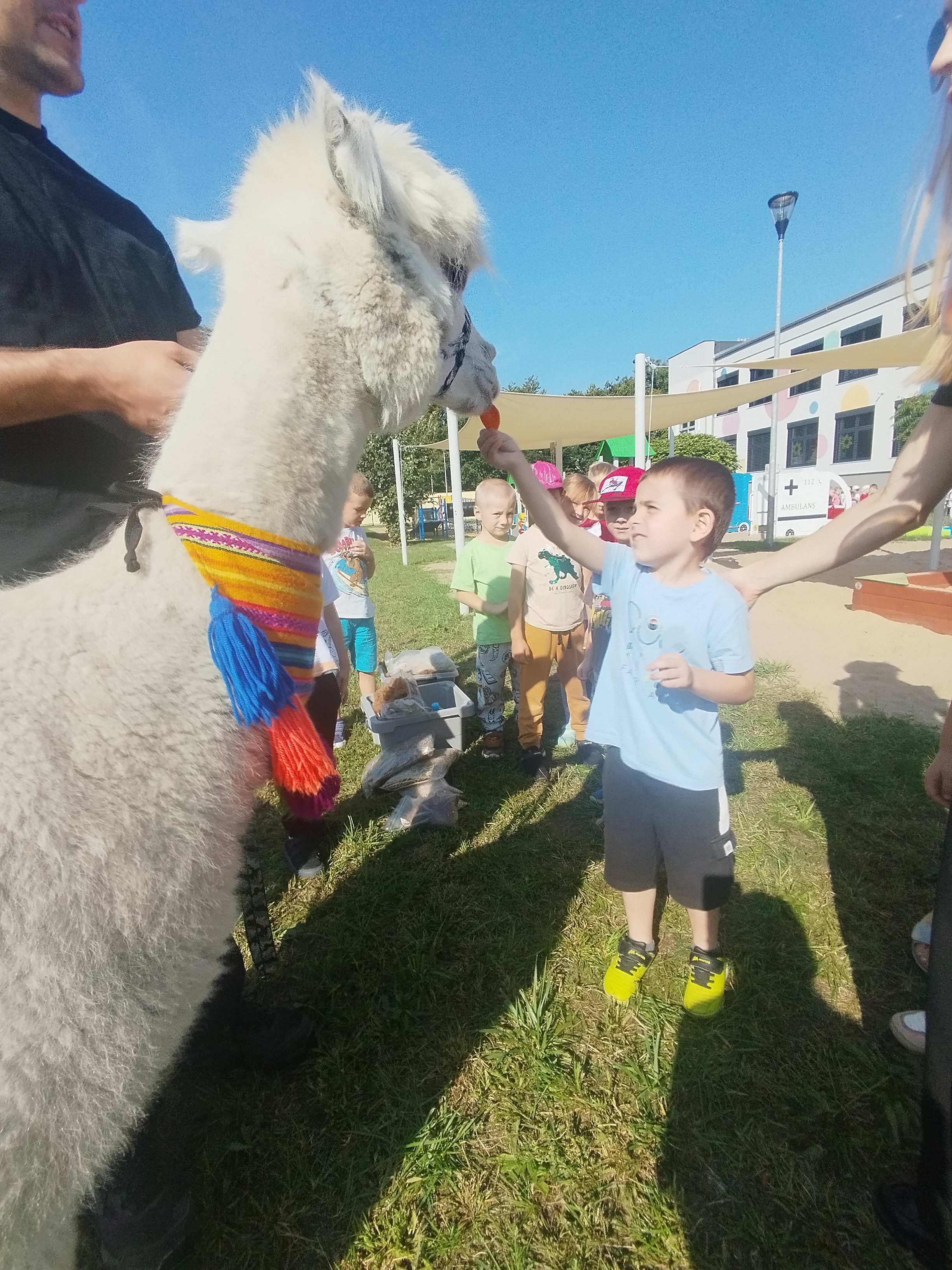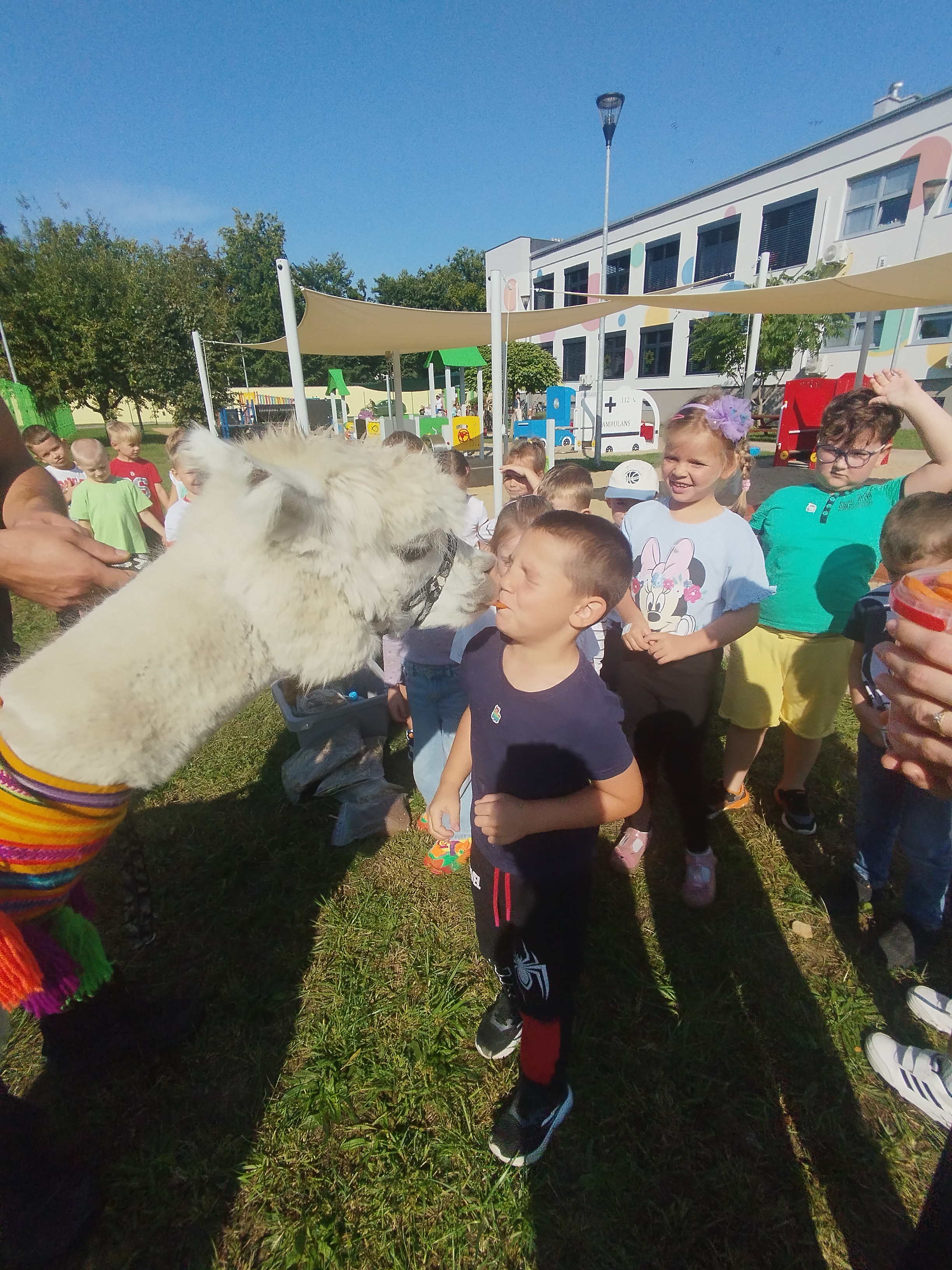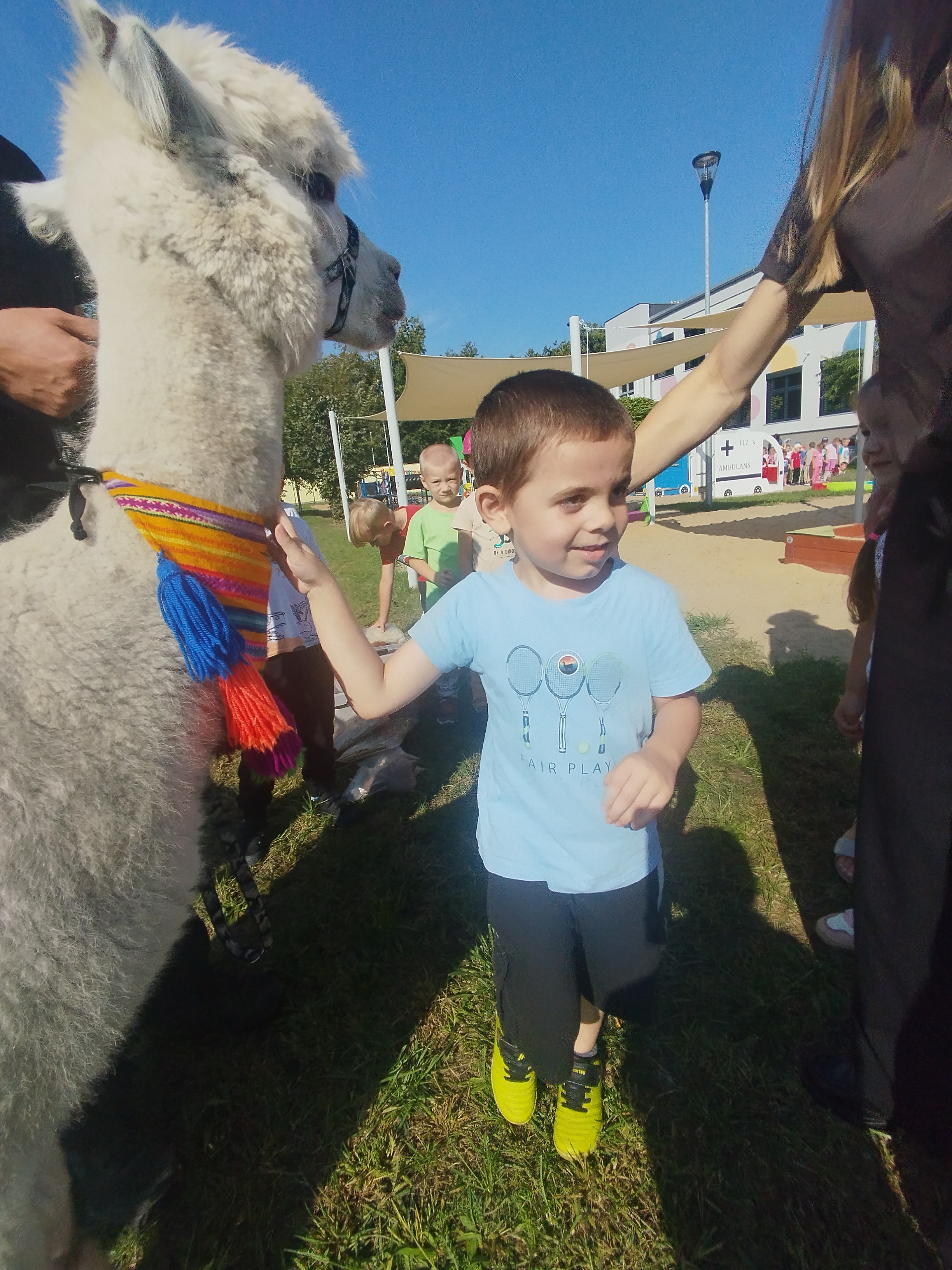 Wczoraj nasze przedszkole odwiedzili specjalni goście, byli to Leon i Śnieżek. Alpaki były bardzo przyjazne i mięciutkie. Dowiedzieliśmy się co lubią jeść i co można wykonać z ich futerka.