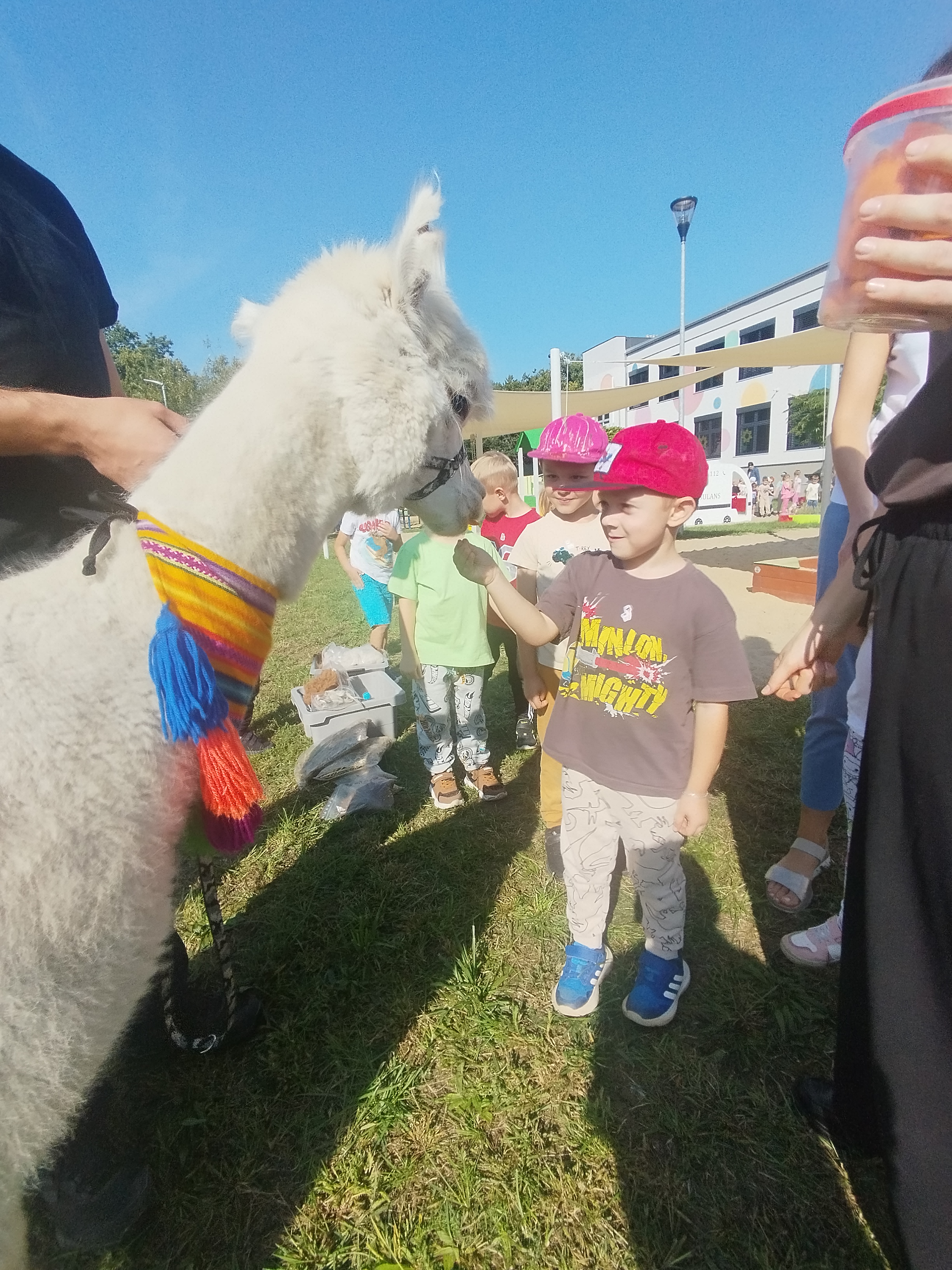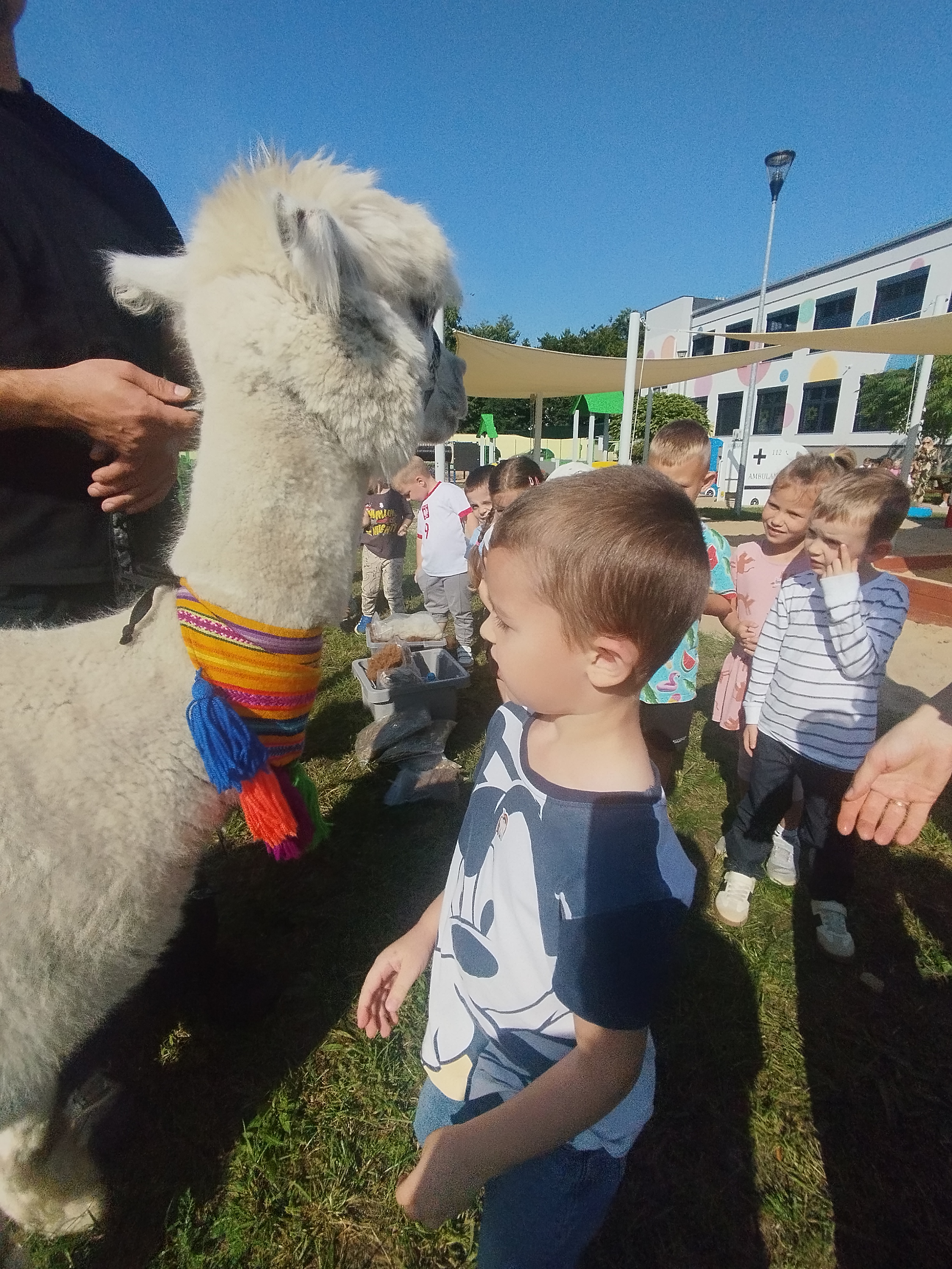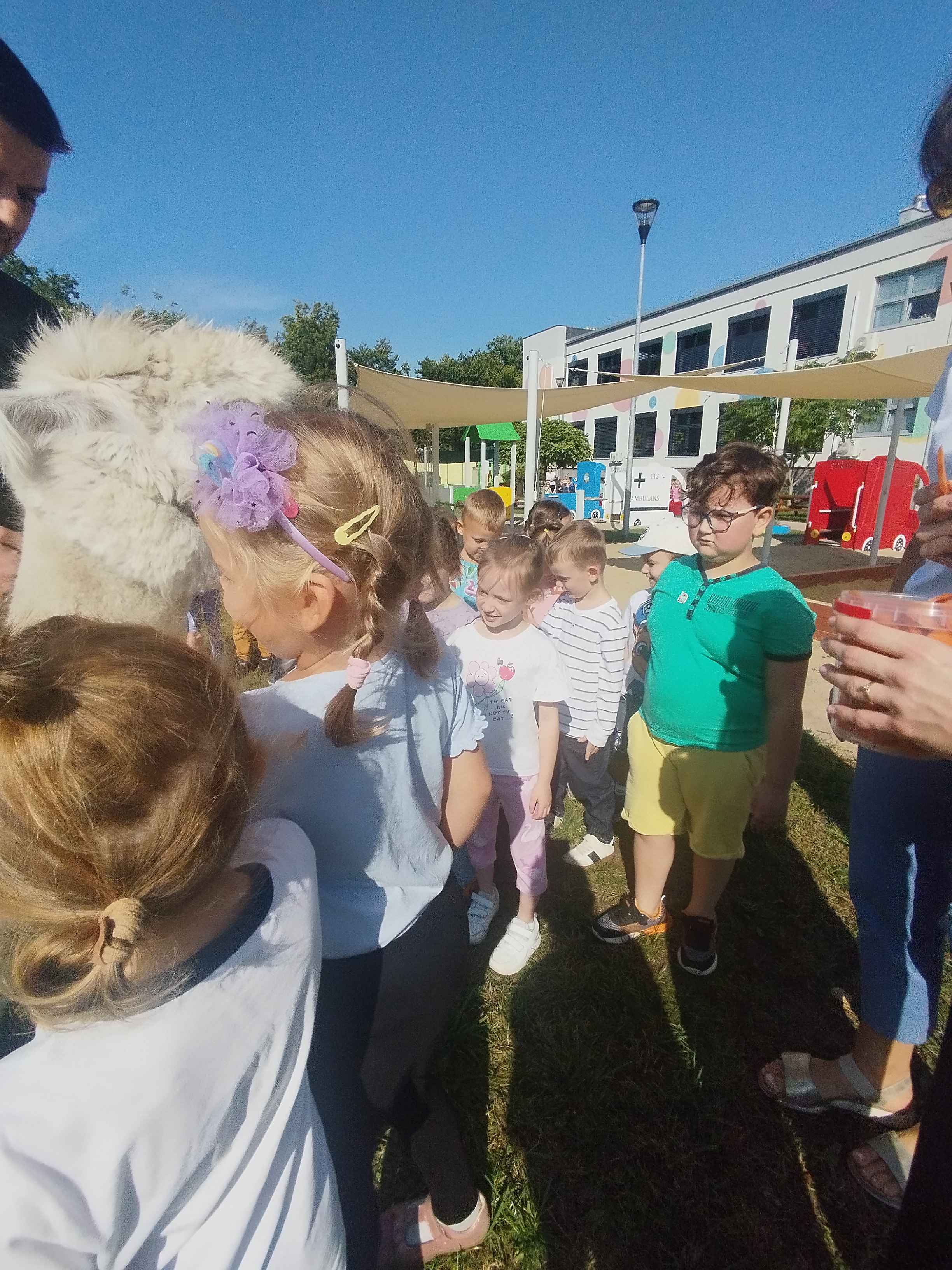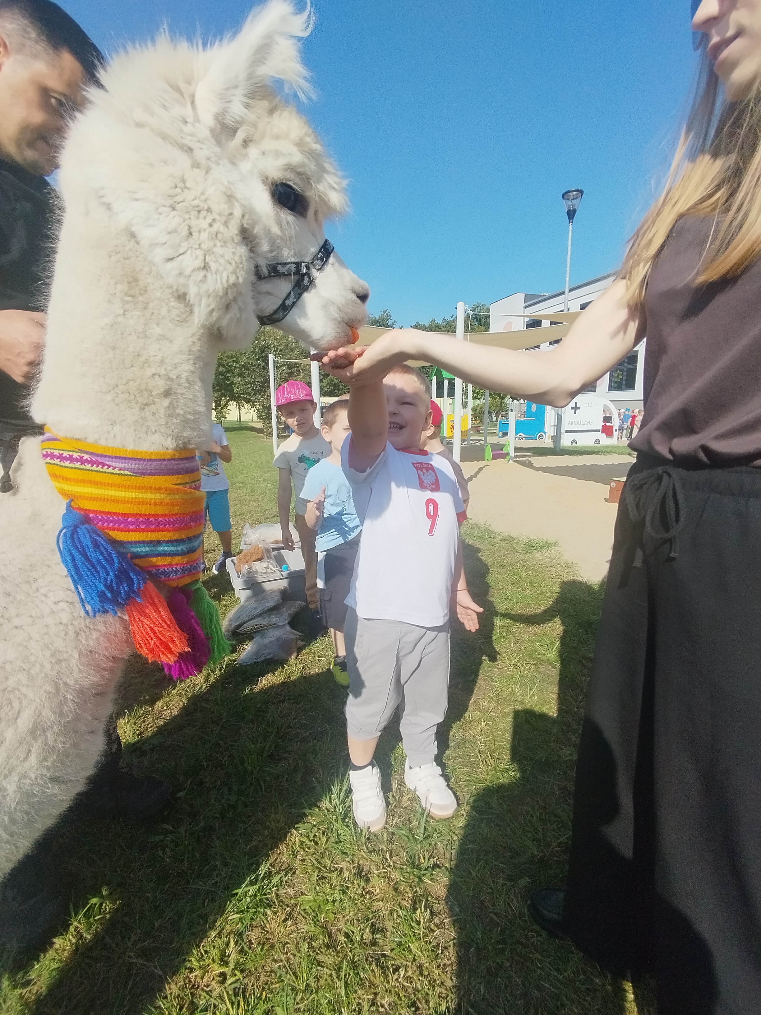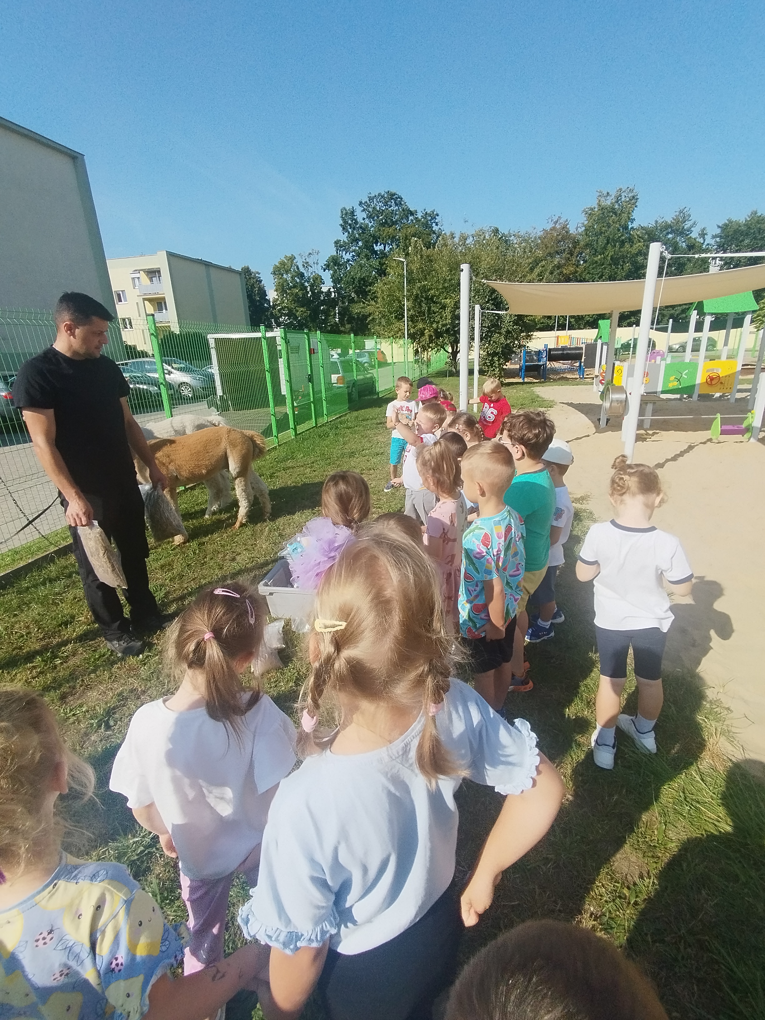 Wczoraj nasze przedszkole odwiedzili specjalni goście, byli to Leon i Śnieżek. Alpaki były bardzo przyjazne i mięciutkie. Dowiedzieliśmy się co lubią jeść i co można wykonać z ich futerka.