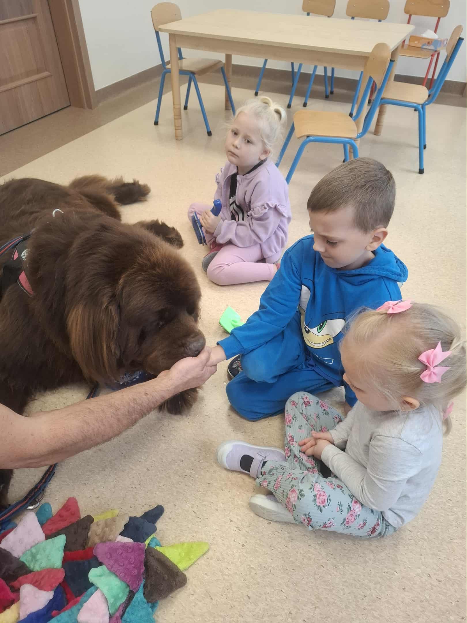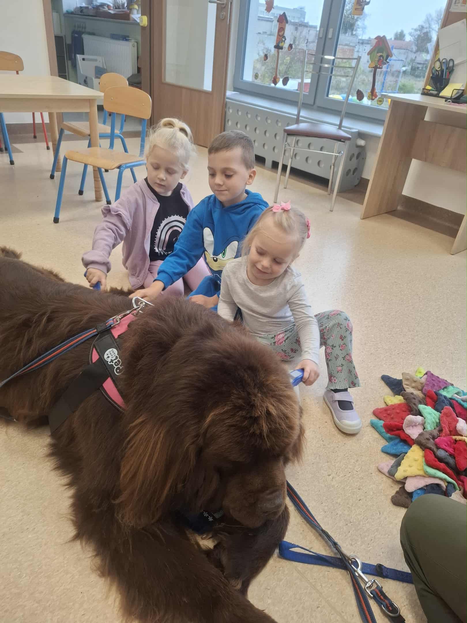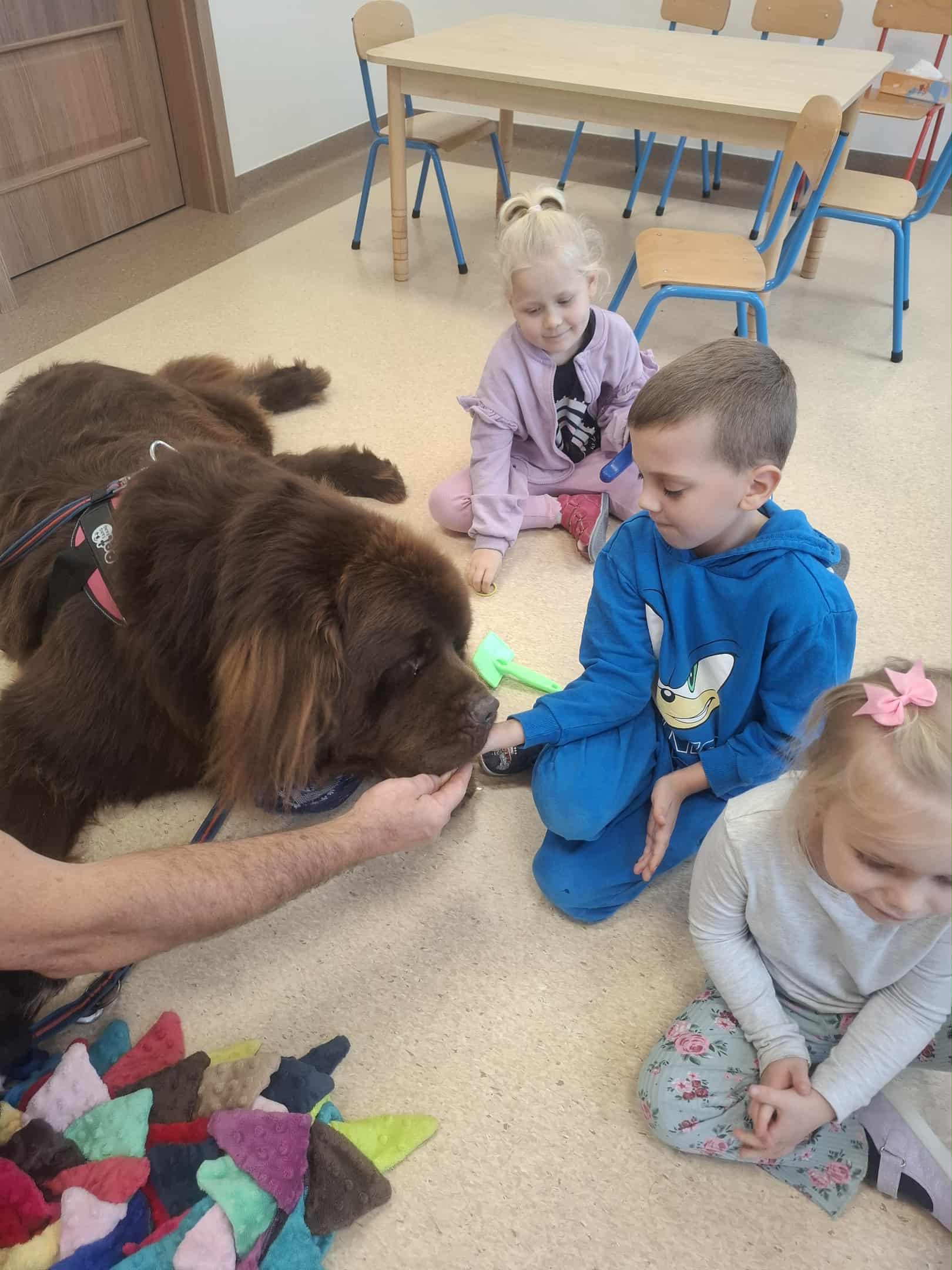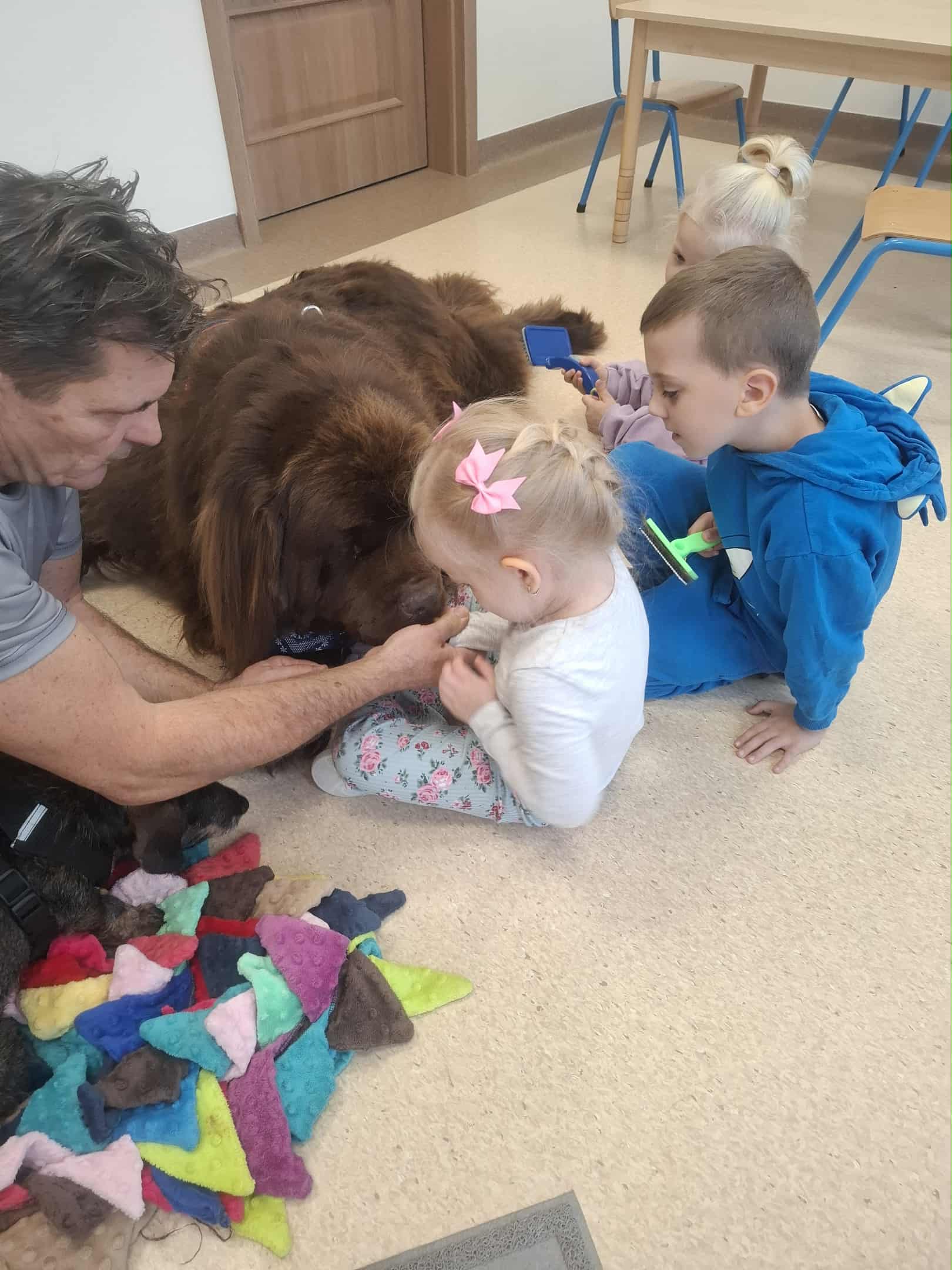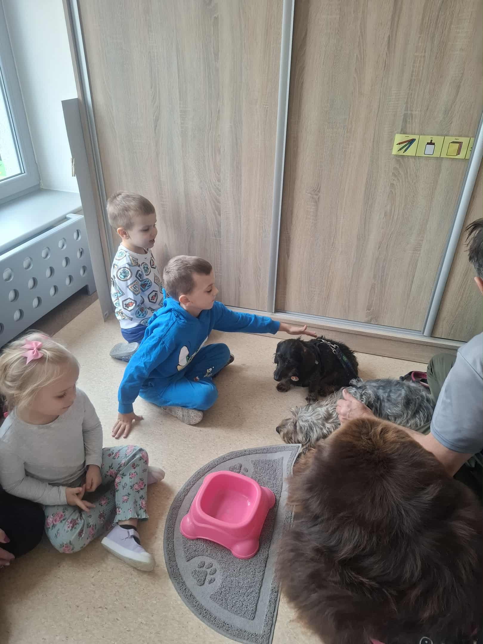 Dziś naszą grupę odwiedziły pieski – Beza, Henryk i Bruno! Dzieci z ogromnym zainteresowaniem przyglądały się czworonogom, obserwując ich zachowanie, sposób poruszania się i reakcje. Mogły je pogłaskać, uczesać oraz spędzić z nimi miło i spokojnie czas.