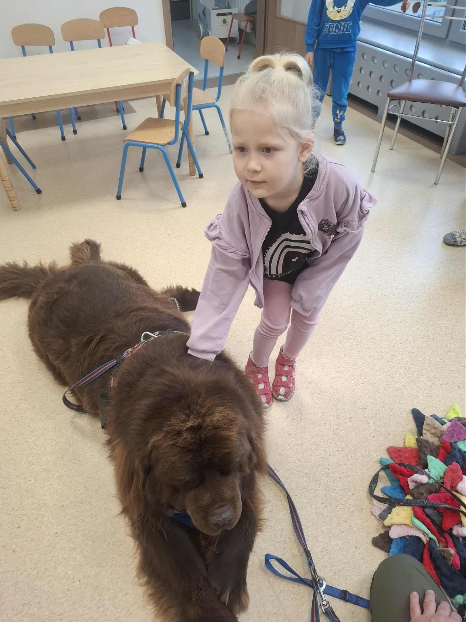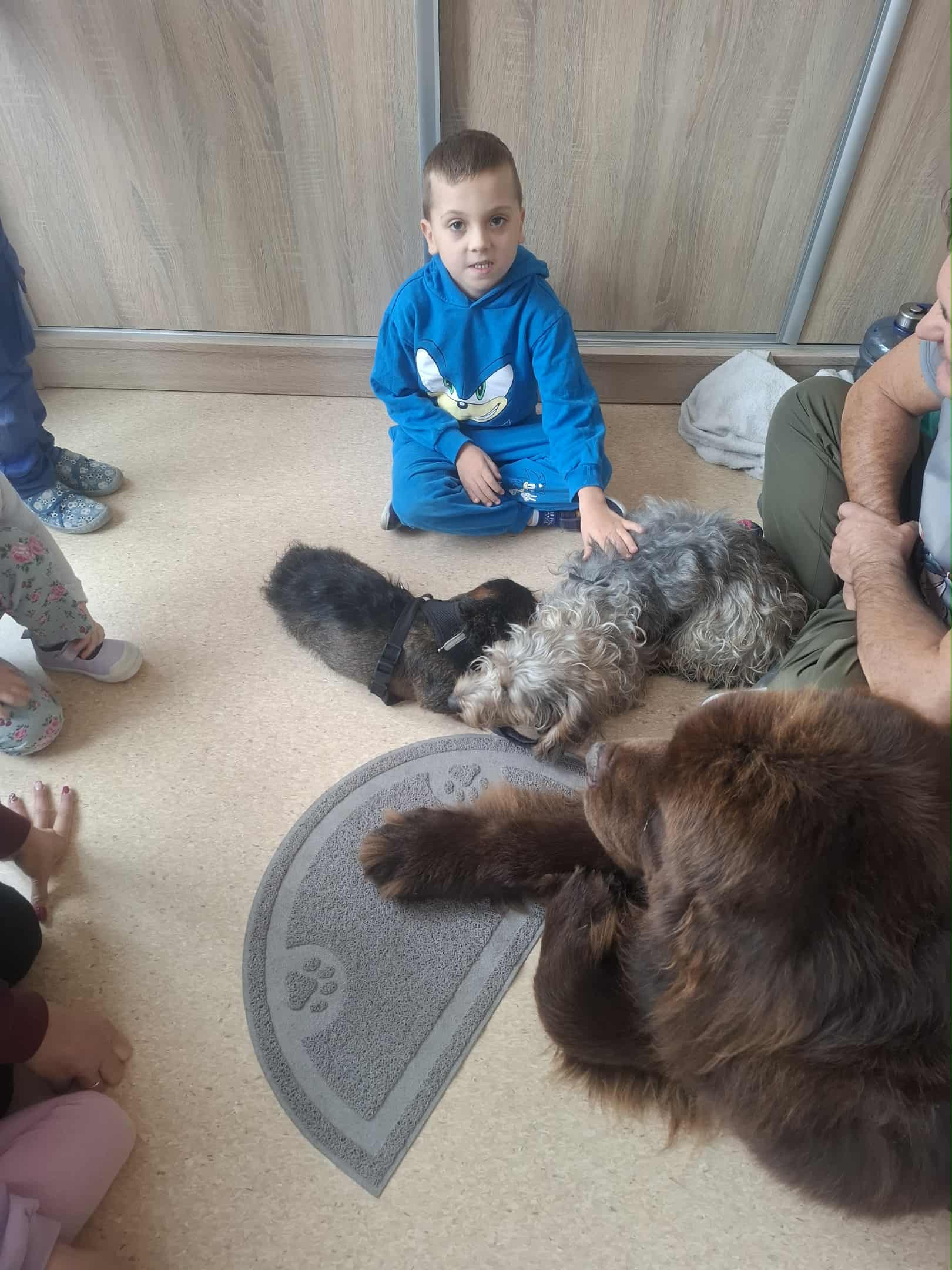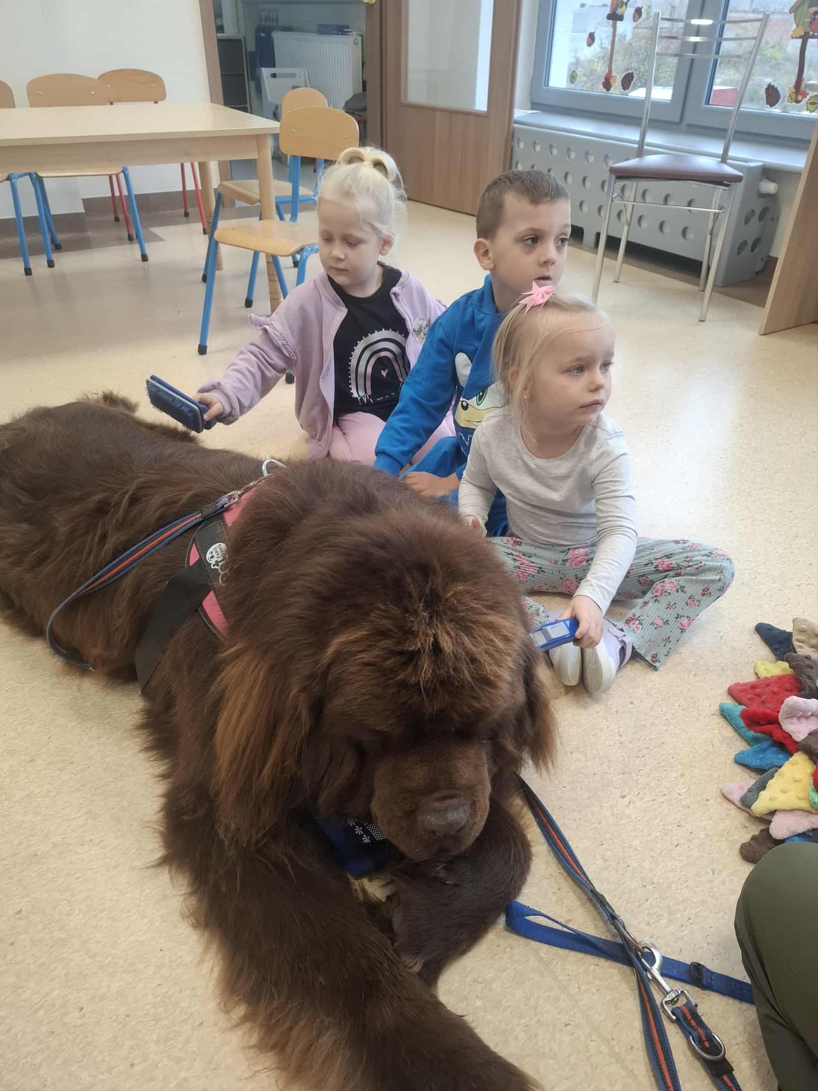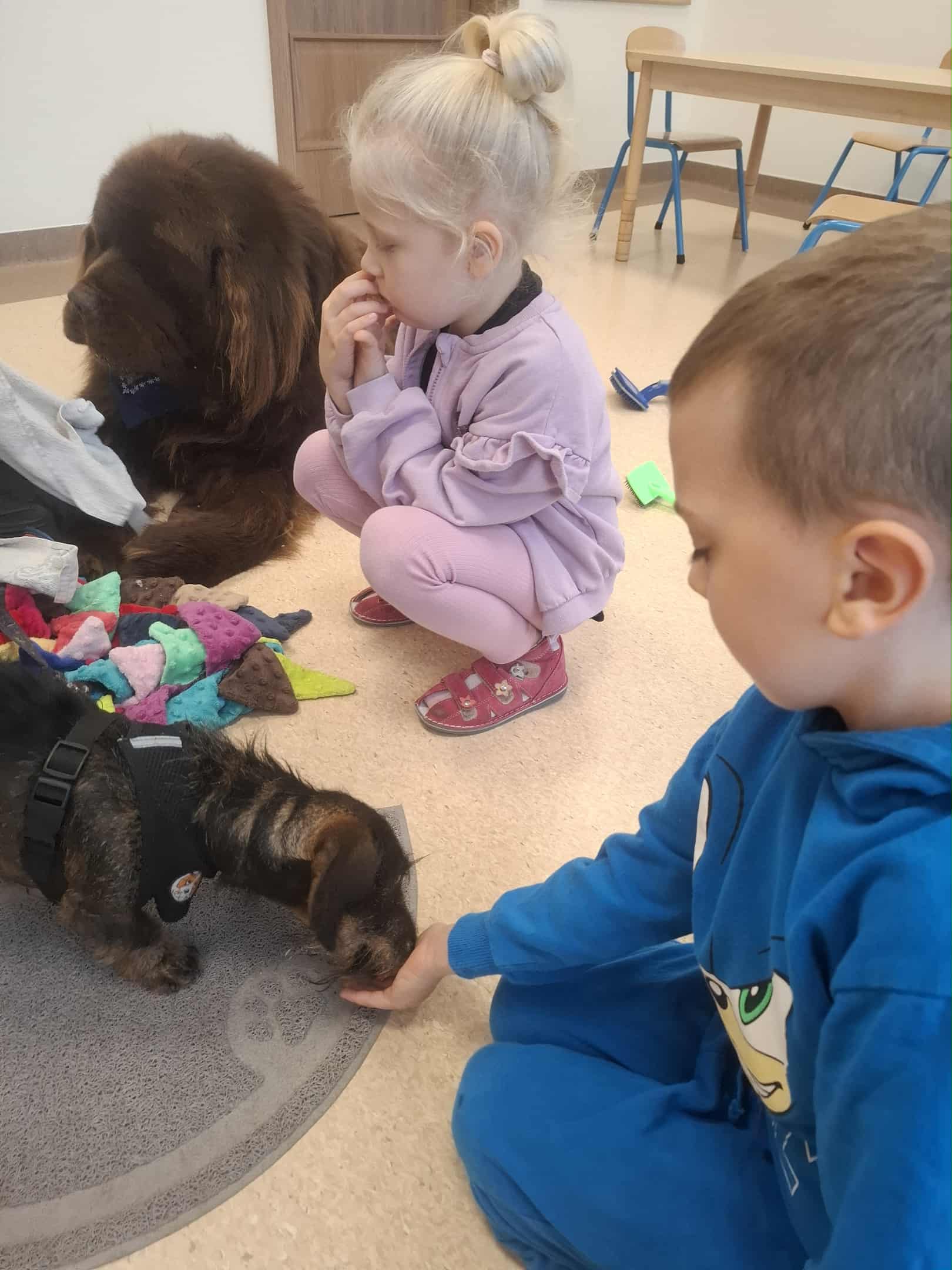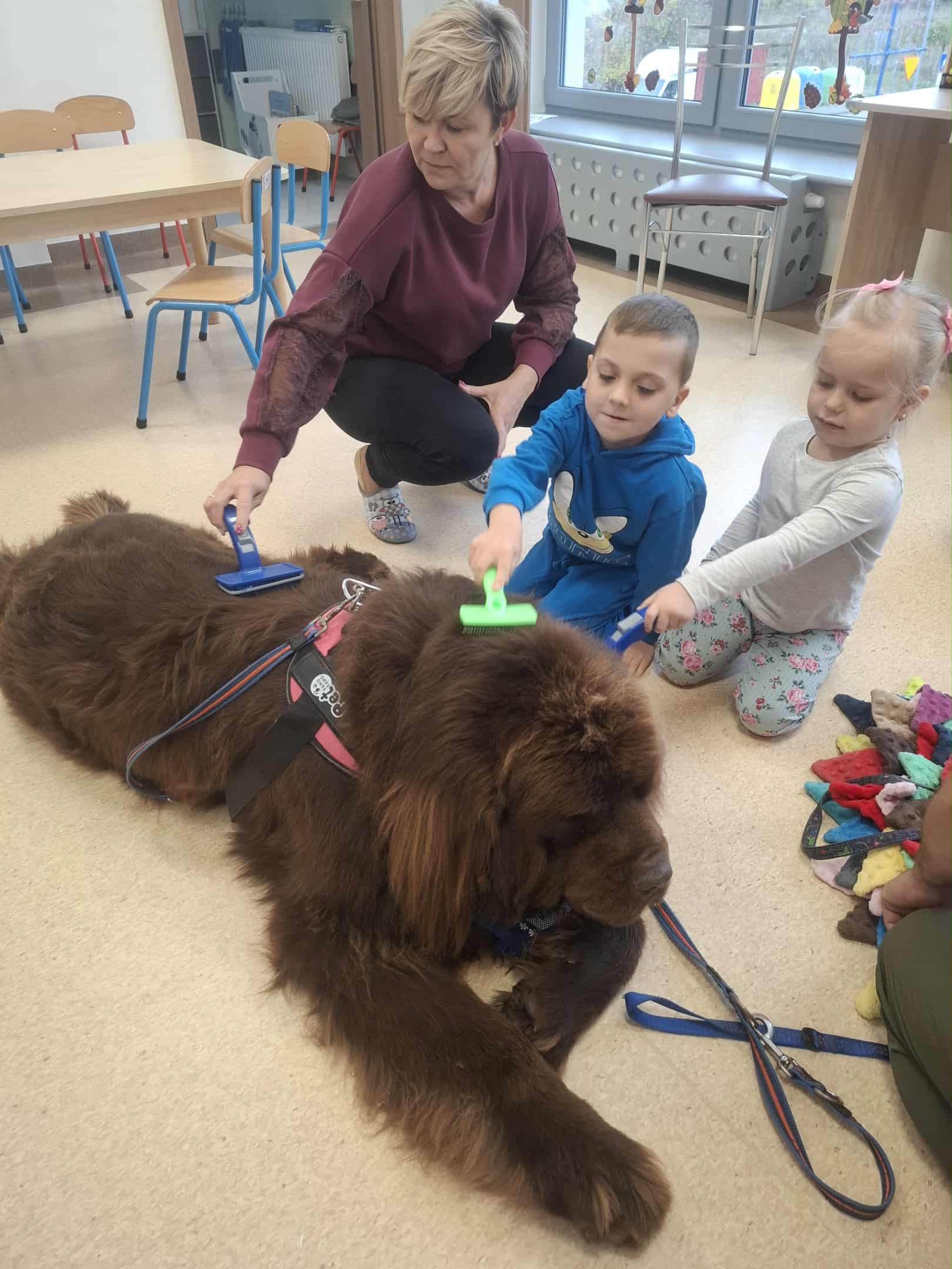 Dziś naszą grupę odwiedziły pieski – Beza, Henryk i Bruno! Dzieci z ogromnym zainteresowaniem przyglądały się czworonogom, obserwując ich zachowanie, sposób poruszania się i reakcje. Mogły je pogłaskać, uczesać oraz spędzić z nimi miło i spokojnie czas.