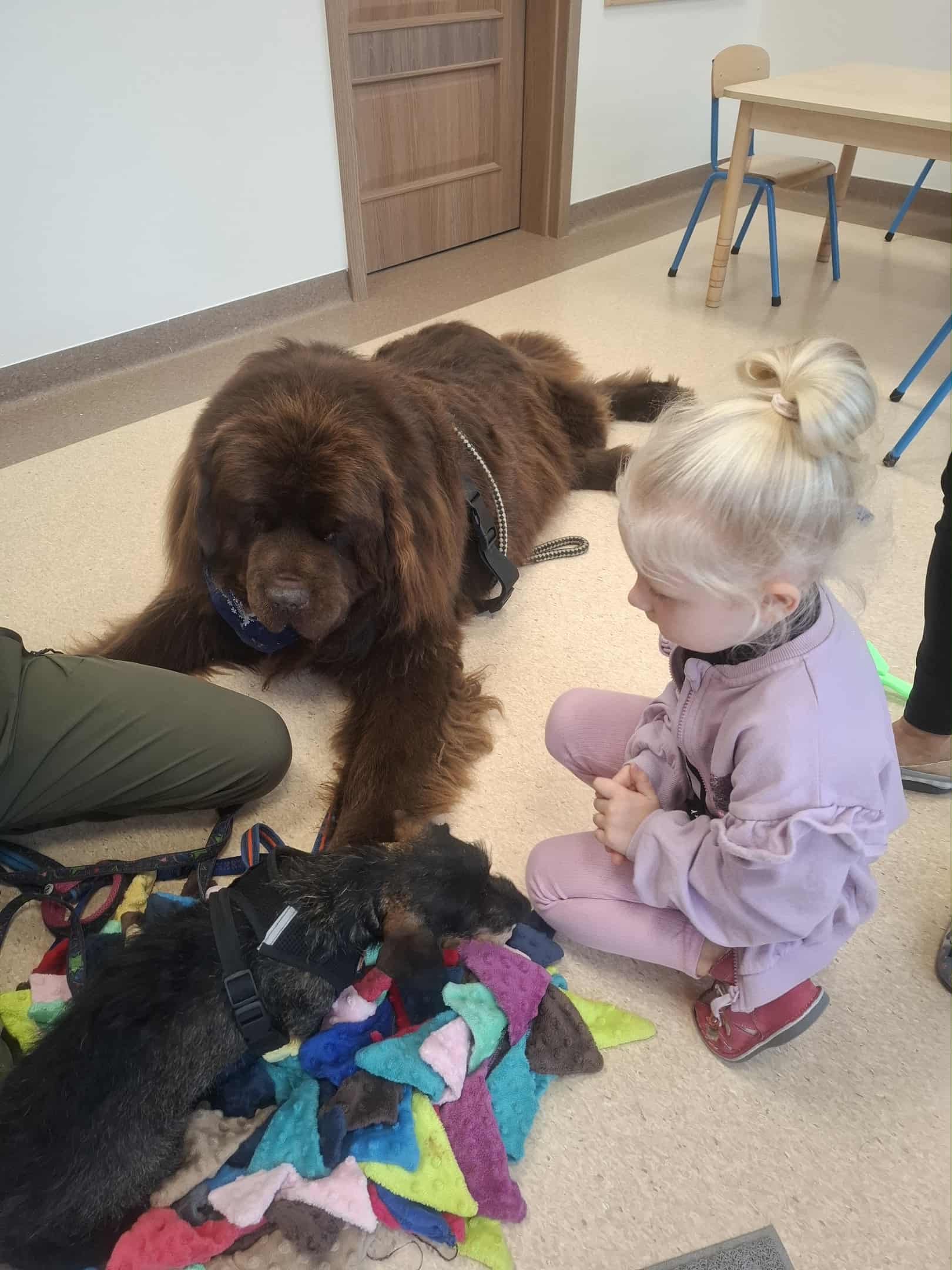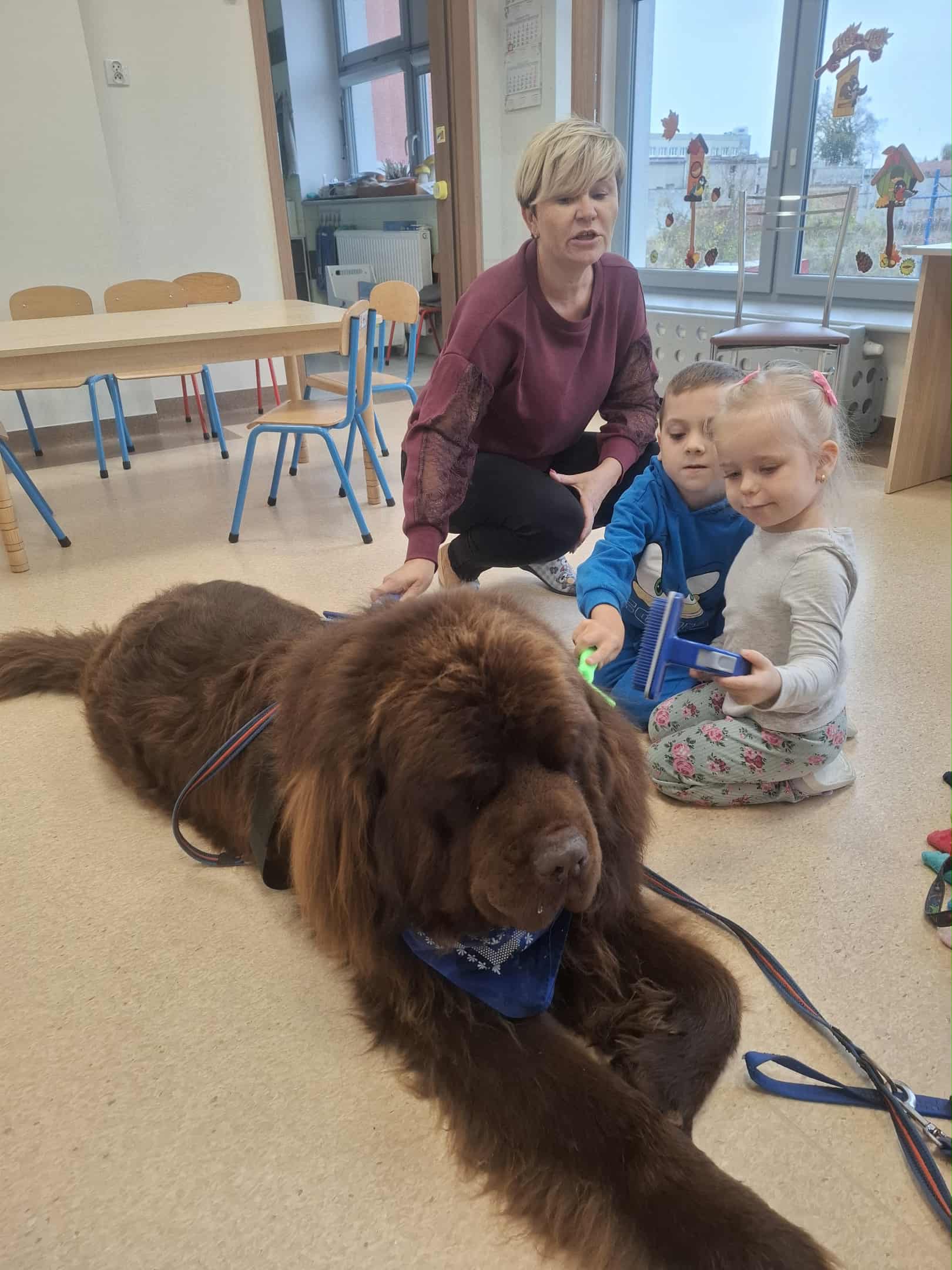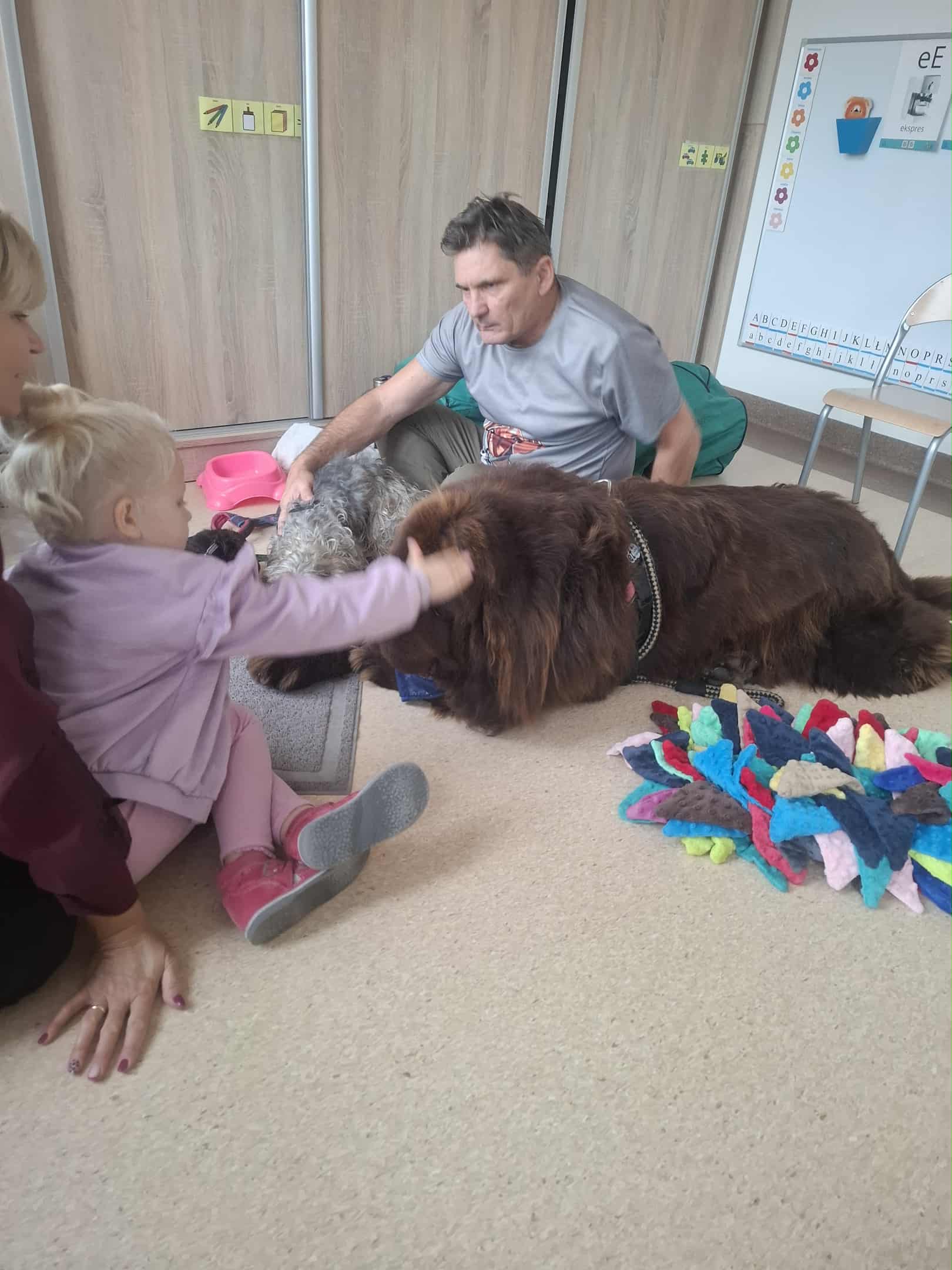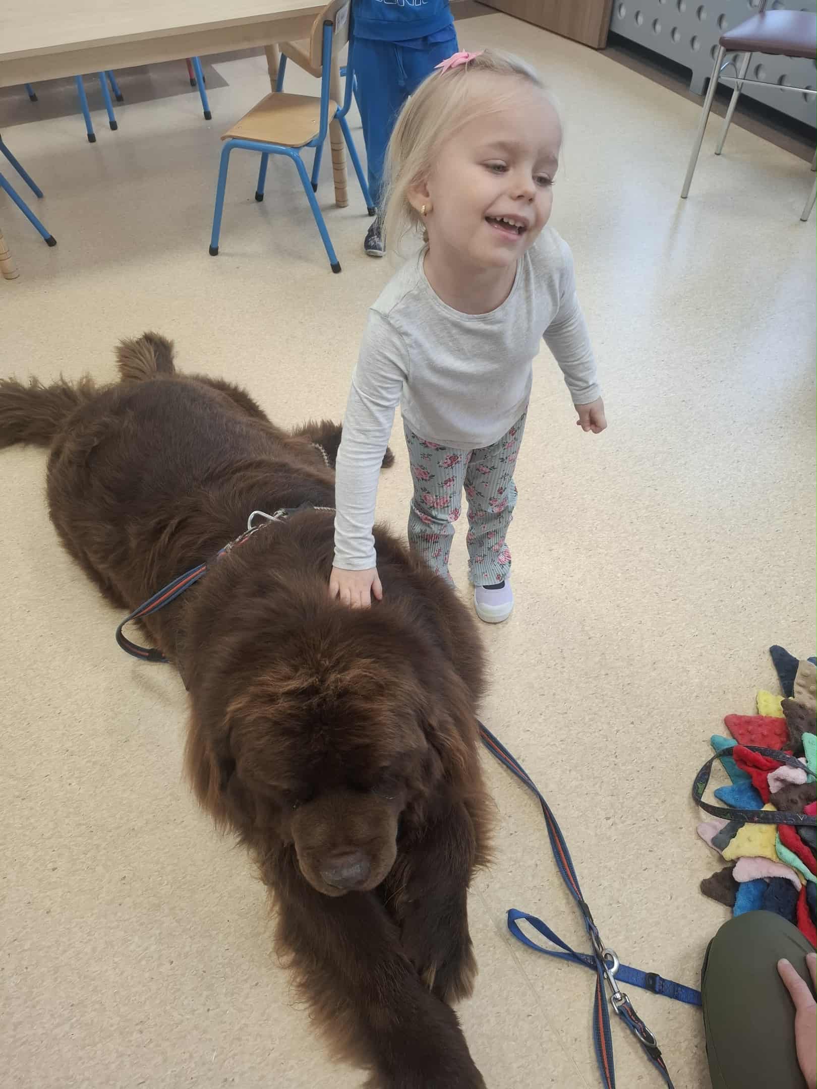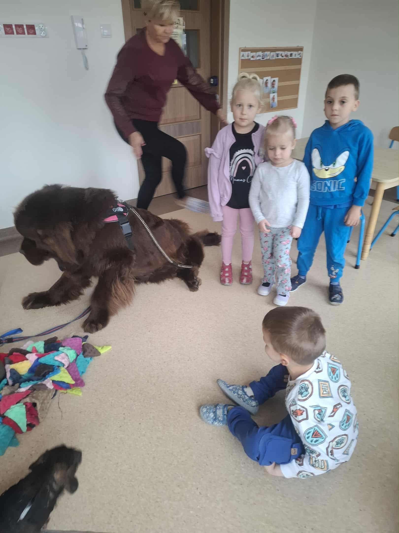 Dziś naszą grupę odwiedziły pieski – Beza, Henryk i Bruno! Dzieci z ogromnym zainteresowaniem przyglądały się czworonogom, obserwując ich zachowanie, sposób poruszania się i reakcje. Mogły je pogłaskać, uczesać oraz spędzić z nimi miło i spokojnie czas.