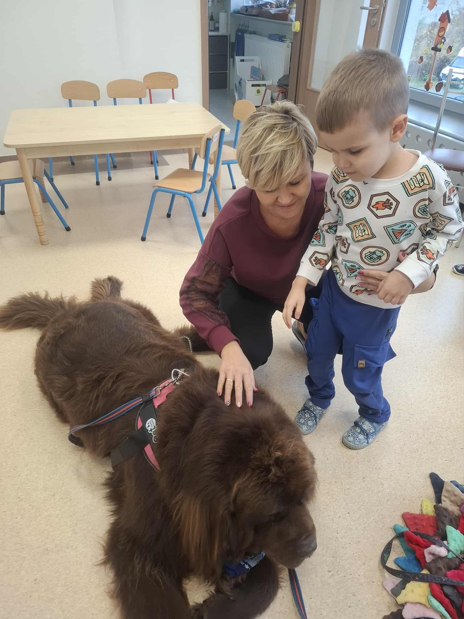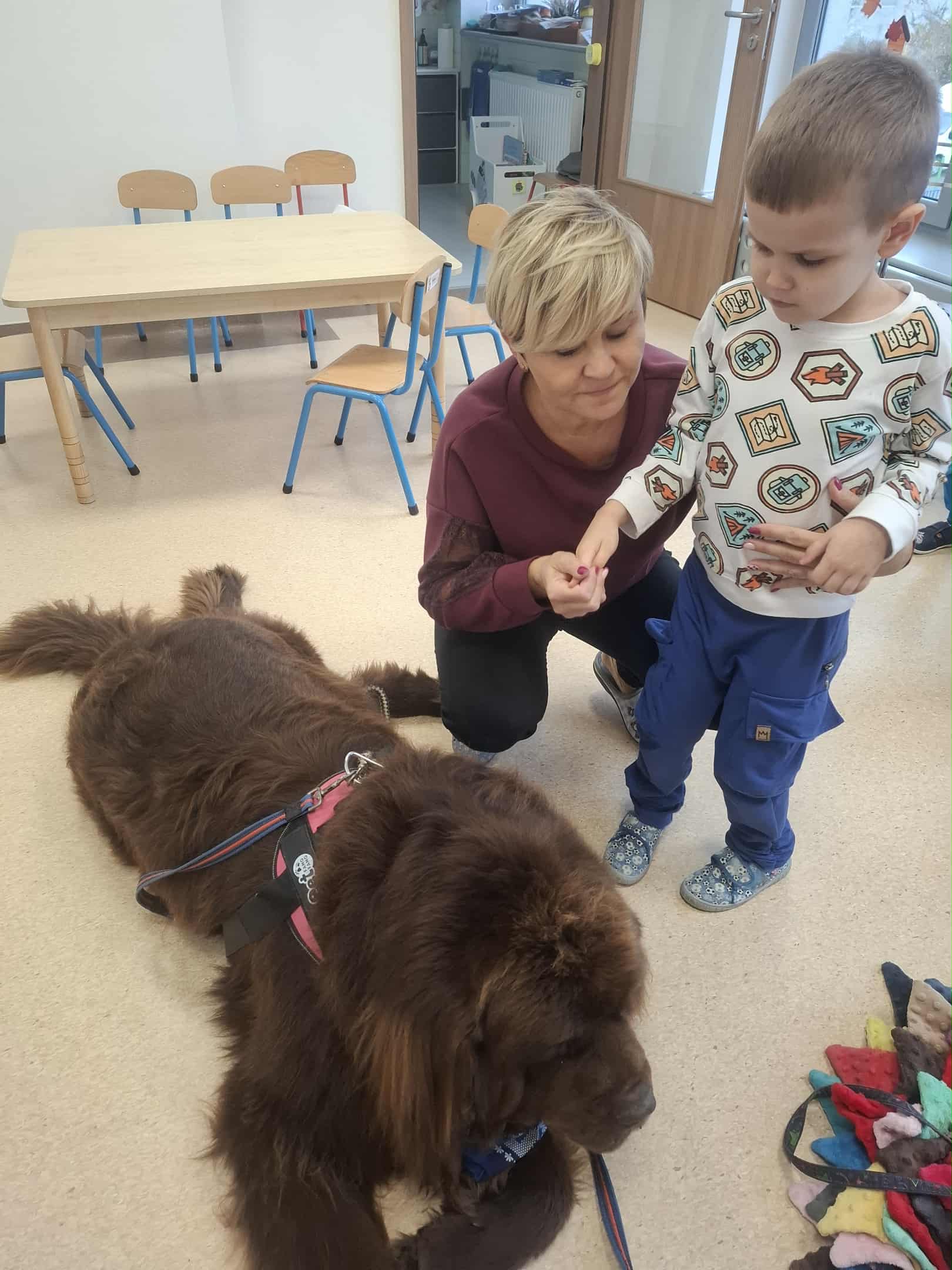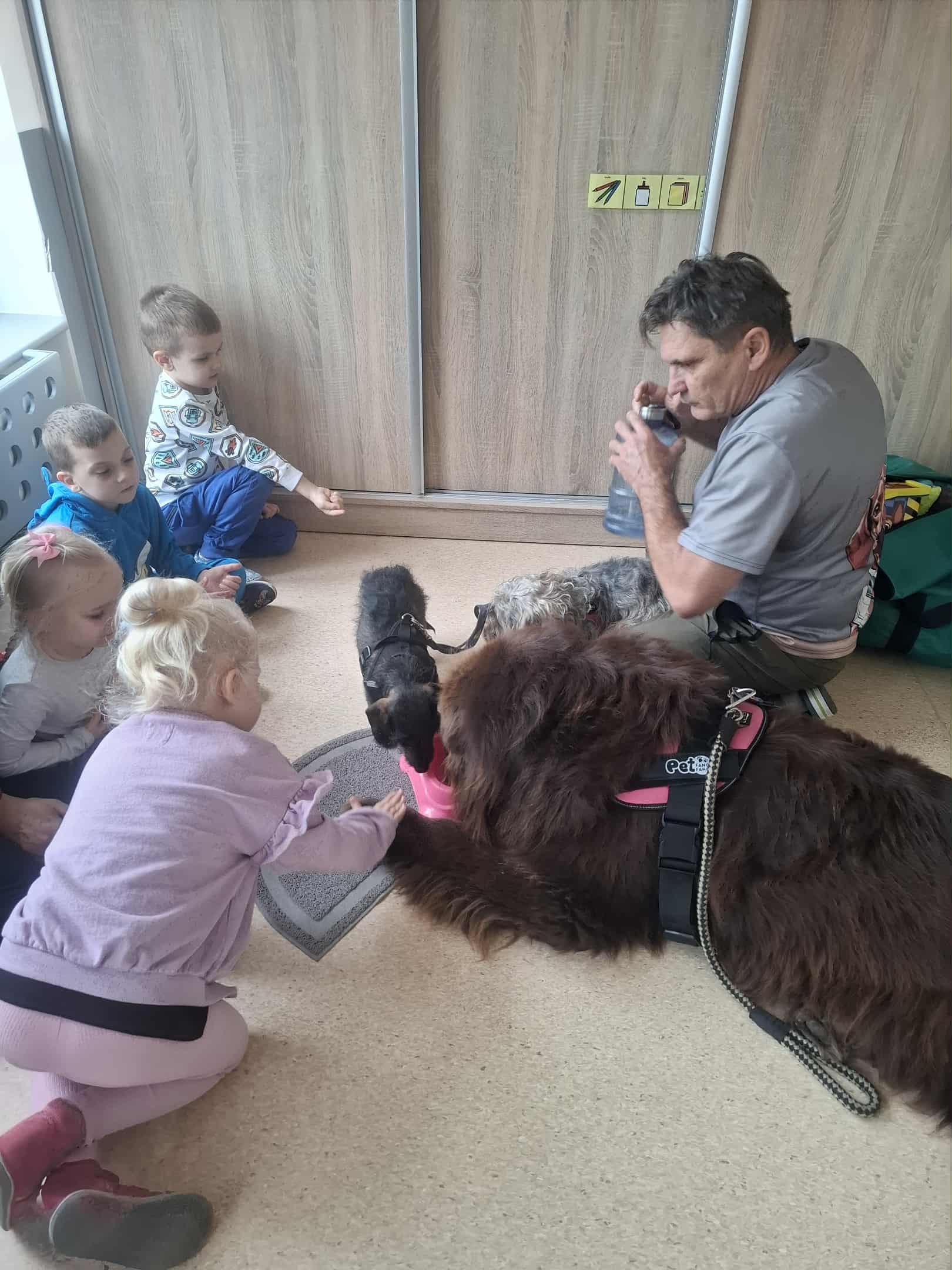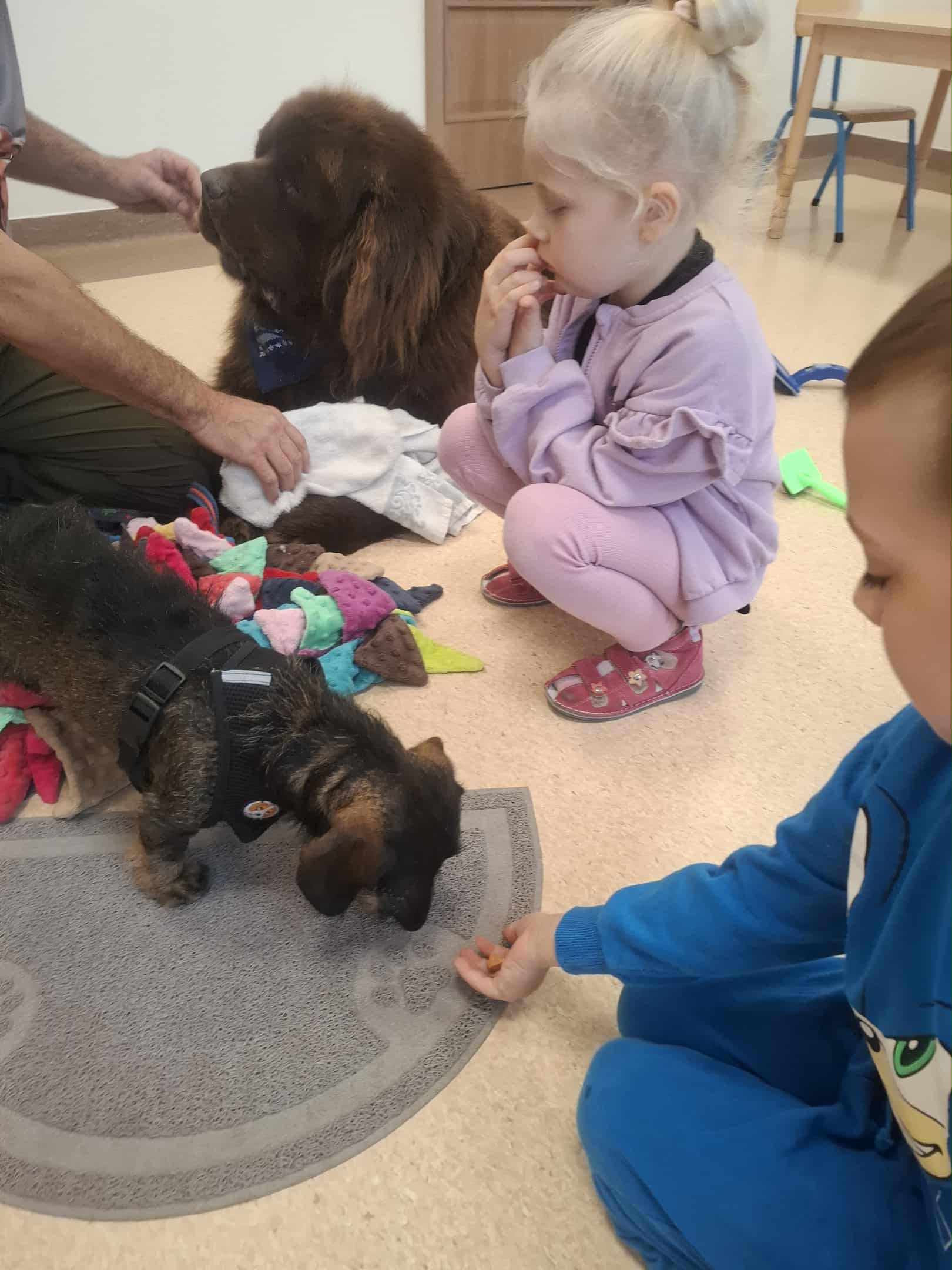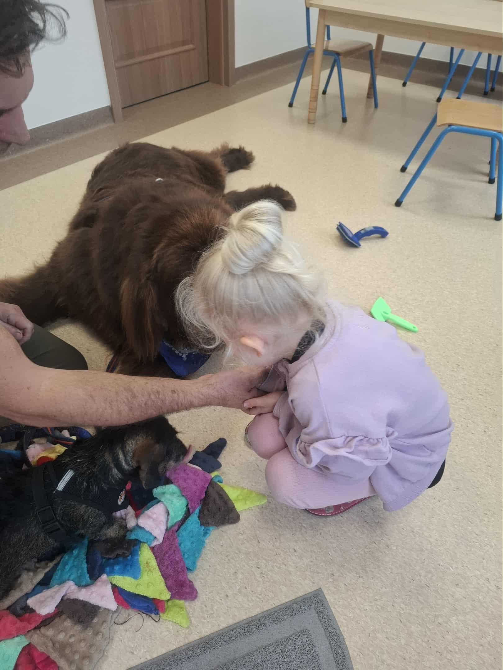 Dziś naszą grupę odwiedziły pieski – Beza, Henryk i Bruno! Dzieci z ogromnym zainteresowaniem przyglądały się czworonogom, obserwując ich zachowanie, sposób poruszania się i reakcje. Mogły je pogłaskać, uczesać oraz spędzić z nimi miło i spokojnie czas.