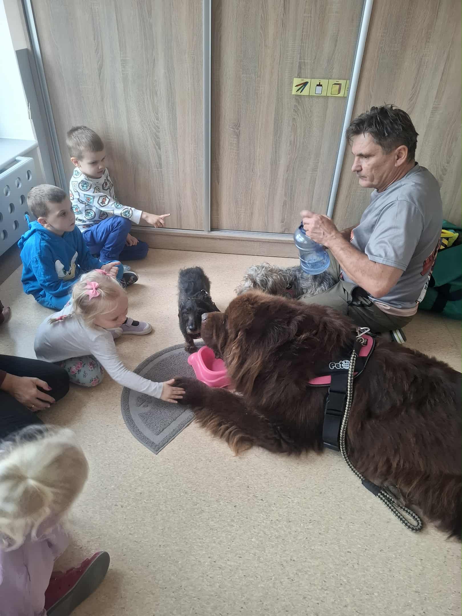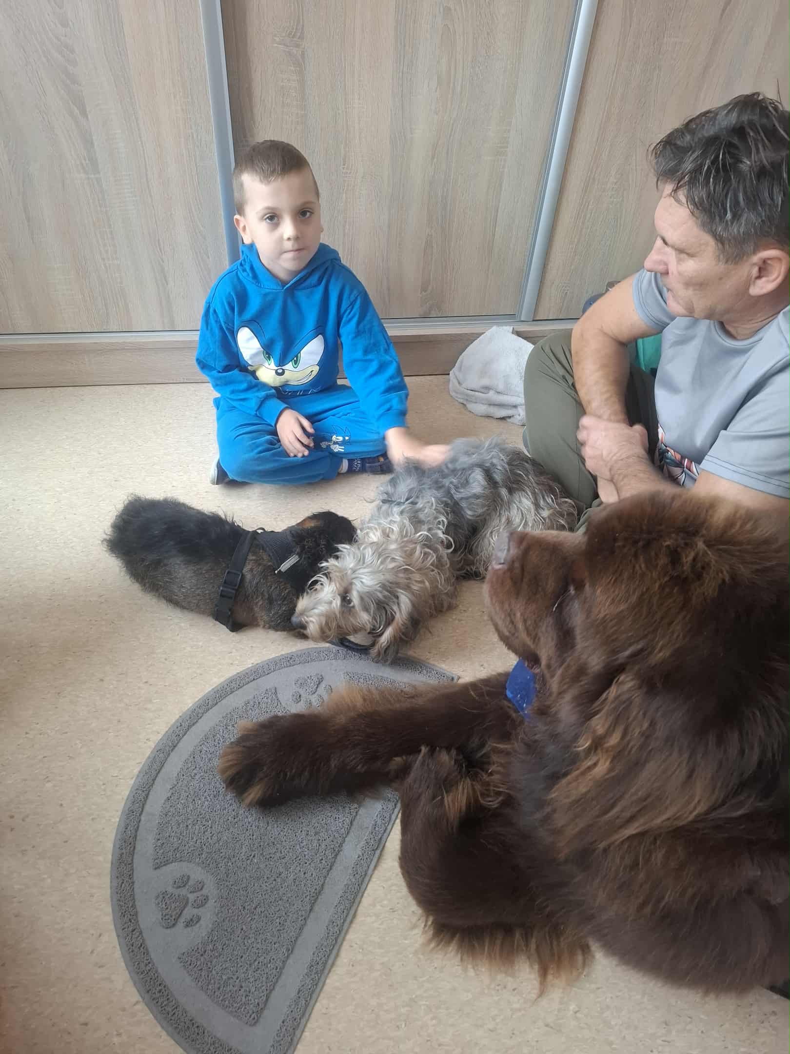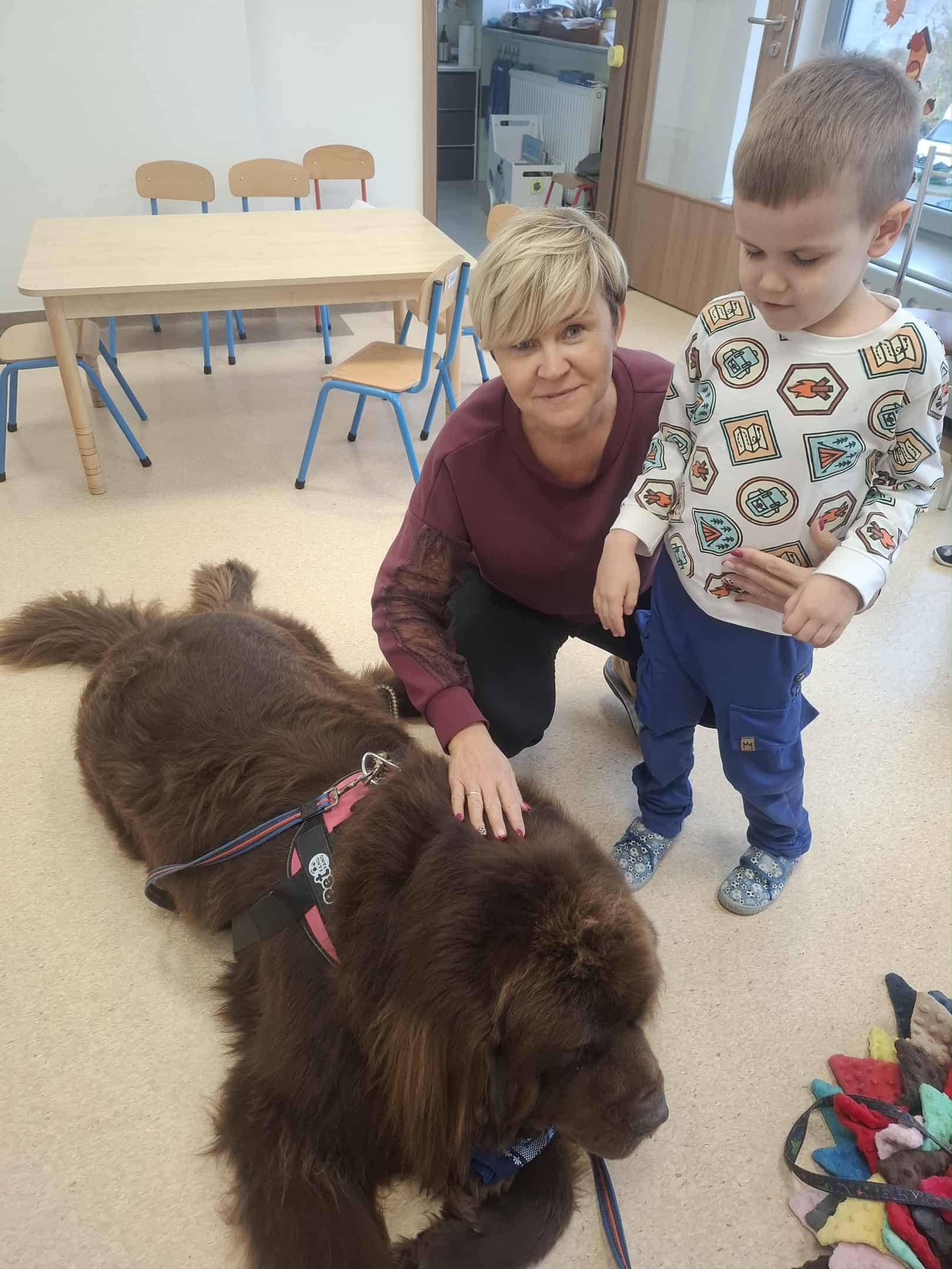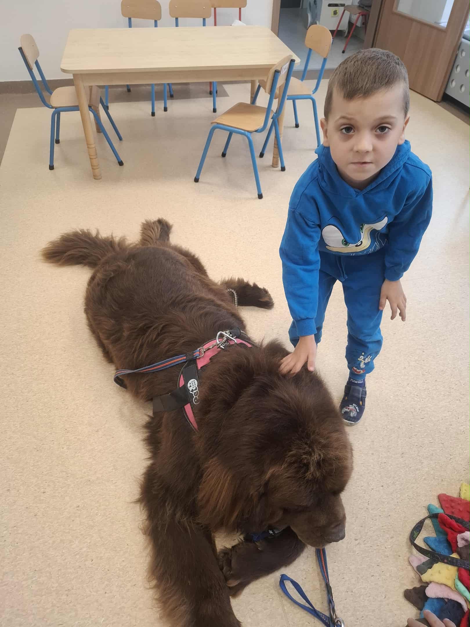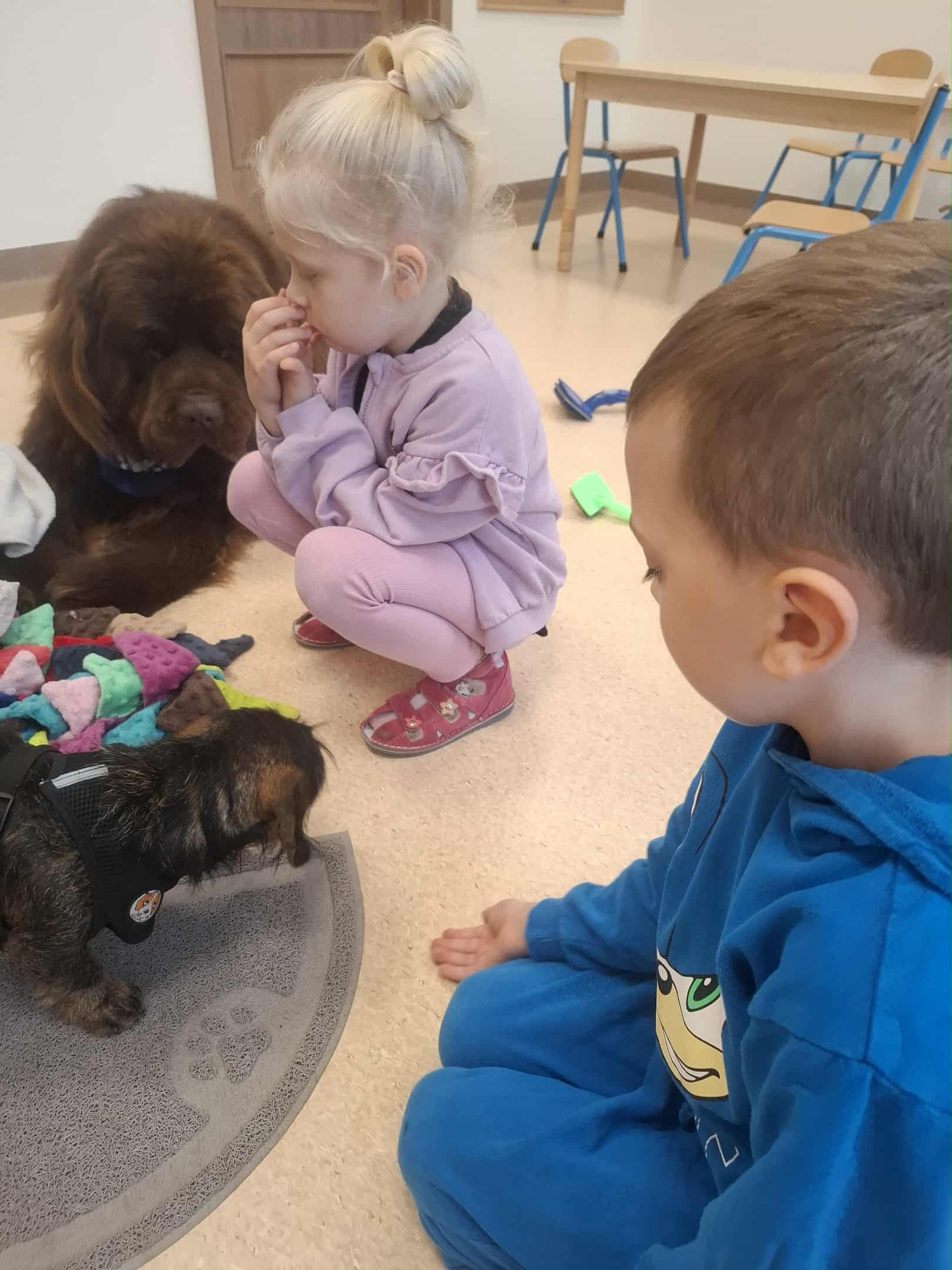 Dziś naszą grupę odwiedziły pieski – Beza, Henryk i Bruno! Dzieci z ogromnym zainteresowaniem przyglądały się czworonogom, obserwując ich zachowanie, sposób poruszania się i reakcje. Mogły je pogłaskać, uczesać oraz spędzić z nimi miło i spokojnie czas.