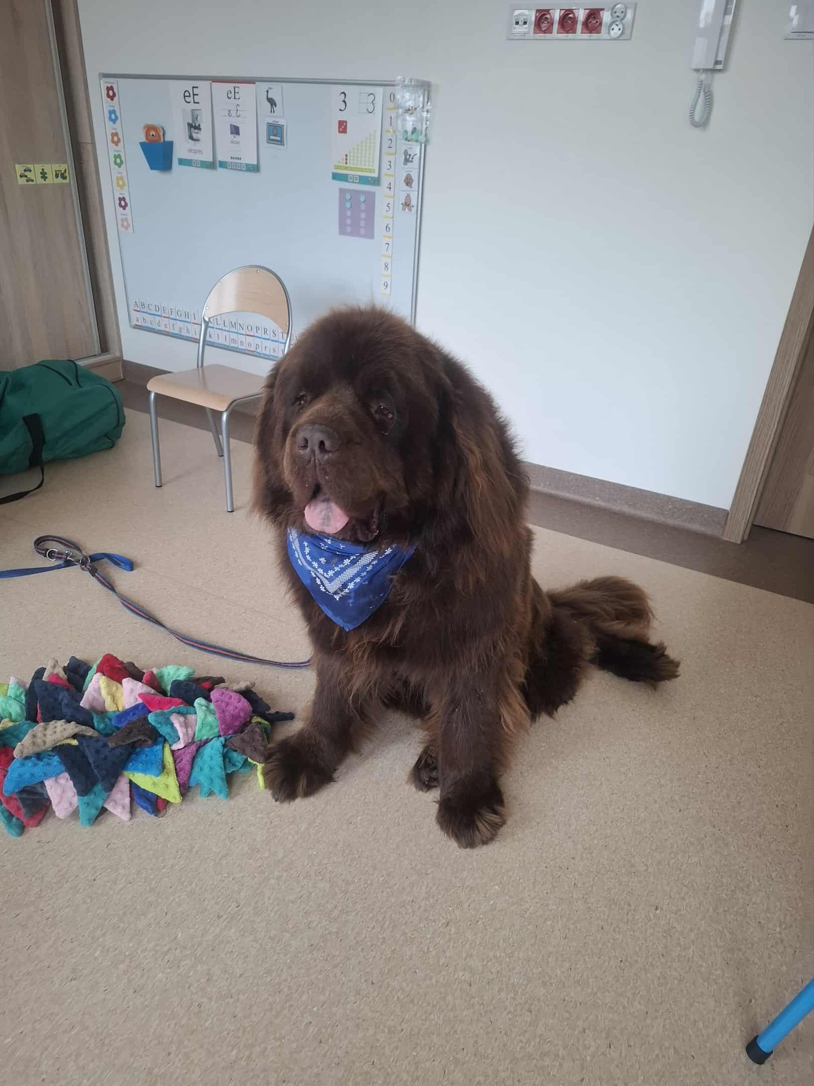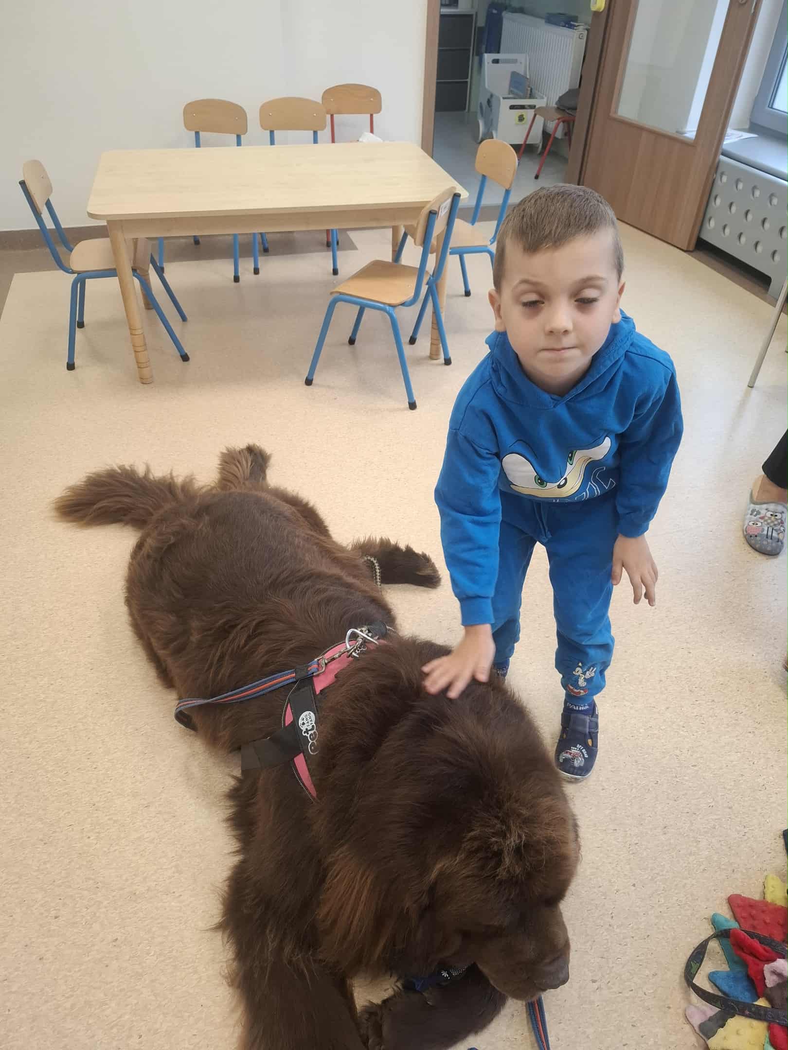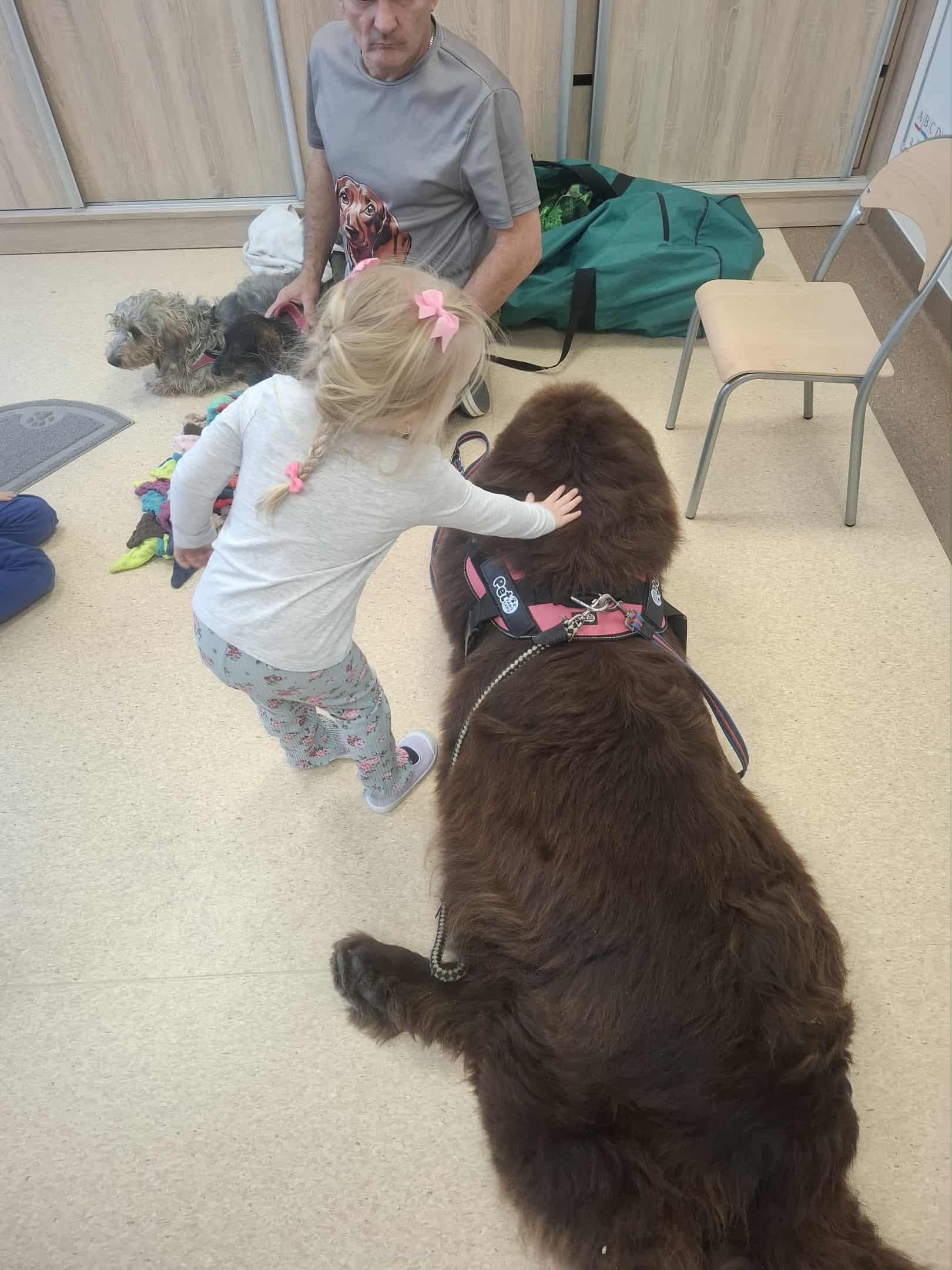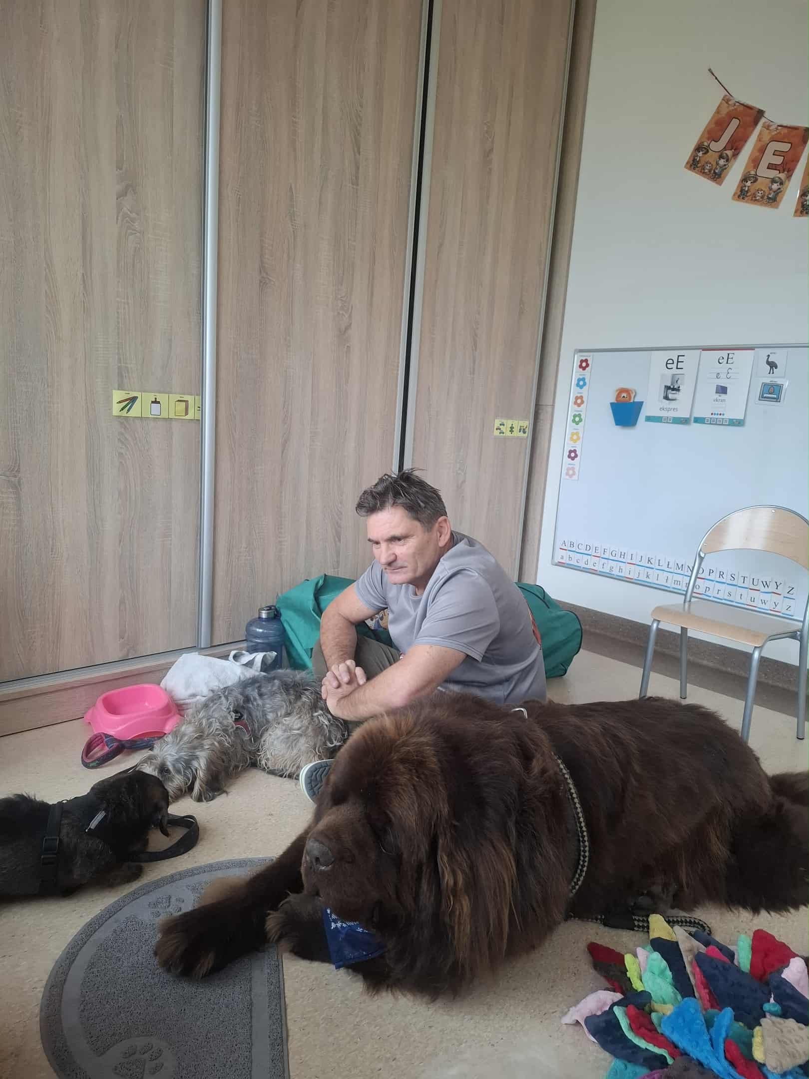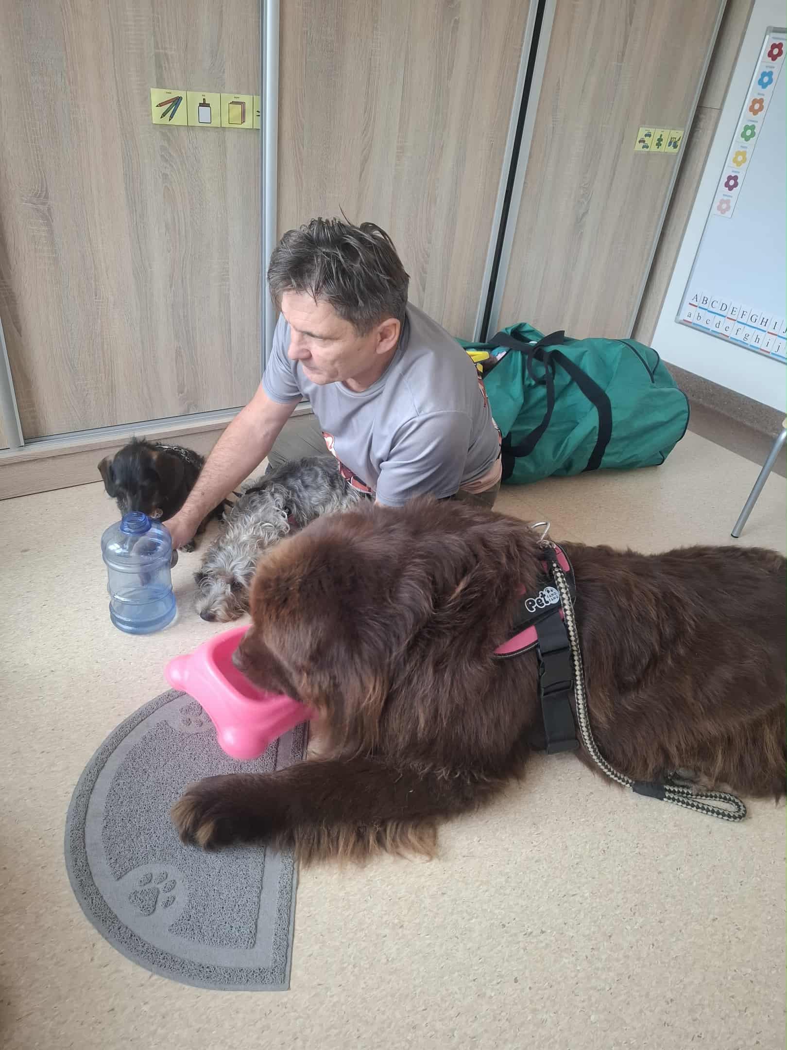 Dziś naszą grupę odwiedziły pieski – Beza, Henryk i Bruno! Dzieci z ogromnym zainteresowaniem przyglądały się czworonogom, obserwując ich zachowanie, sposób poruszania się i reakcje. Mogły je pogłaskać, uczesać oraz spędzić z nimi miło i spokojnie czas.