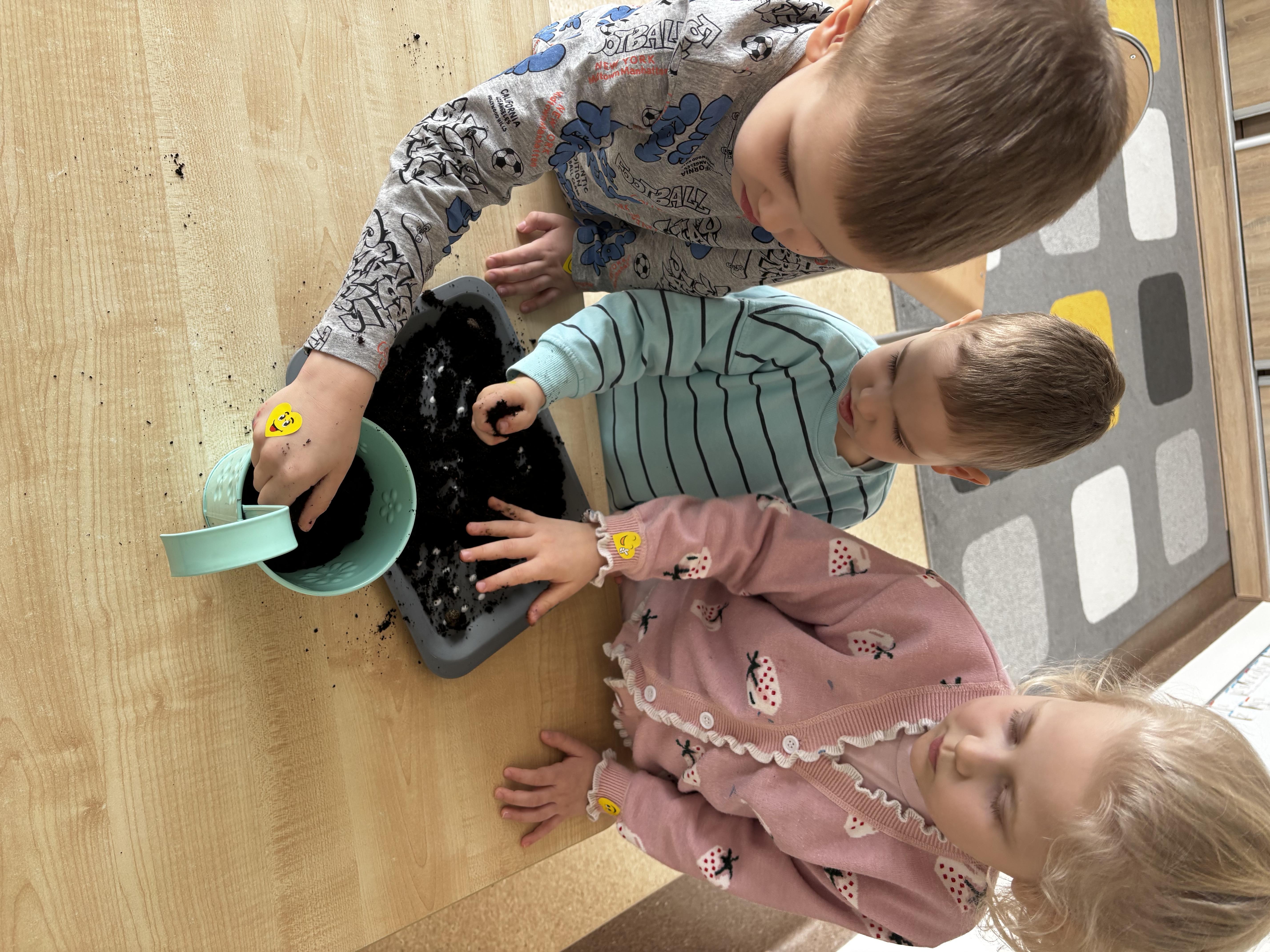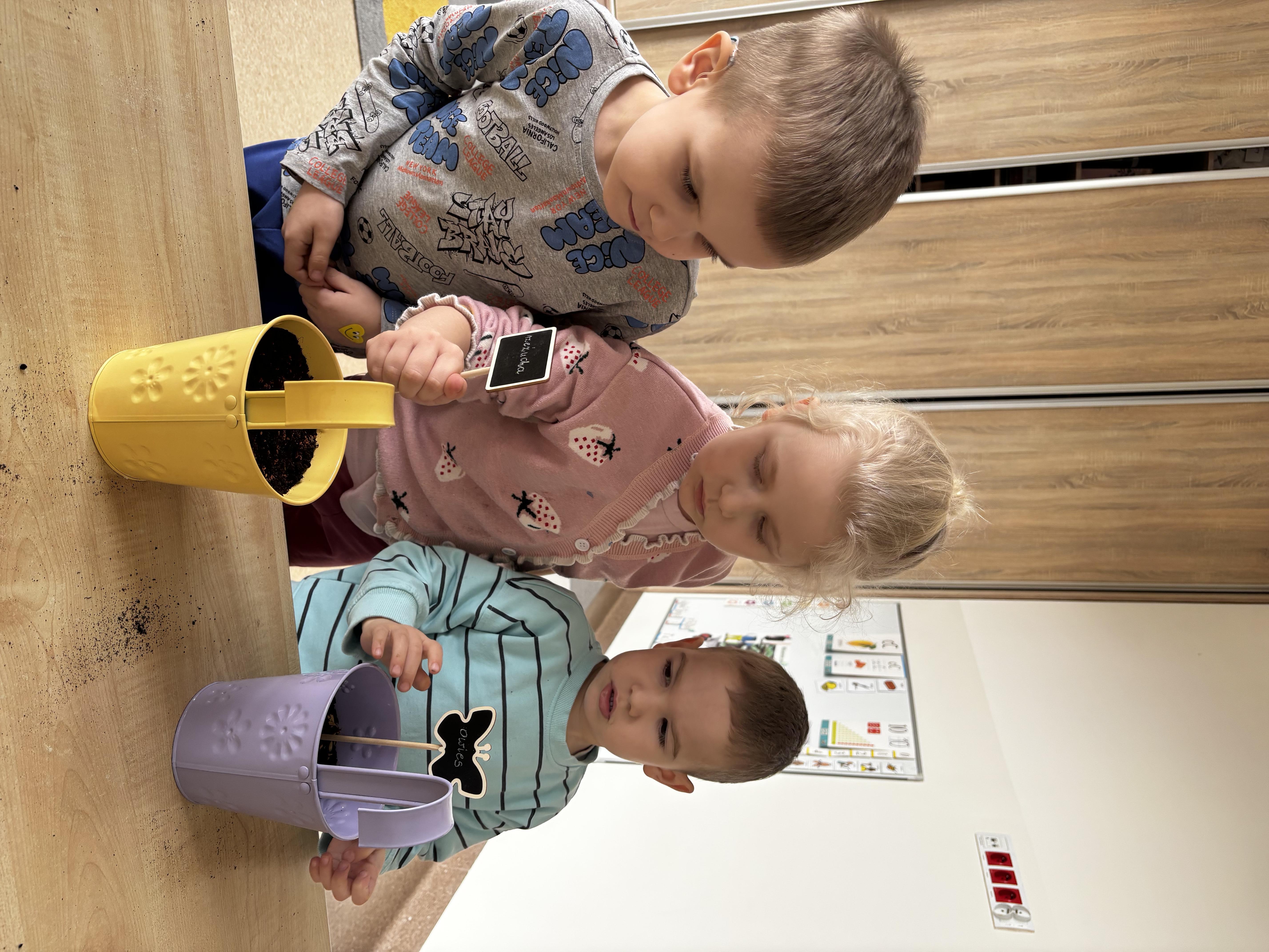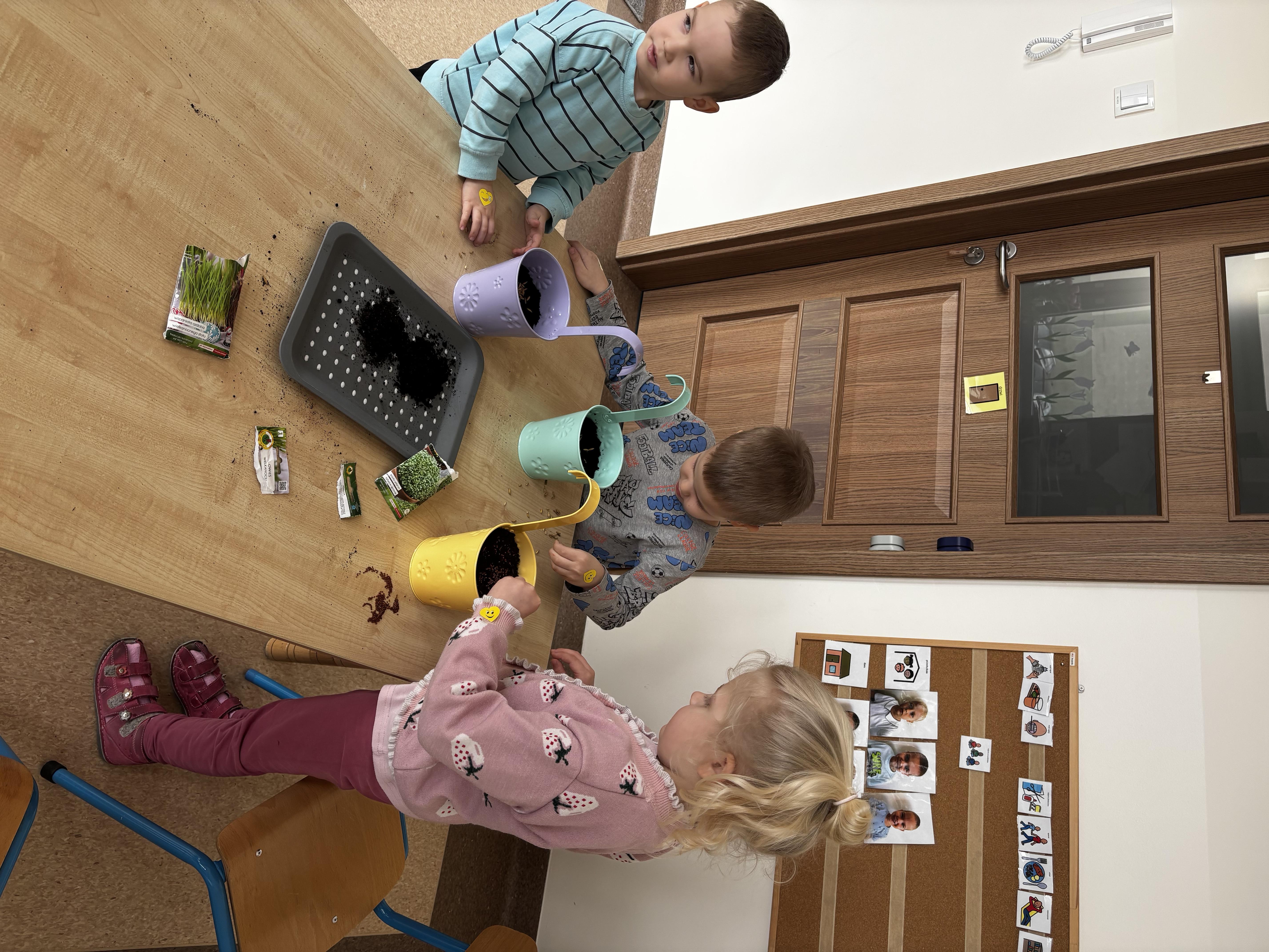 W ramach naszego tematu przewodniego zamieniliśmy się w prawdziwych ogrodników. Każdy z nas dostał swoją małą „grządkę”, czyli doniczkę, w której rozpoczęła się niezwykła przygoda z sadzeniem.Najpierw wsypaliśmy ziemię – było trochę rozsypywania i dużo śmiechu! Potem delikatnie posialiśmy rzeżuchę i owies, podlaliśmy wodą. Teraz nasze roślinki mają wszystko, czego potrzebują, by rosnąć – a my będziemy je codziennie podlewać. Już nie możemy się doczekać, aż nasz „ogródek” zazieleni się i pokaże, jak pięknie rosną nasze roślinki.
