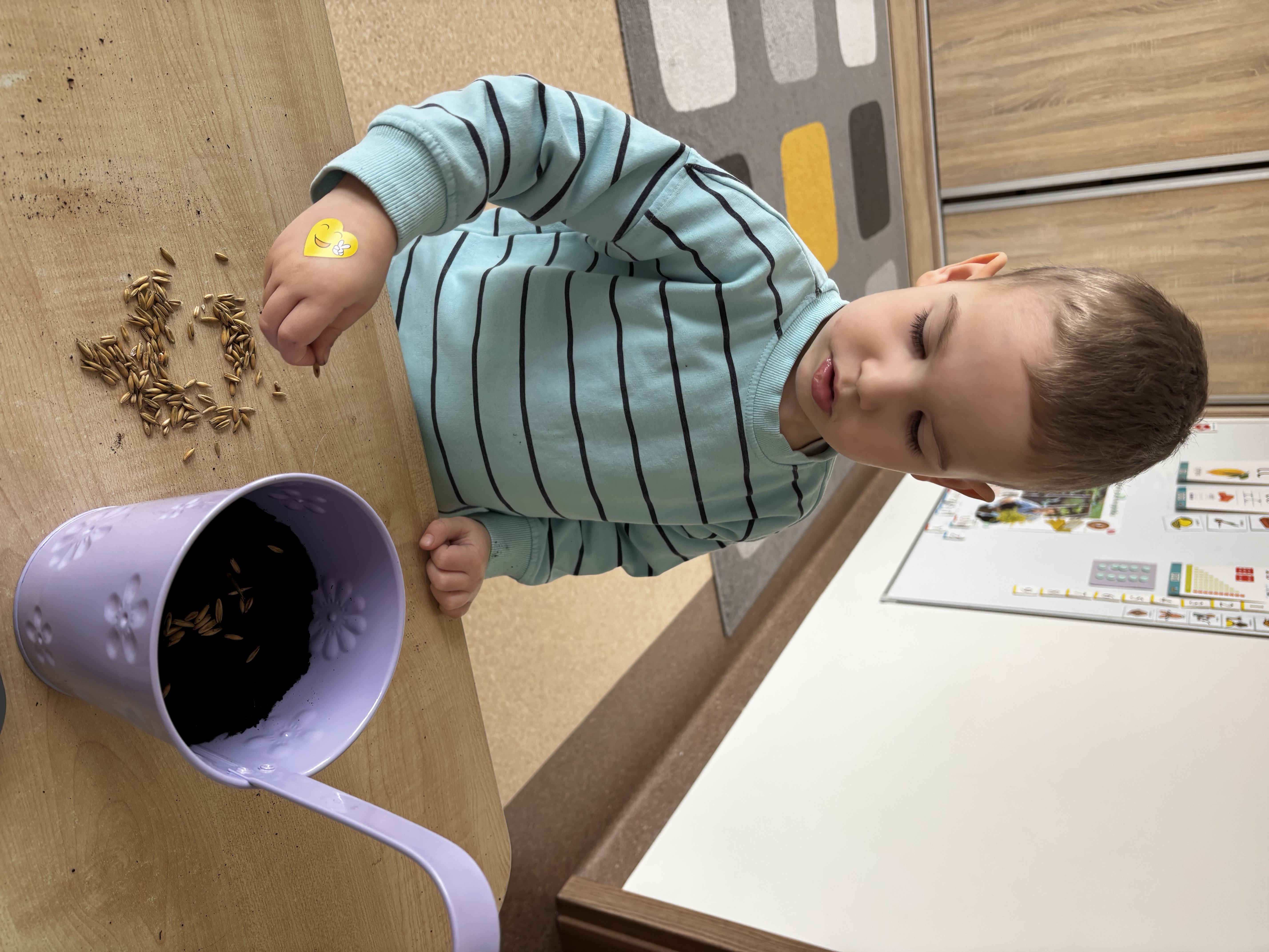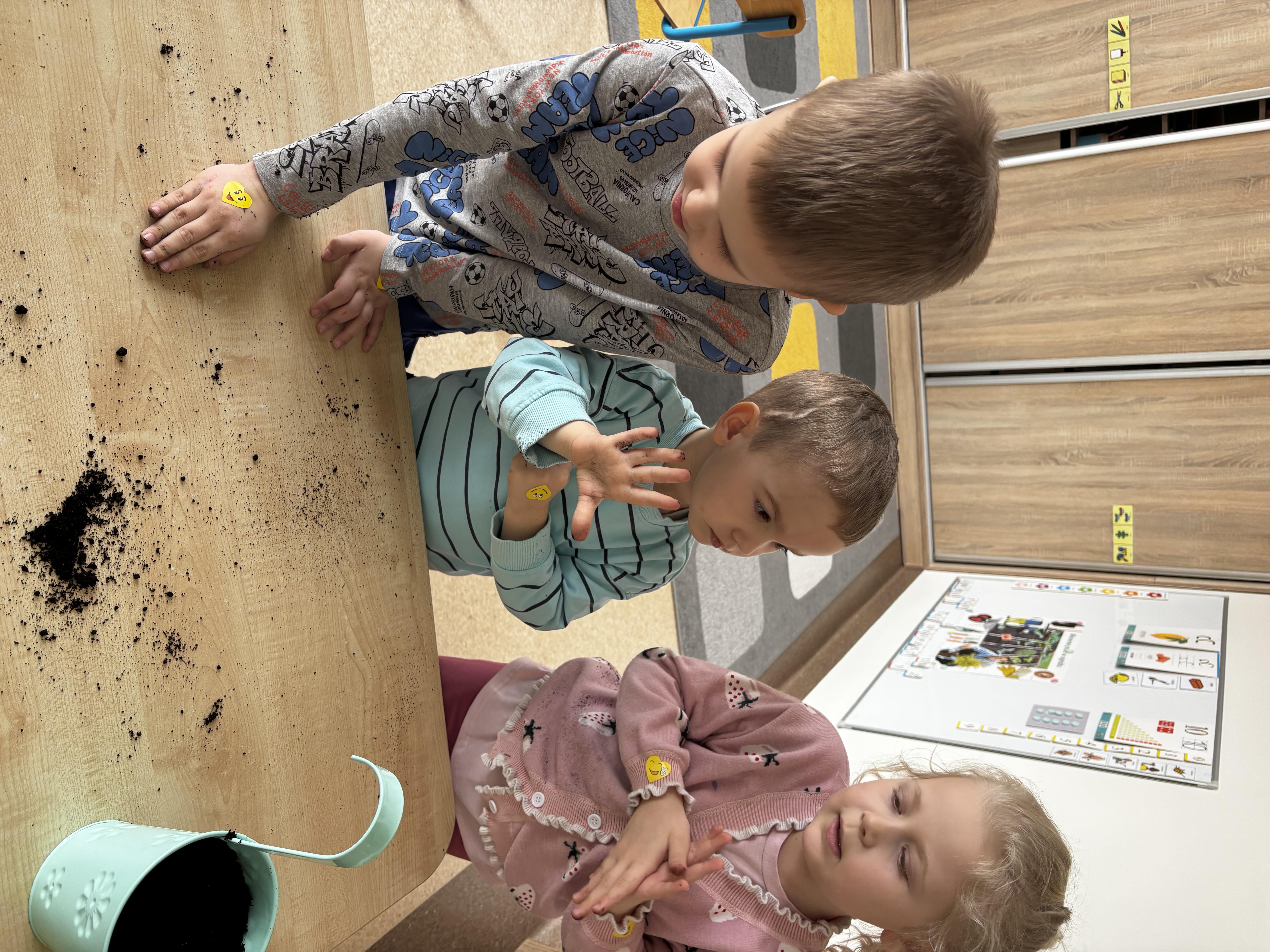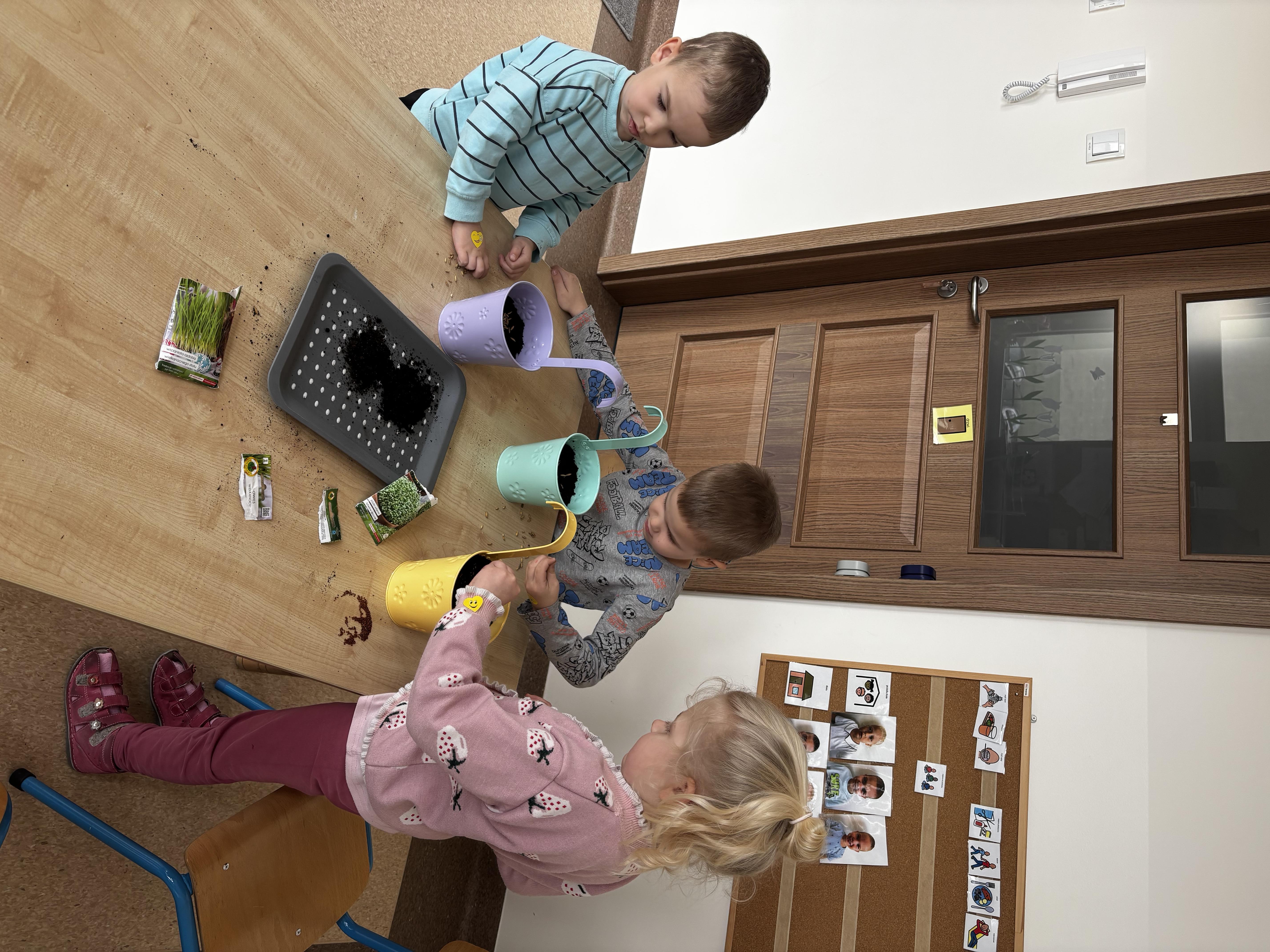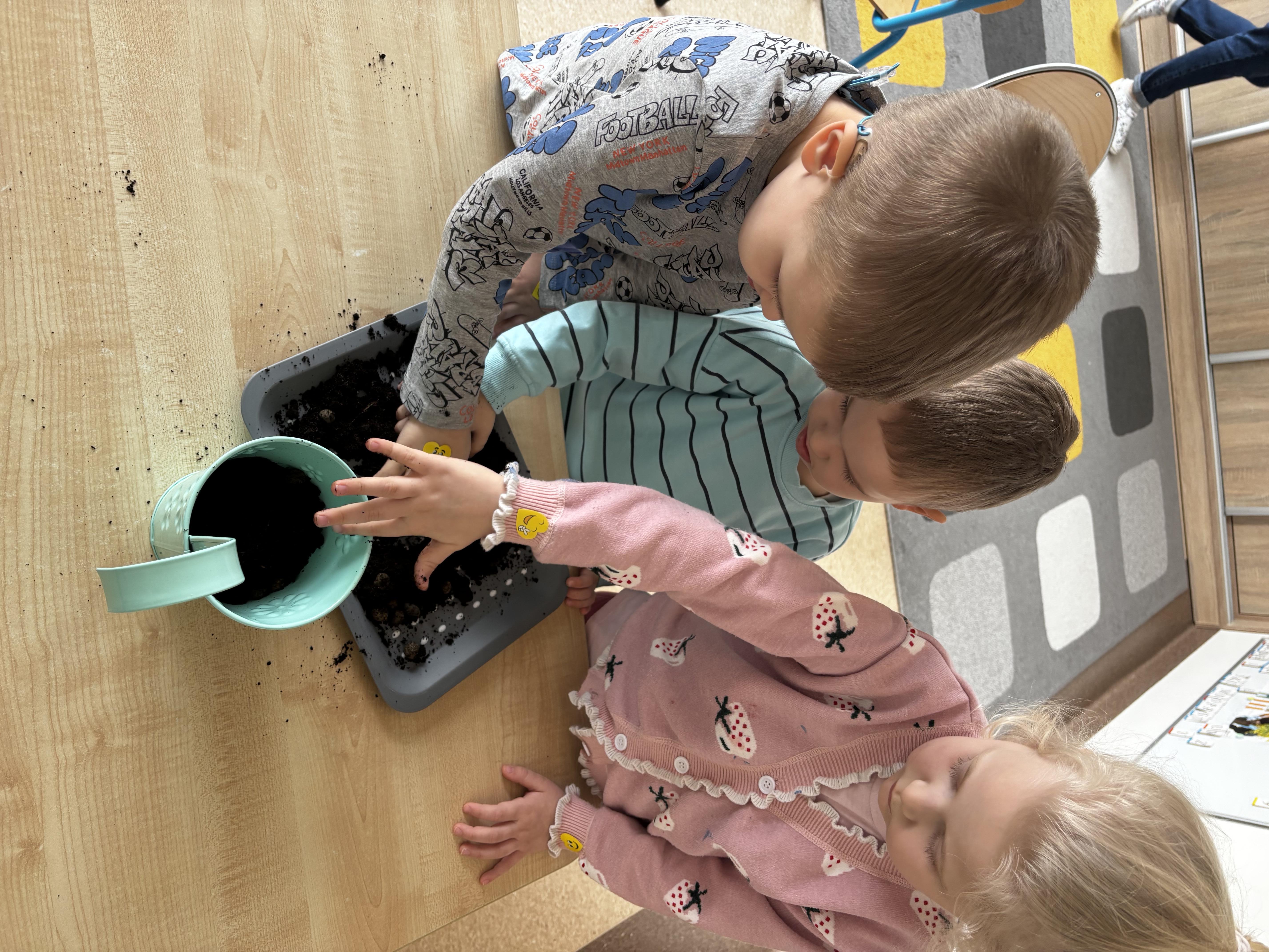 W ramach naszego tematu przewodniego zamieniliśmy się w prawdziwych ogrodników. Każdy z nas dostał swoją małą „grządkę”, czyli doniczkę, w której rozpoczęła się niezwykła przygoda z sadzeniem.Najpierw wsypaliśmy ziemię – było trochę rozsypywania i dużo śmiechu! Potem delikatnie posialiśmy rzeżuchę i owies, podlaliśmy wodą. Teraz nasze roślinki mają wszystko, czego potrzebują, by rosnąć – a my będziemy je codziennie podlewać. Już nie możemy się doczekać, aż nasz „ogródek” zazieleni się i pokaże, jak pięknie rosną nasze roślinki.