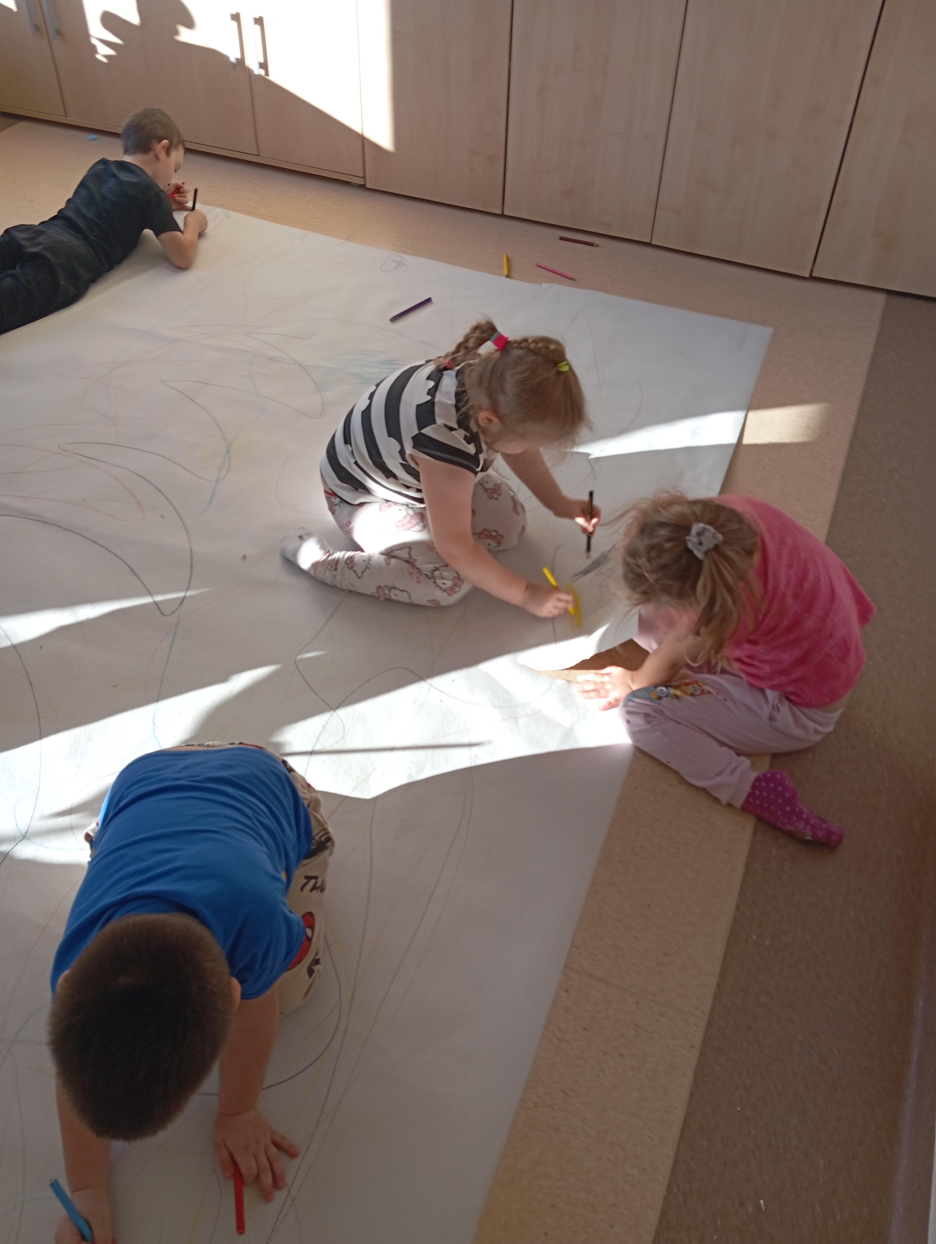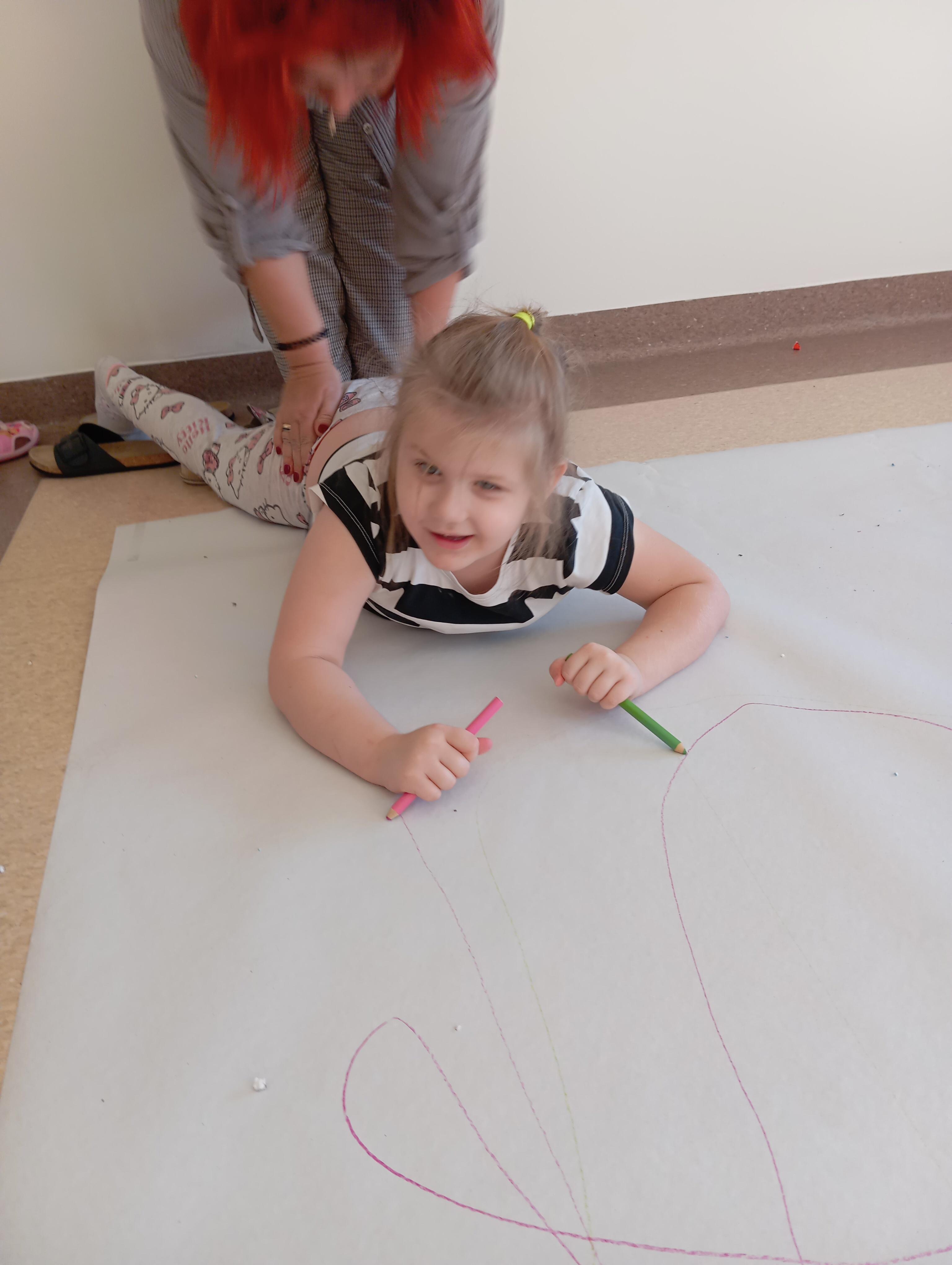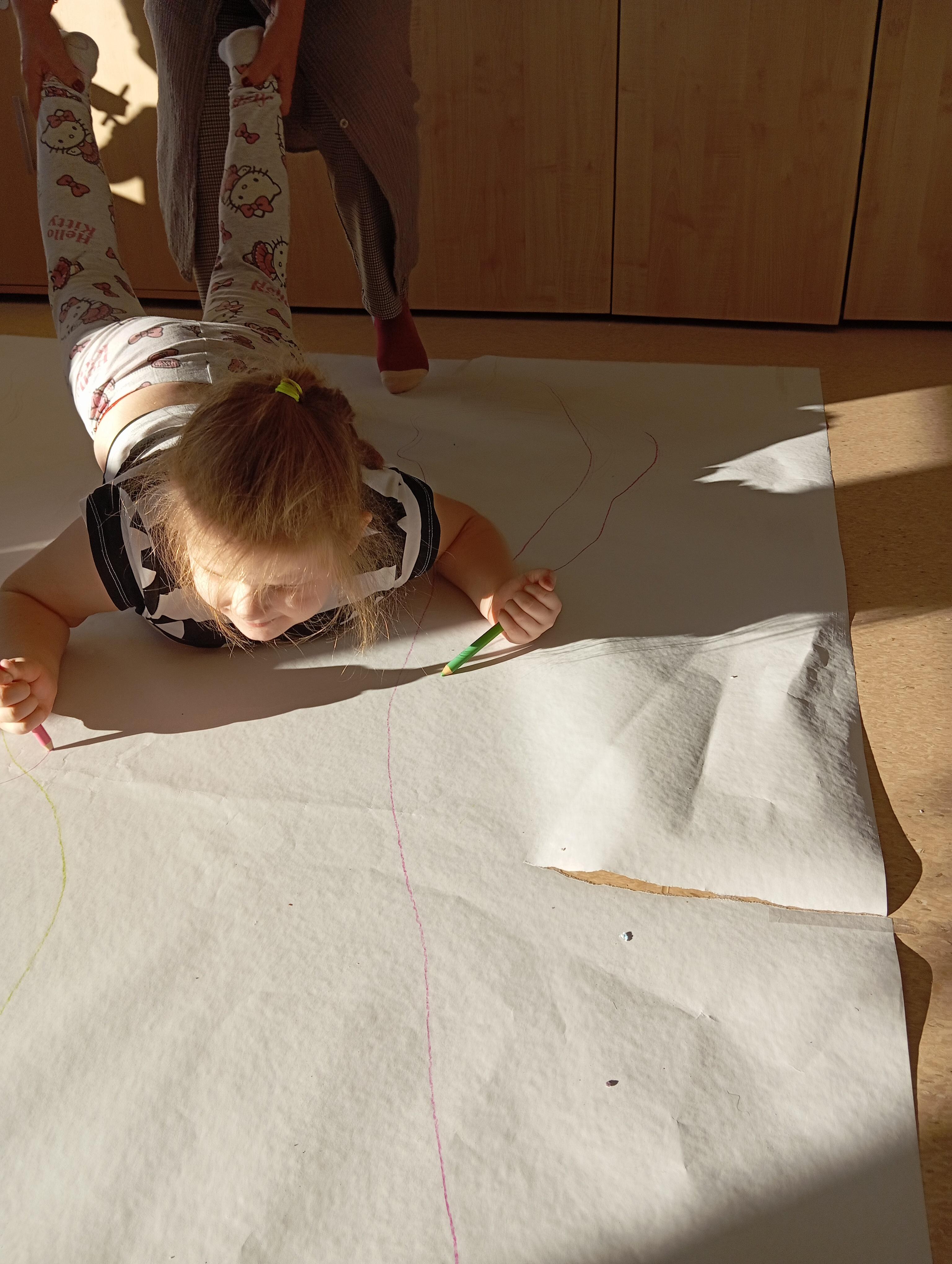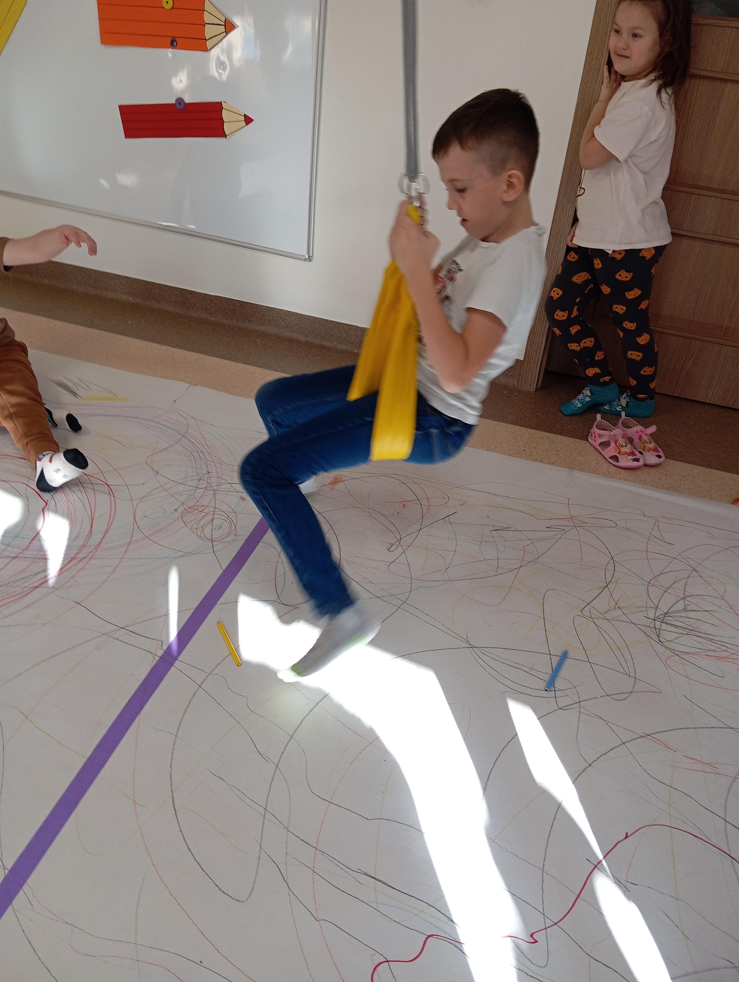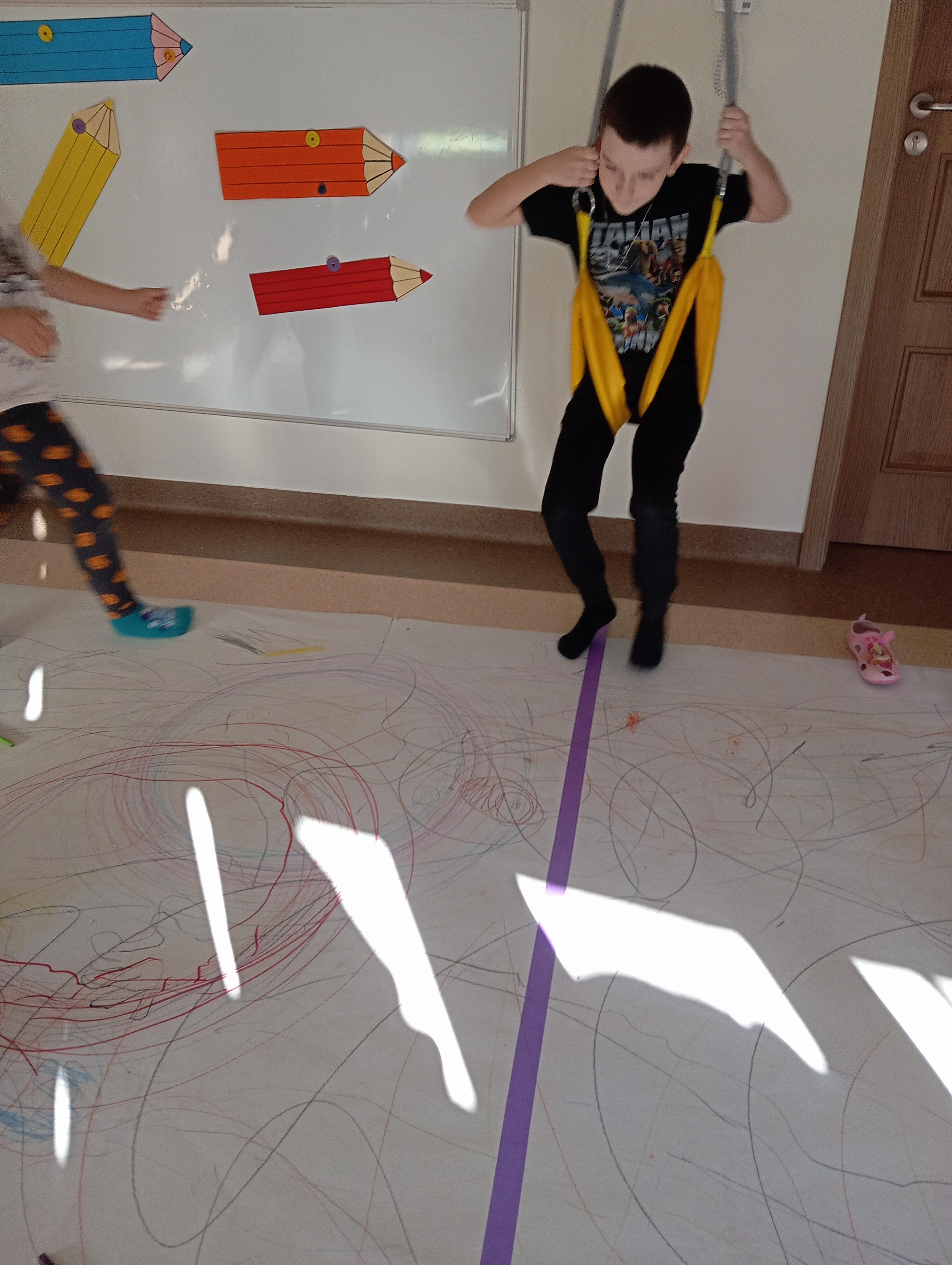 rysowaliśmy dużo i kolorowo, tworząc razem wielki, wspólny plakat:) Okazało się, że można rysować kręcąc się i huśtając, angażując przy tym różne zmysły :) Razem pokonaliśmy kredkowy tor przeszkód oraz ułożyliśmy kredkowe wzory:)