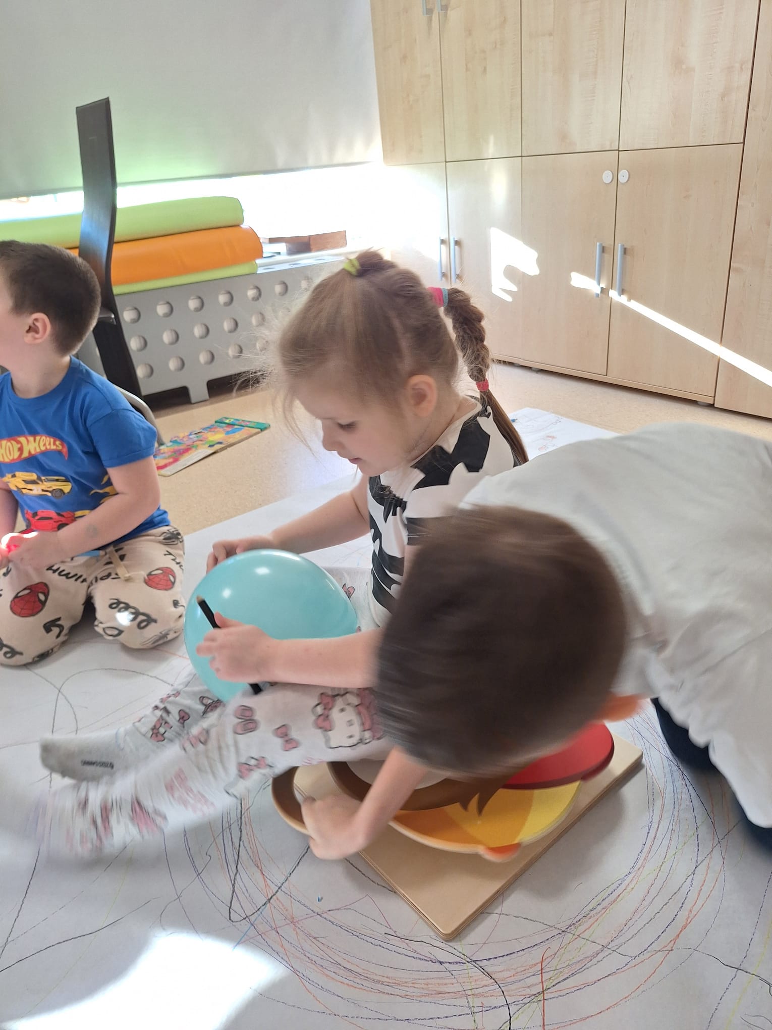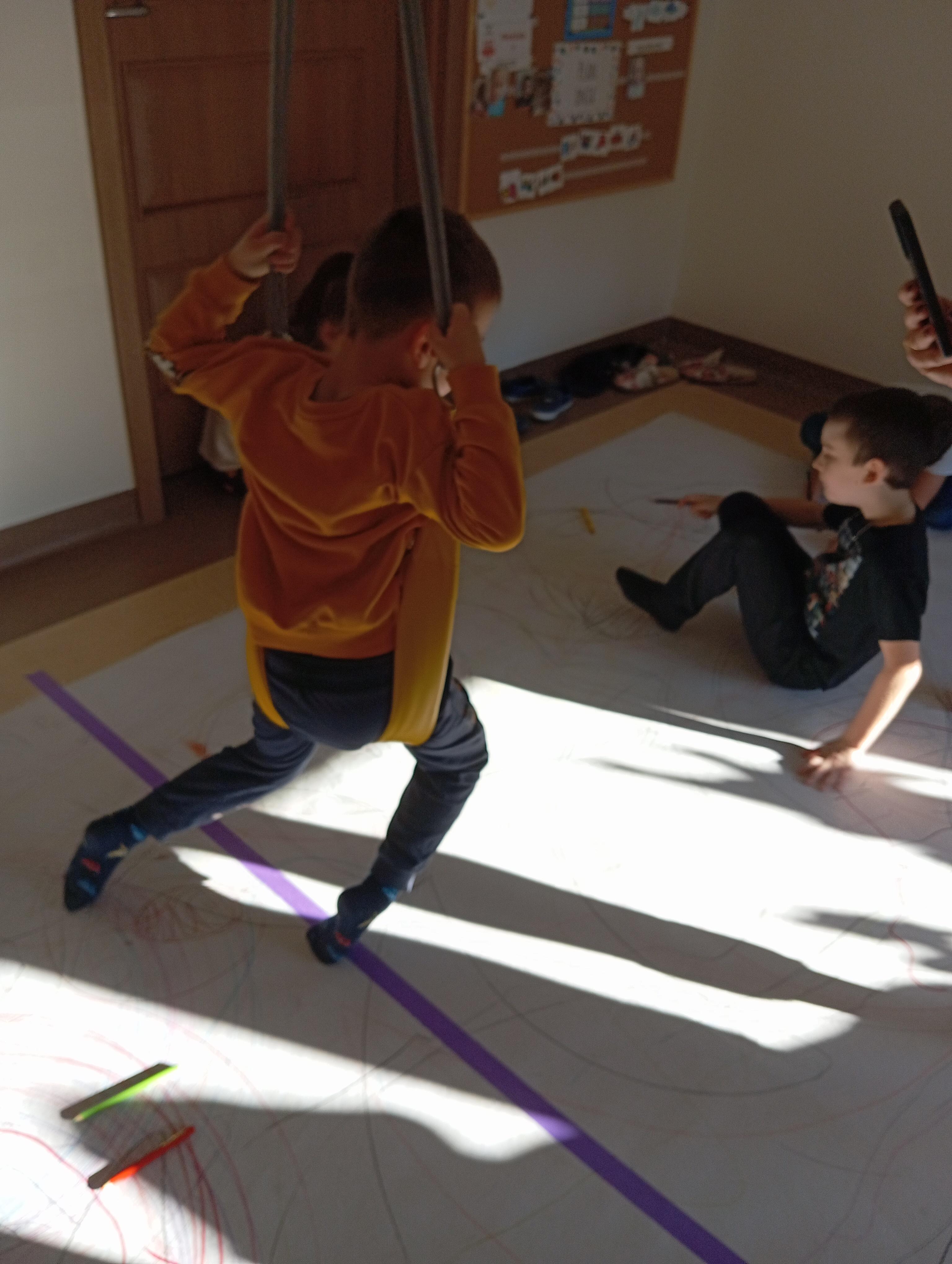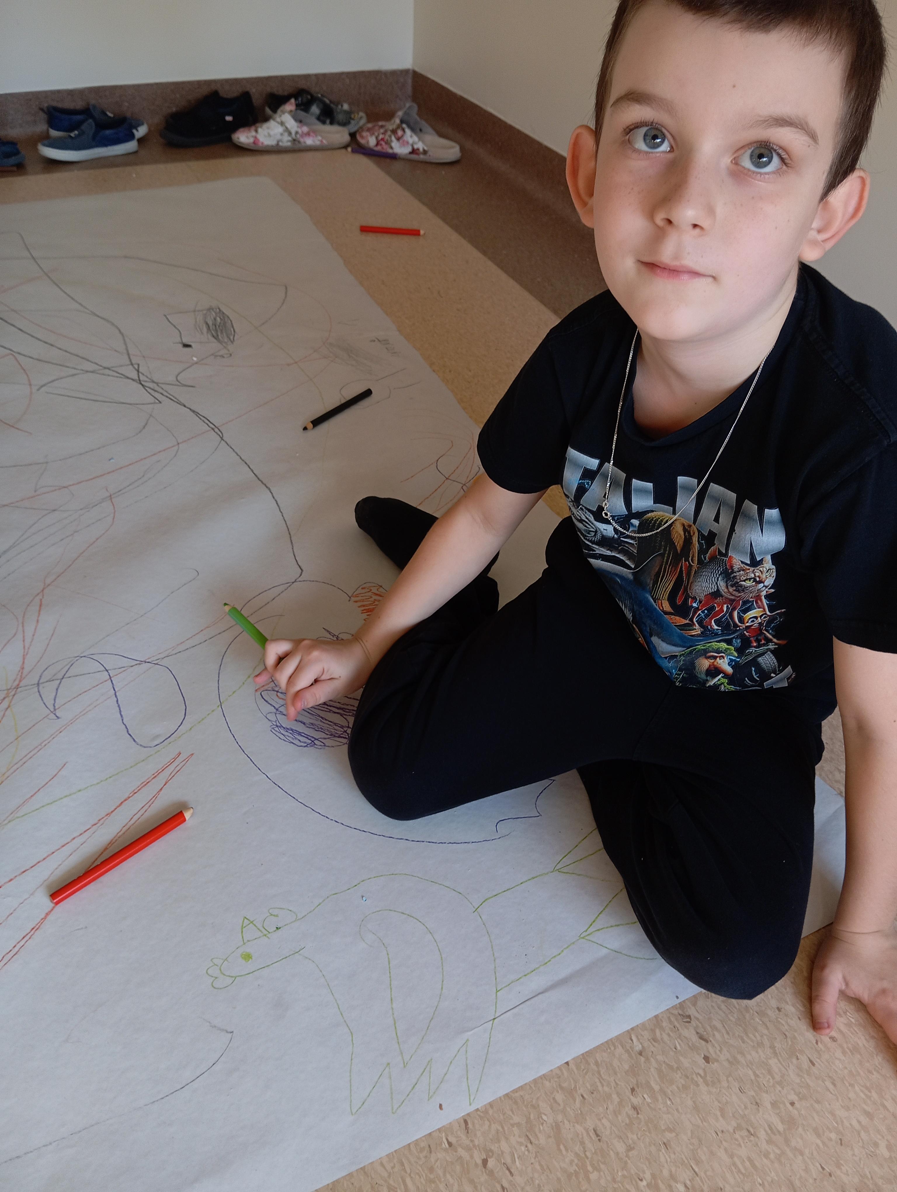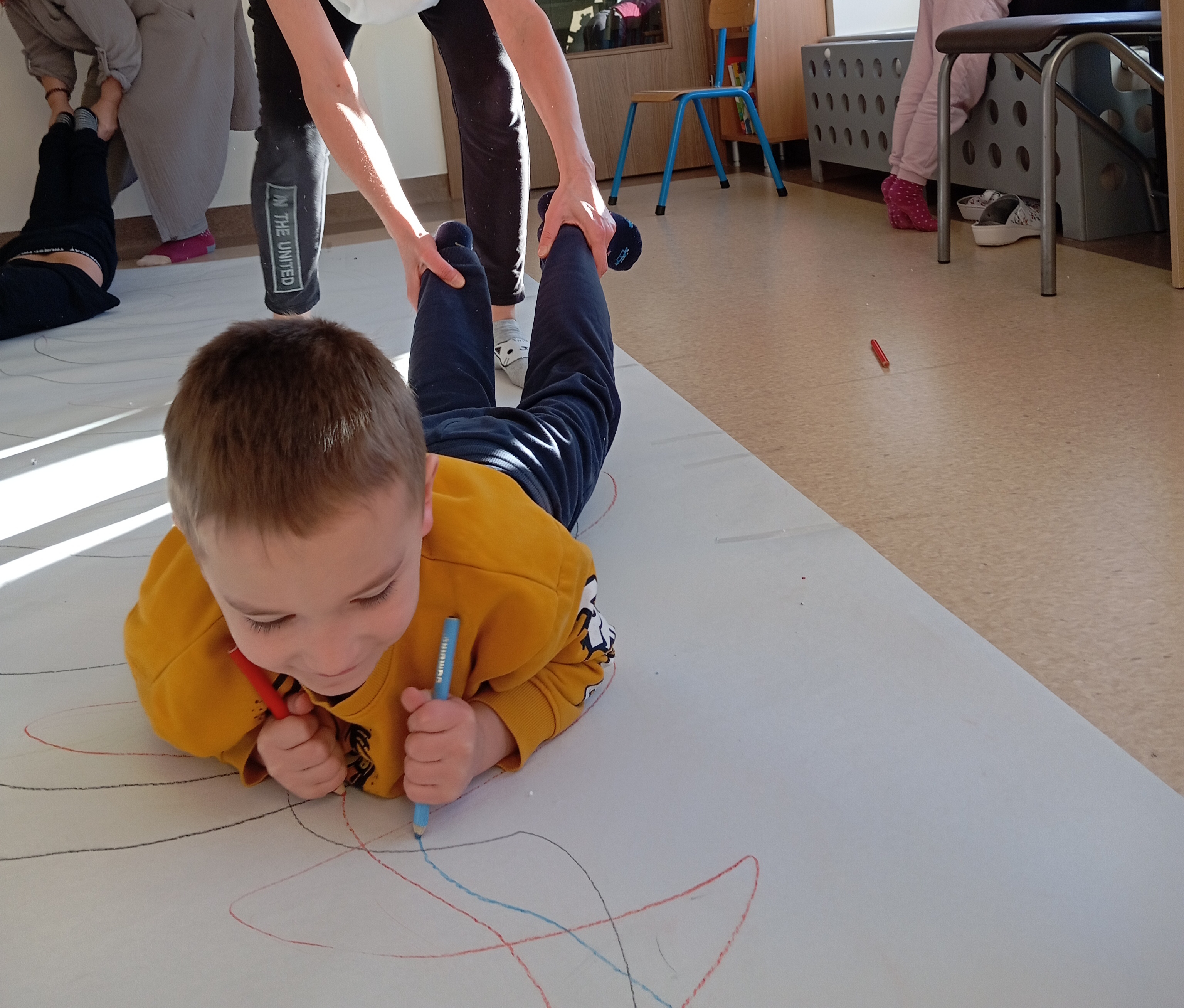 rysowaliśmy dużo i kolorowo, tworząc razem wielki, wspólny plakat:) Okazało się, że można rysować kręcąc się i huśtając, angażując przy tym różne zmysły :) Razem pokonaliśmy kredkowy tor przeszkód oraz ułożyliśmy kredkowe wzory:)