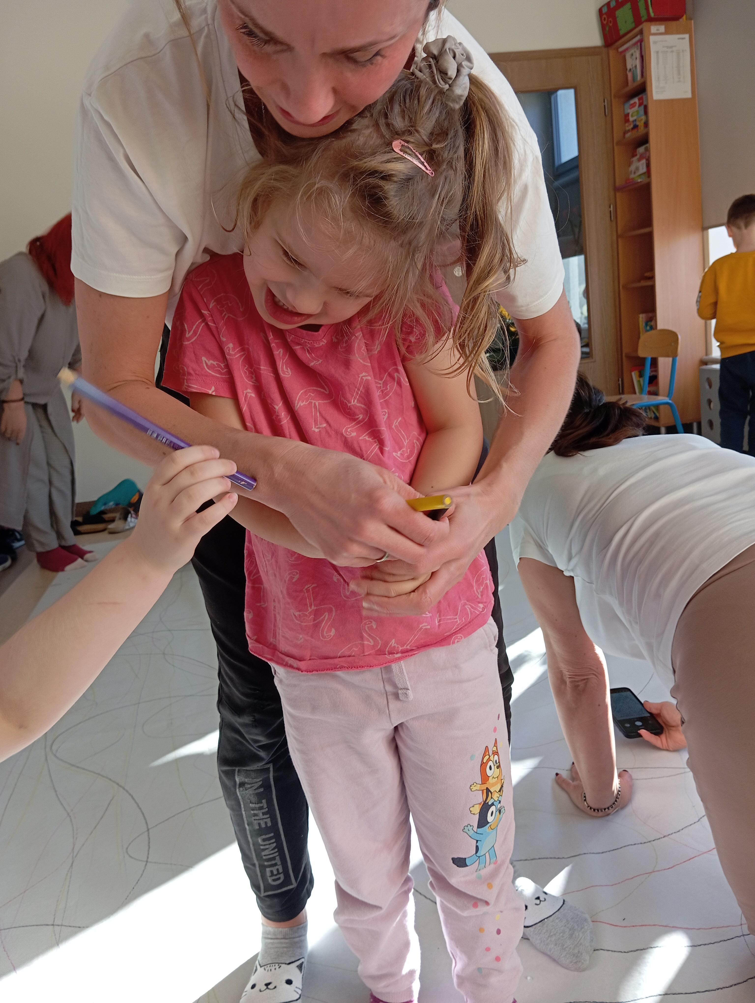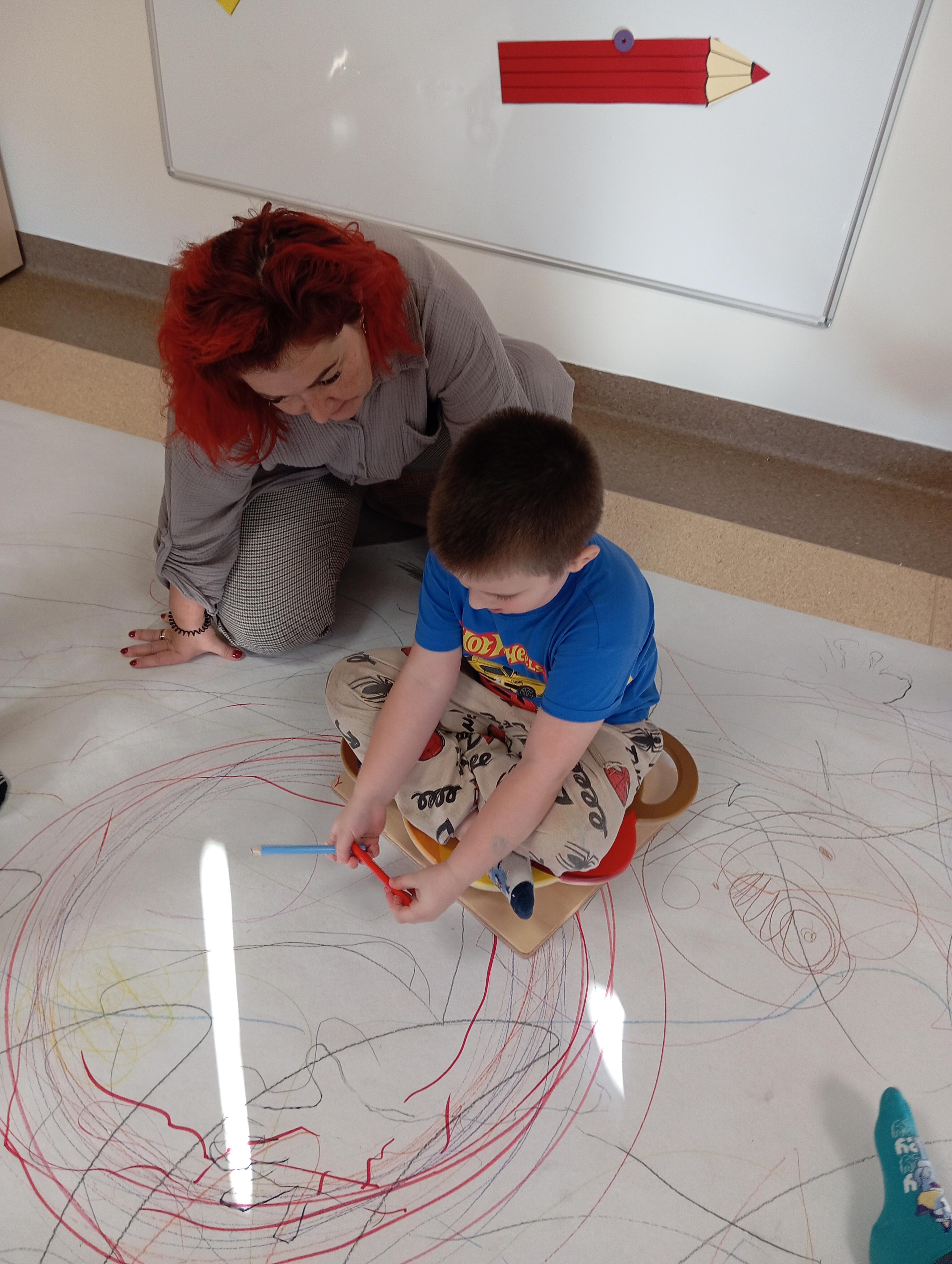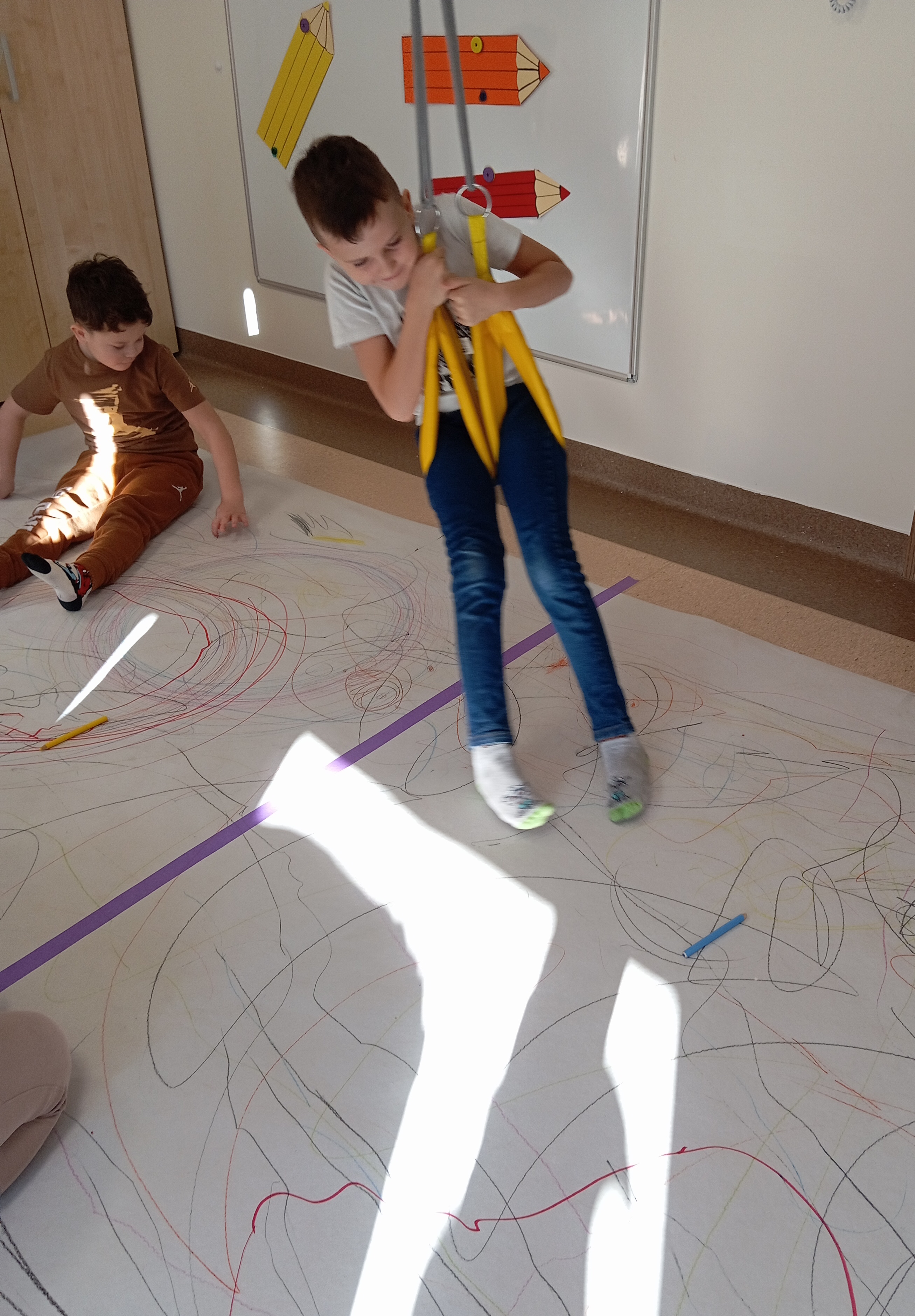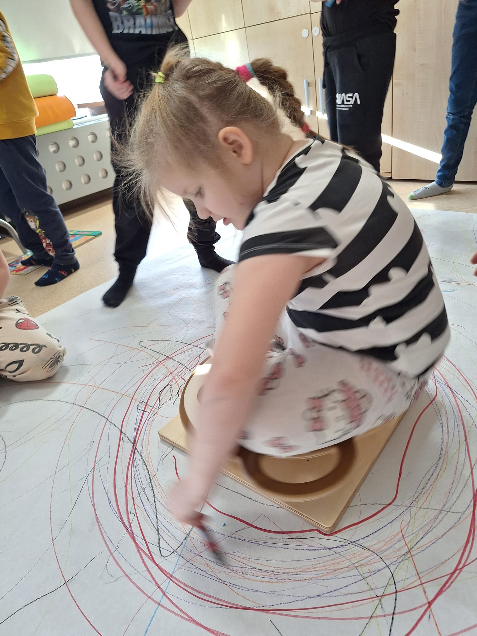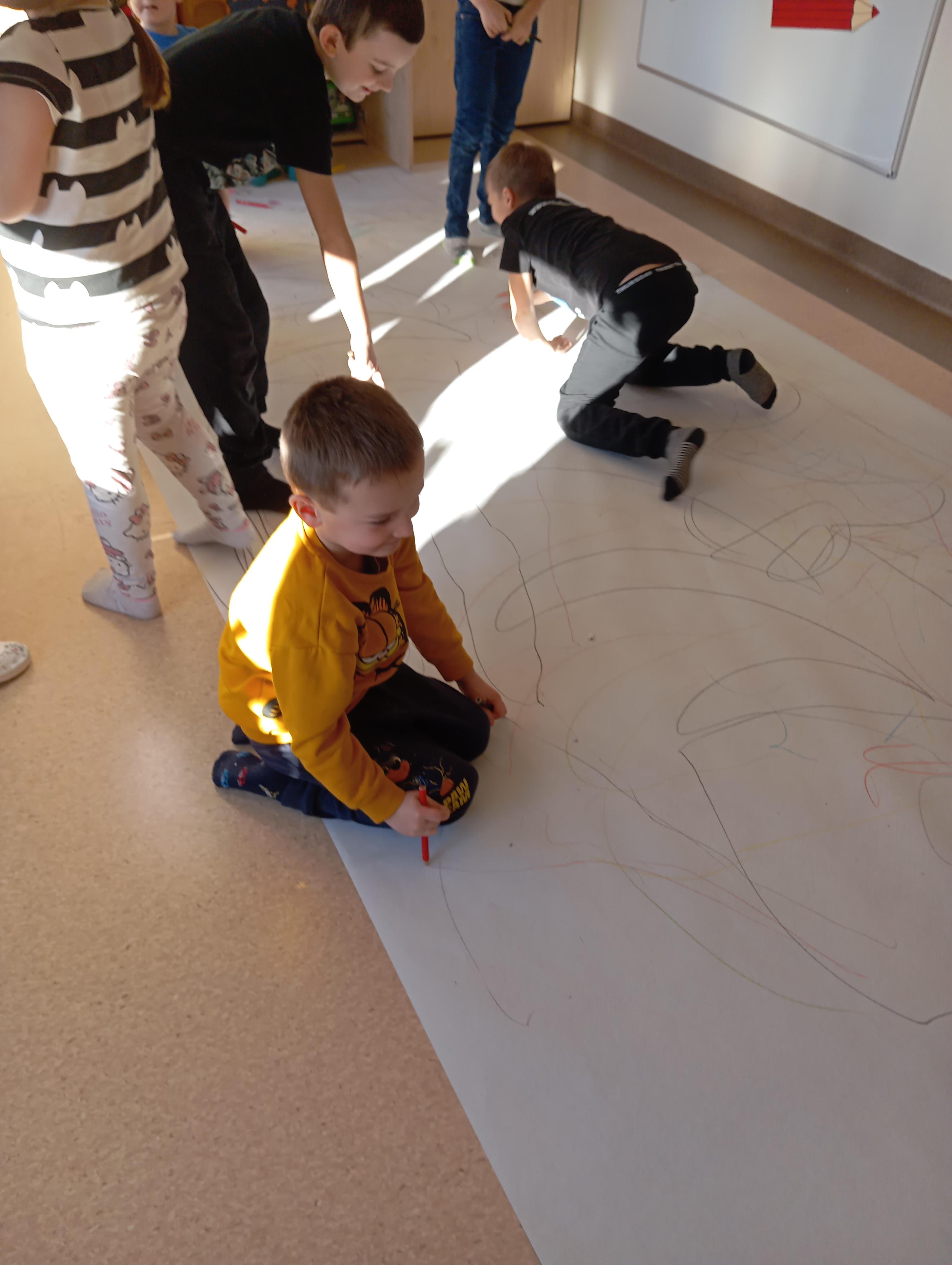 rysowaliśmy dużo i kolorowo, tworząc razem wielki, wspólny plakat:) Okazało się, że można rysować kręcąc się i huśtając, angażując przy tym różne zmysły :) Razem pokonaliśmy kredkowy tor przeszkód oraz ułożyliśmy kredkowe wzory:)