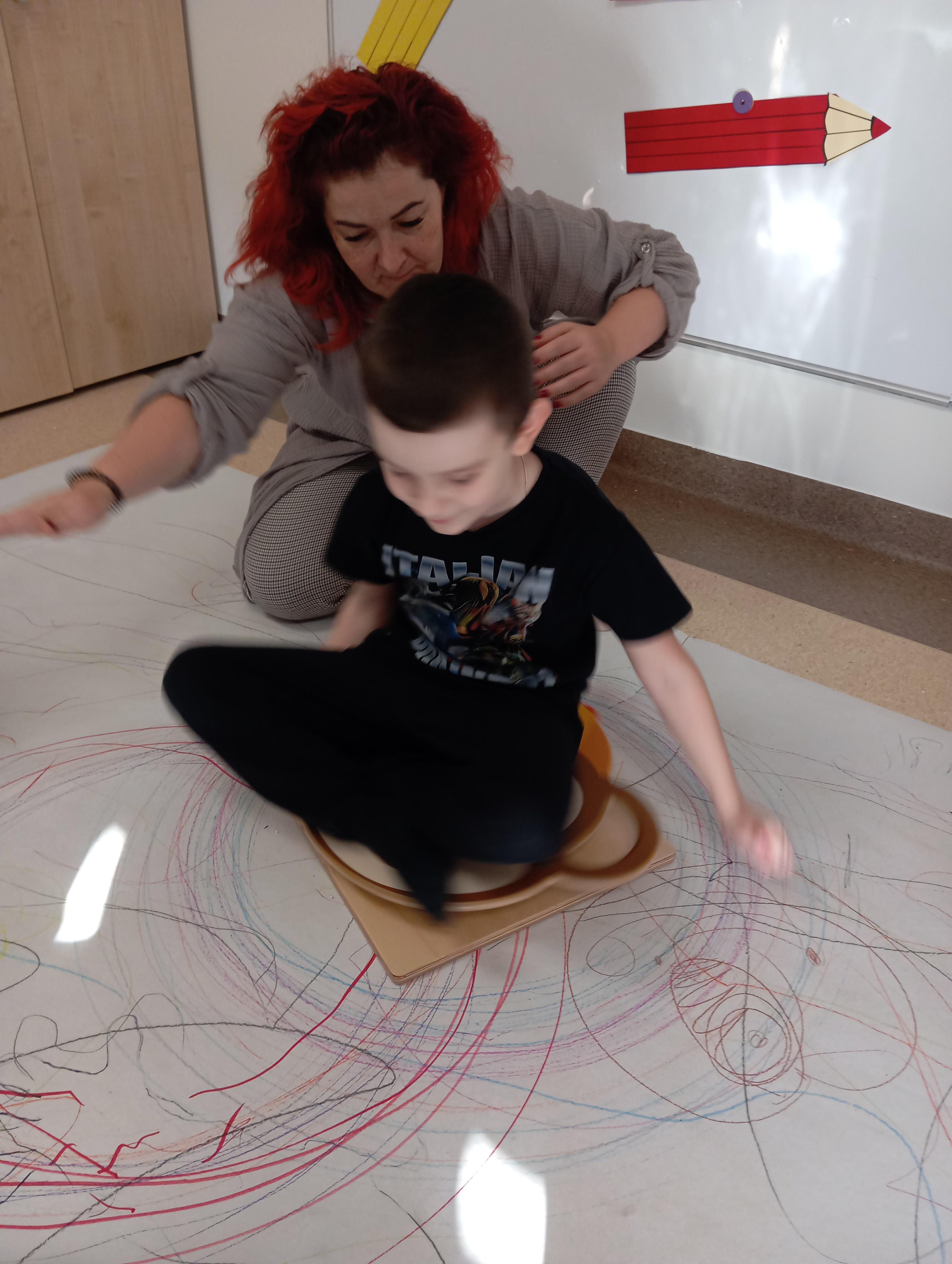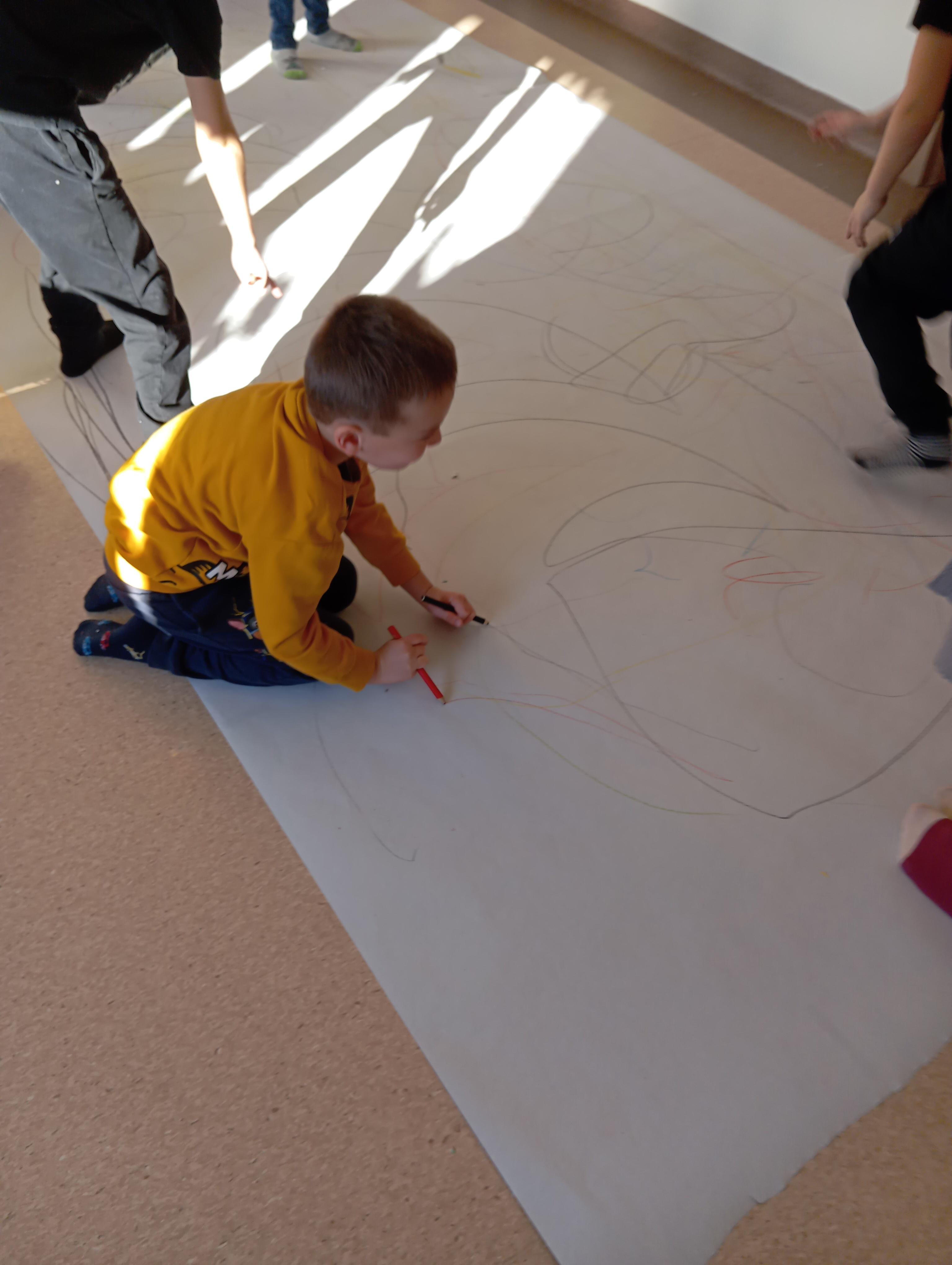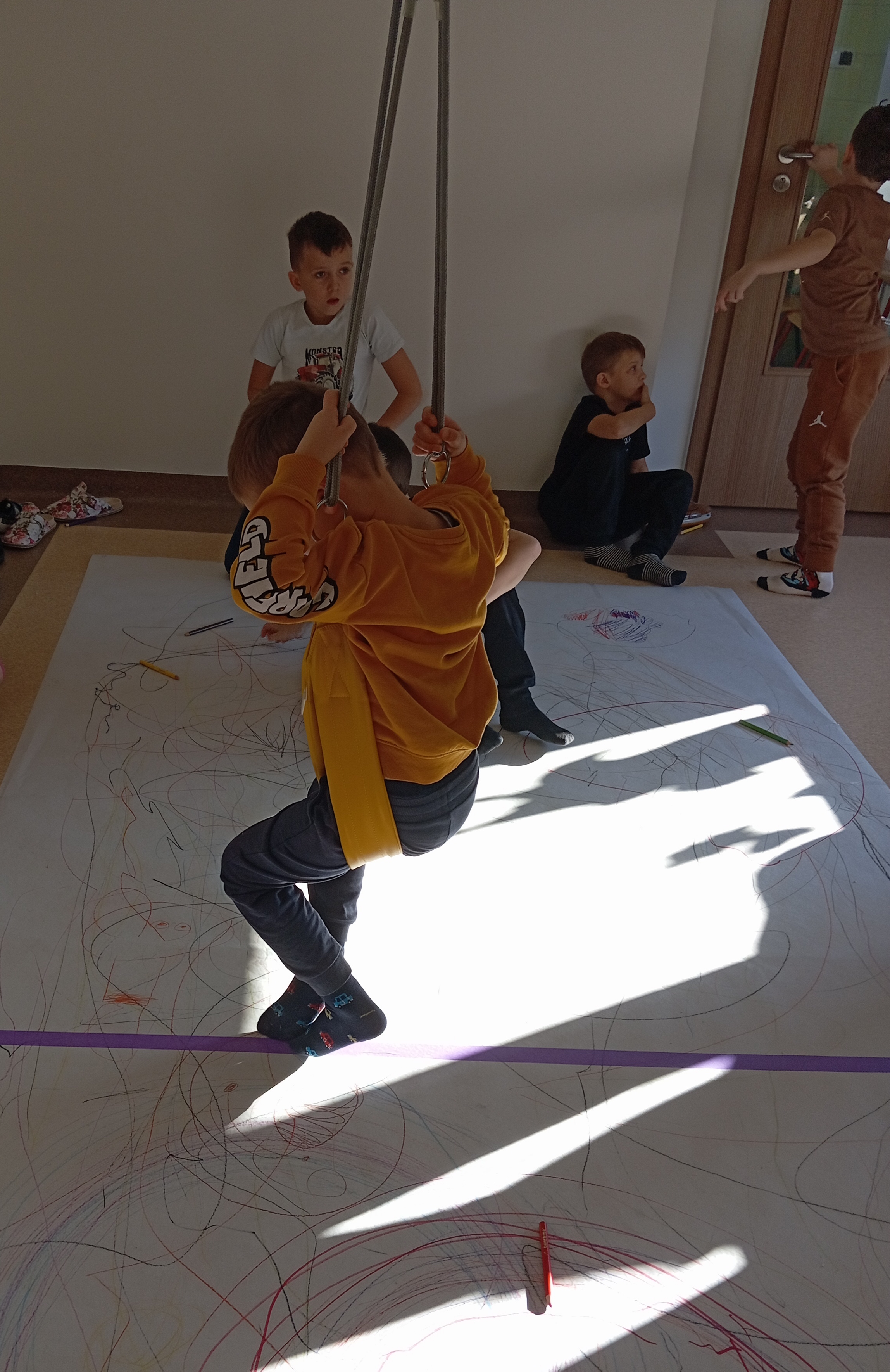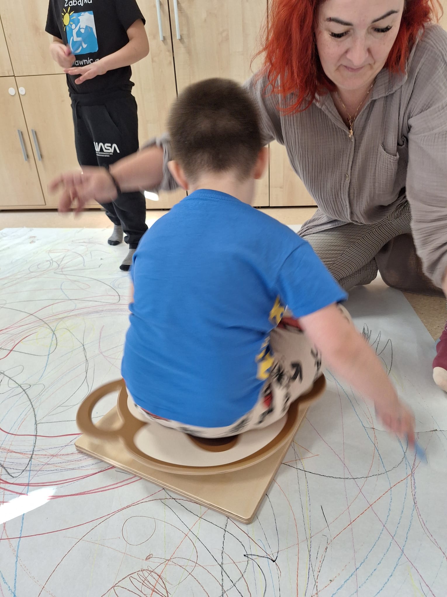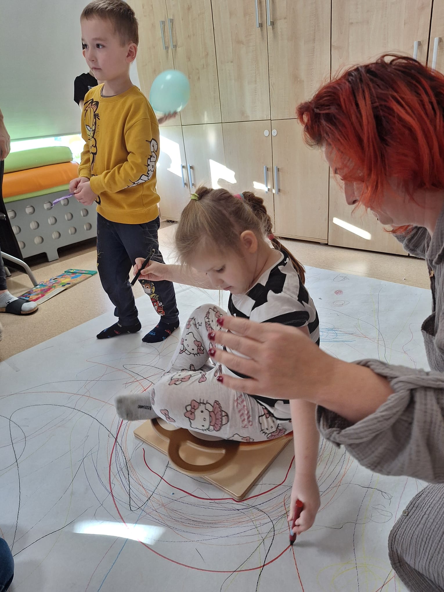 rysowaliśmy dużo i kolorowo, tworząc razem wielki, wspólny plakat:) Okazało się, że można rysować kręcąc się i huśtając, angażując przy tym różne zmysły :) Razem pokonaliśmy kredkowy tor przeszkód oraz ułożyliśmy kredkowe wzory:)