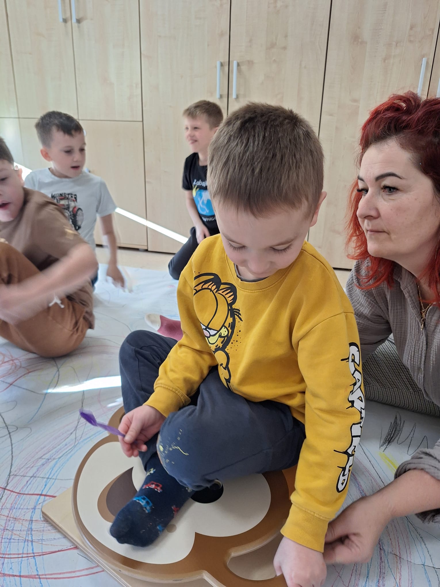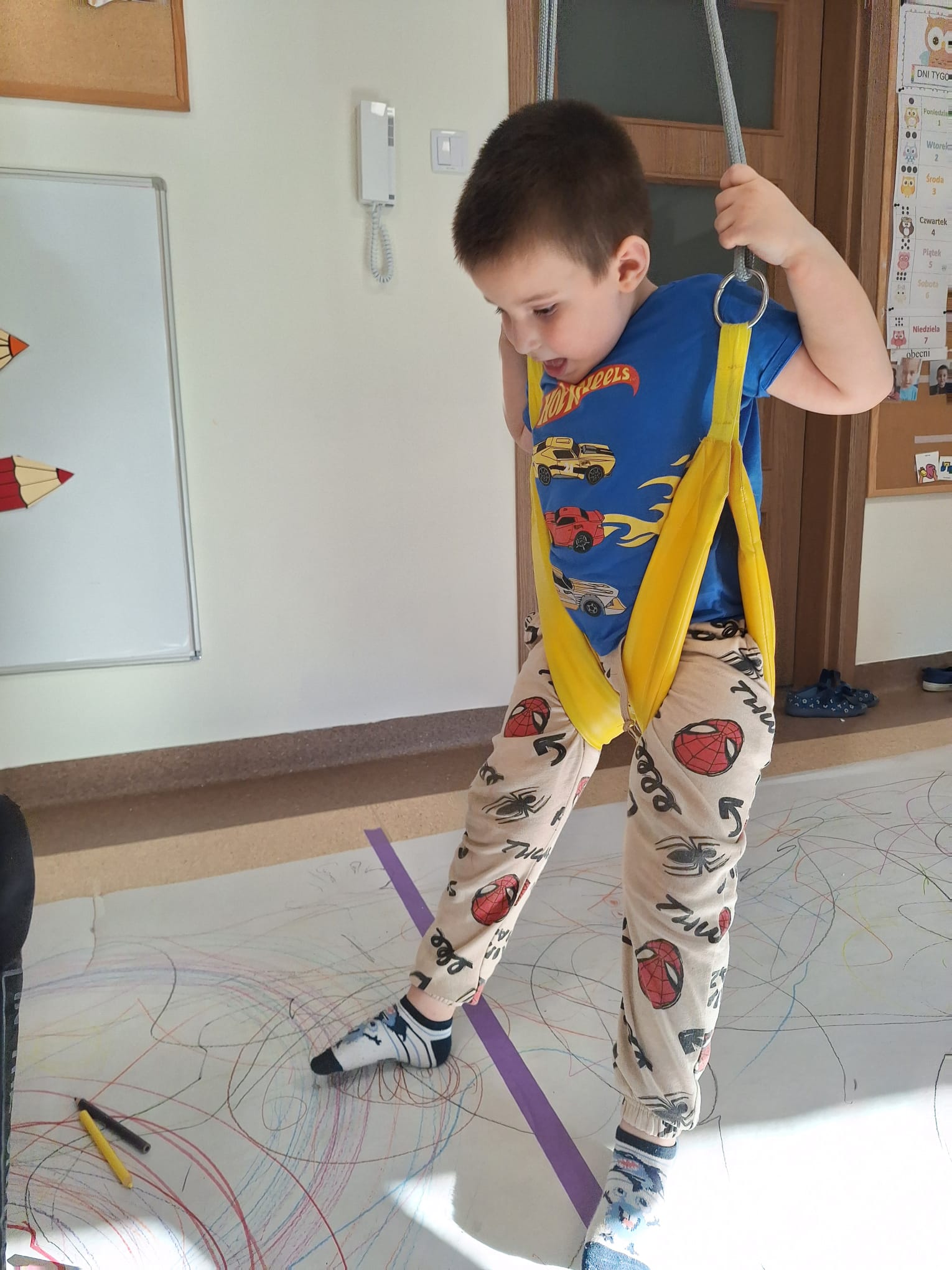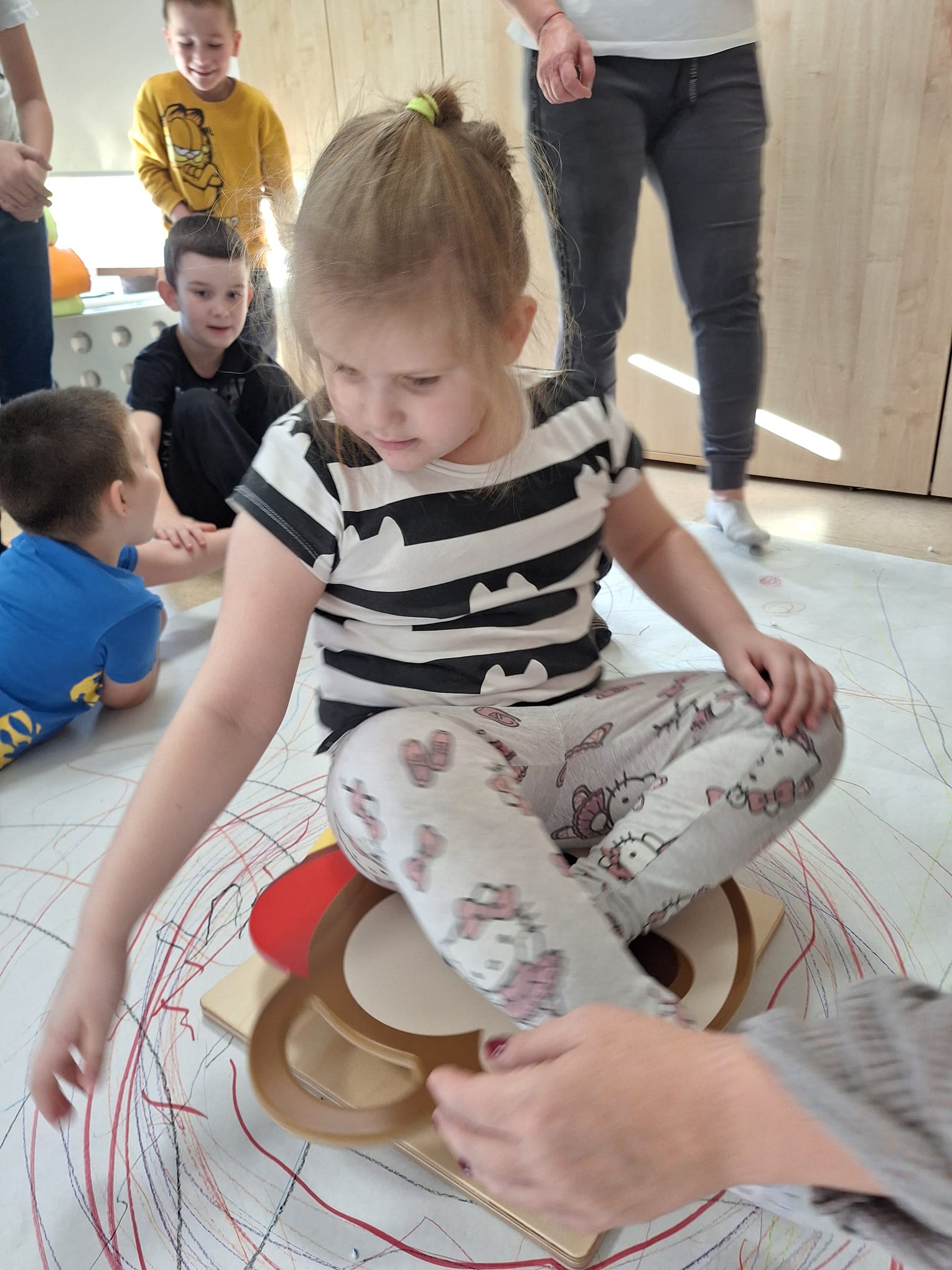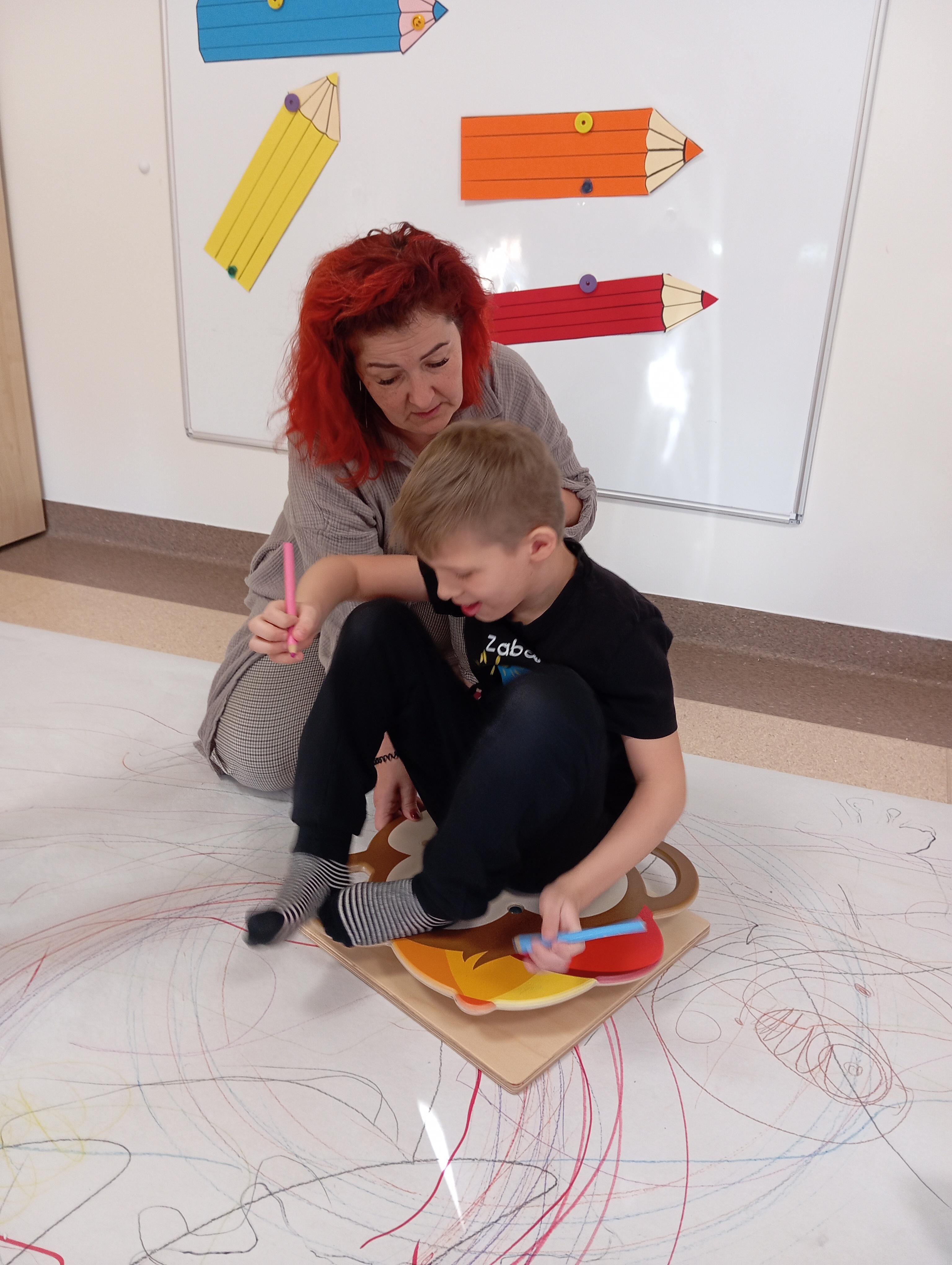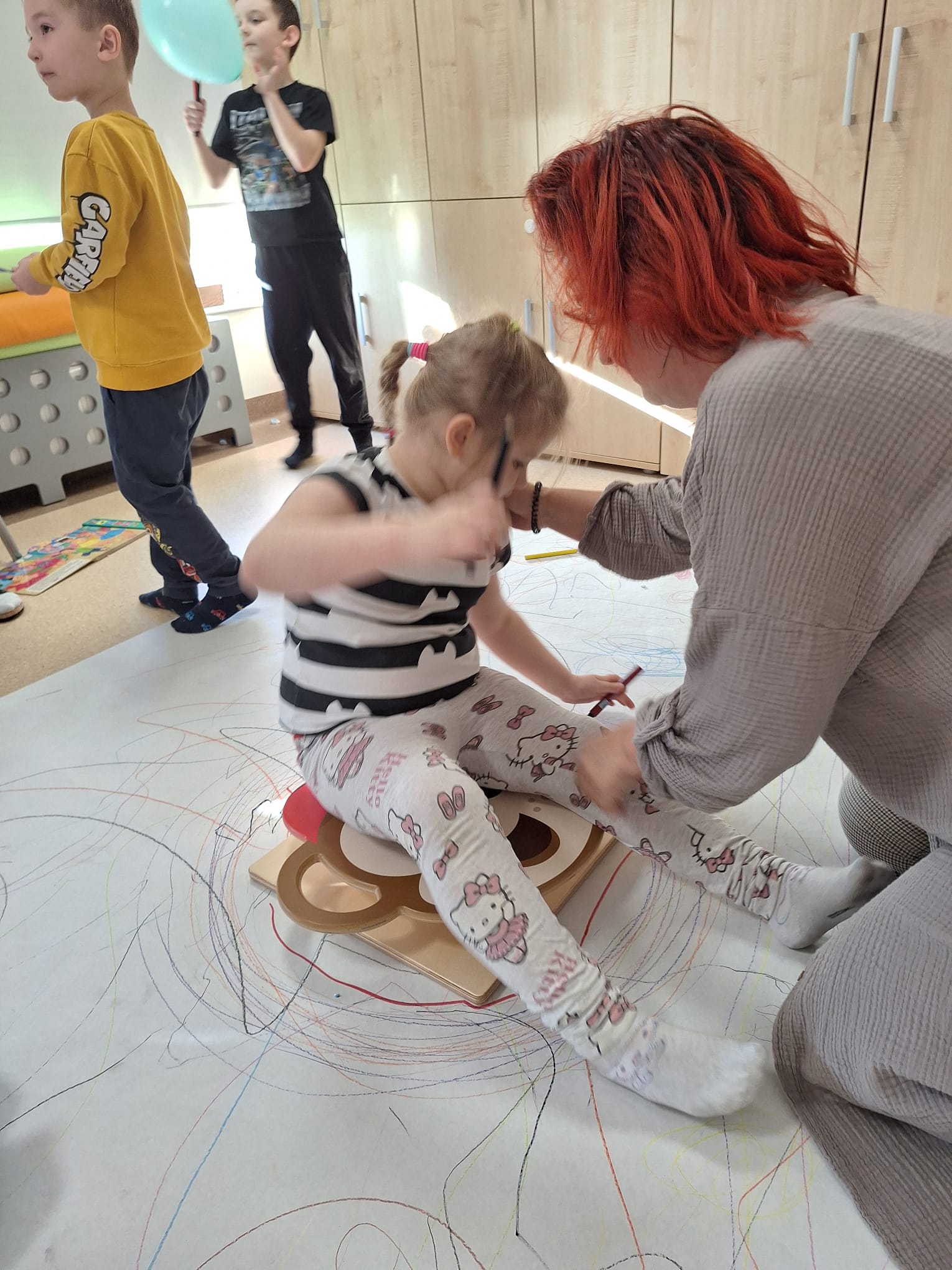 rysowaliśmy dużo i kolorowo, tworząc razem wielki, wspólny plakat:) Okazało się, że można rysować kręcąc się i huśtając, angażując przy tym różne zmysły :) Razem pokonaliśmy kredkowy tor przeszkód oraz ułożyliśmy kredkowe wzory:)