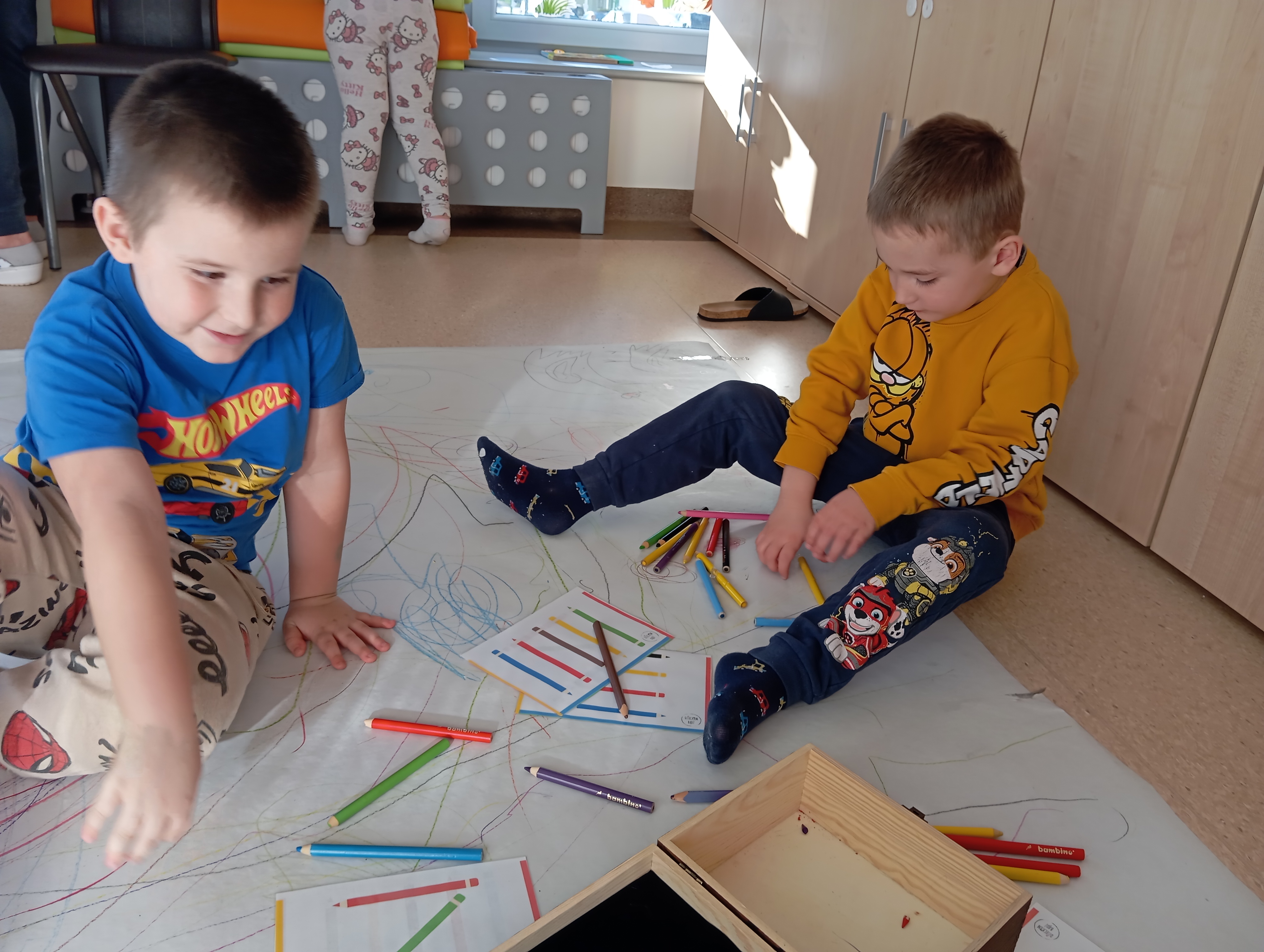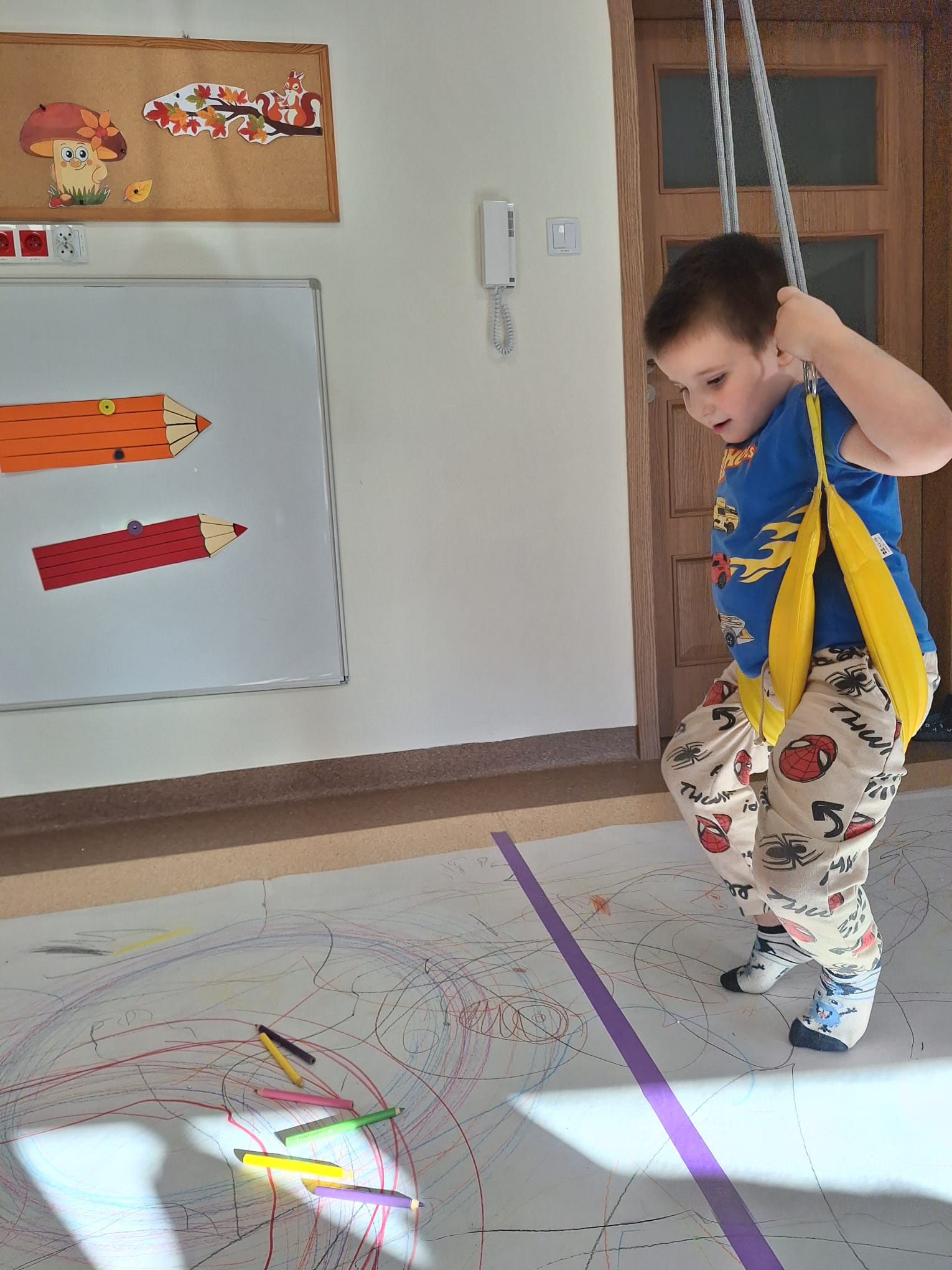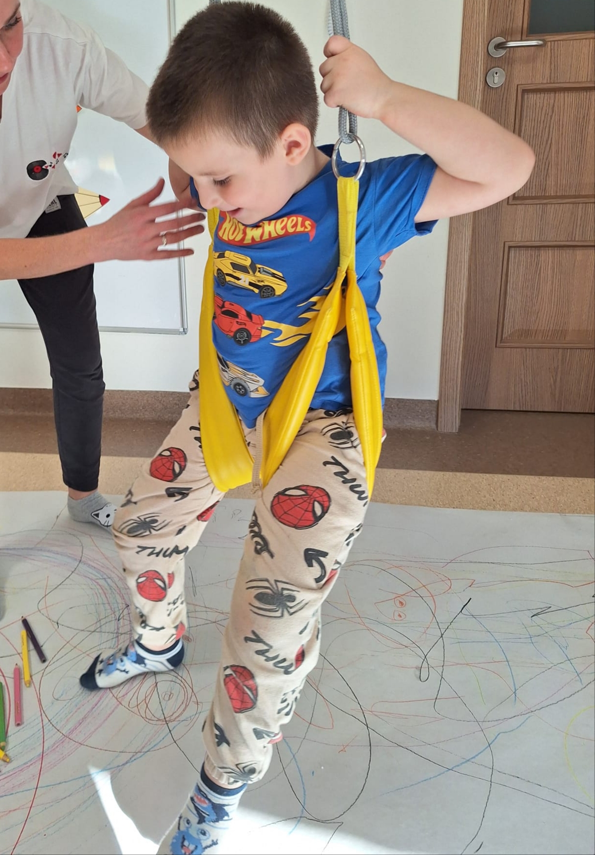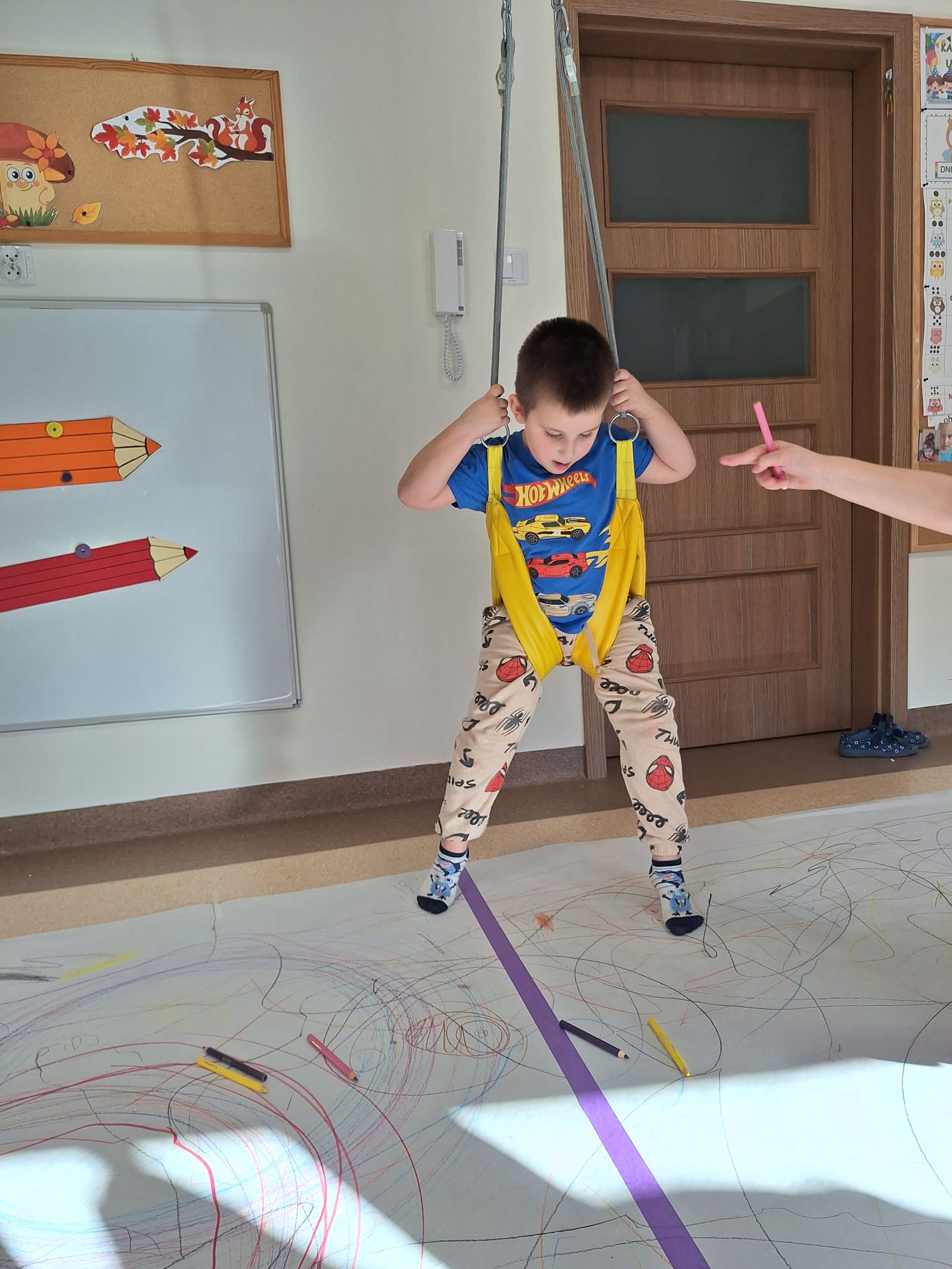 rysowaliśmy dużo i kolorowo, tworząc razem wielki, wspólny plakat:) Okazało się, że można rysować kręcąc się i huśtając, angażując przy tym różne zmysły :) Razem pokonaliśmy kredkowy tor przeszkód oraz ułożyliśmy kredkowe wzory:)