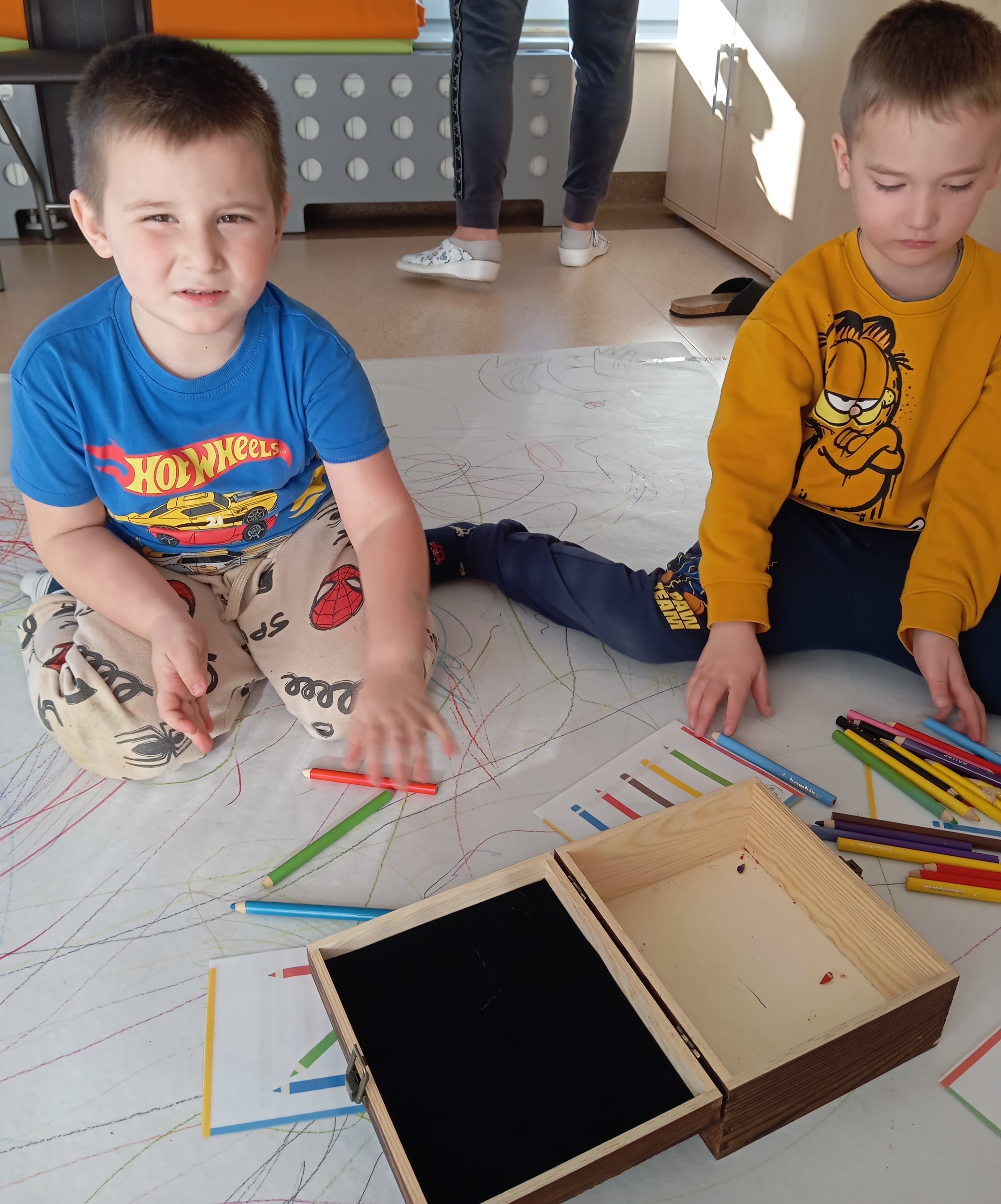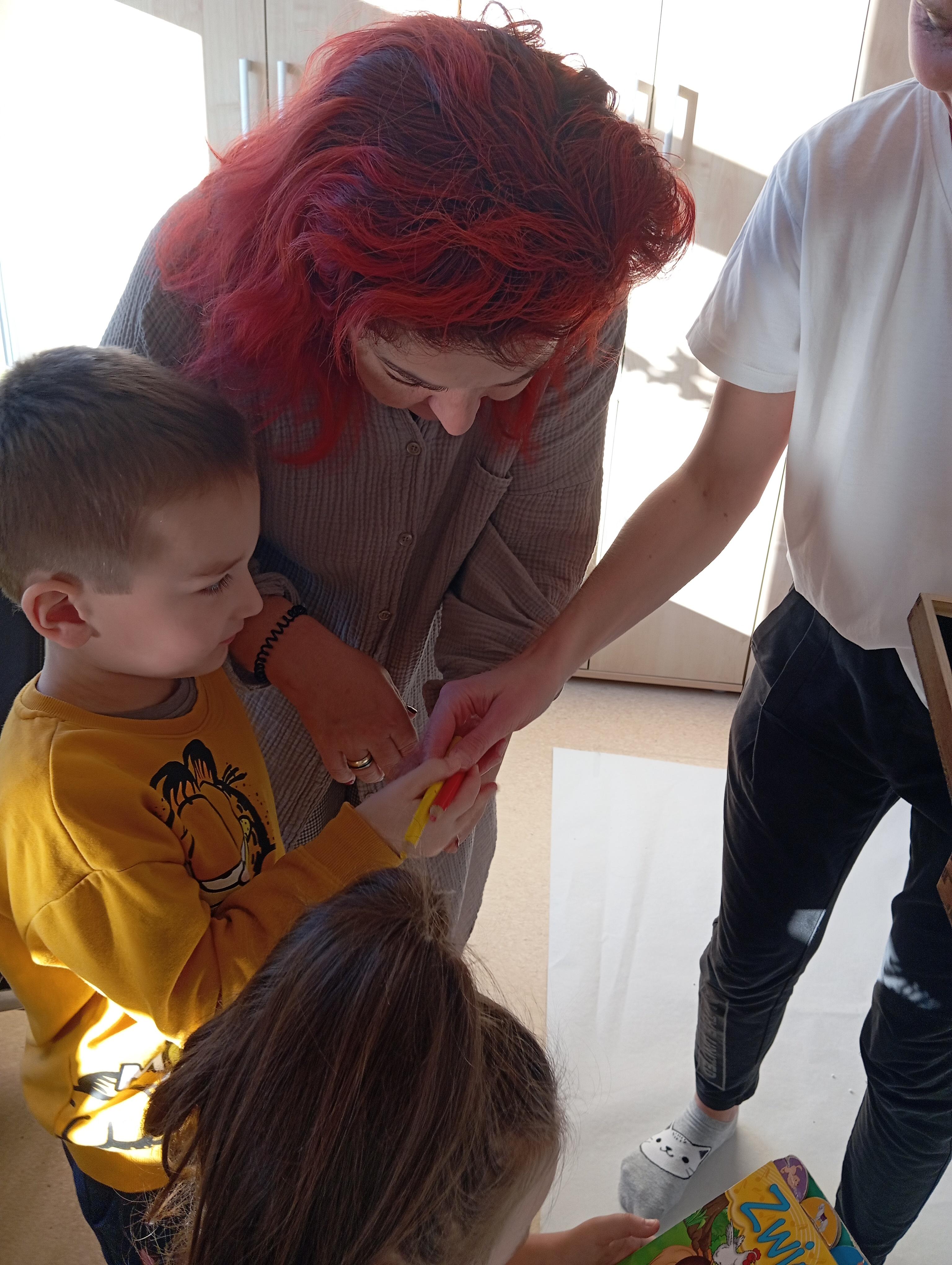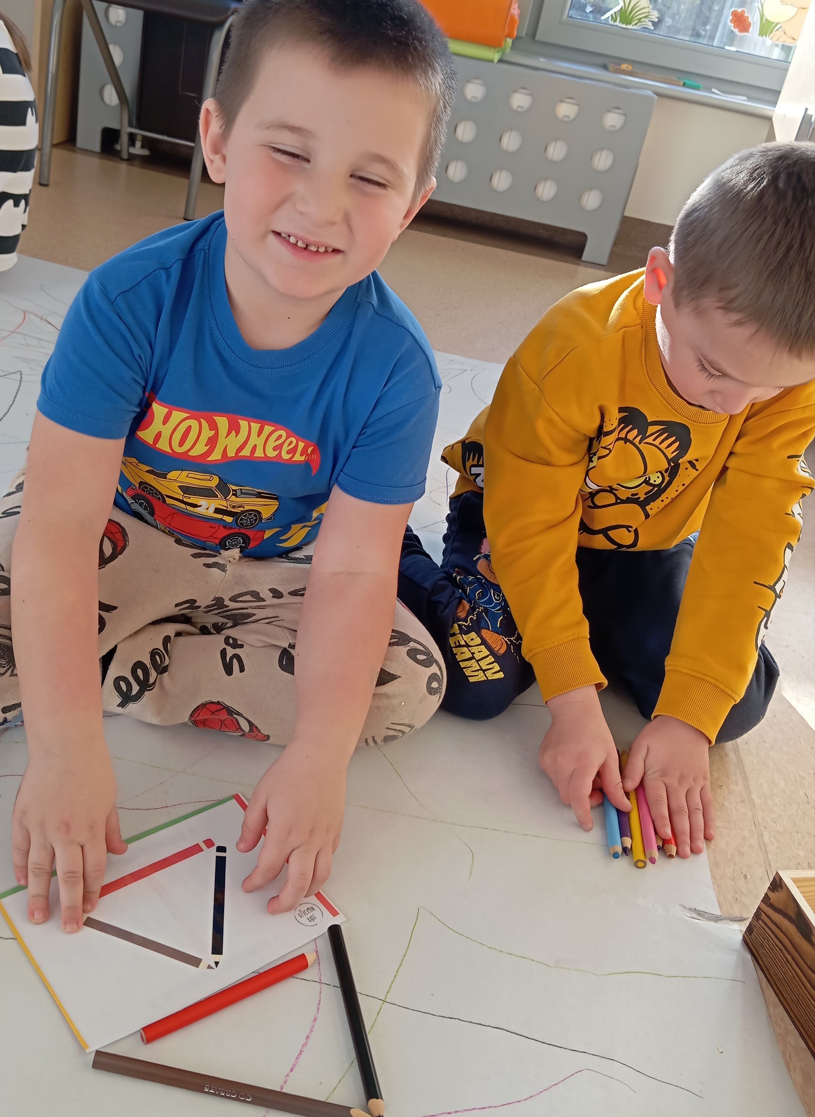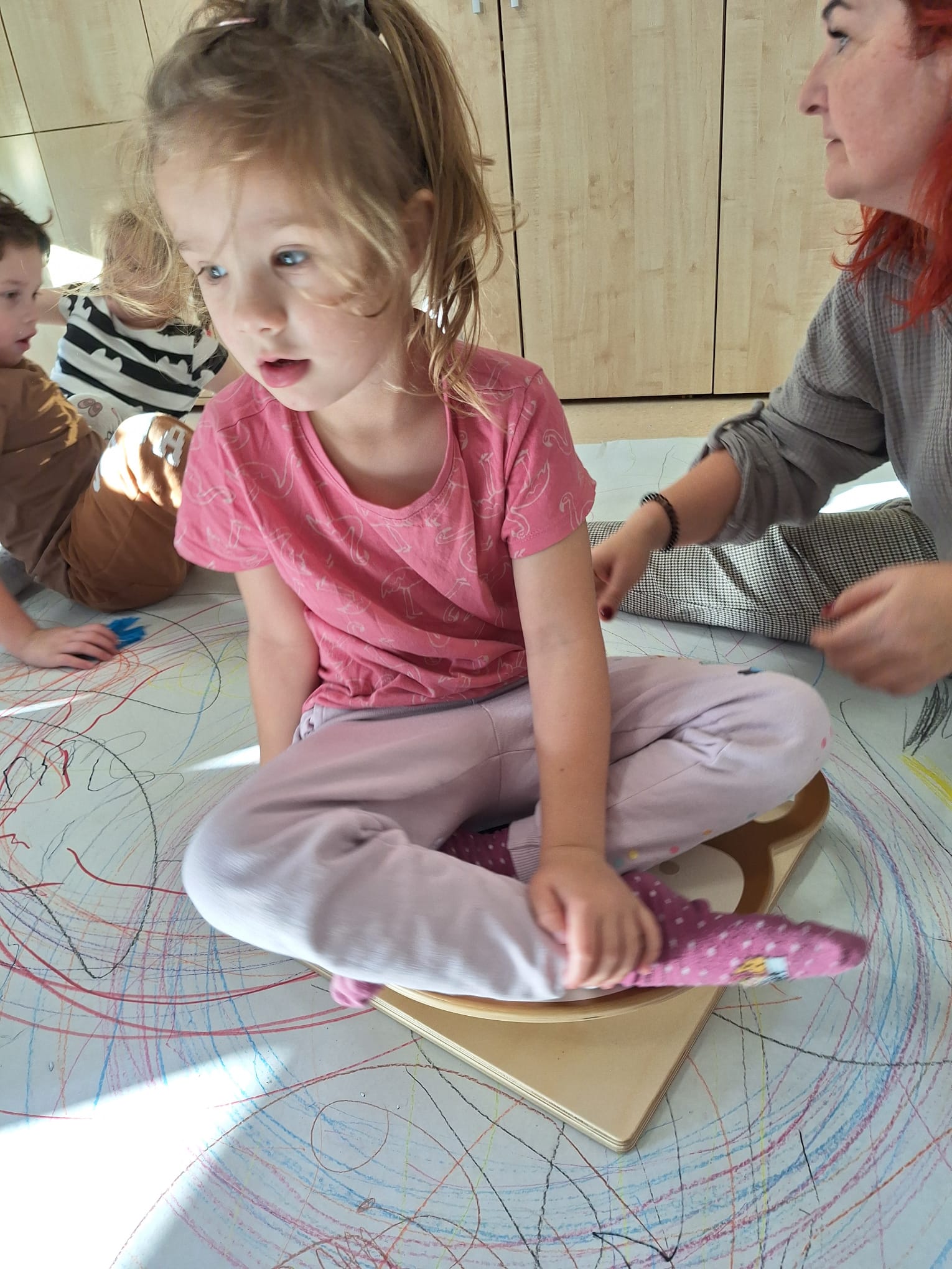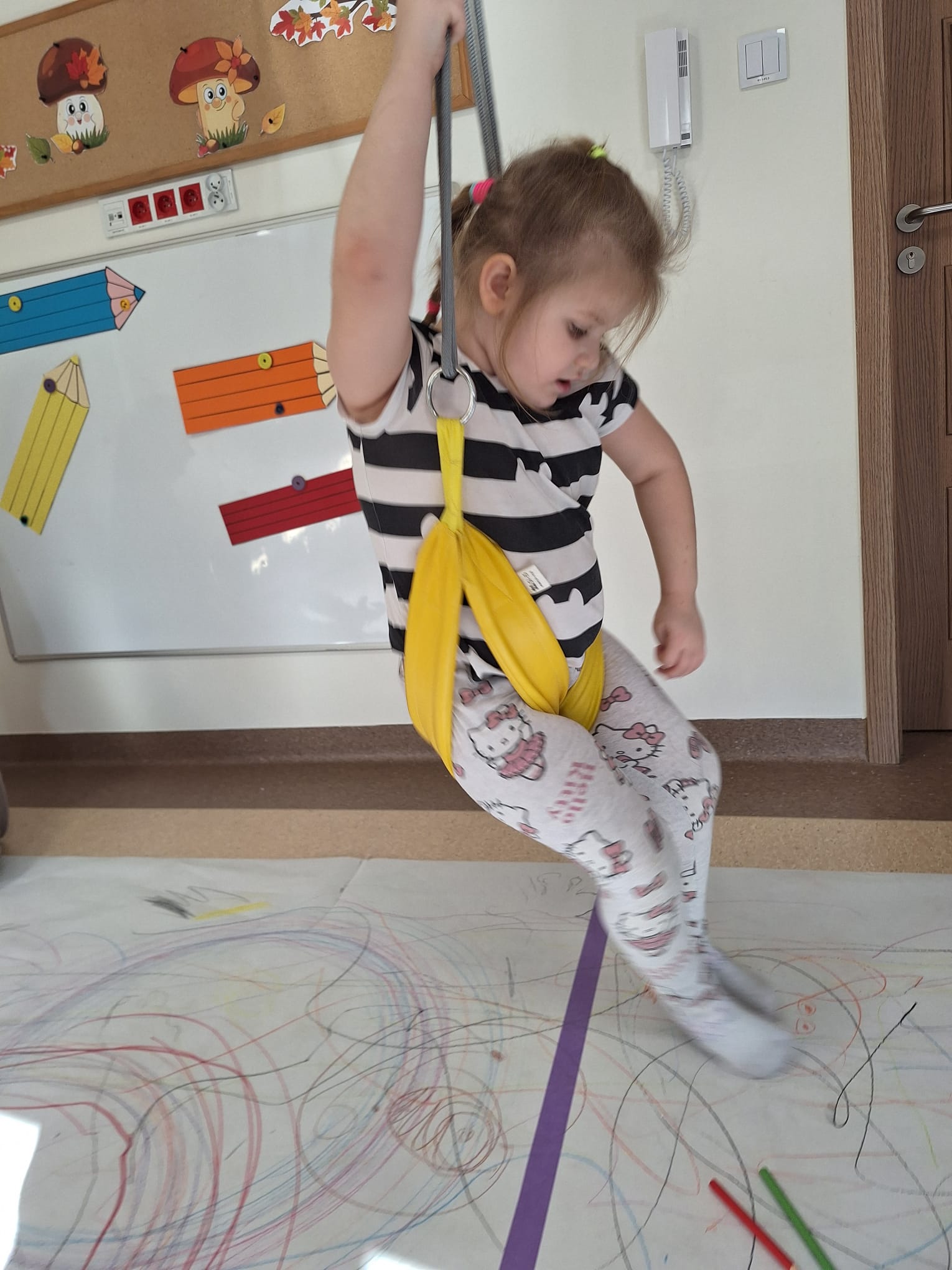 rysowaliśmy dużo i kolorowo, tworząc razem wielki, wspólny plakat:) Okazało się, że można rysować kręcąc się i huśtając, angażując przy tym różne zmysły :) Razem pokonaliśmy kredkowy tor przeszkód oraz ułożyliśmy kredkowe wzory:)