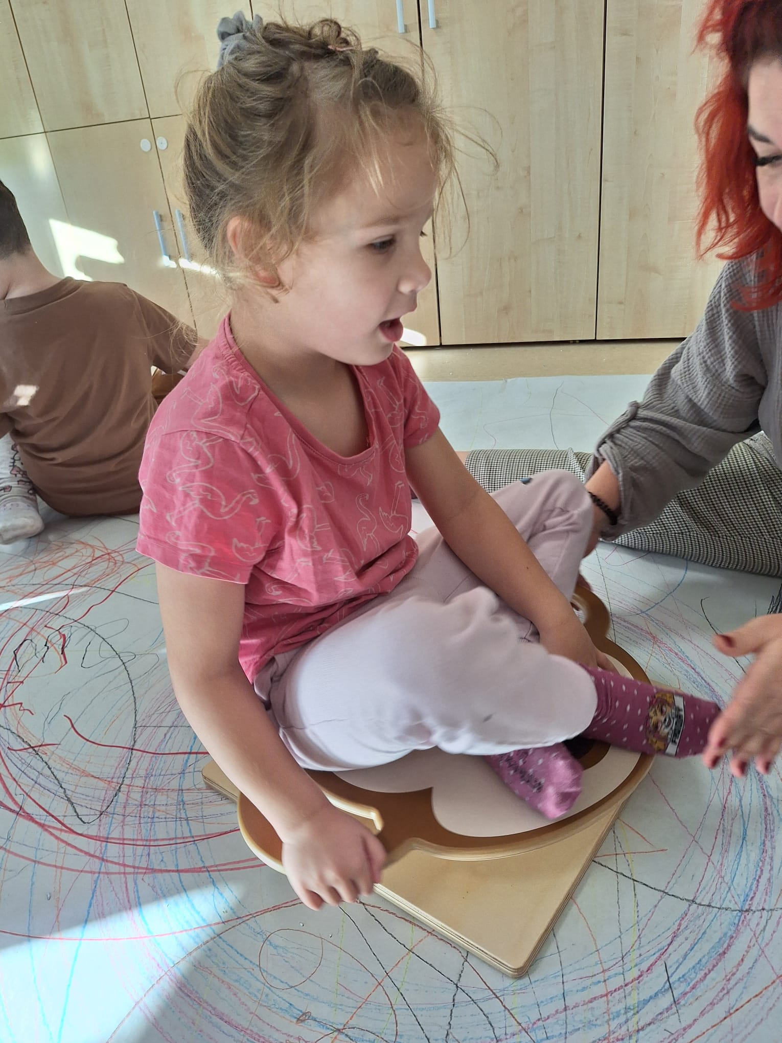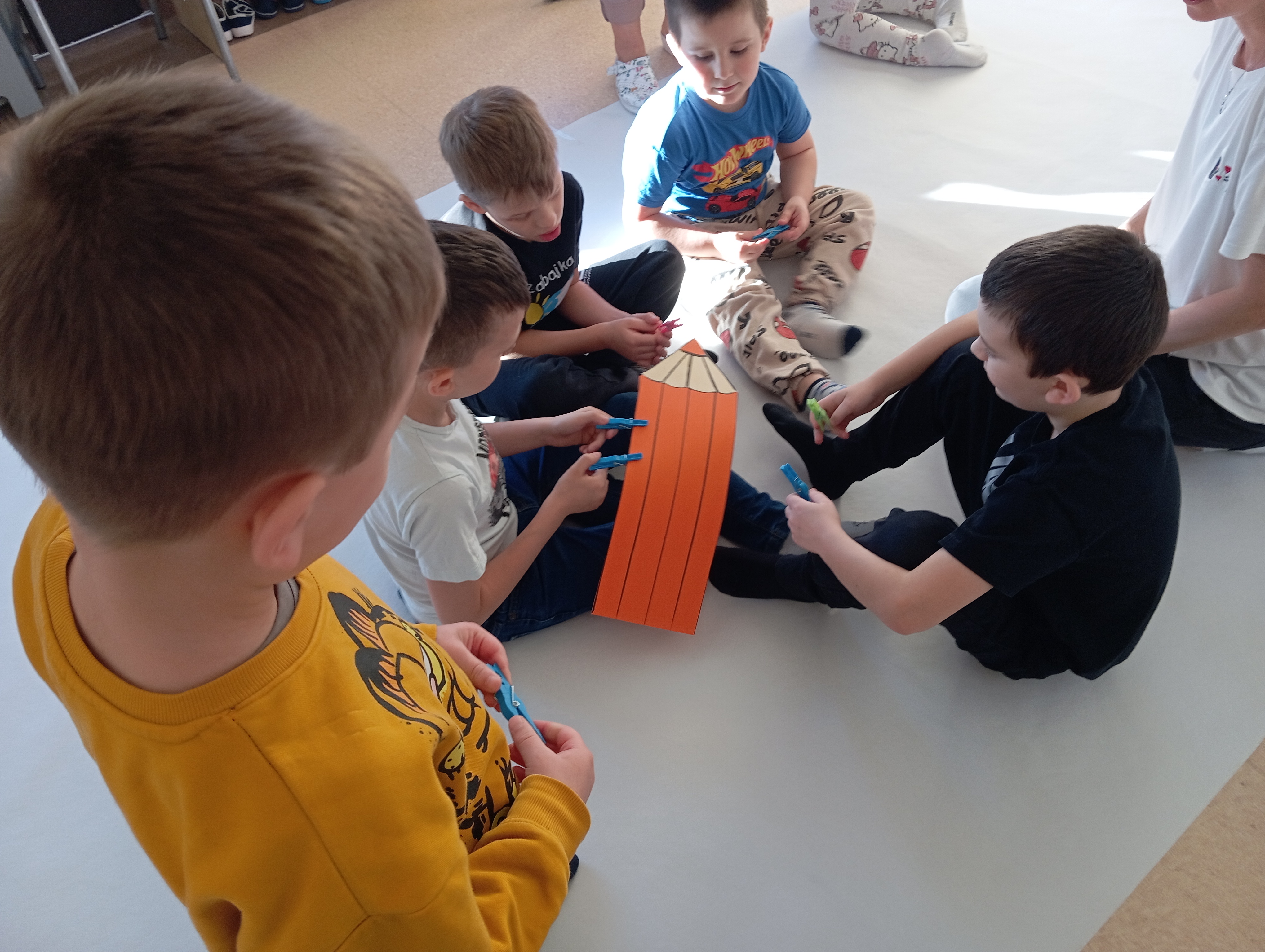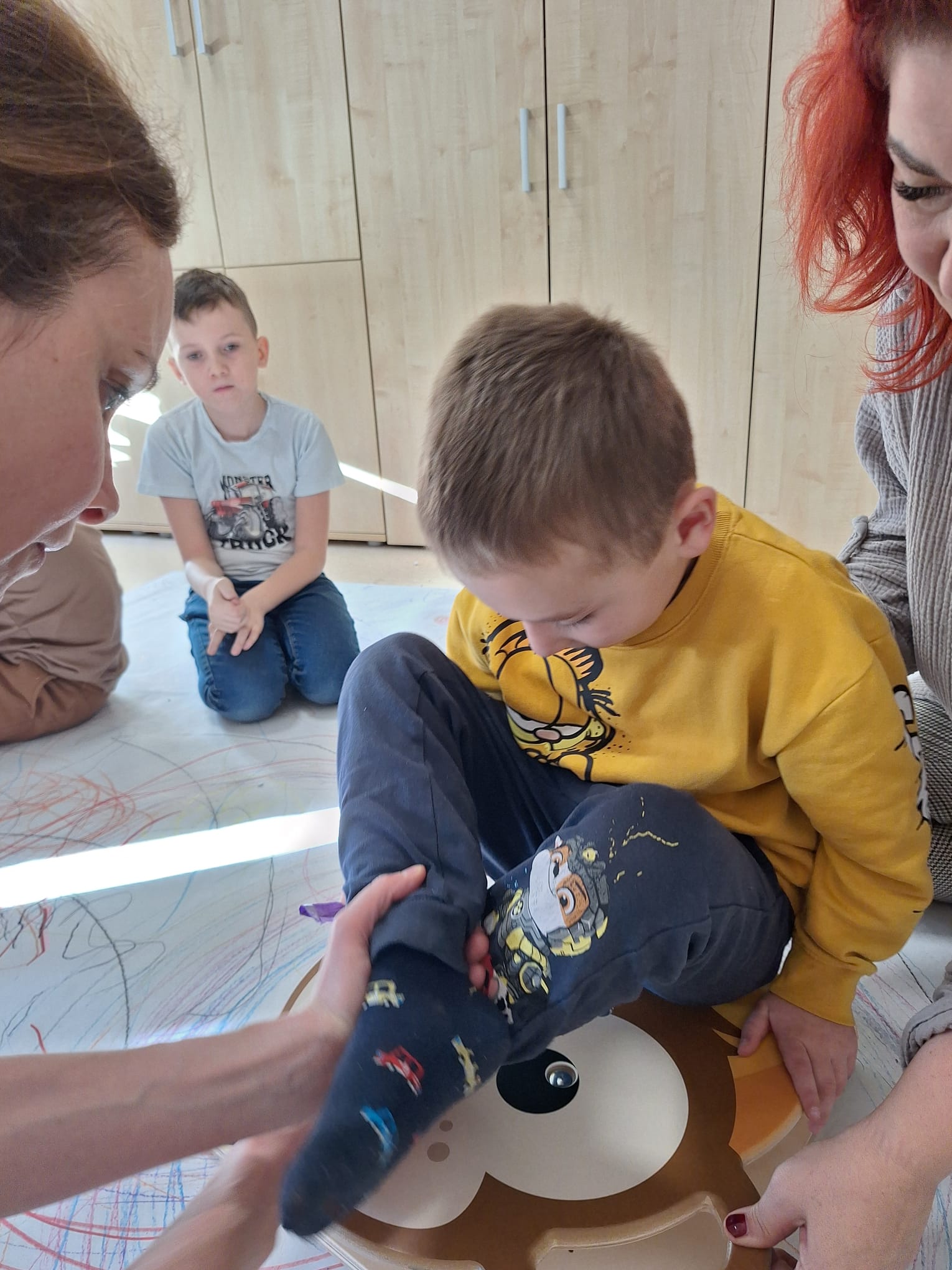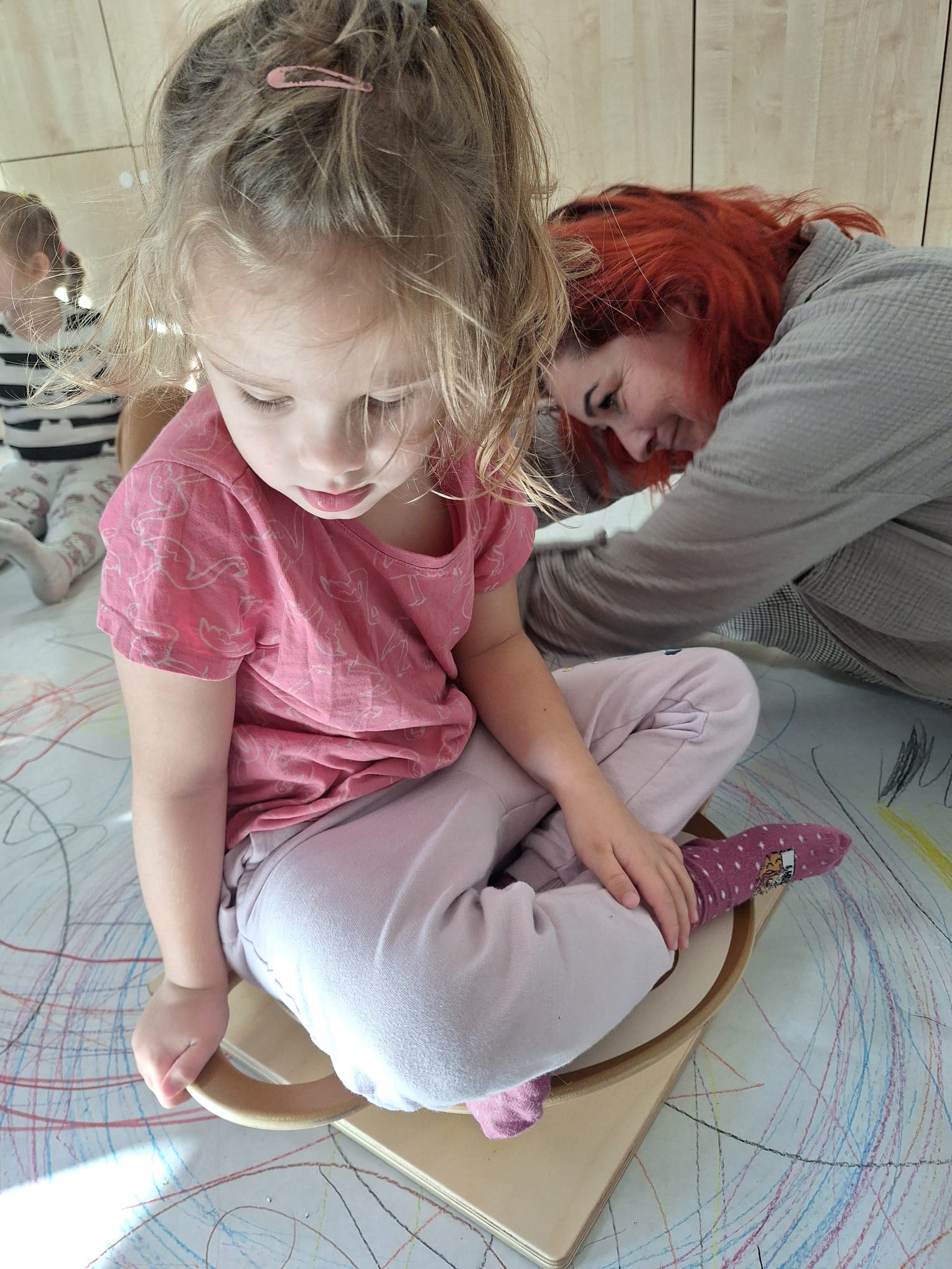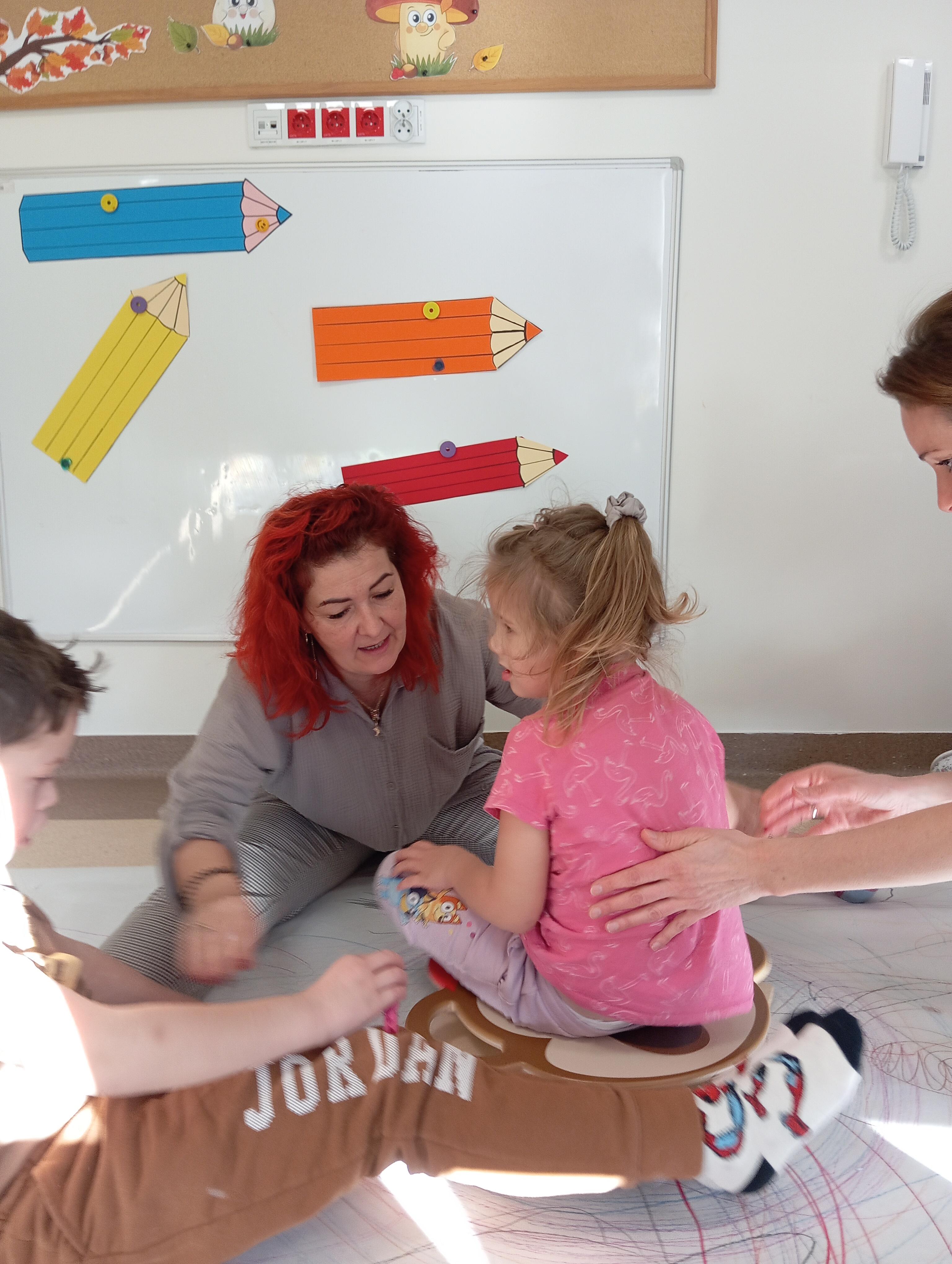 rysowaliśmy dużo i kolorowo, tworząc razem wielki, wspólny plakat:) Okazało się, że można rysować kręcąc się i huśtając, angażując przy tym różne zmysły :) Razem pokonaliśmy kredkowy tor przeszkód oraz ułożyliśmy kredkowe wzory:)