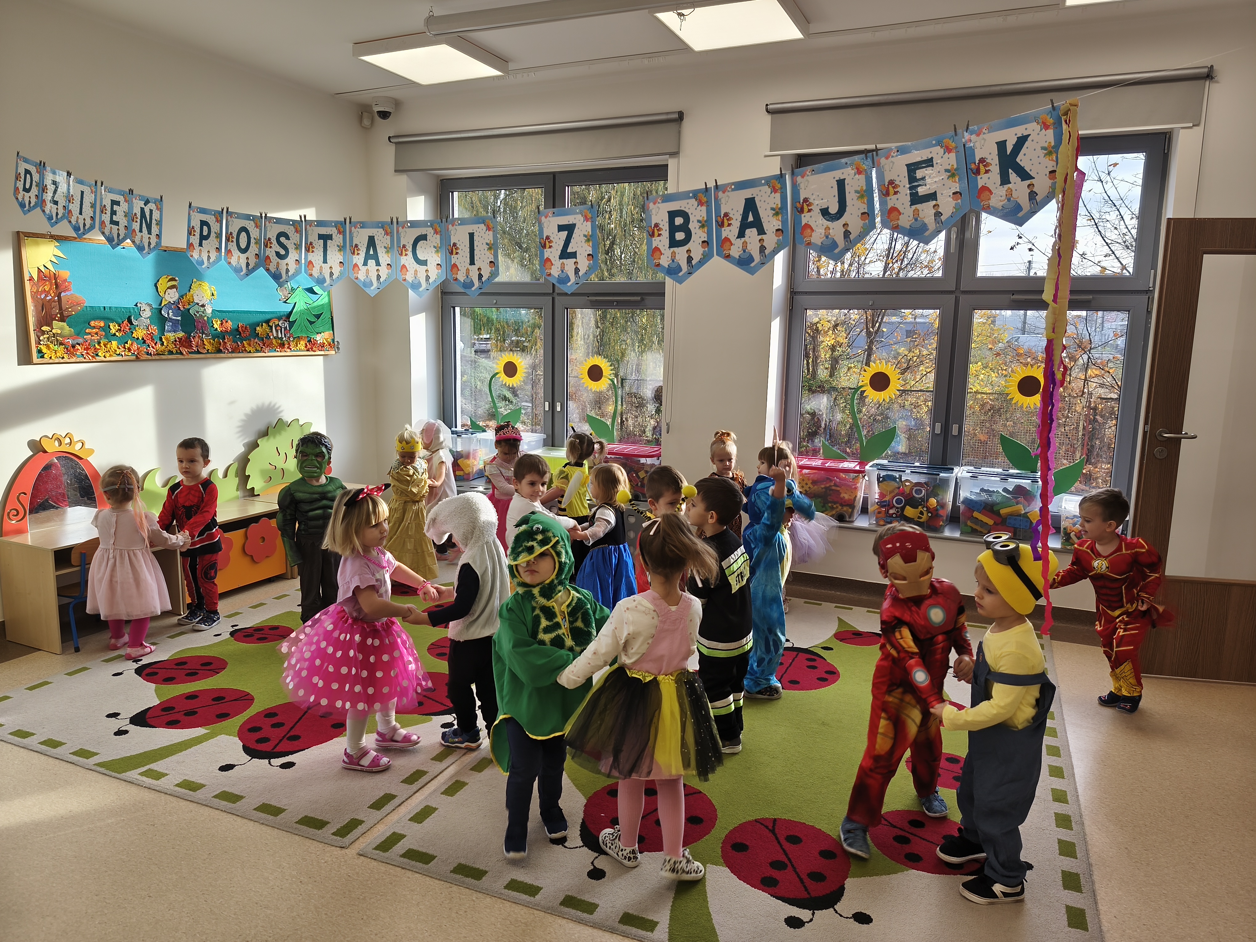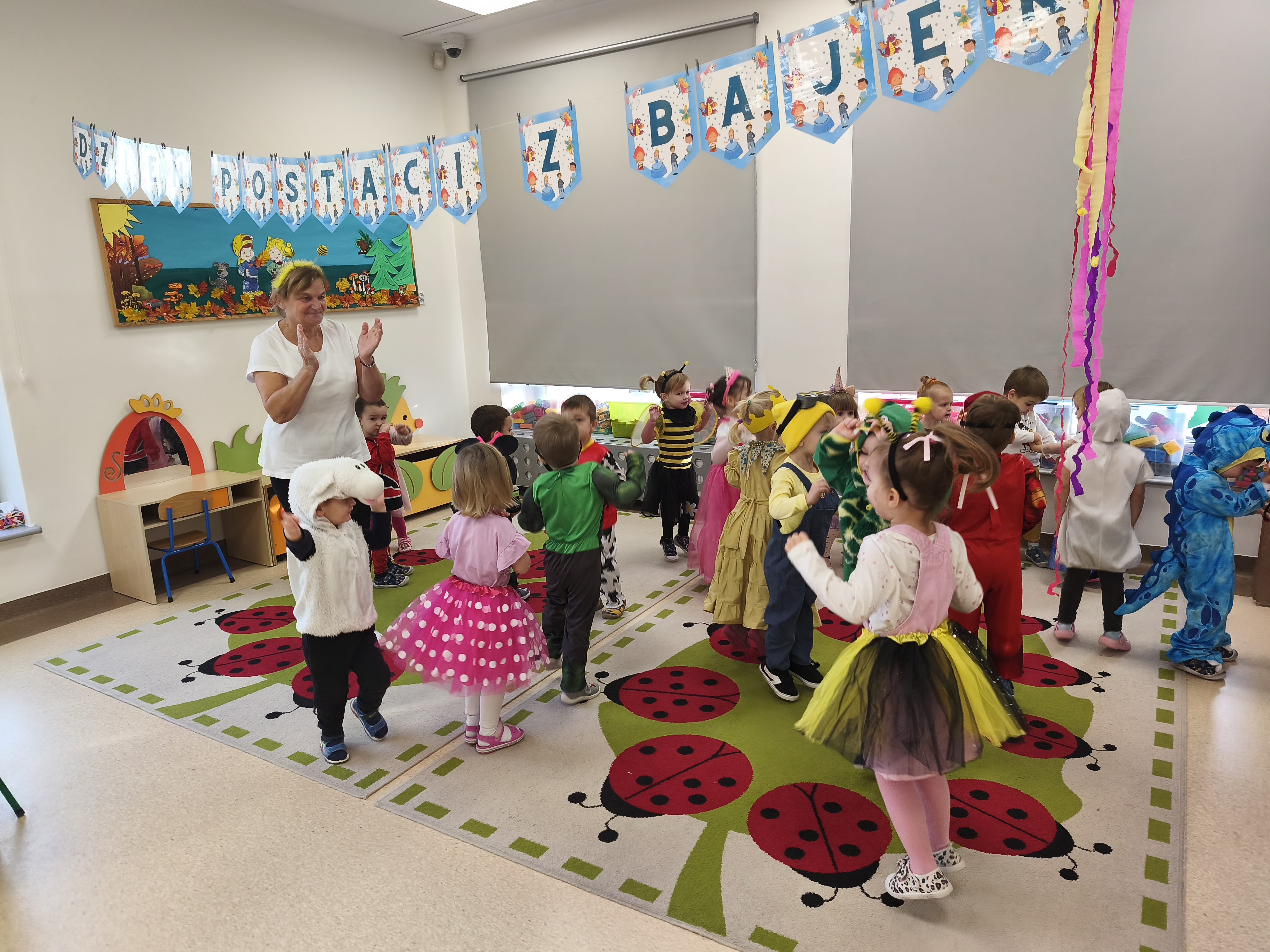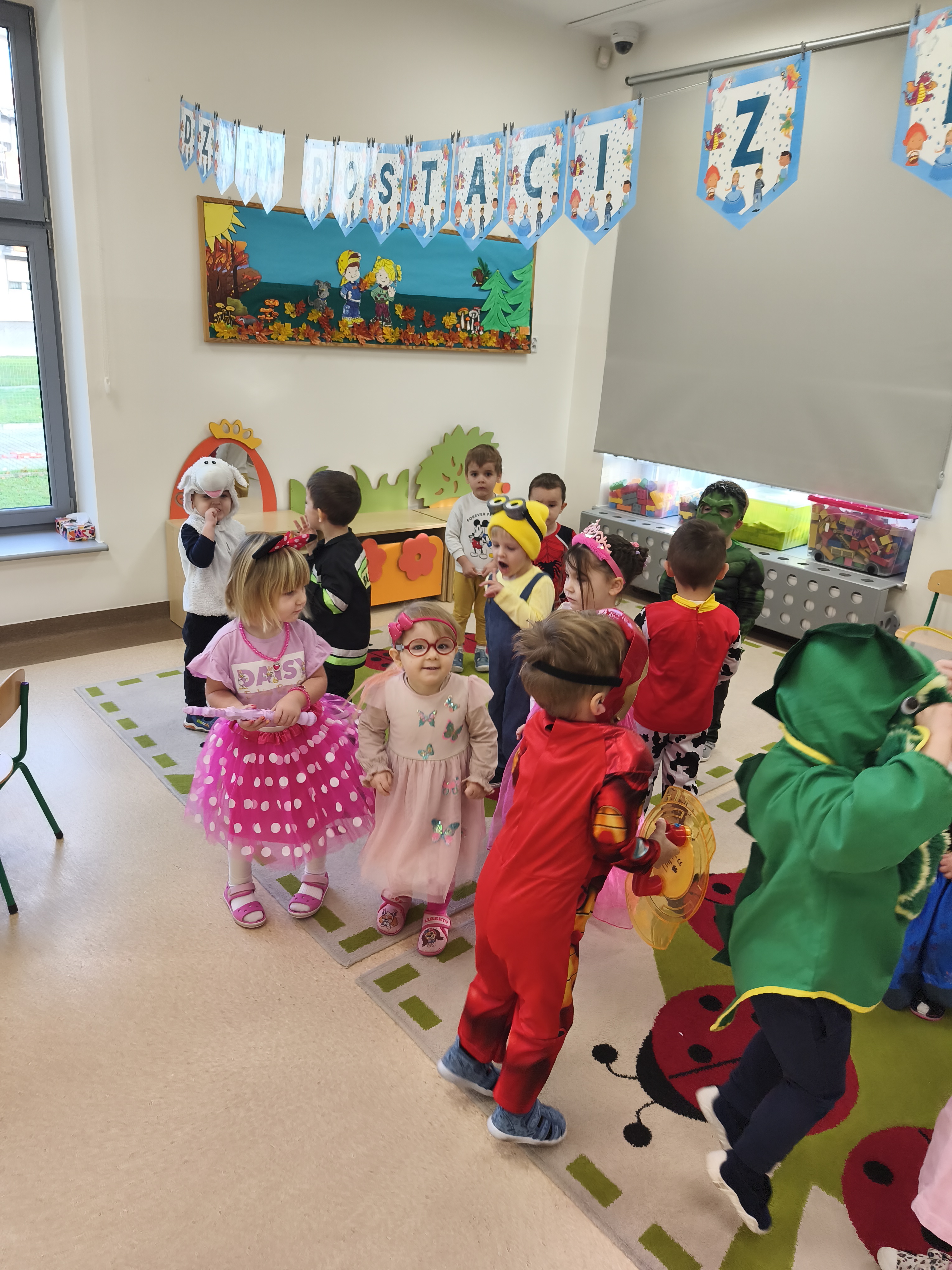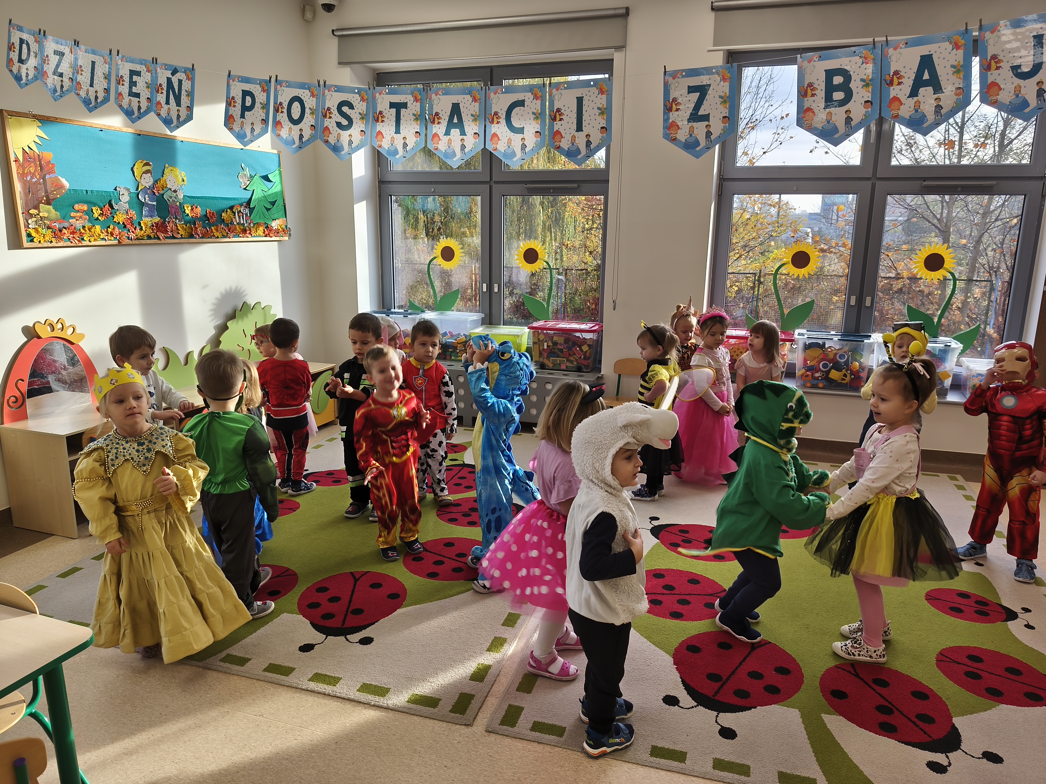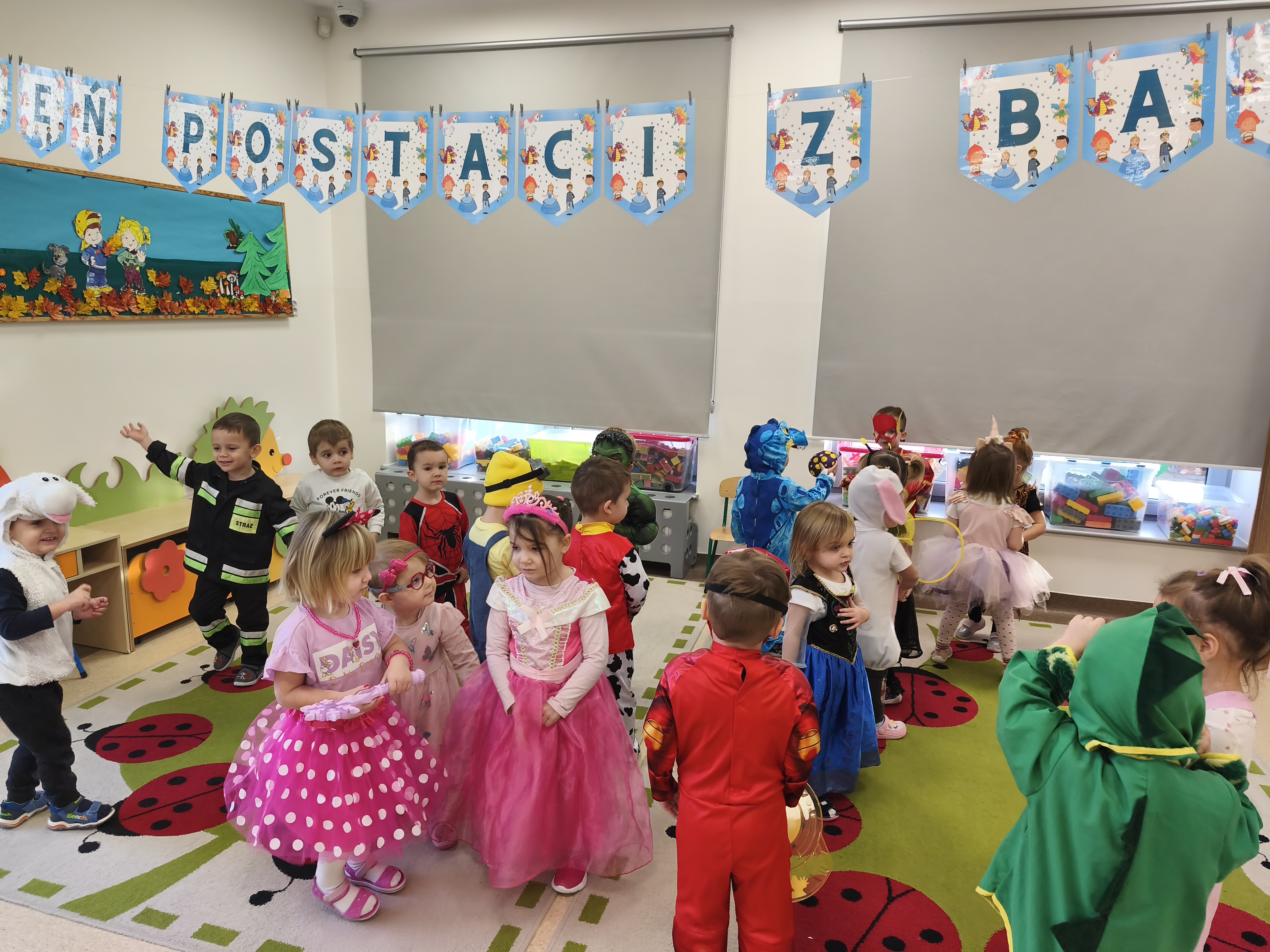 5 listopada obchodzimy Dzień Postaci z Bajek - jedno z najbardziej kolorowych i radosnych świąt. Tego dnia przedszkolaki przyszły przebrane za swoich ulubionych bohaterów. Można było spotkać księżniczki, pszczółki, superbohaterów, zwierzątka i wiele innych bajkowych postaci. Podczas wspólnej zabawy dzieci rozwiązywały zagadki, odgadywały bajkowe tytuły, tańczyły, Z przerażeniem i w ciszy jak nigdy dotąd wysłuchaliśmy bajki o Czerwonym Kapturku. Wilk był nieznajomym a my już wiemy ( choć nie wszyscy ), że jeśli kogoś nie znamy to na spacer z nim się nie wybieramy!