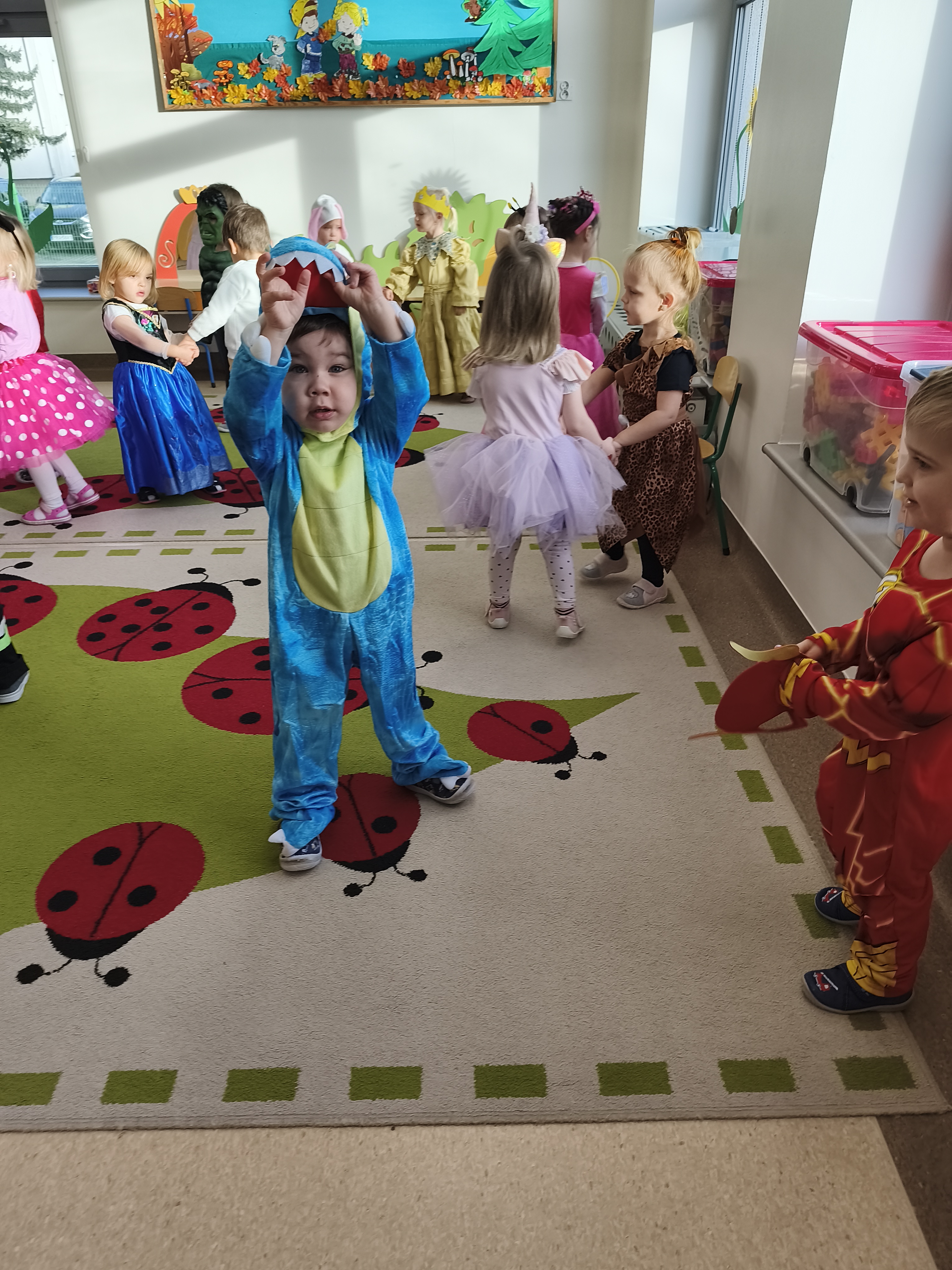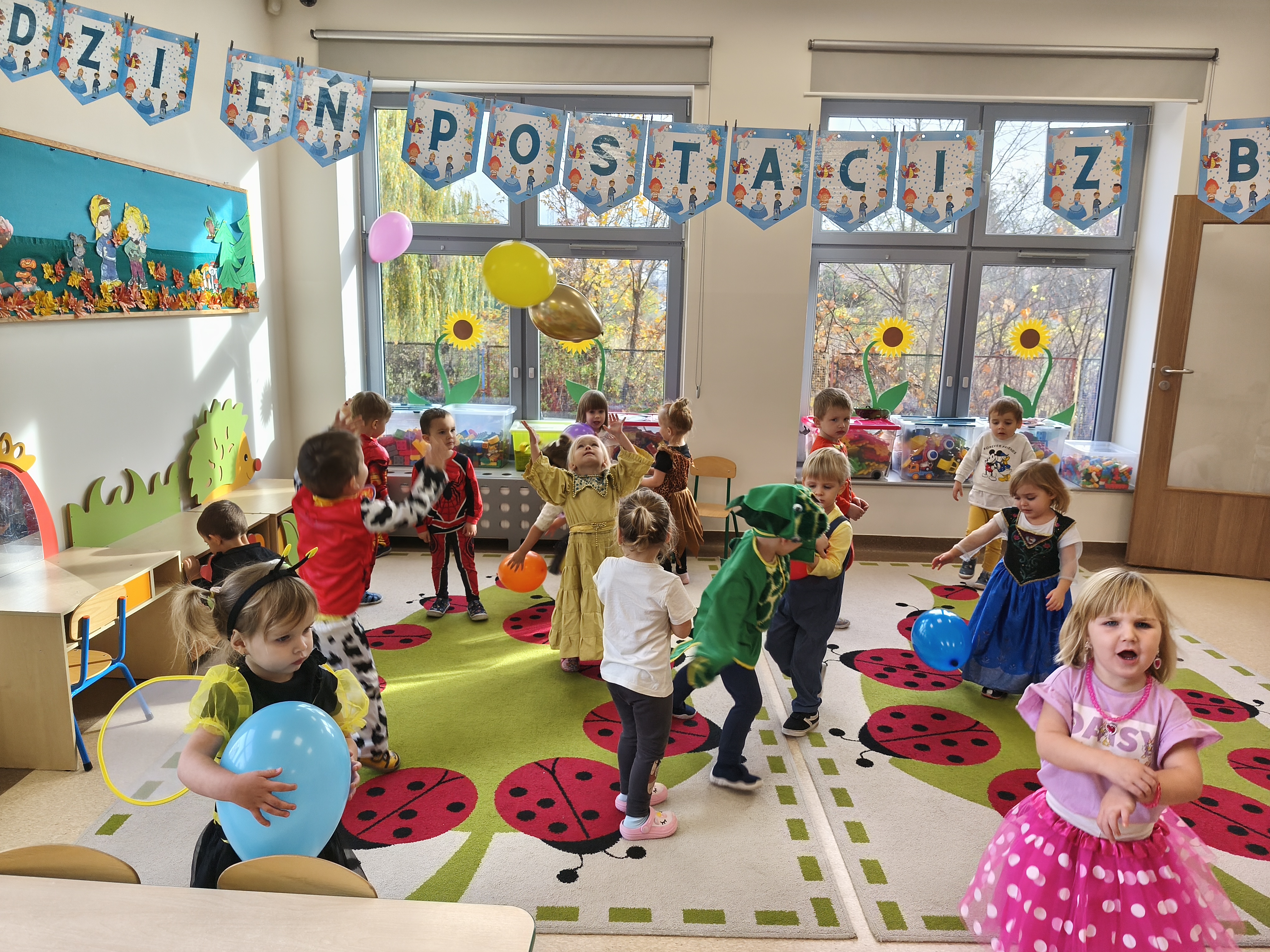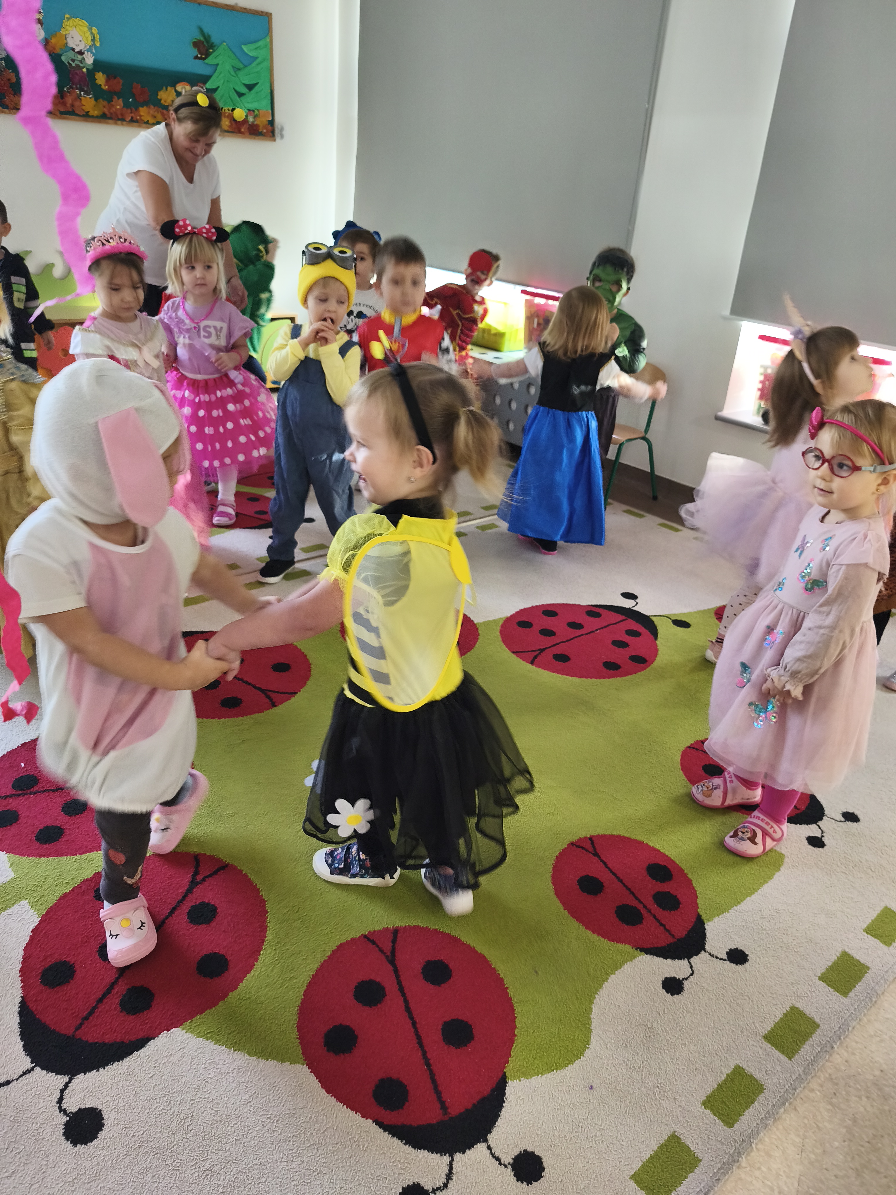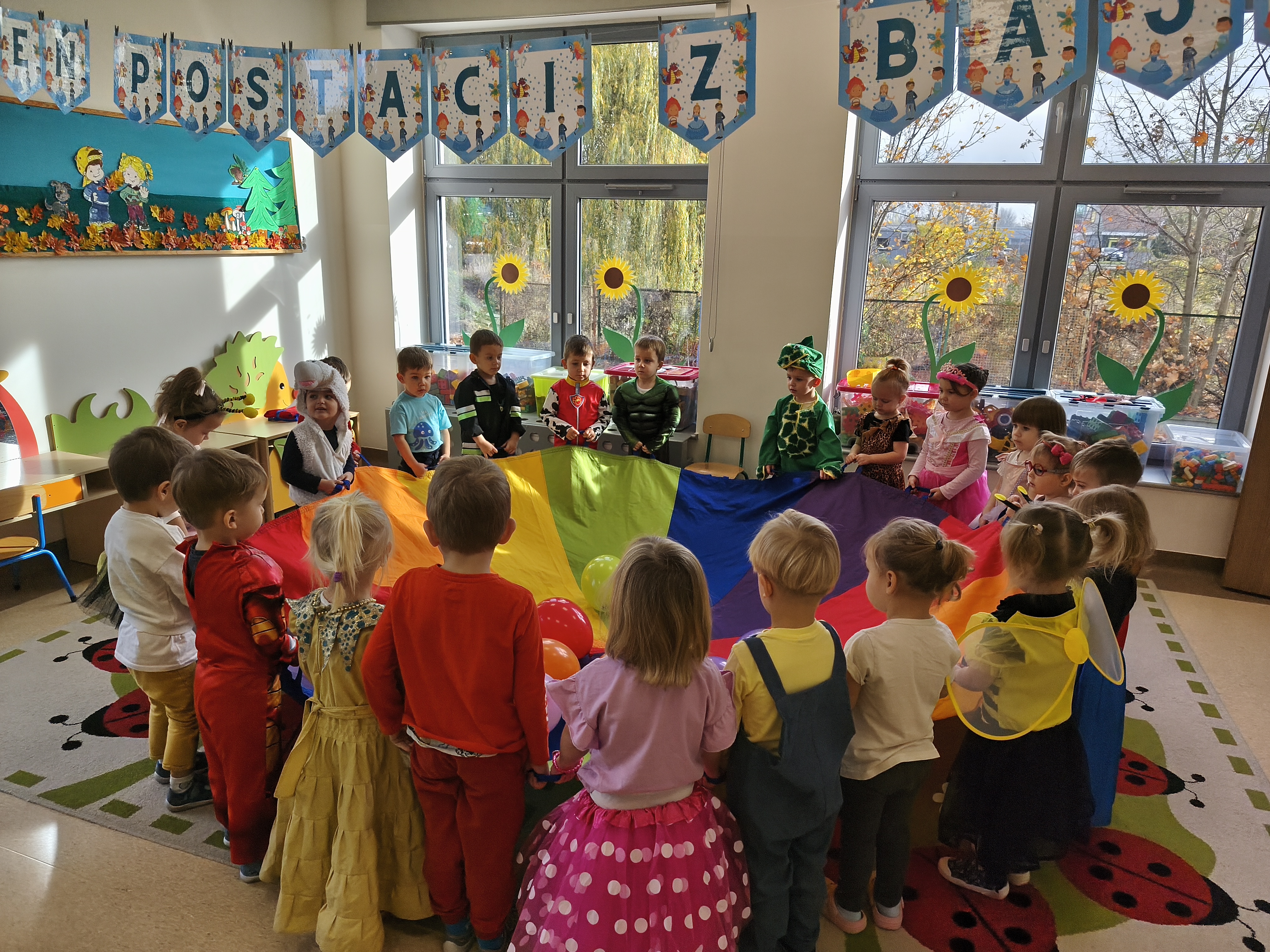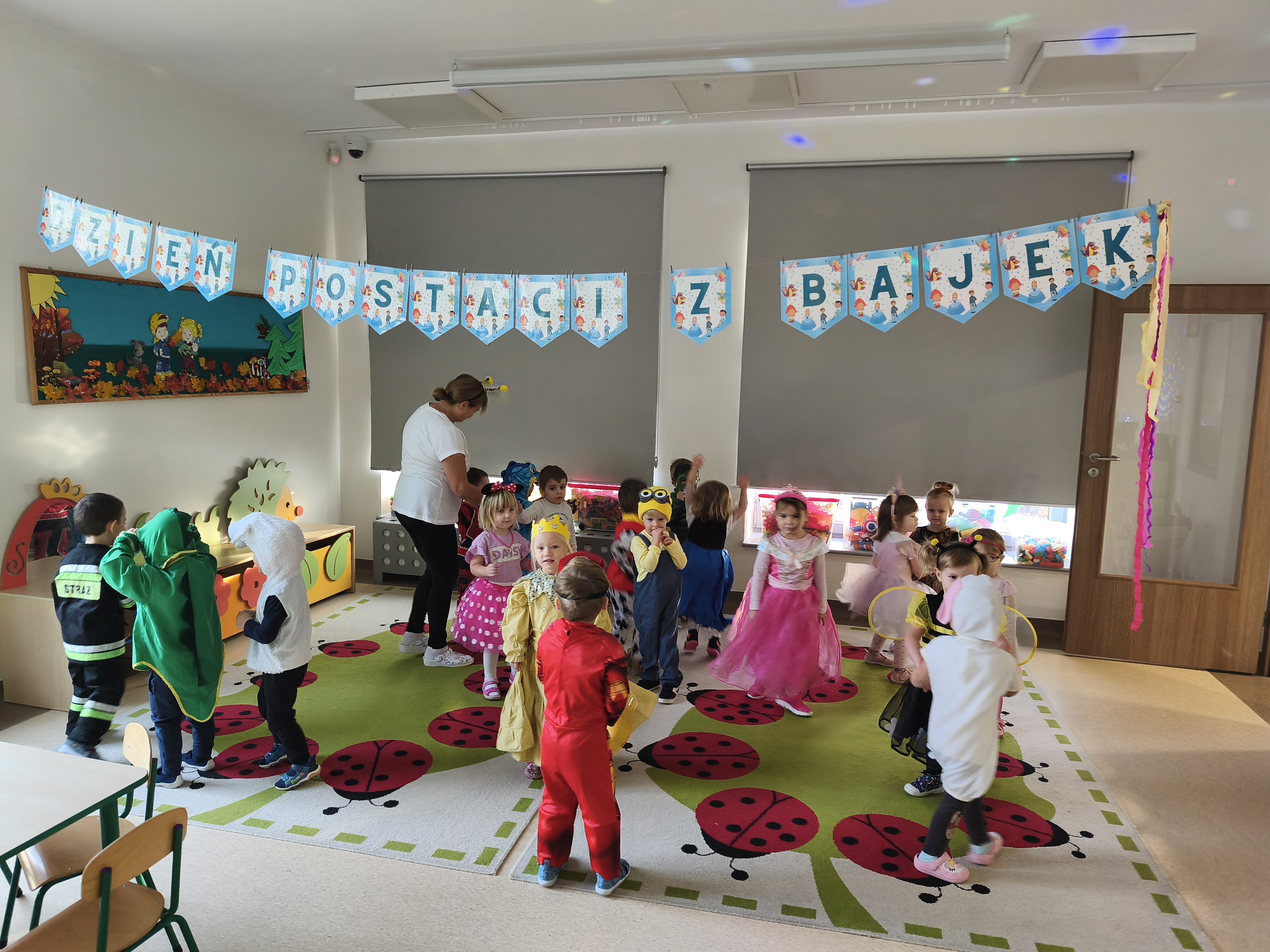 5 listopada obchodzimy Dzień Postaci z Bajek - jedno z najbardziej kolorowych i radosnych świąt. Tego dnia przedszkolaki przyszły przebrane za swoich ulubionych bohaterów. Można było spotkać księżniczki, pszczółki, superbohaterów, zwierzątka i wiele innych bajkowych postaci. Podczas wspólnej zabawy dzieci rozwiązywały zagadki, odgadywały bajkowe tytuły, tańczyły, Z przerażeniem i w ciszy jak nigdy dotąd wysłuchaliśmy bajki o Czerwonym Kapturku. Wilk był nieznajomym a my już wiemy ( choć nie wszyscy ), że jeśli kogoś nie znamy to na spacer z nim się nie wybieramy!