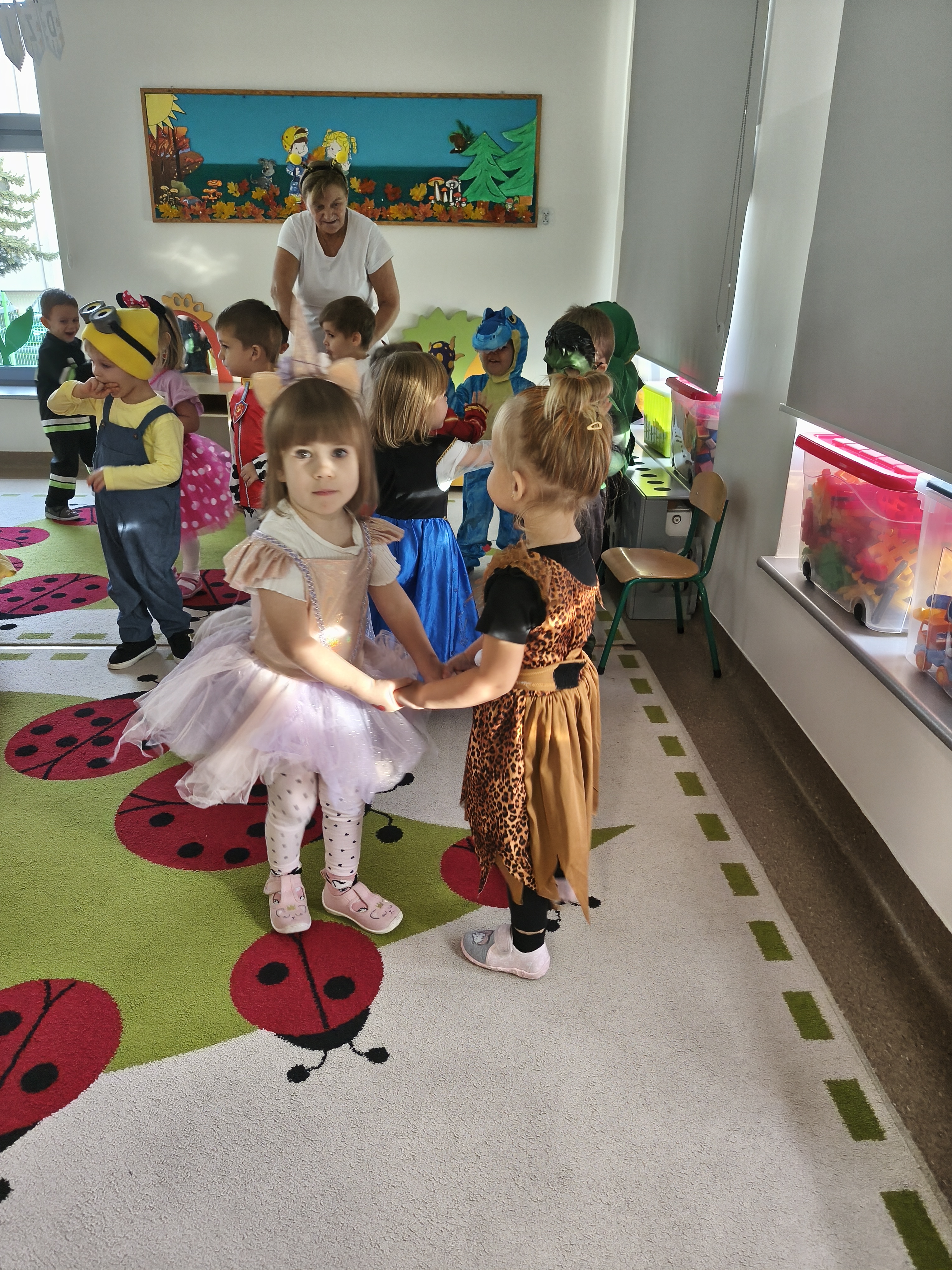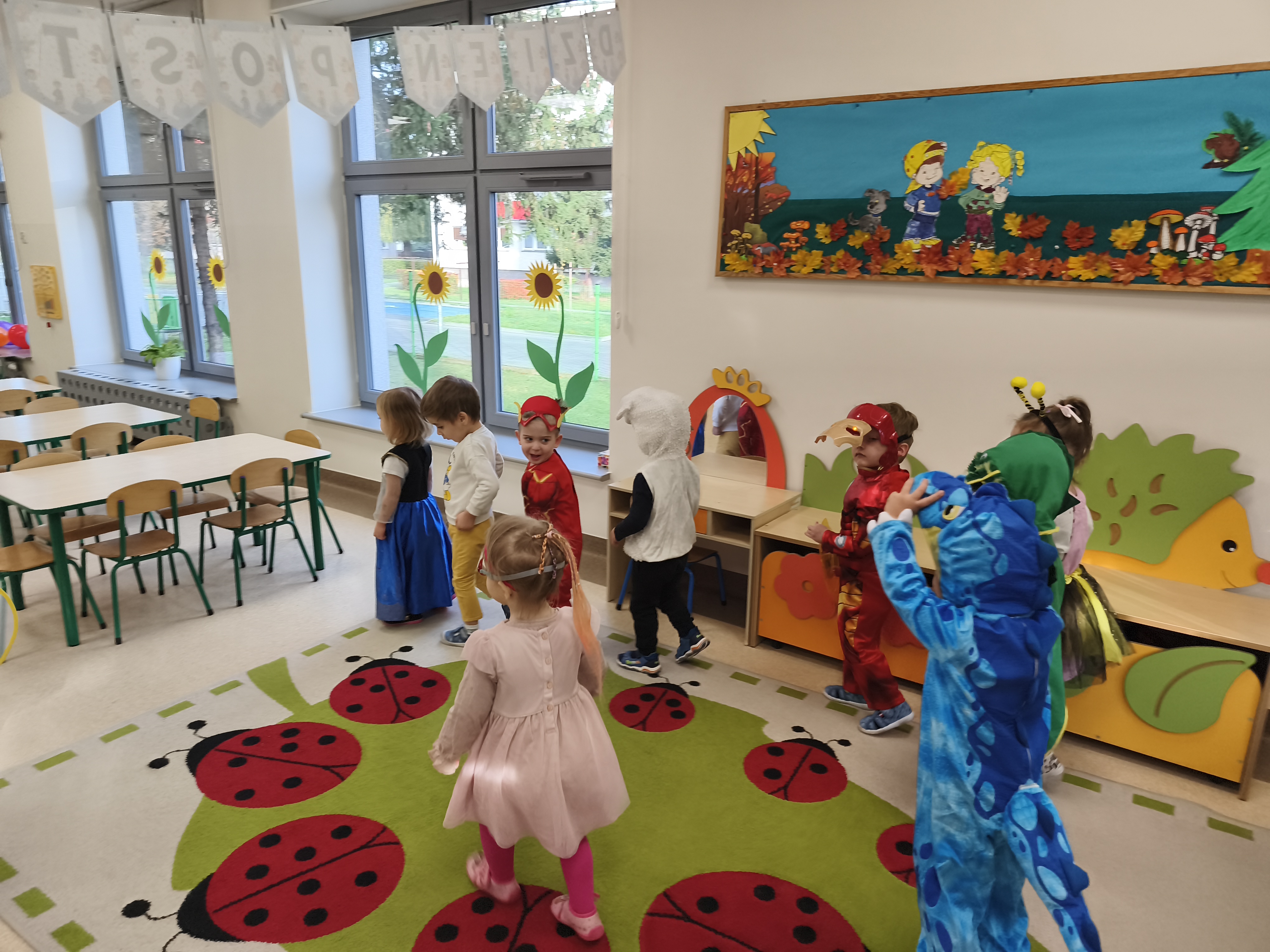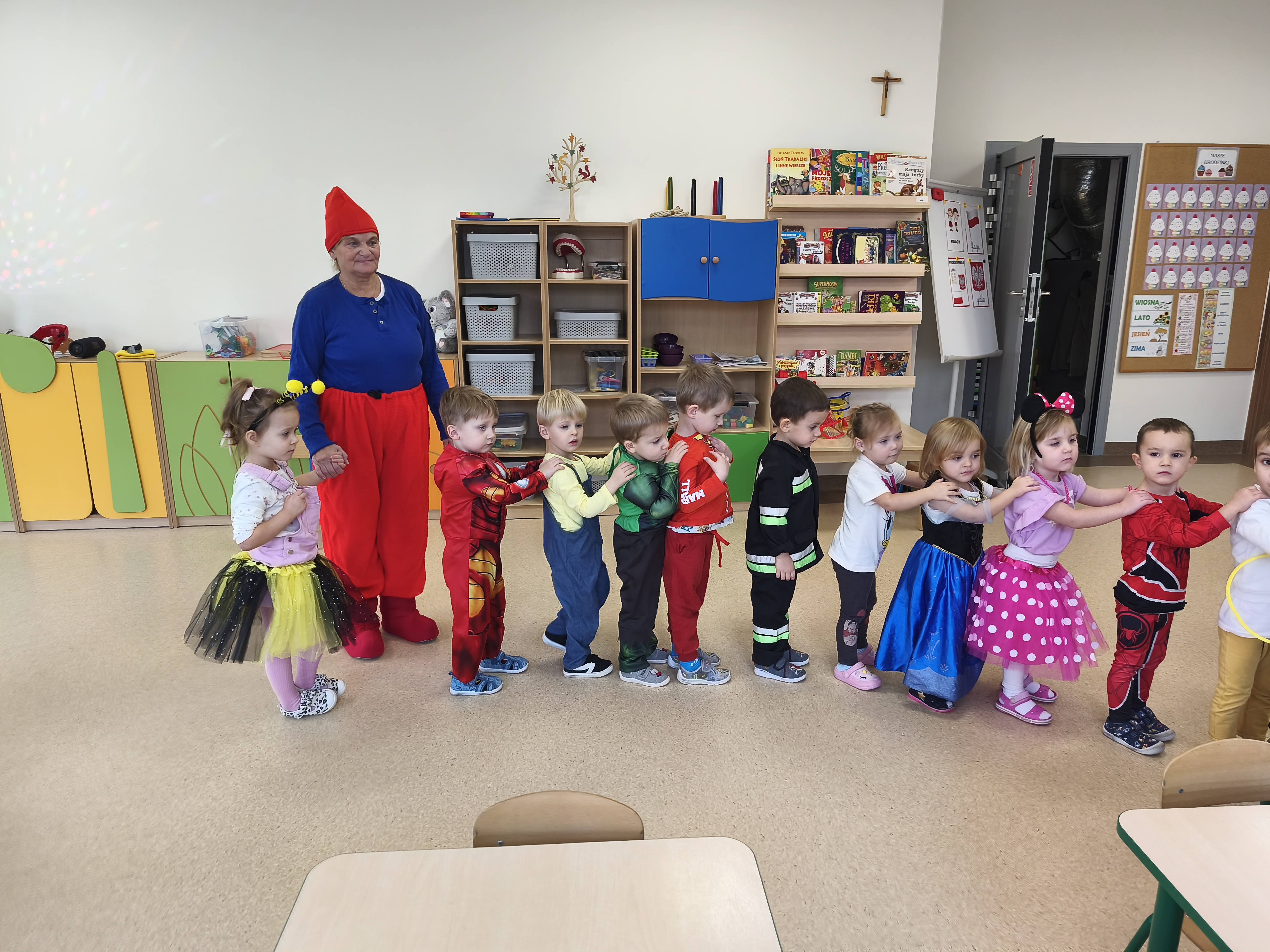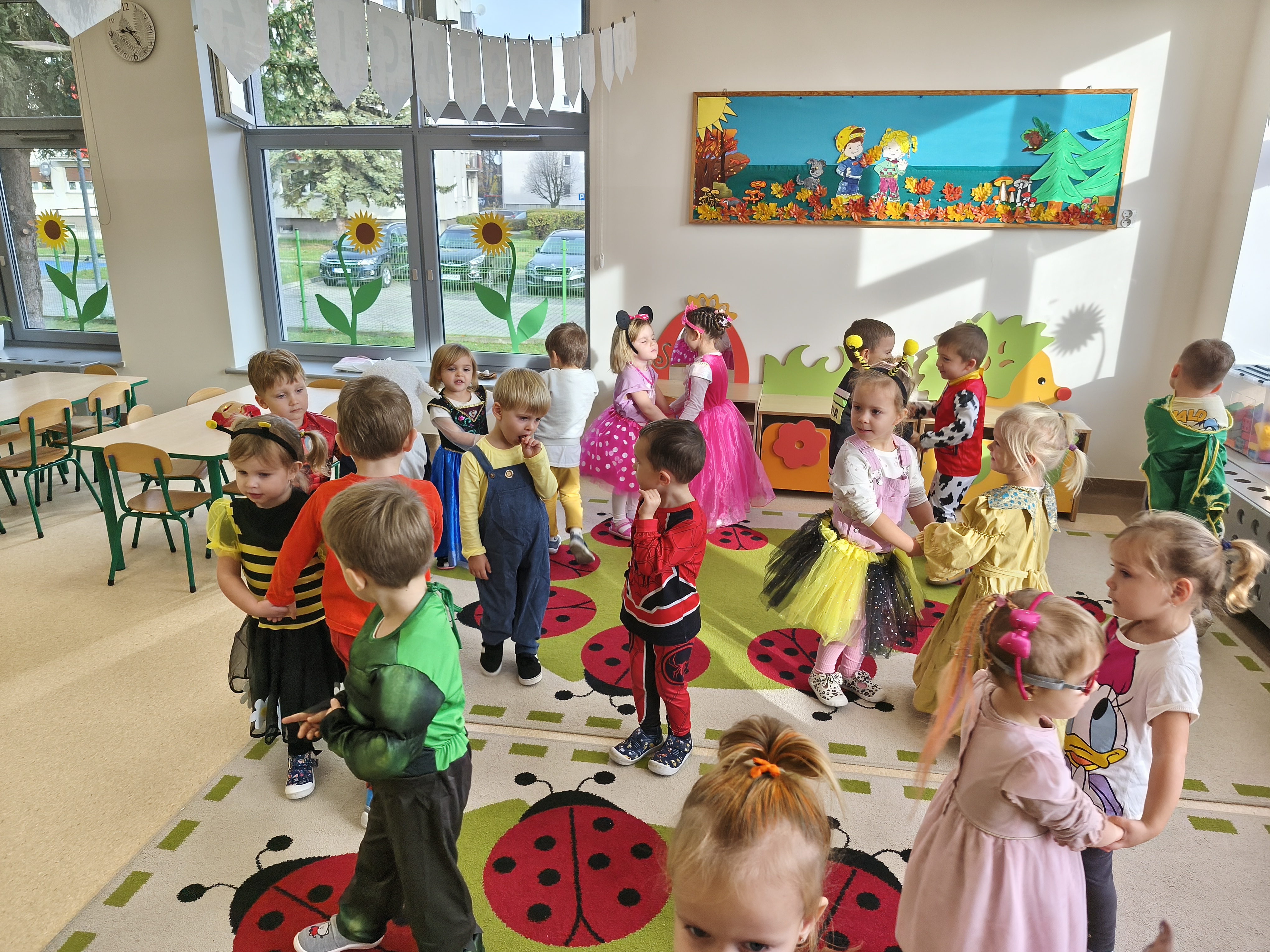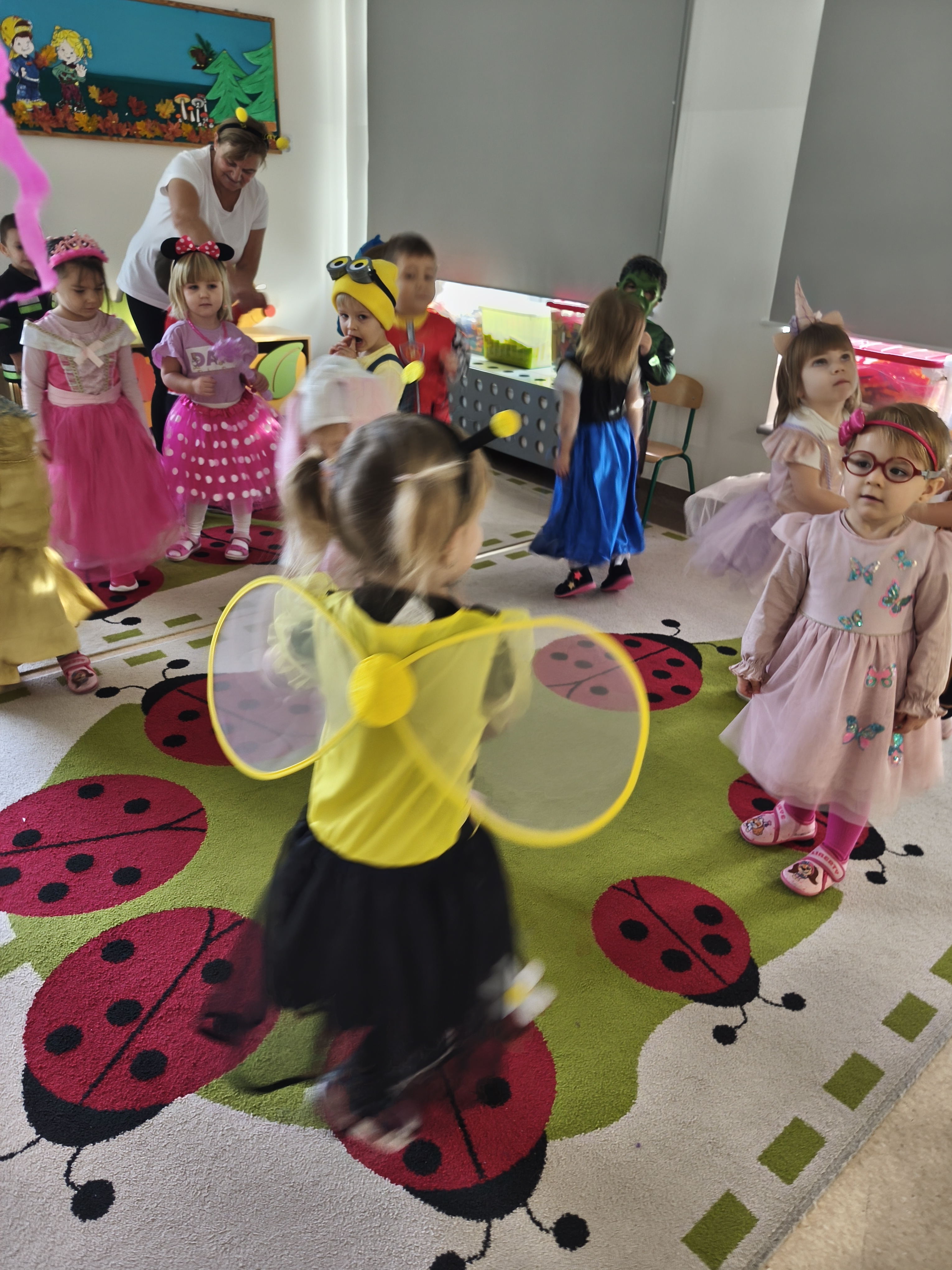 5 listopada obchodzimy Dzień Postaci z Bajek - jedno z najbardziej kolorowych i radosnych świąt. Tego dnia przedszkolaki przyszły przebrane za swoich ulubionych bohaterów. Można było spotkać księżniczki, pszczółki, superbohaterów, zwierzątka i wiele innych bajkowych postaci. Podczas wspólnej zabawy dzieci rozwiązywały zagadki, odgadywały bajkowe tytuły, tańczyły, Z przerażeniem i w ciszy jak nigdy dotąd wysłuchaliśmy bajki o Czerwonym Kapturku. Wilk był nieznajomym a my już wiemy ( choć nie wszyscy ), że jeśli kogoś nie znamy to na spacer z nim się nie wybieramy!