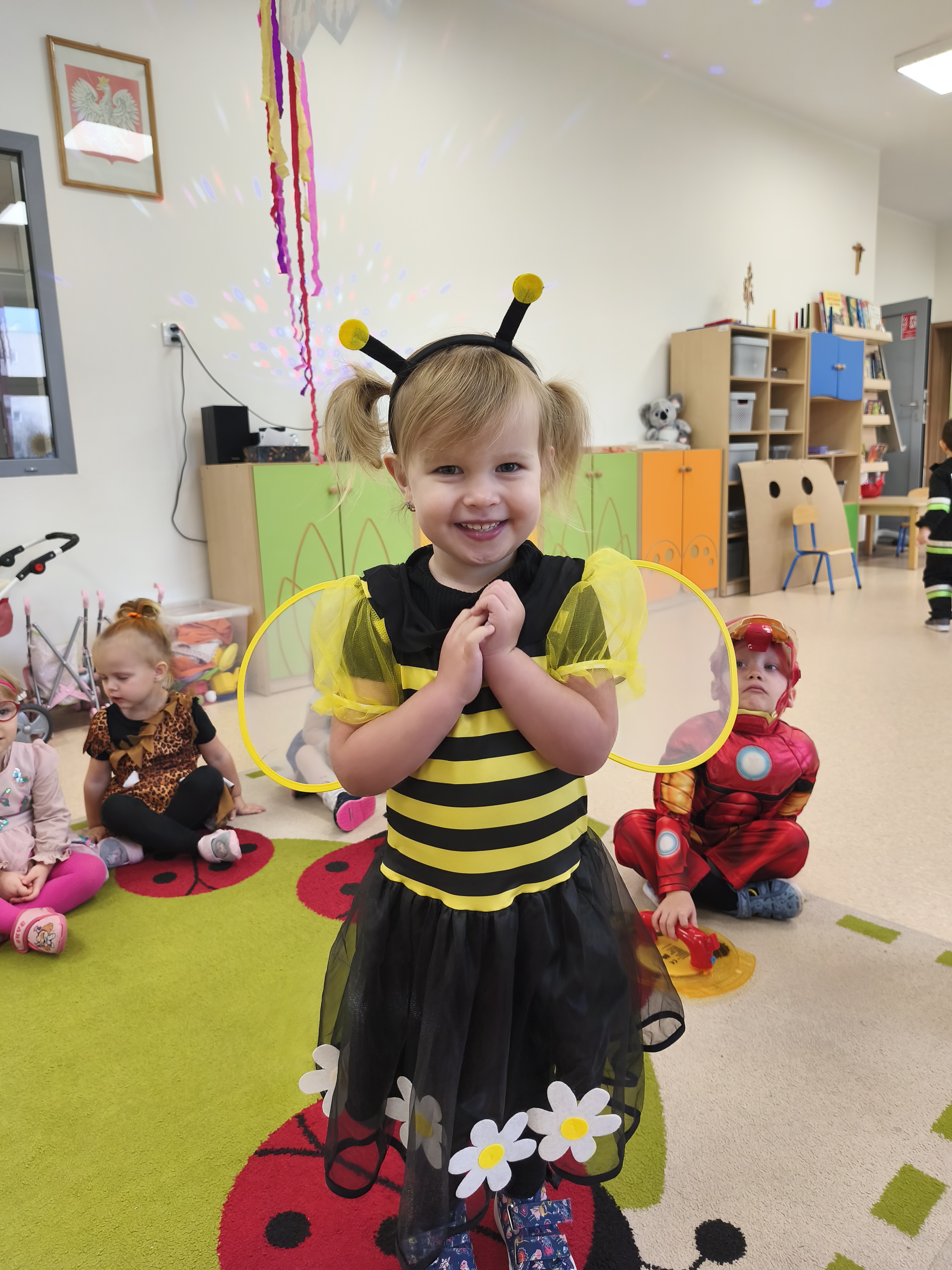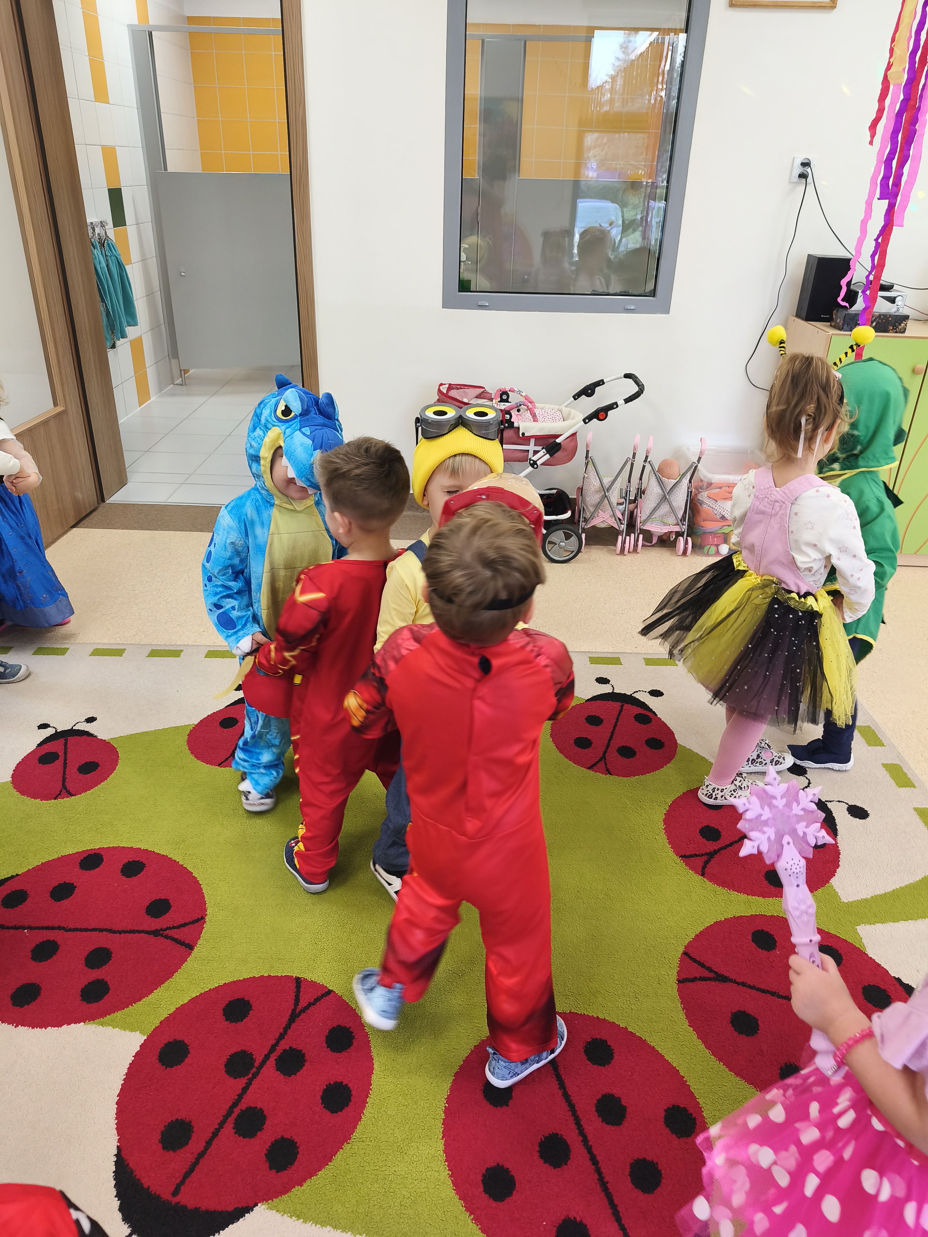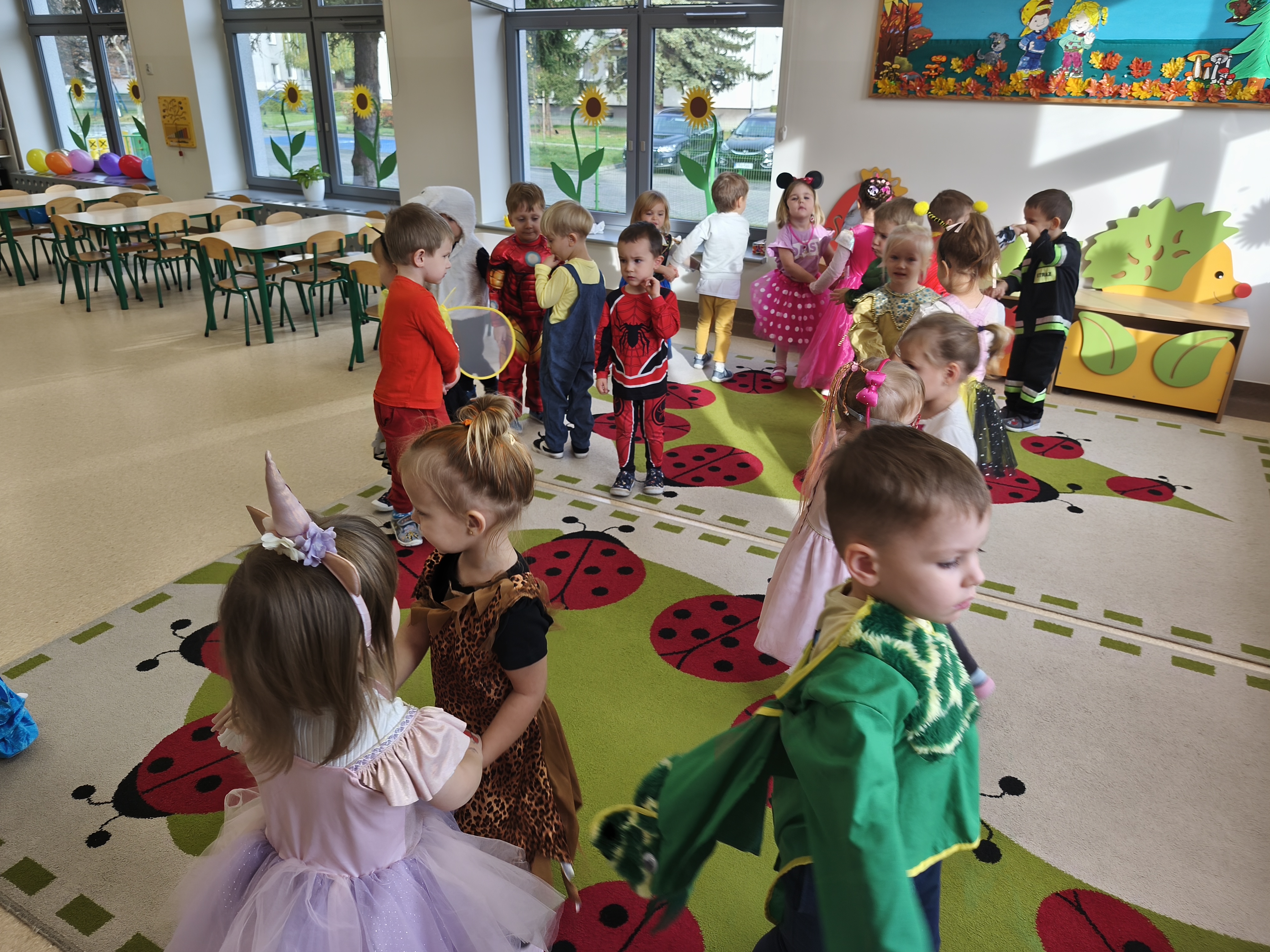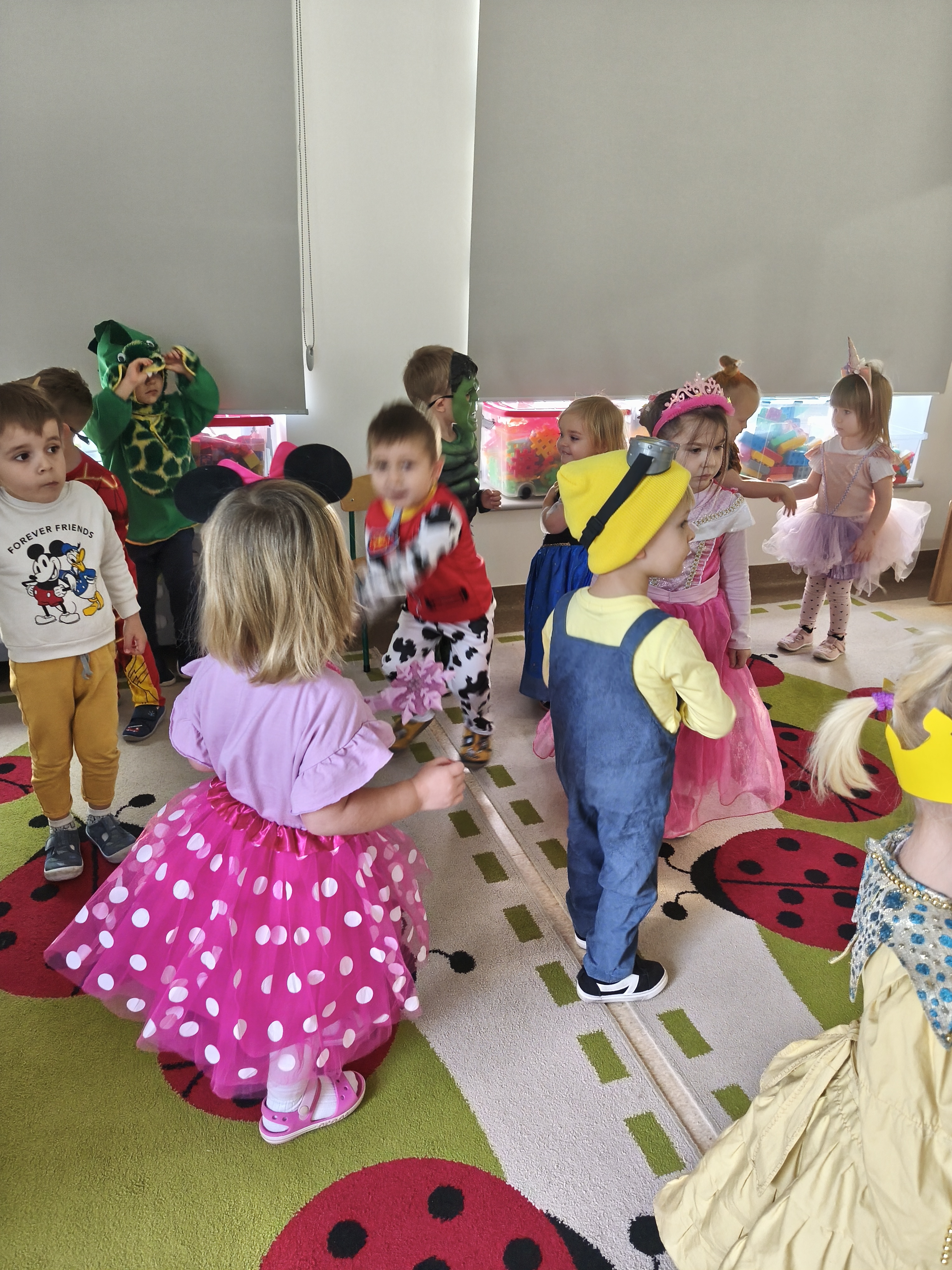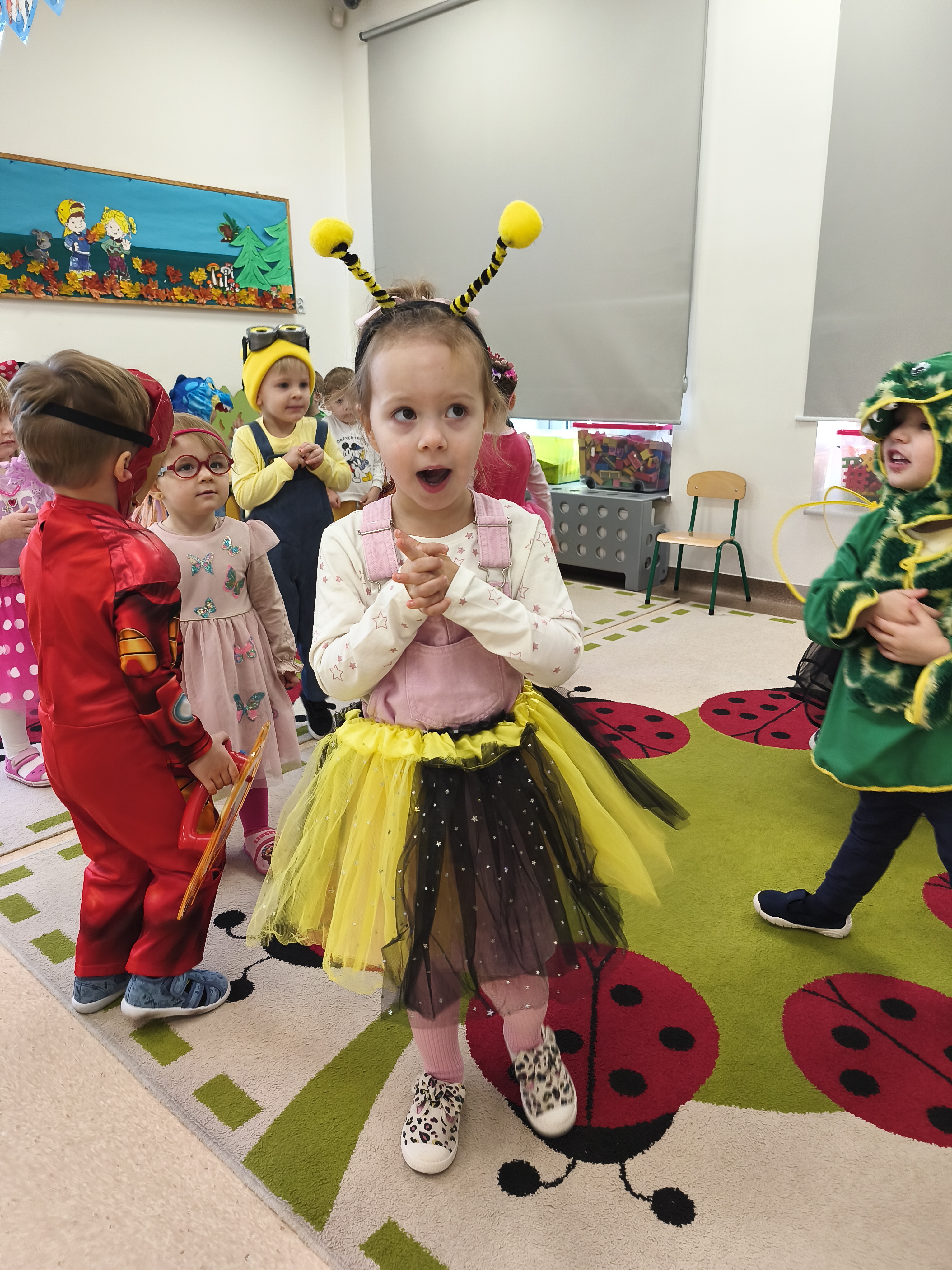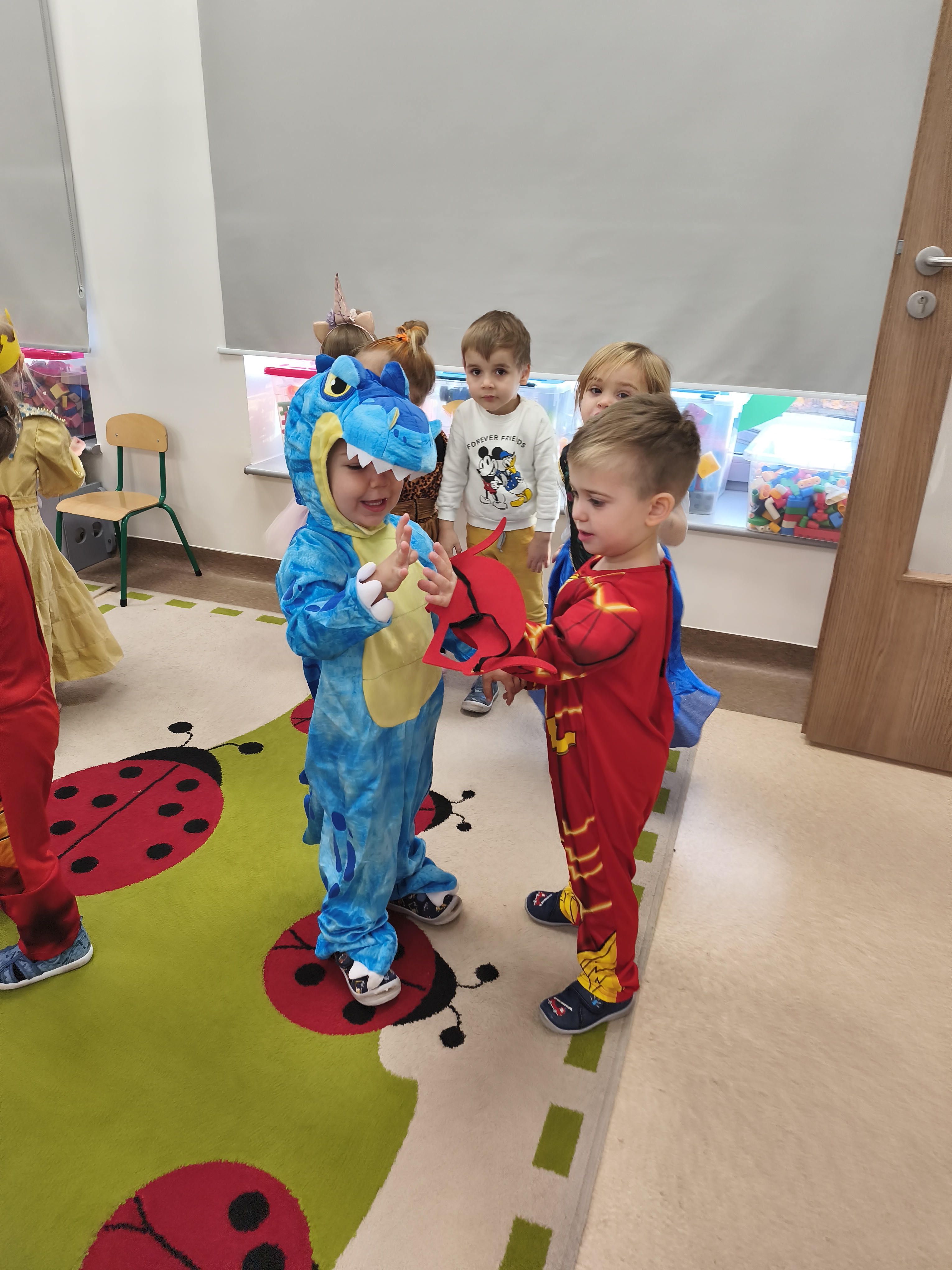 5 listopada obchodzimy Dzień Postaci z Bajek - jedno z najbardziej kolorowych i radosnych świąt. Tego dnia przedszkolaki przyszły przebrane za swoich ulubionych bohaterów. Można było spotkać księżniczki, pszczółki, superbohaterów, zwierzątka i wiele innych bajkowych postaci. Podczas wspólnej zabawy dzieci rozwiązywały zagadki, odgadywały bajkowe tytuły, tańczyły, Z przerażeniem i w ciszy jak nigdy dotąd wysłuchaliśmy bajki o Czerwonym Kapturku. Wilk był nieznajomym a my już wiemy ( choć nie wszyscy ), że jeśli kogoś nie znamy to na spacer z nim się nie wybieramy!
