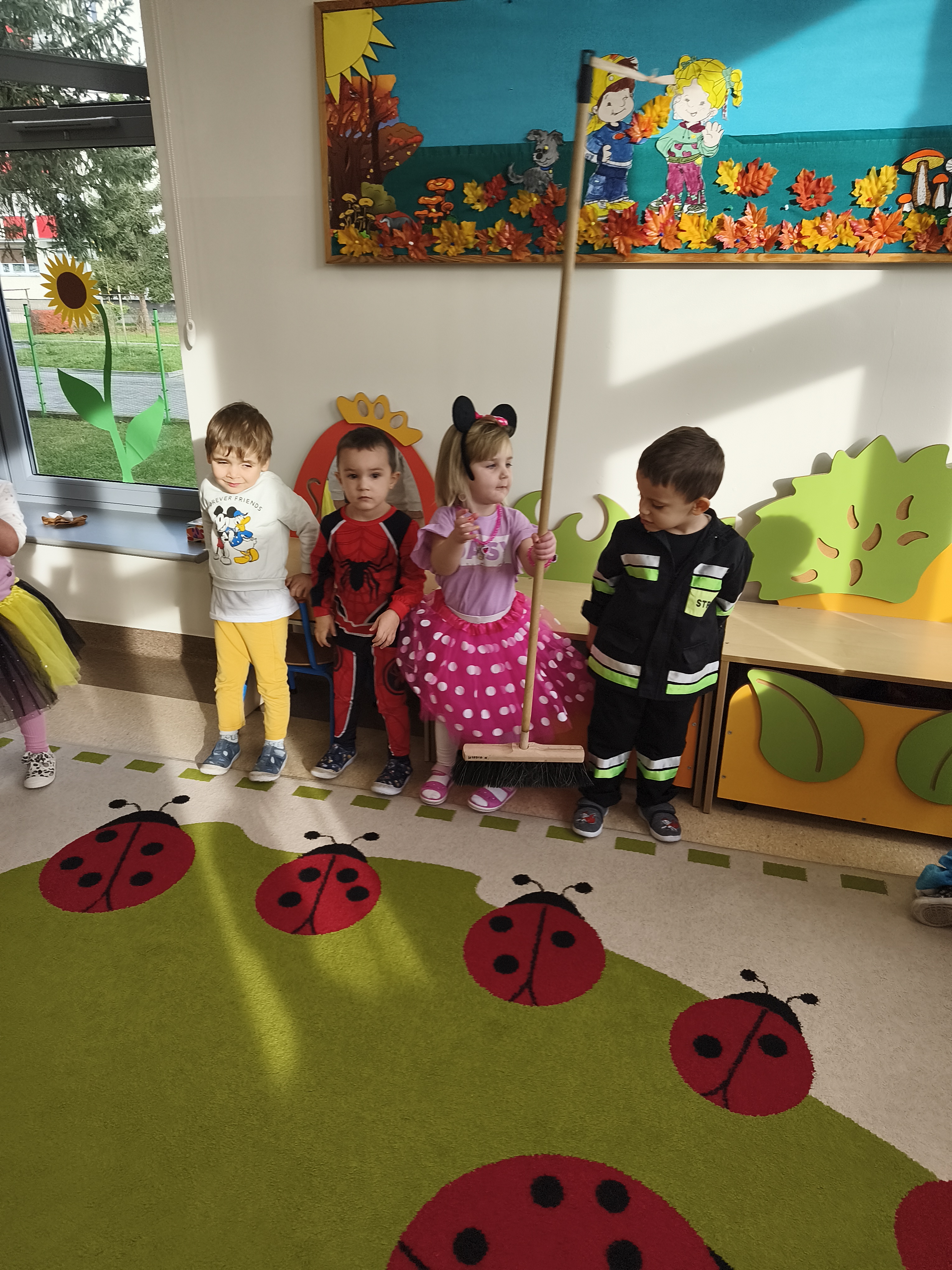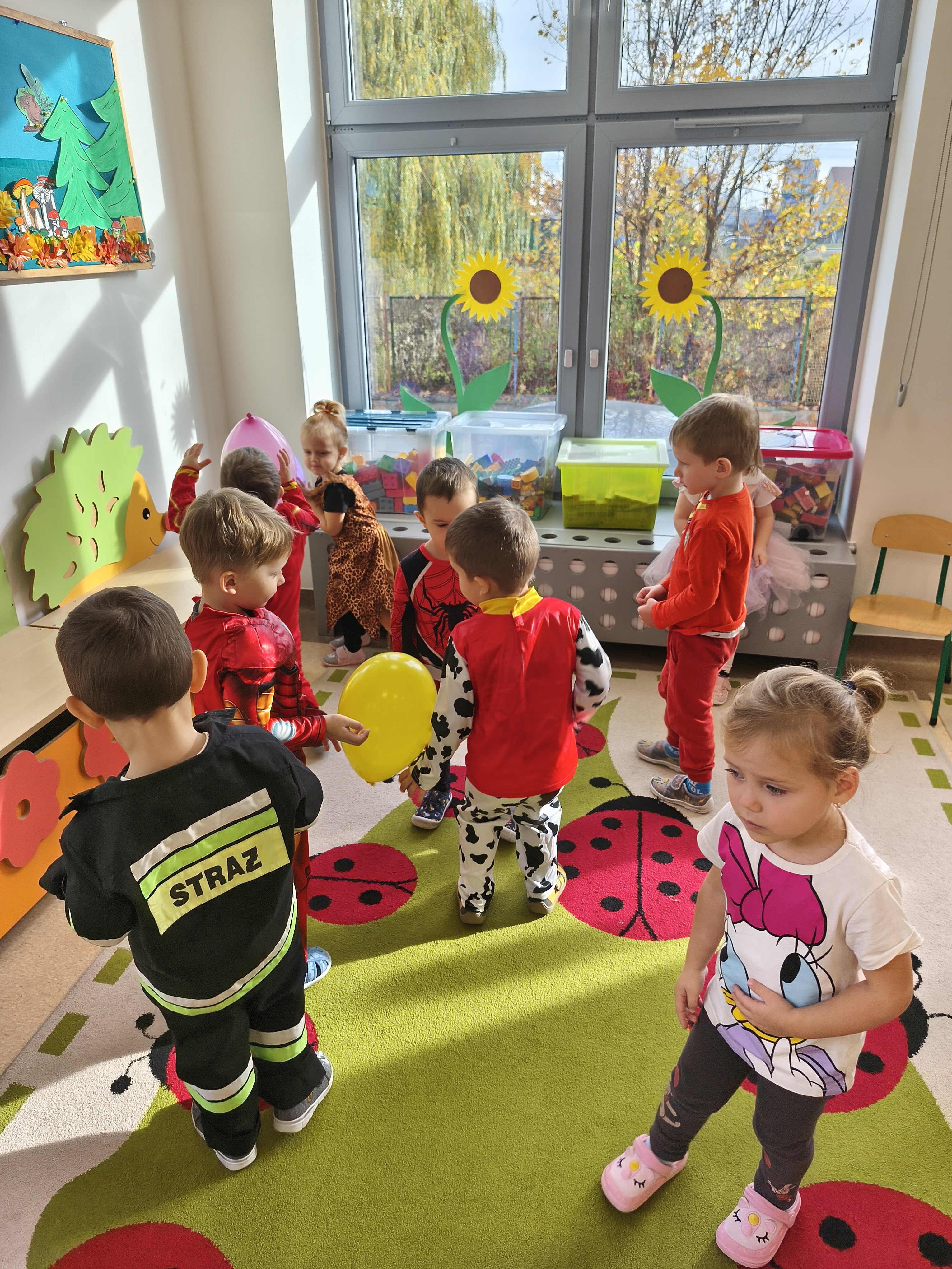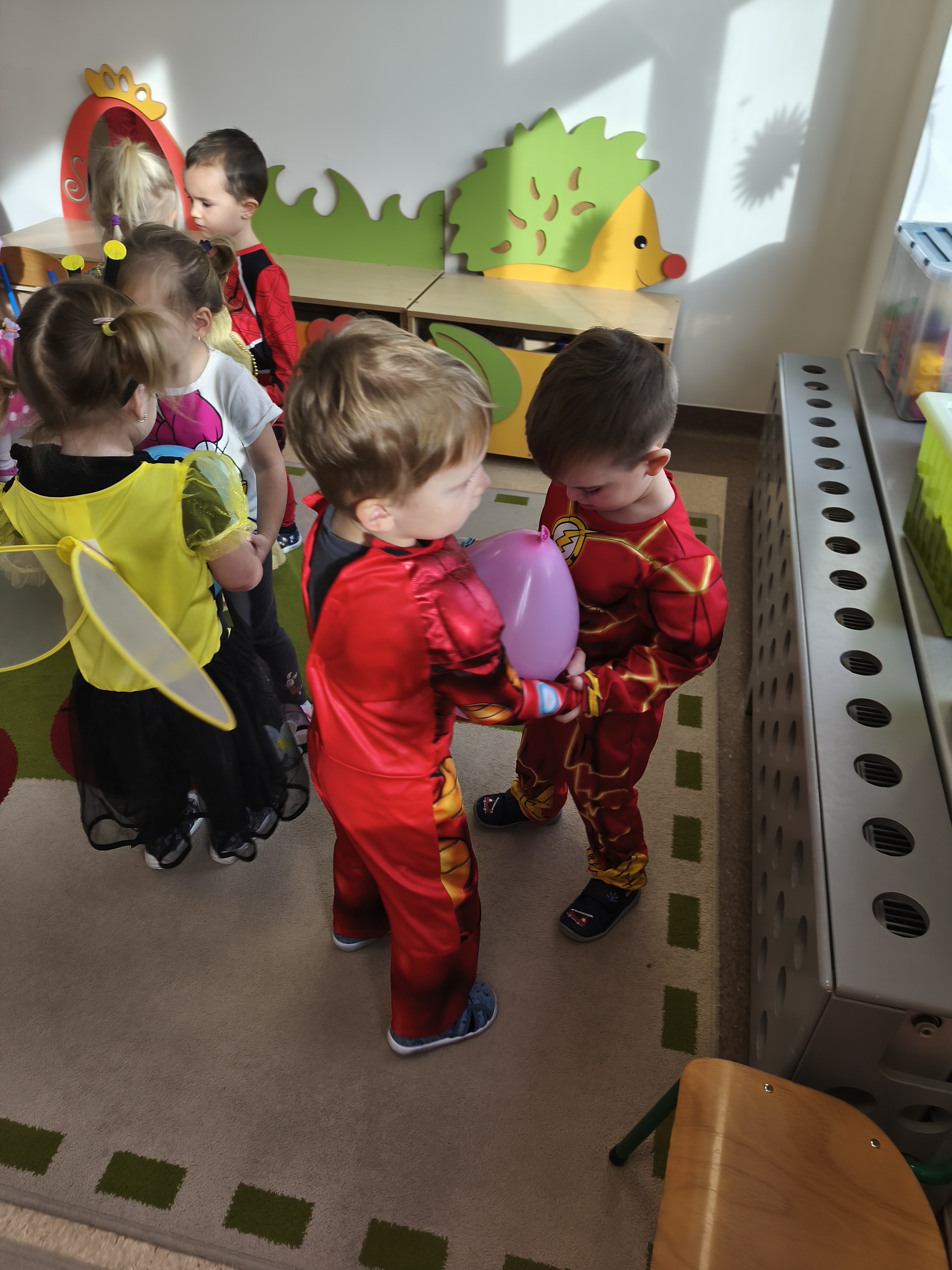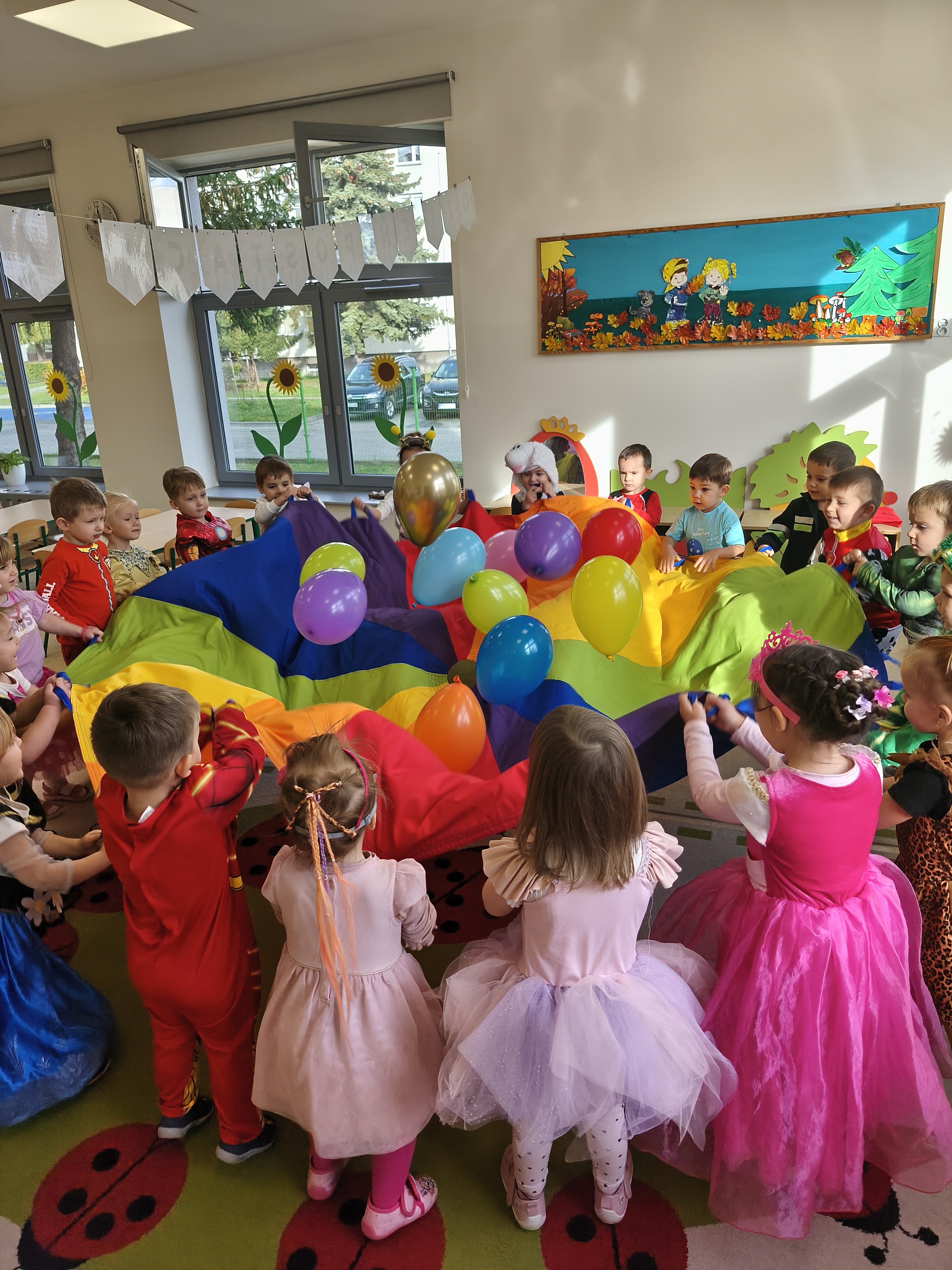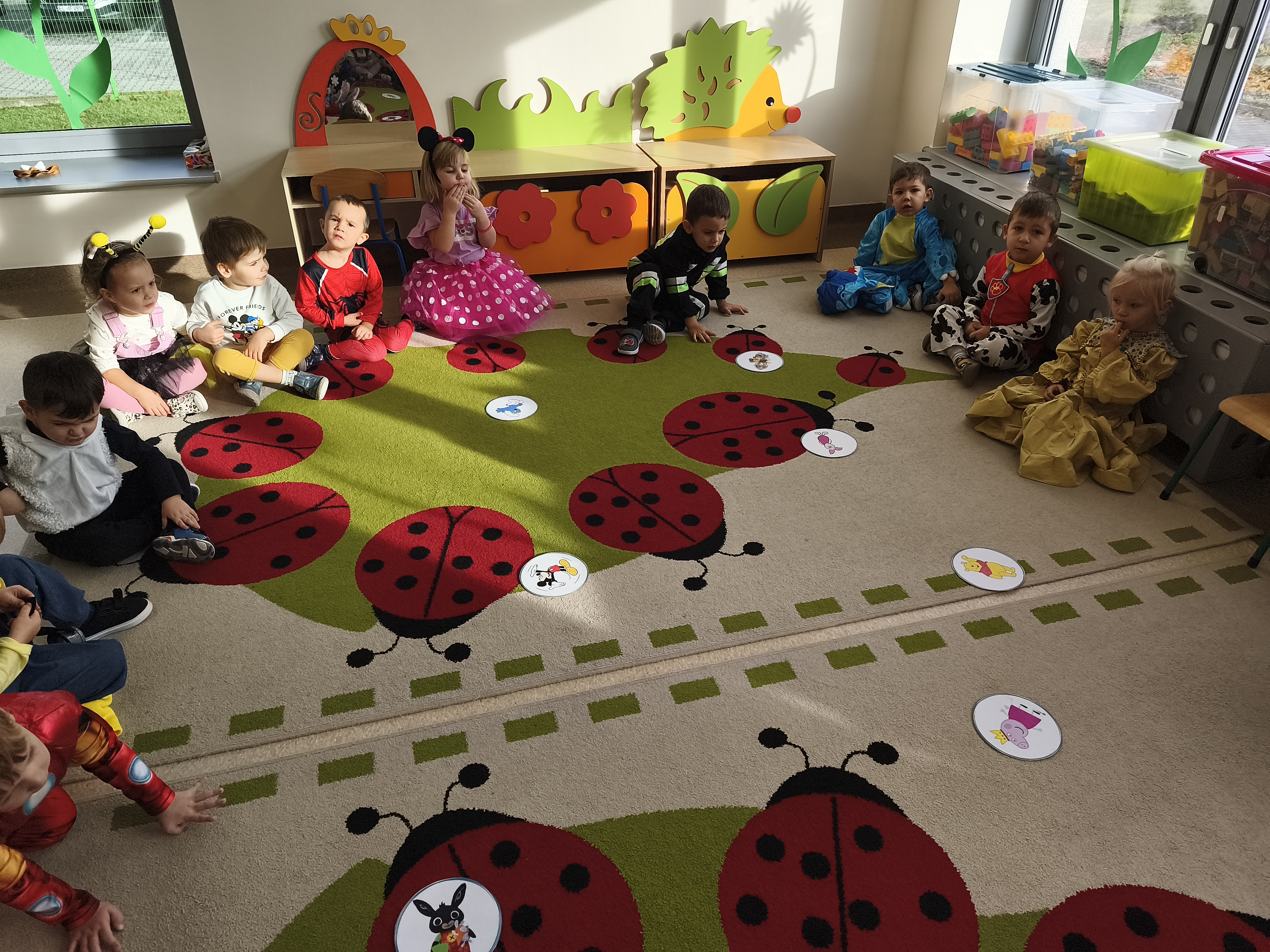 5 listopada obchodzimy Dzień Postaci z Bajek - jedno z najbardziej kolorowych i radosnych świąt. Tego dnia przedszkolaki przyszły przebrane za swoich ulubionych bohaterów. Można było spotkać księżniczki, pszczółki, superbohaterów, zwierzątka i wiele innych bajkowych postaci. Podczas wspólnej zabawy dzieci rozwiązywały zagadki, odgadywały bajkowe tytuły, tańczyły, Z przerażeniem i w ciszy jak nigdy dotąd wysłuchaliśmy bajki o Czerwonym Kapturku. Wilk był nieznajomym a my już wiemy ( choć nie wszyscy ), że jeśli kogoś nie znamy to na spacer z nim się nie wybieramy!
