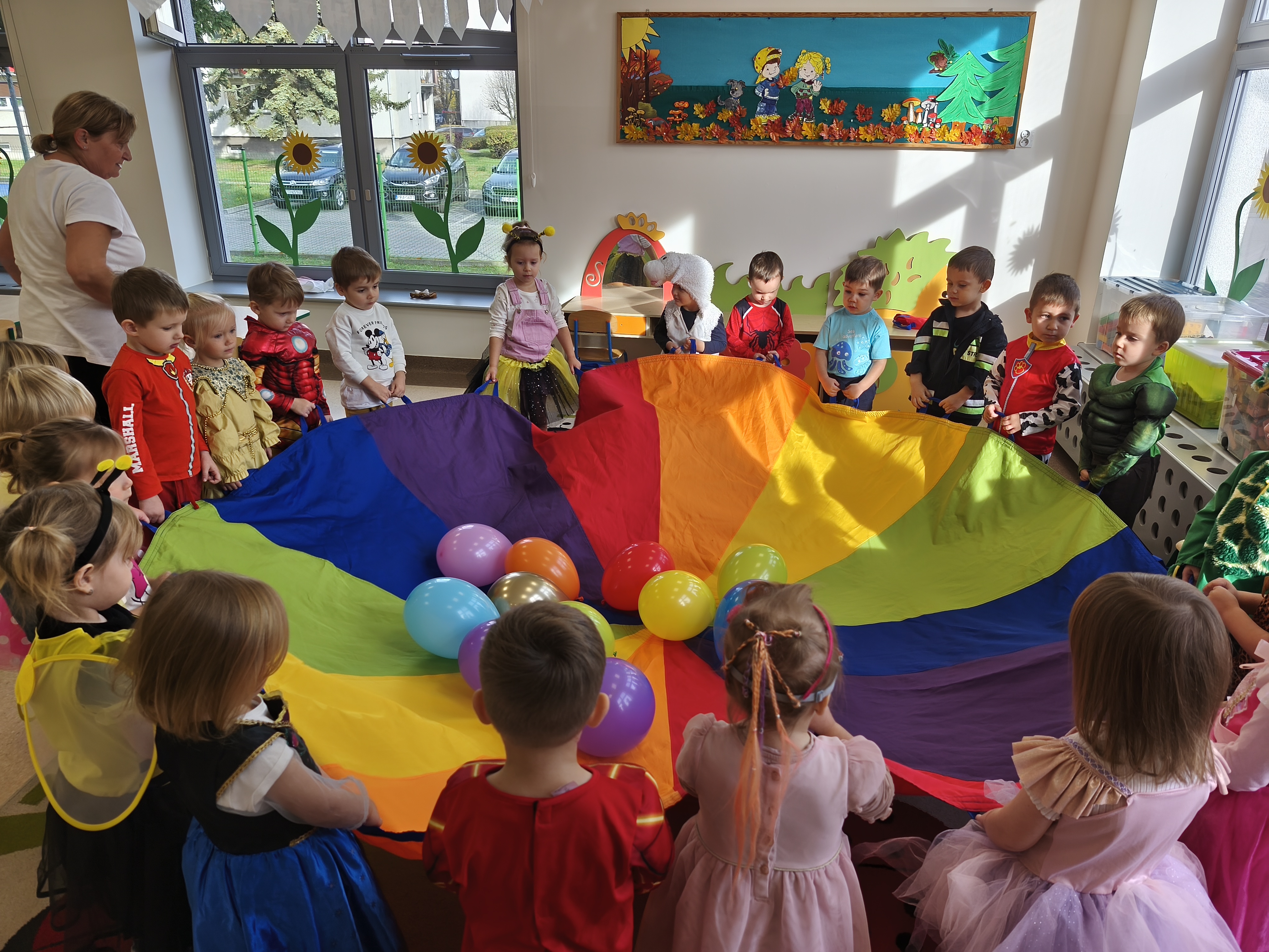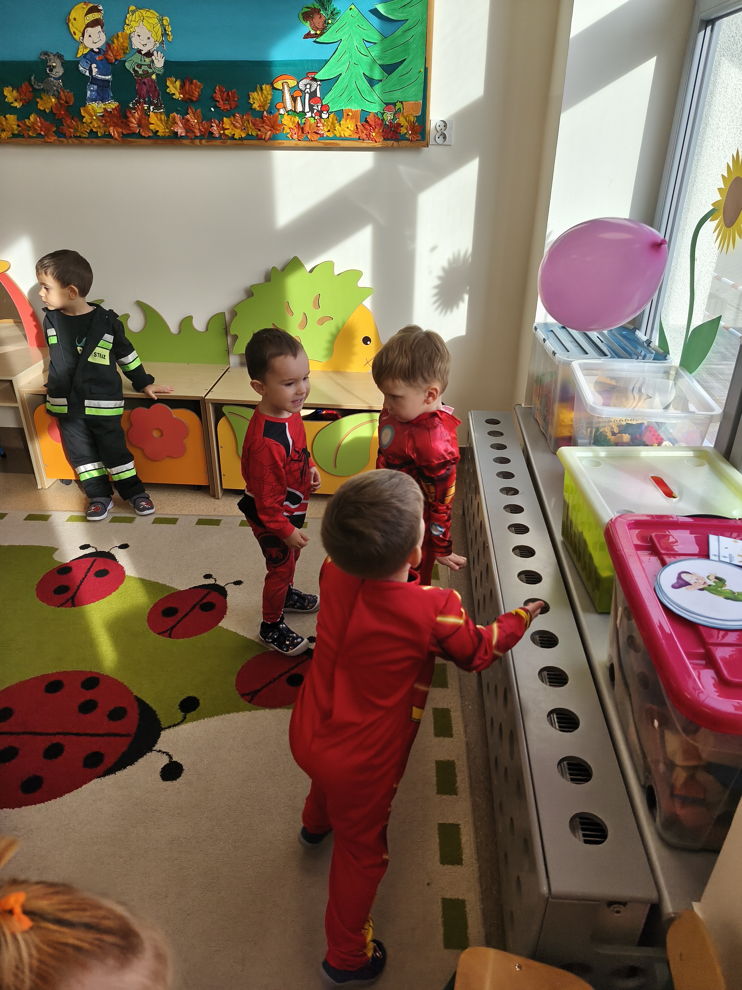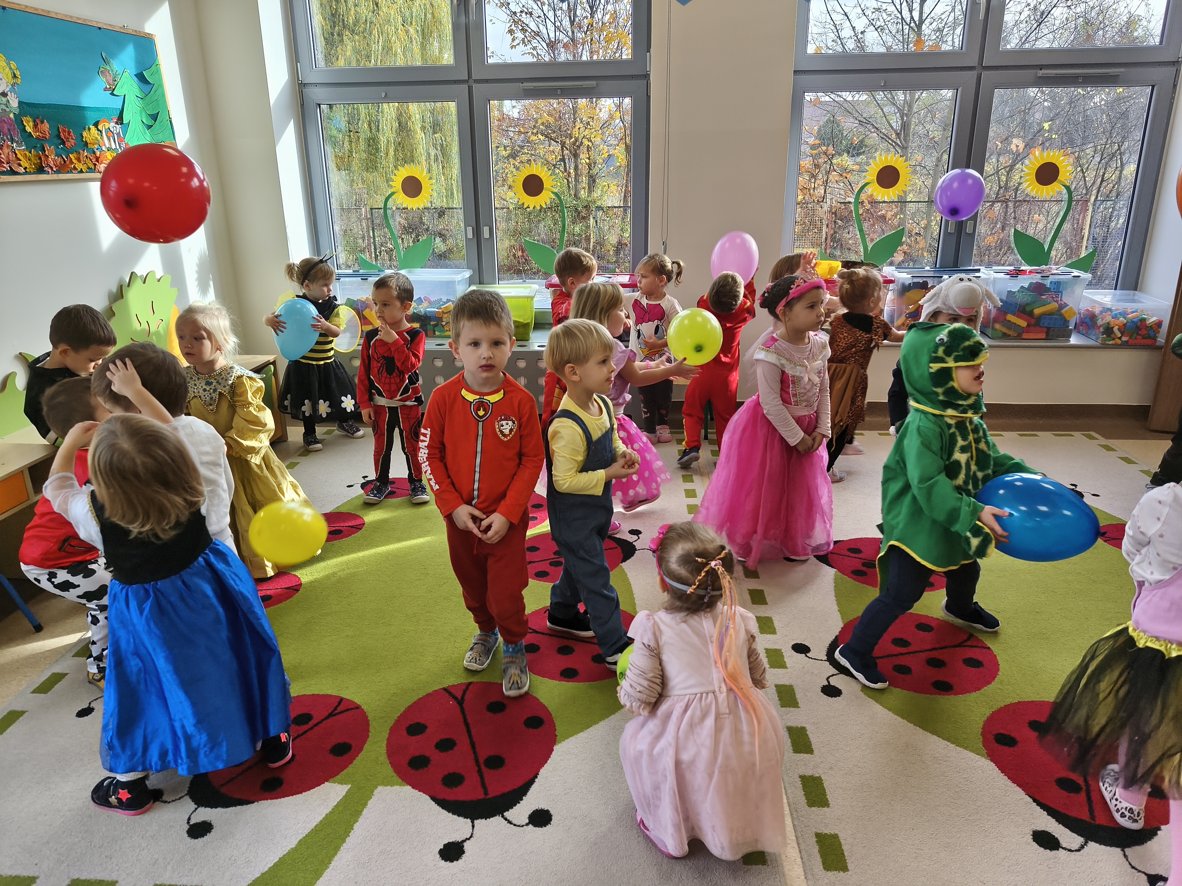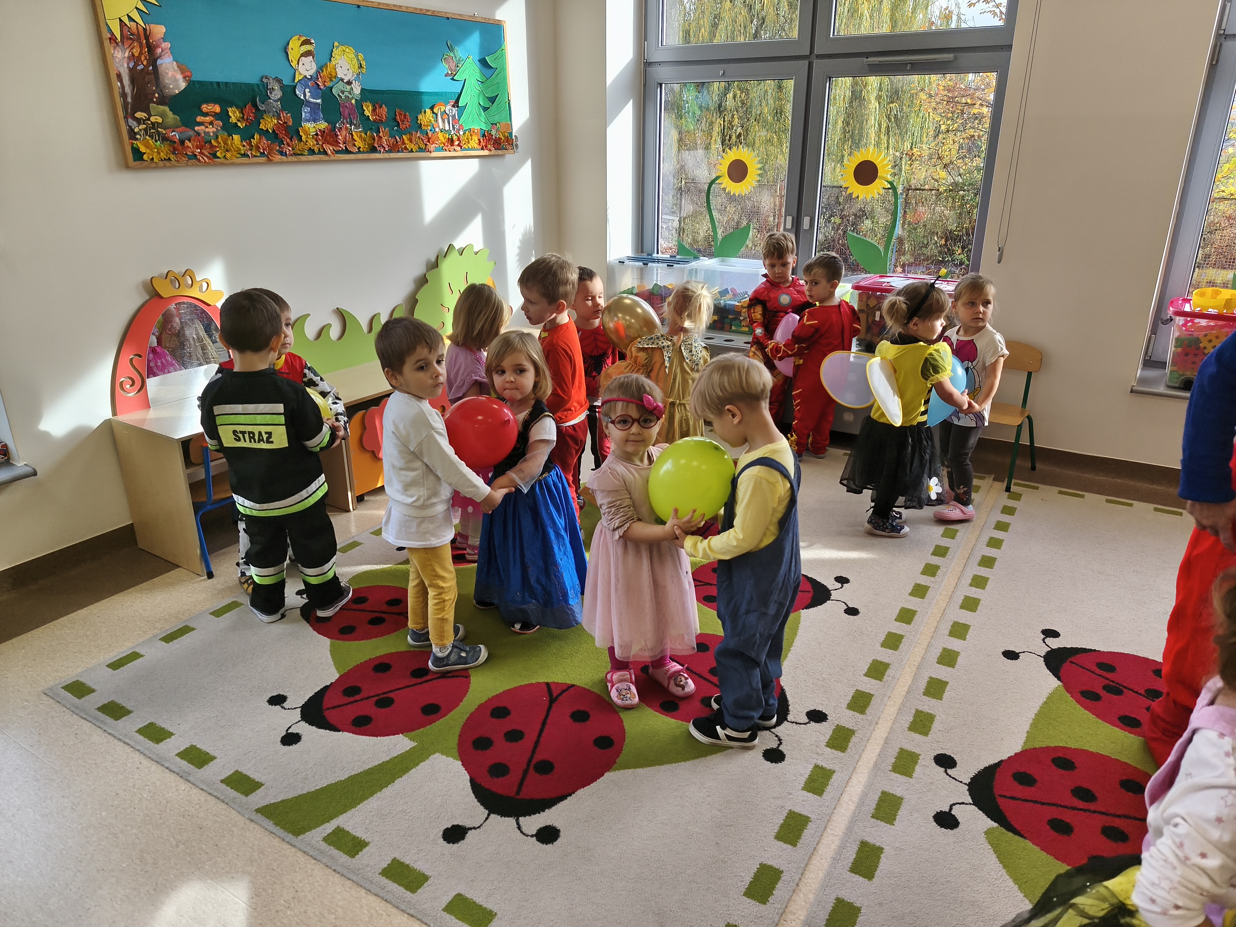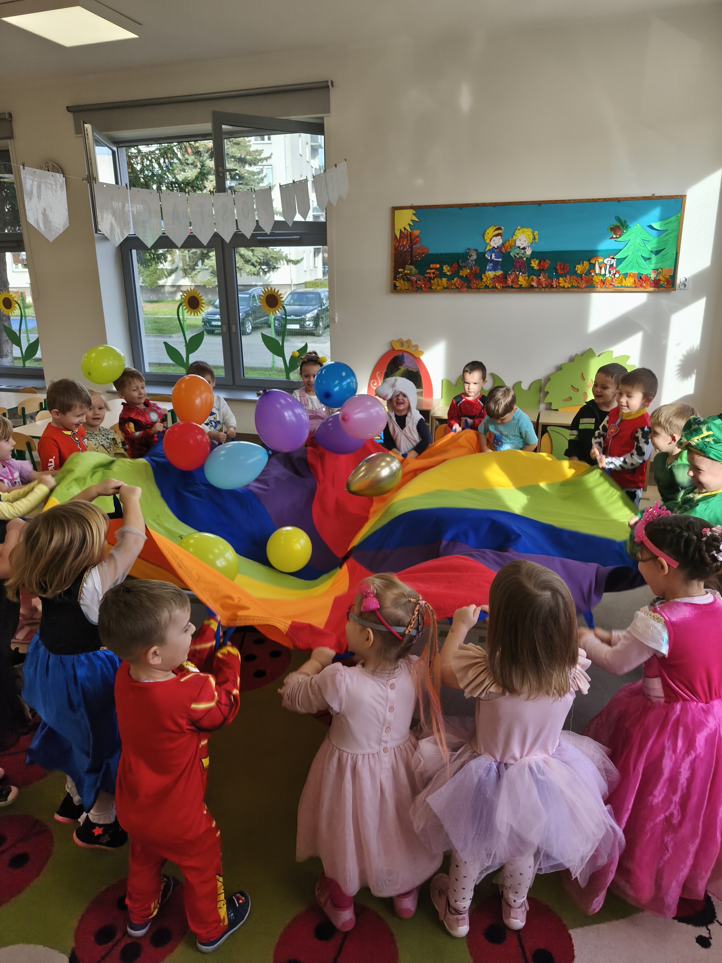5 listopada obchodzimy Dzień Postaci z Bajek - jedno z najbardziej kolorowych i radosnych świąt. Tego dnia przedszkolaki przyszły przebrane za swoich ulubionych bohaterów. Można było spotkać księżniczki, pszczółki, superbohaterów, zwierzątka i wiele innych bajkowych postaci. Podczas wspólnej zabawy dzieci rozwiązywały zagadki, odgadywały bajkowe tytuły, tańczyły, Z przerażeniem i w ciszy jak nigdy dotąd wysłuchaliśmy bajki o Czerwonym Kapturku. Wilk był nieznajomym a my już wiemy ( choć nie wszyscy ), że jeśli kogoś nie znamy to na spacer z nim się nie wybieramy!