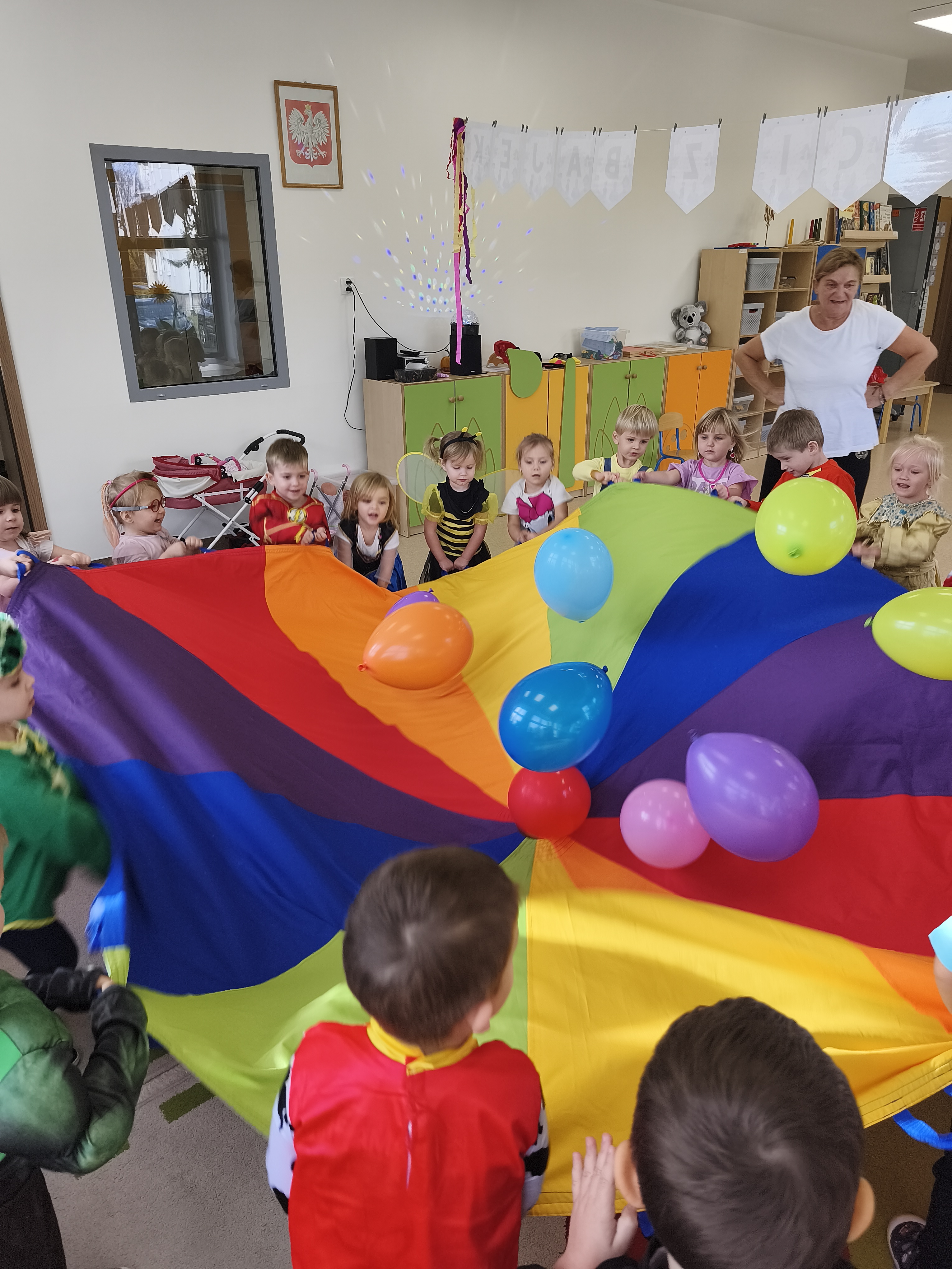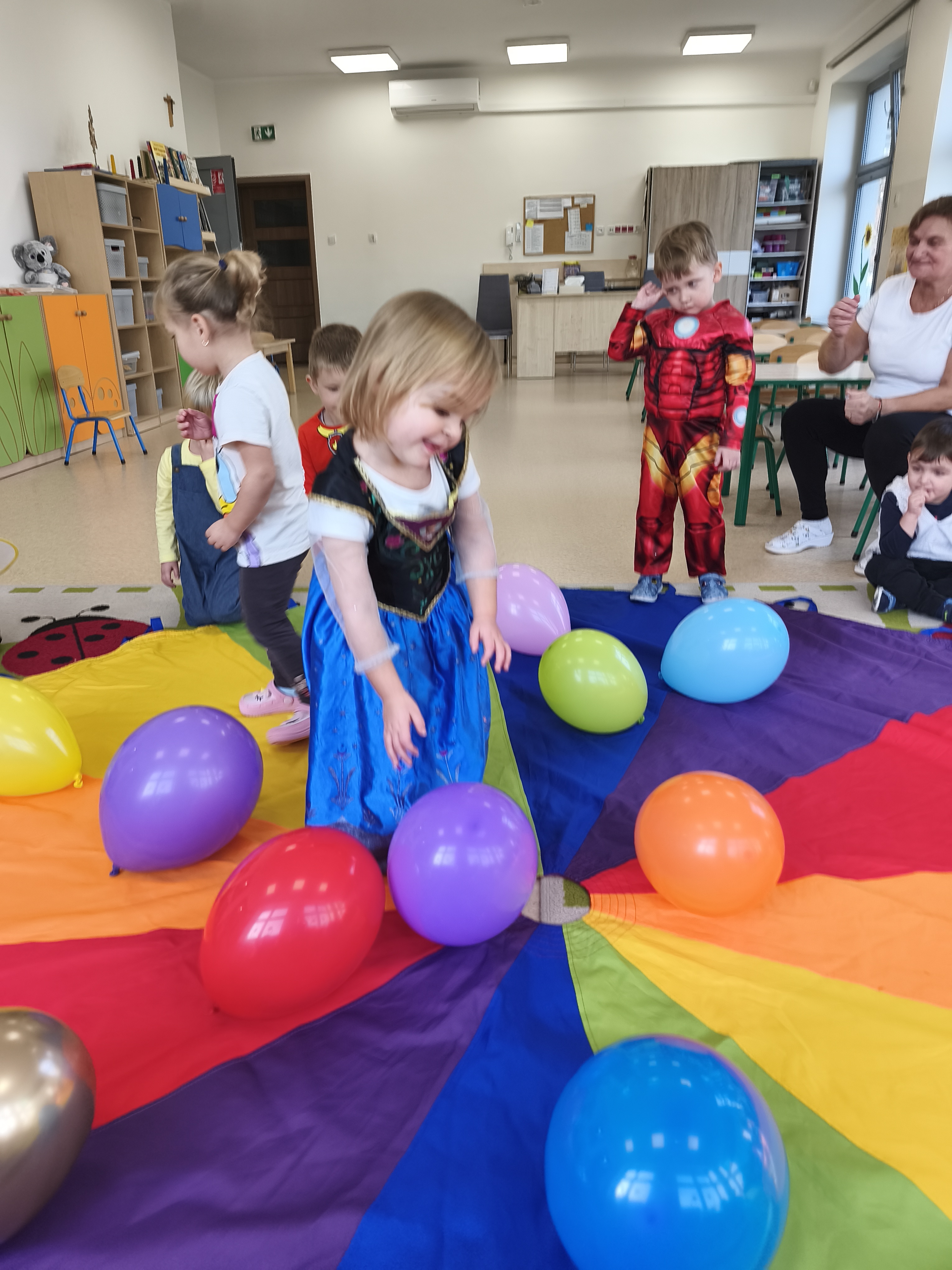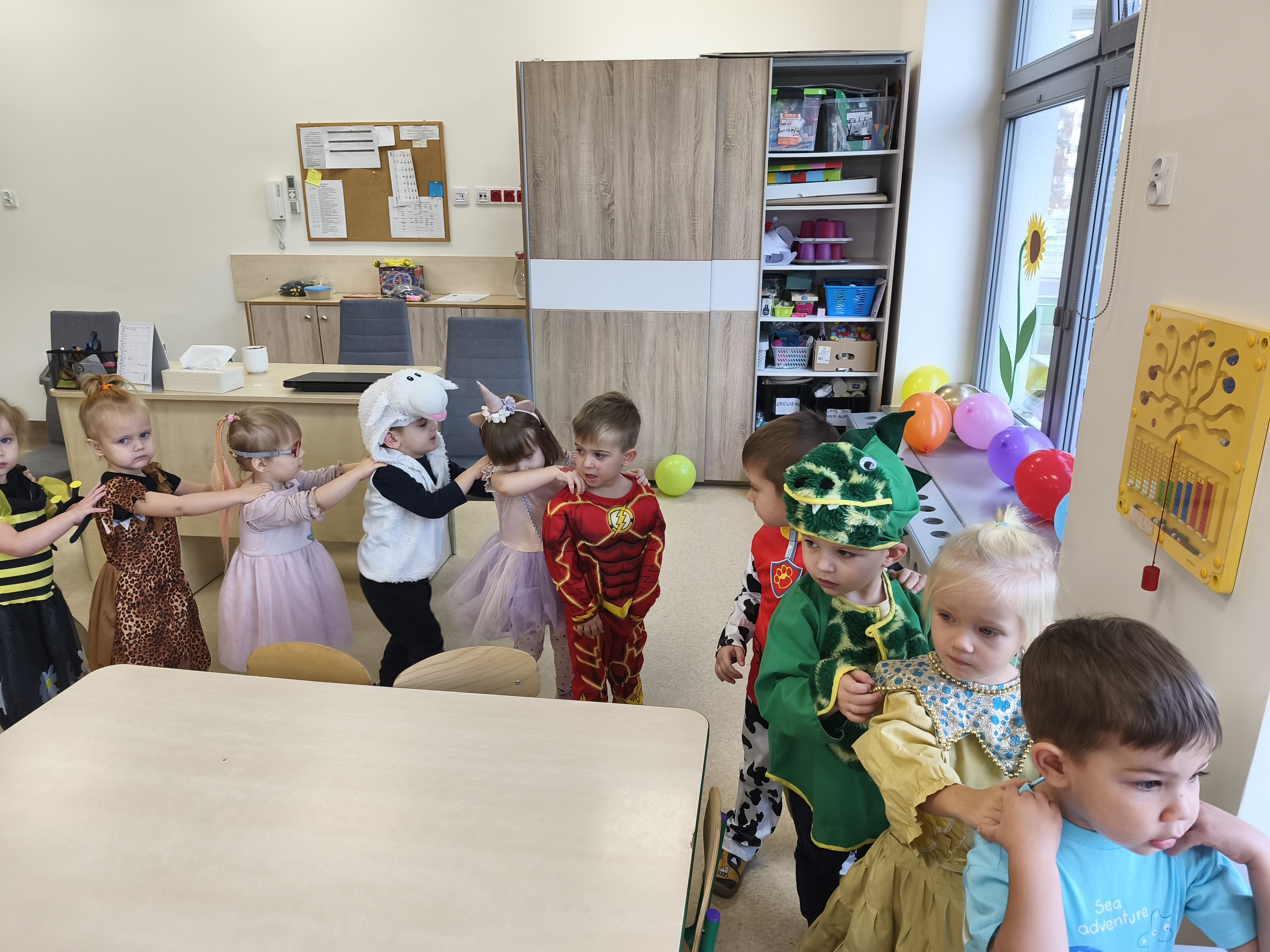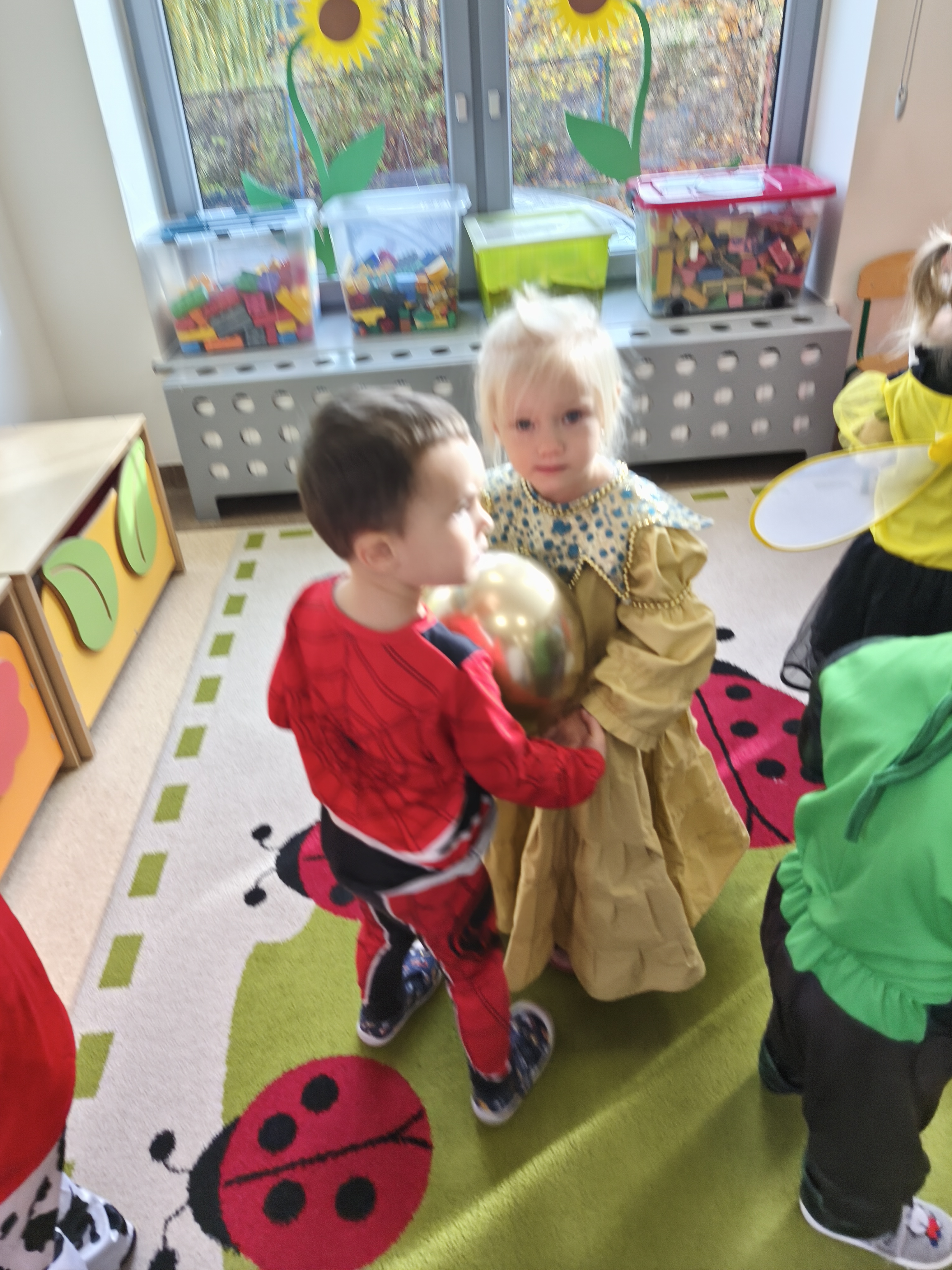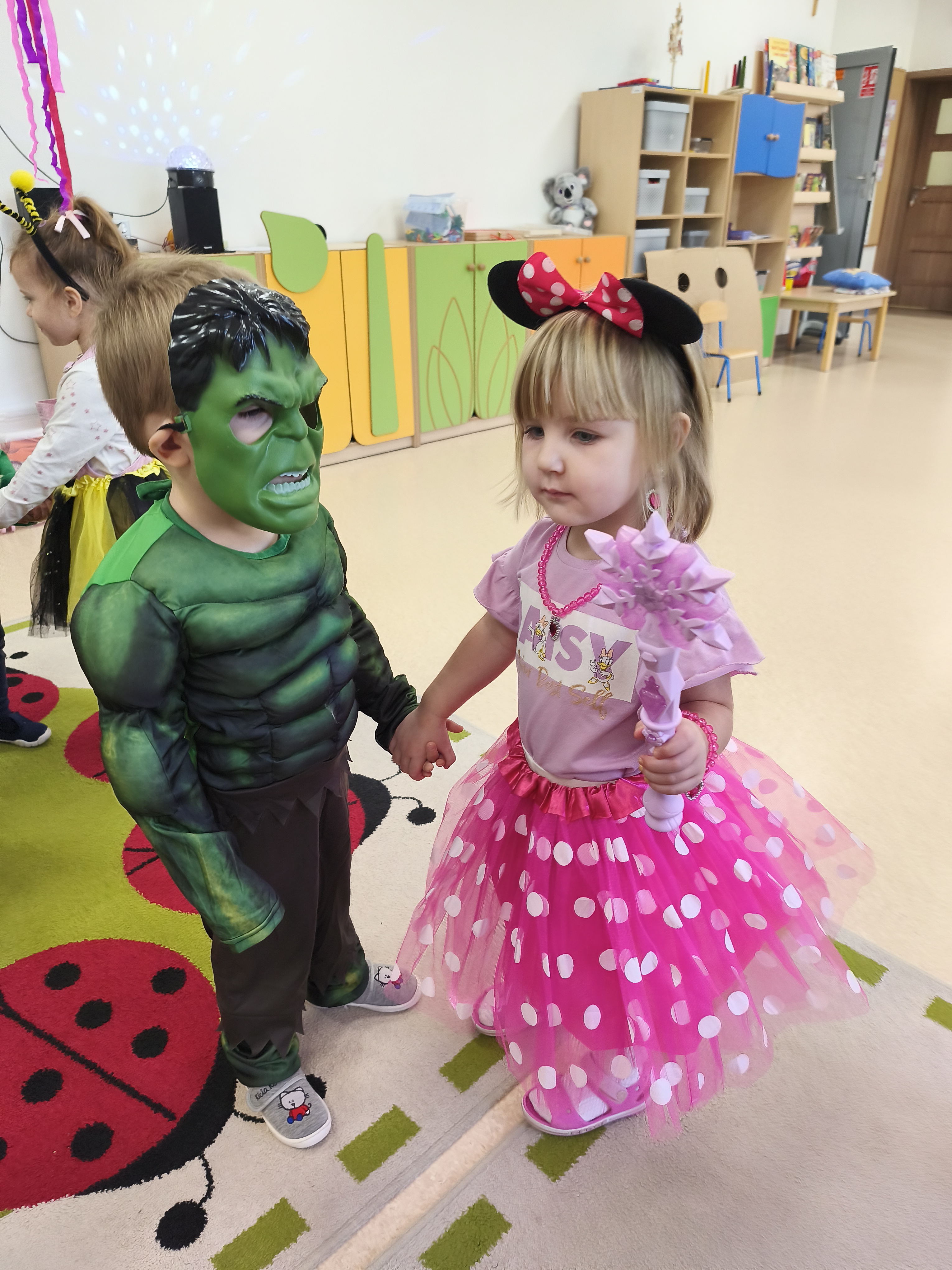 5 listopada obchodzimy Dzień Postaci z Bajek - jedno z najbardziej kolorowych i radosnych świąt. Tego dnia przedszkolaki przyszły przebrane za swoich ulubionych bohaterów. Można było spotkać księżniczki, pszczółki, superbohaterów, zwierzątka i wiele innych bajkowych postaci. Podczas wspólnej zabawy dzieci rozwiązywały zagadki, odgadywały bajkowe tytuły, tańczyły, Z przerażeniem i w ciszy jak nigdy dotąd wysłuchaliśmy bajki o Czerwonym Kapturku. Wilk był nieznajomym a my już wiemy ( choć nie wszyscy ), że jeśli kogoś nie znamy to na spacer z nim się nie wybieramy!