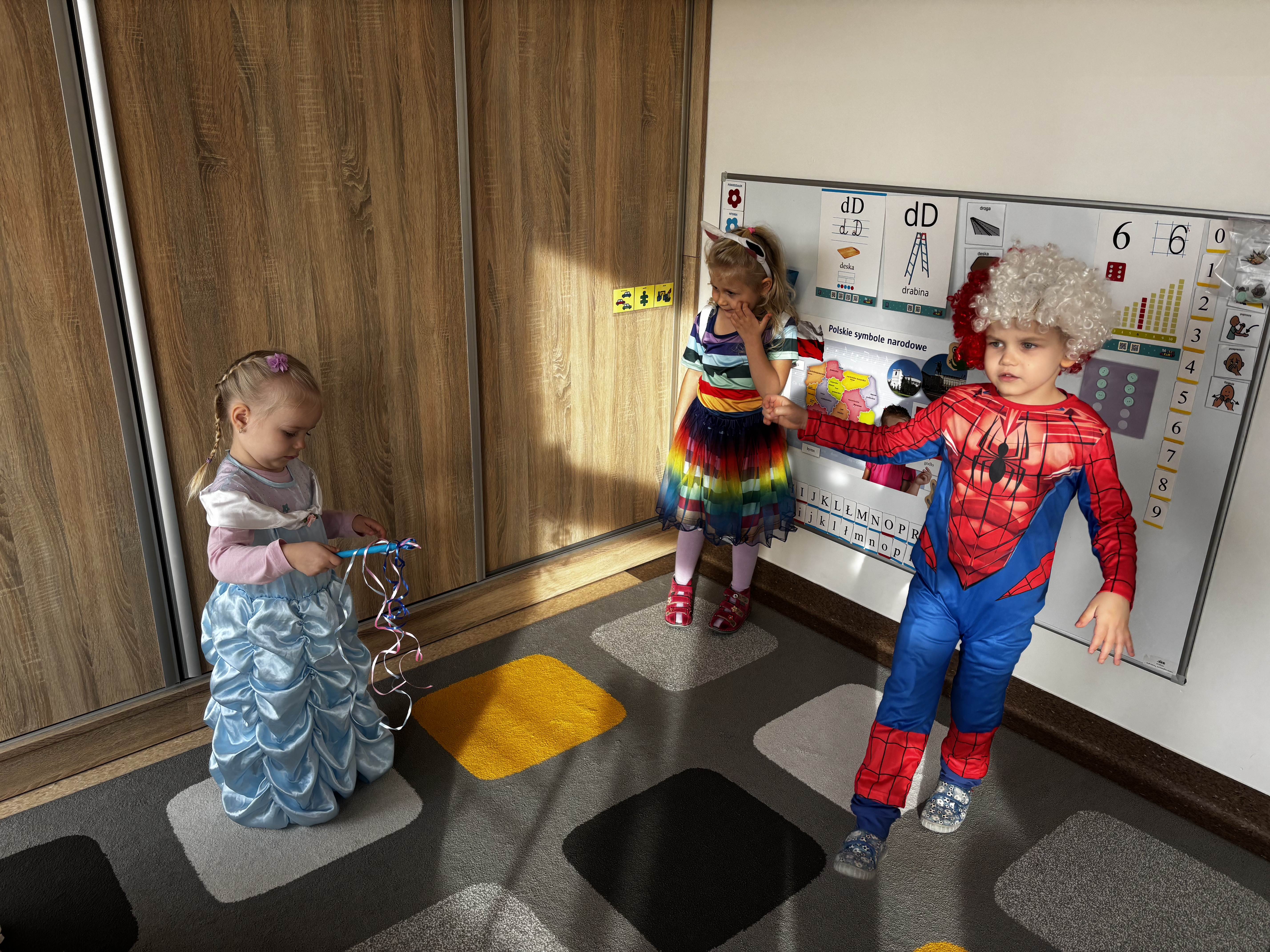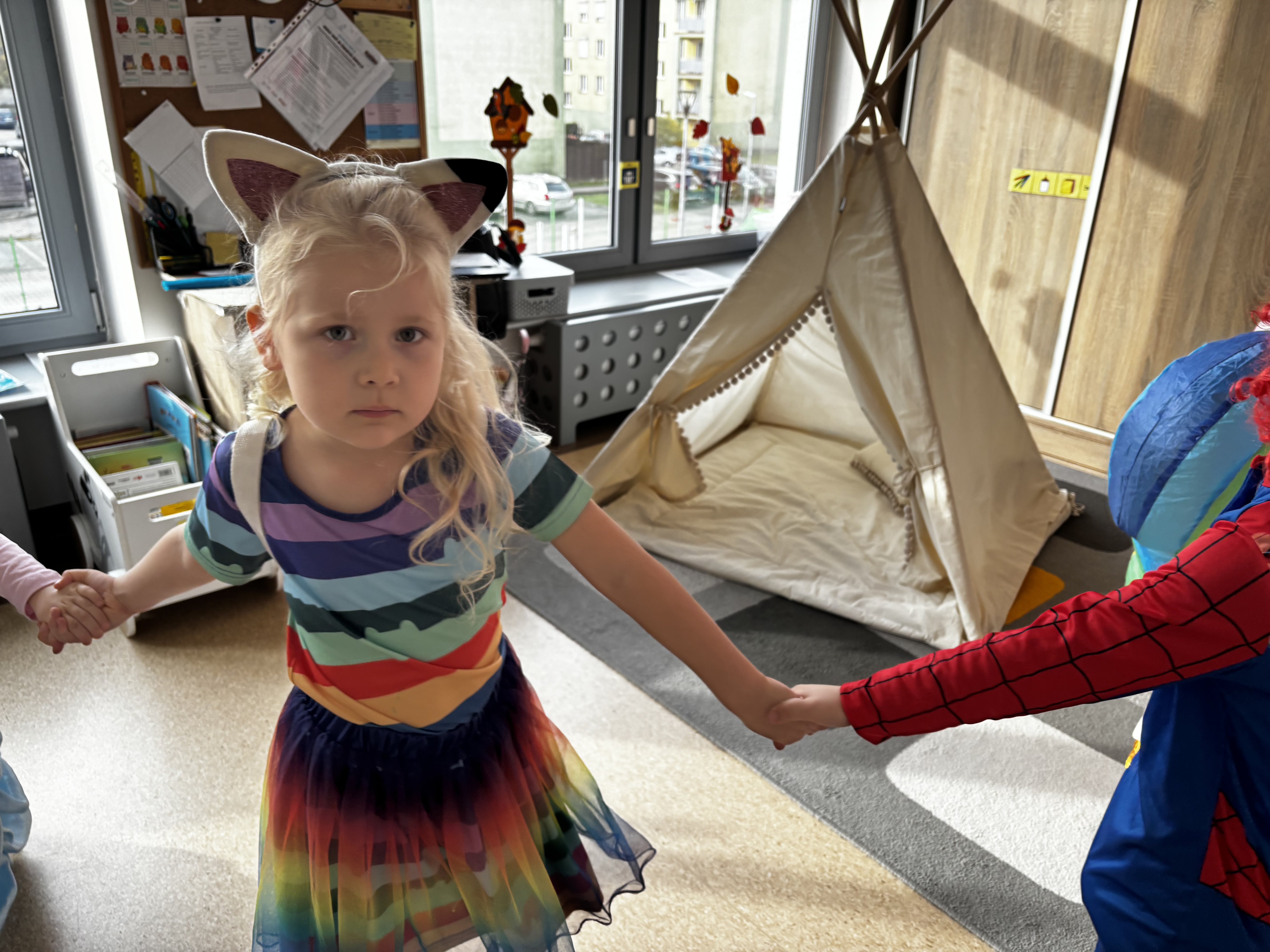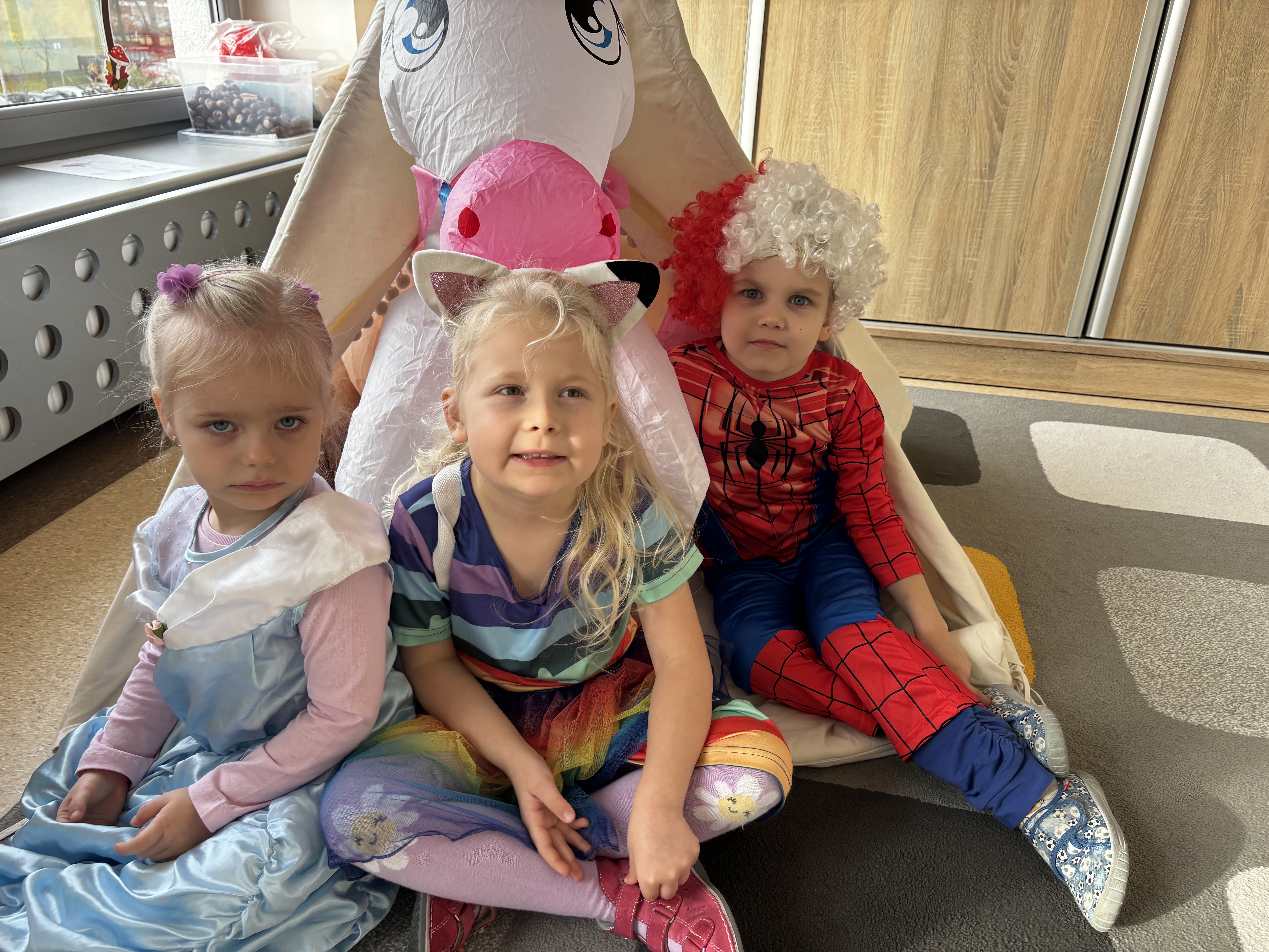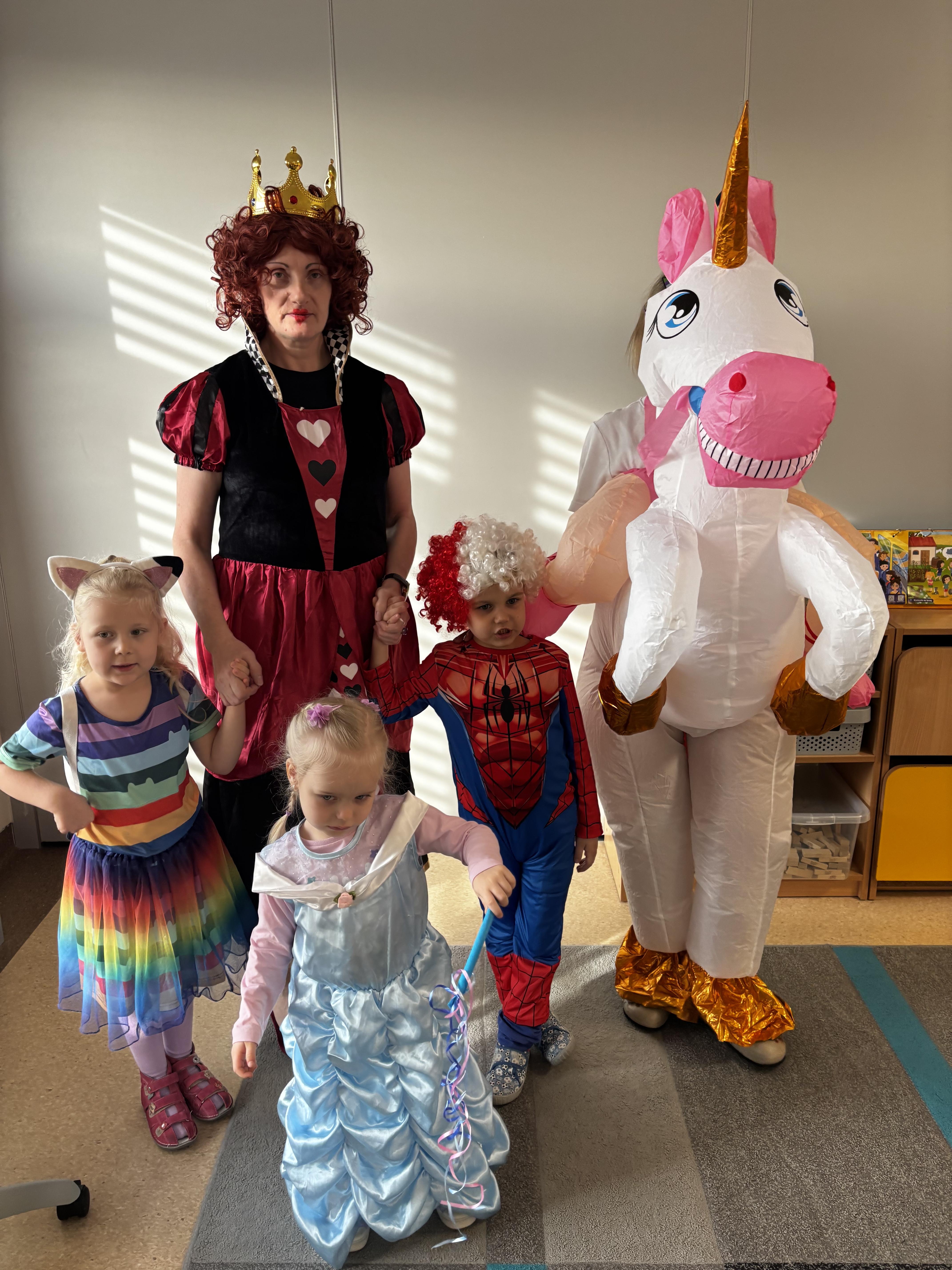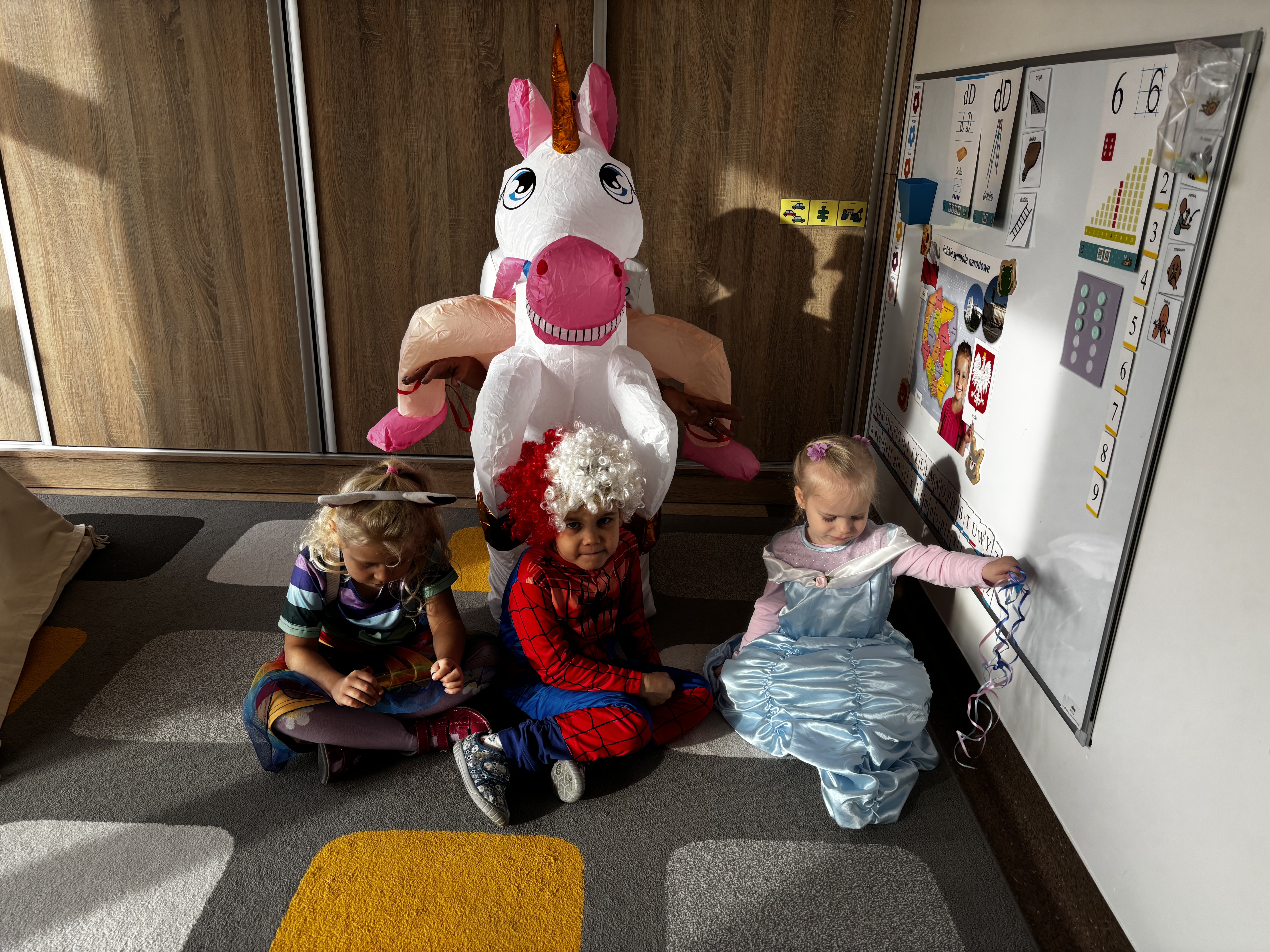 W naszej grupie obchodziliśmy Dzień Postaci z Bajki w radosnej i pełnej uśmiechów atmosferze. Tańce, muzyka i wspólna zabawa sprawiły, że każdy poczuł się jak w zaczarowanej krainie. Jednorożec roztańczył naszą trójeczkę Sówek i zaprosił do wspólnego pląsania. Spotkaliśmy również Królową Kier, z którą zrobiliśmy sobie pamiątkowe zdjęcia. A po wszystkich bajkowych przeżyciach wybraliśmy się na wspaniały, jesienny spacer:)