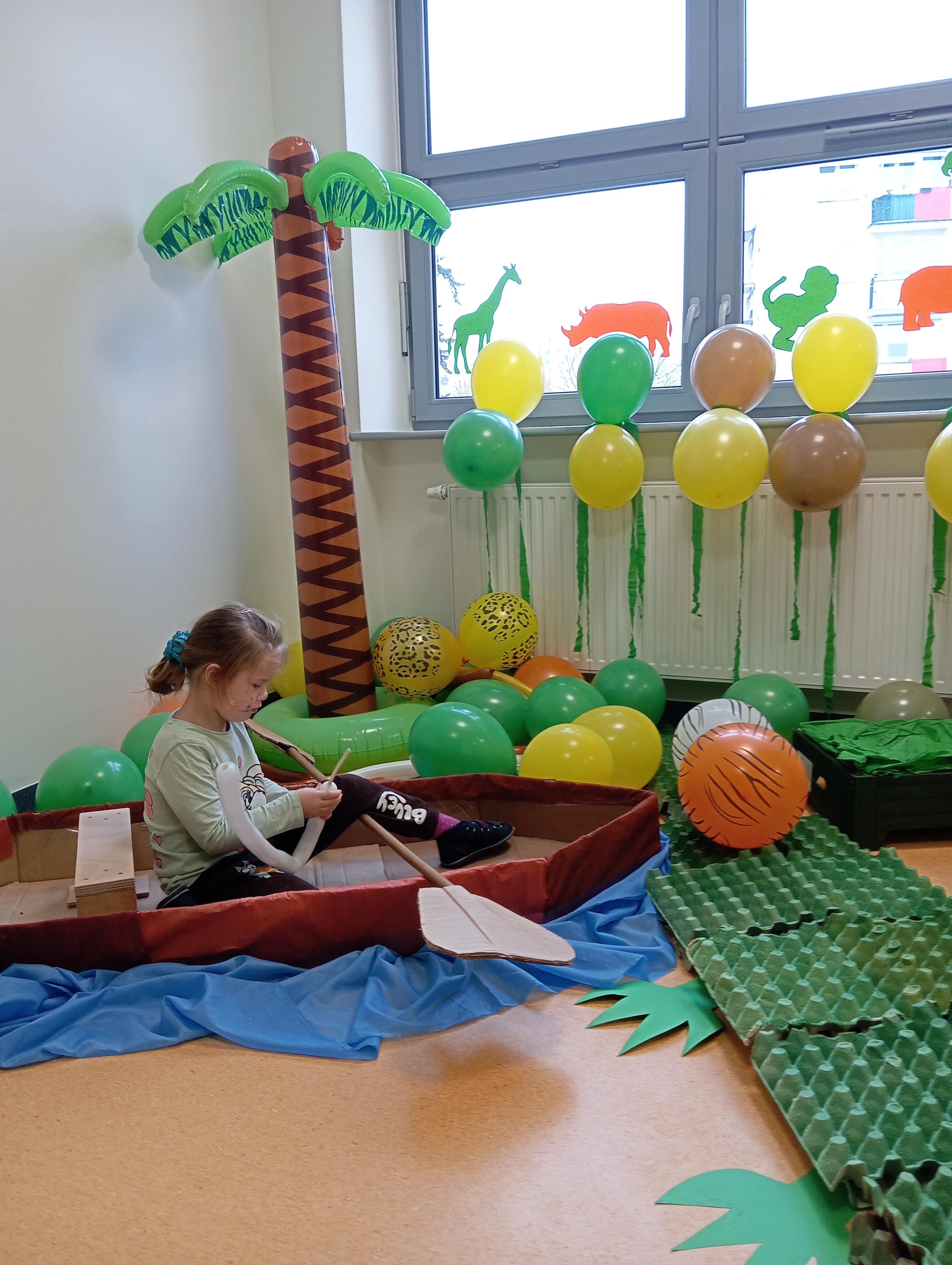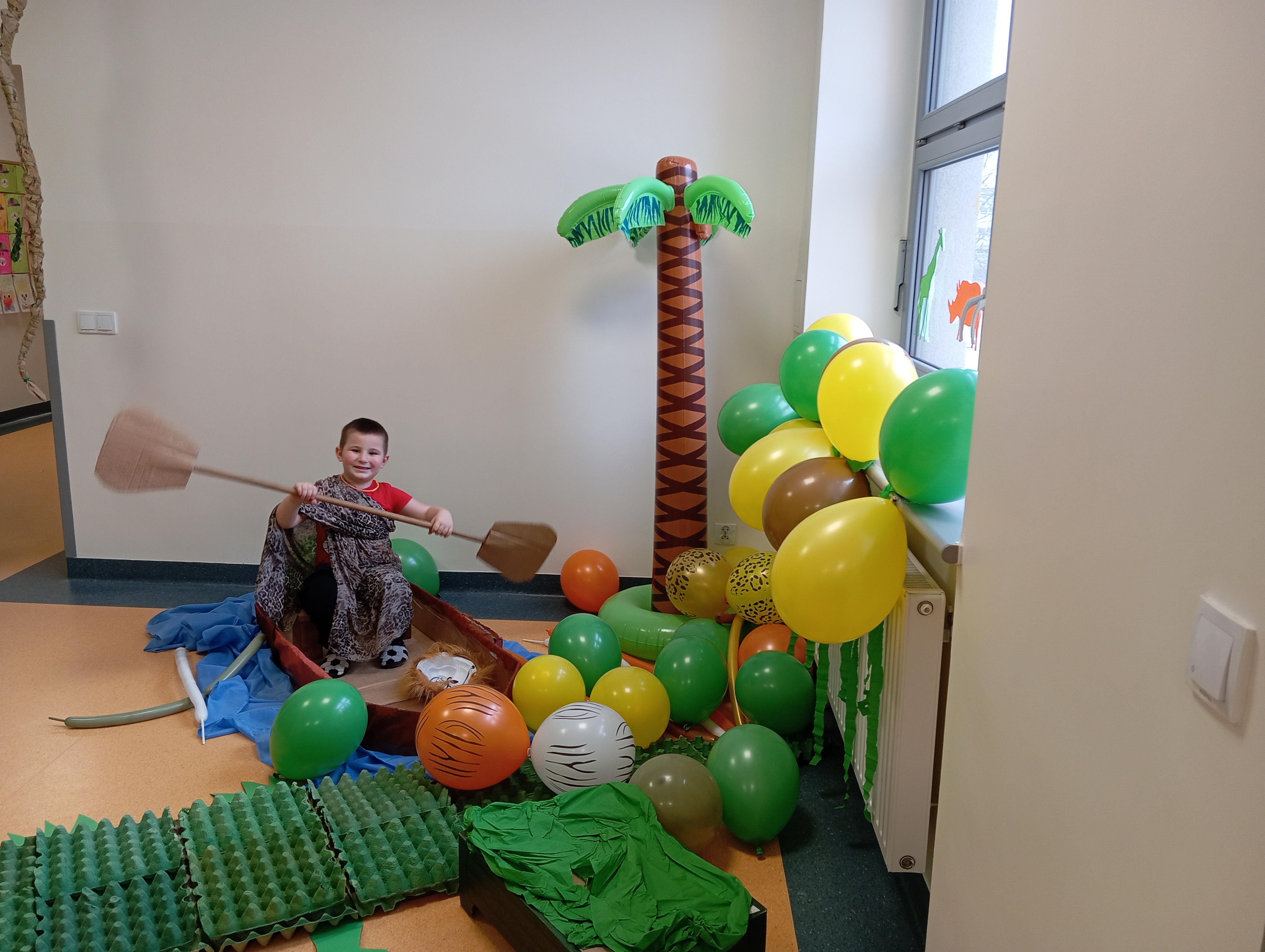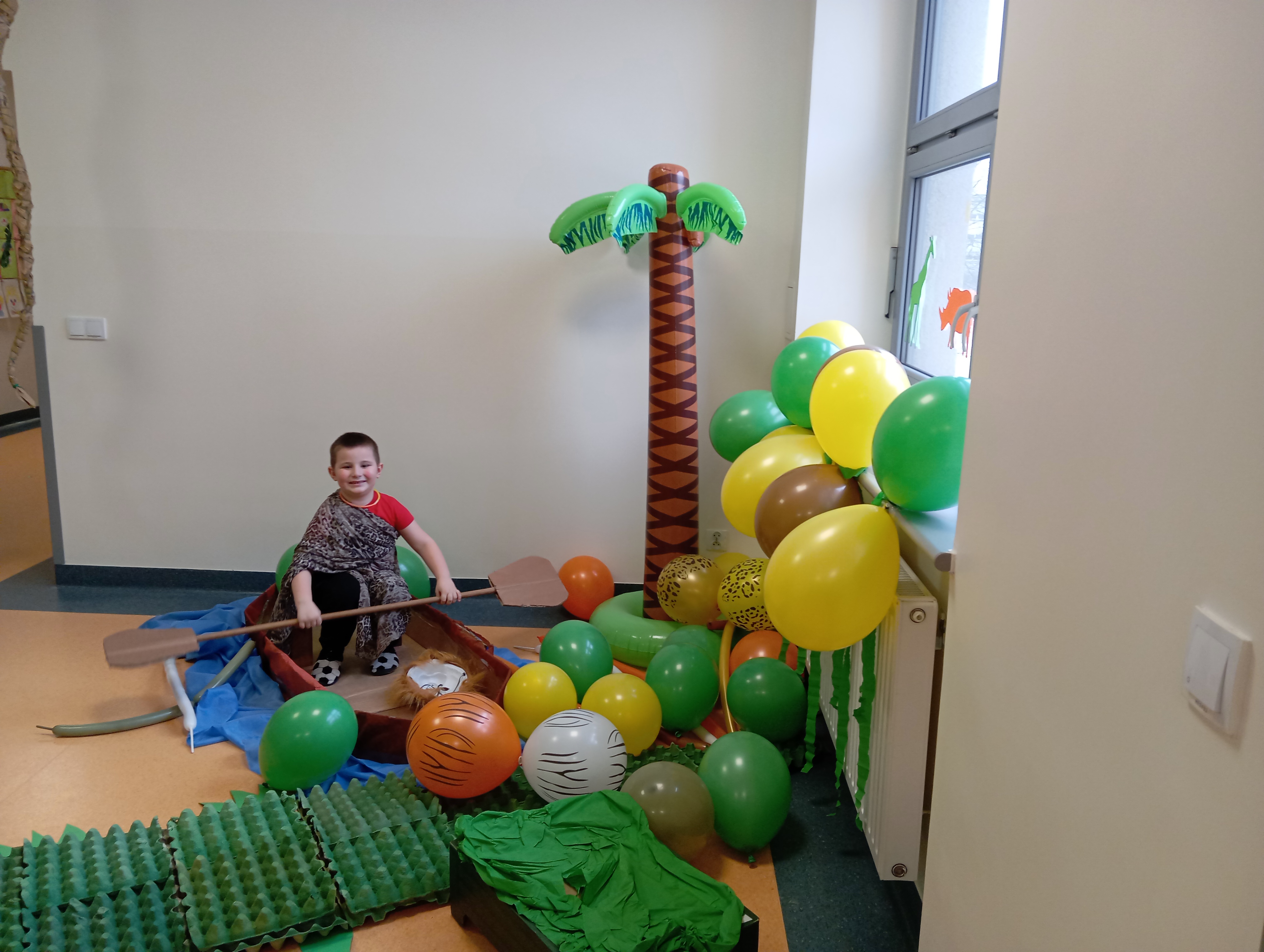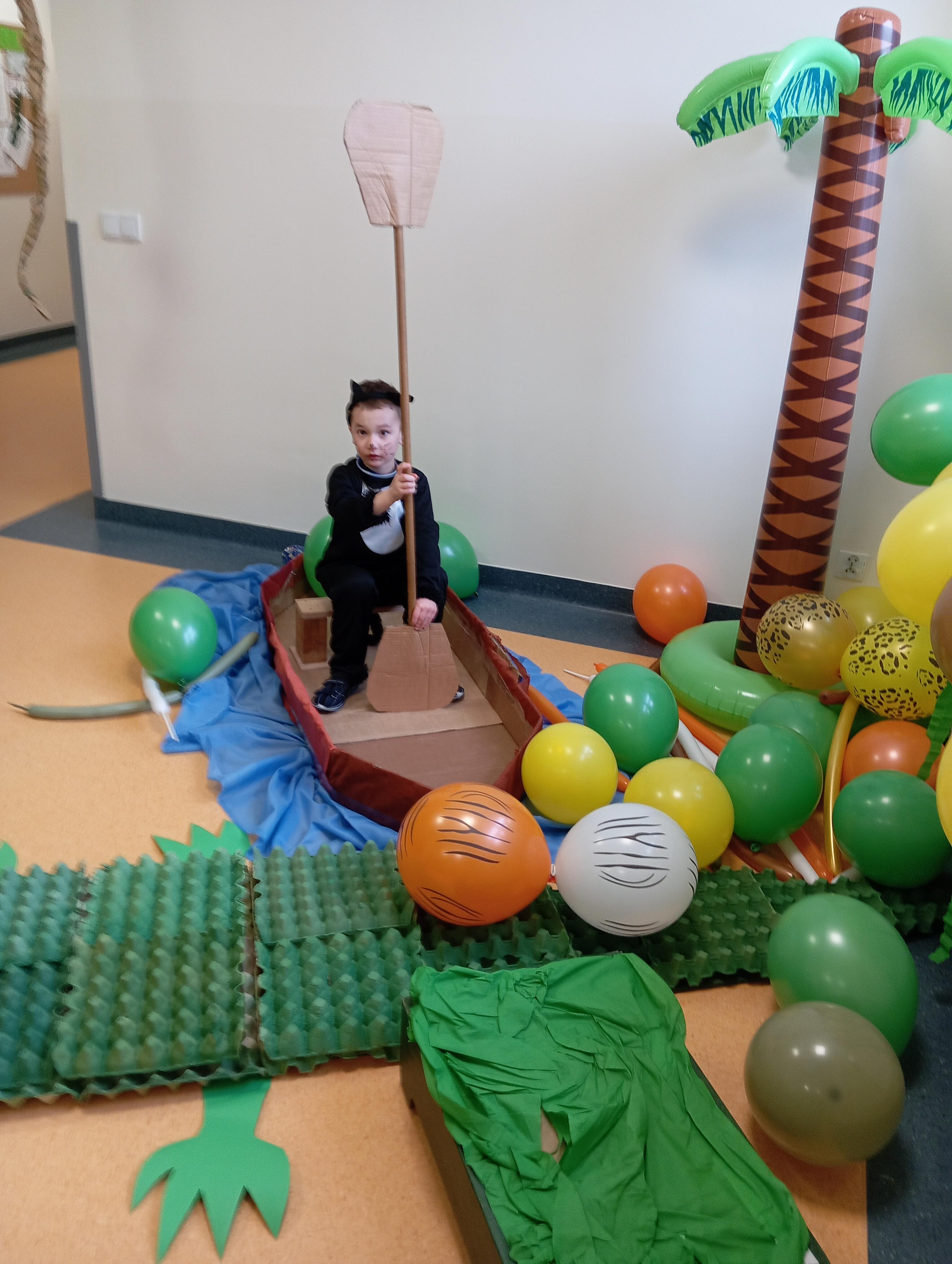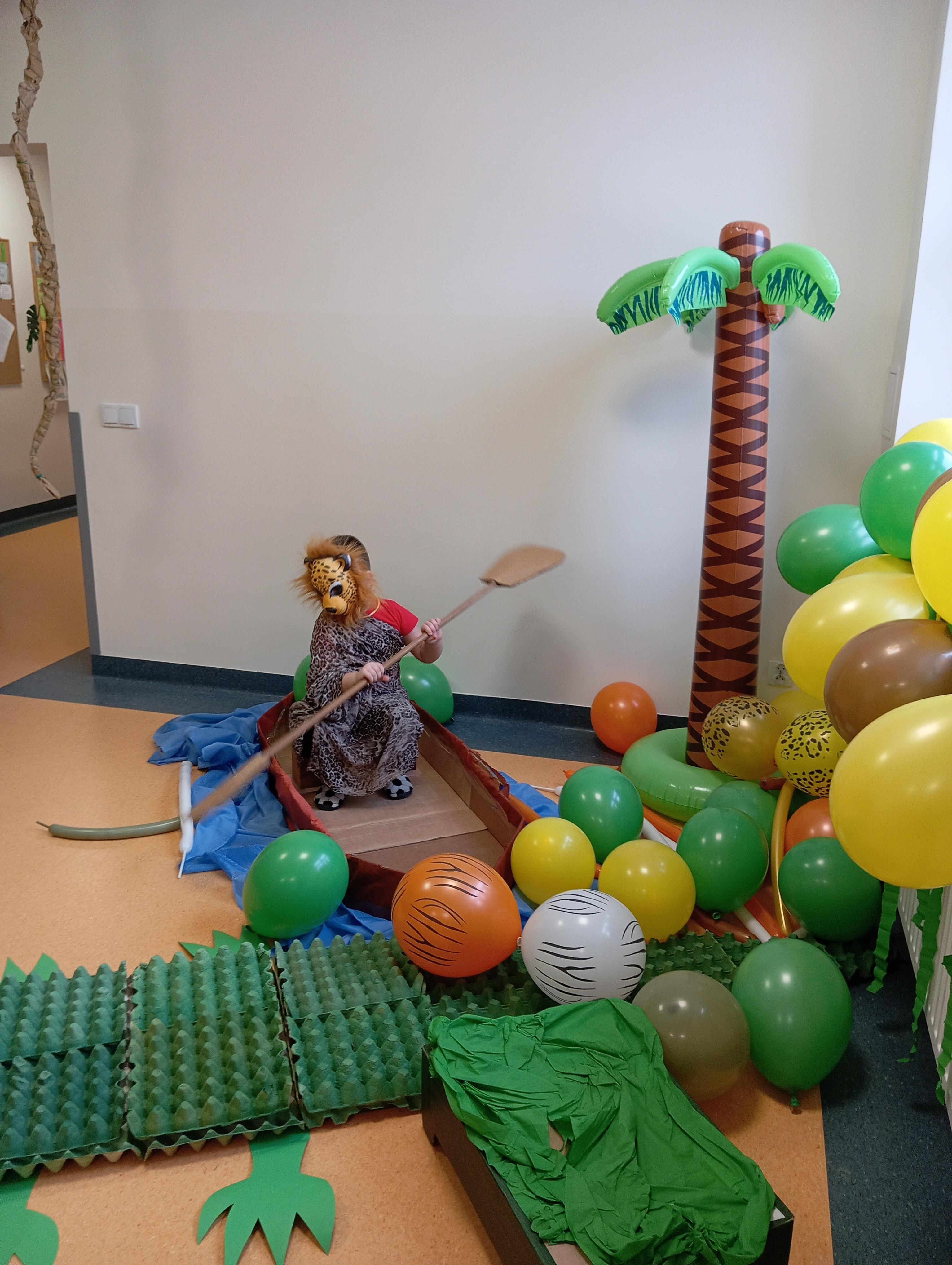 W tym roku naszym tematem przewodnim w karnawale była dżungla:) Dzień w bajkowym, egzotycznym klimacie rozpoczęliśmy od zabaw ruchowych. Po rozgrzewce wybraliśmy się na wspólne zabawy taneczne. Po drodze czuliśmy się jak podróżnicy, ponieważ korytarze naszego przedszkola zamieniły się w prawdziwą, tropikalną dżunglę:)