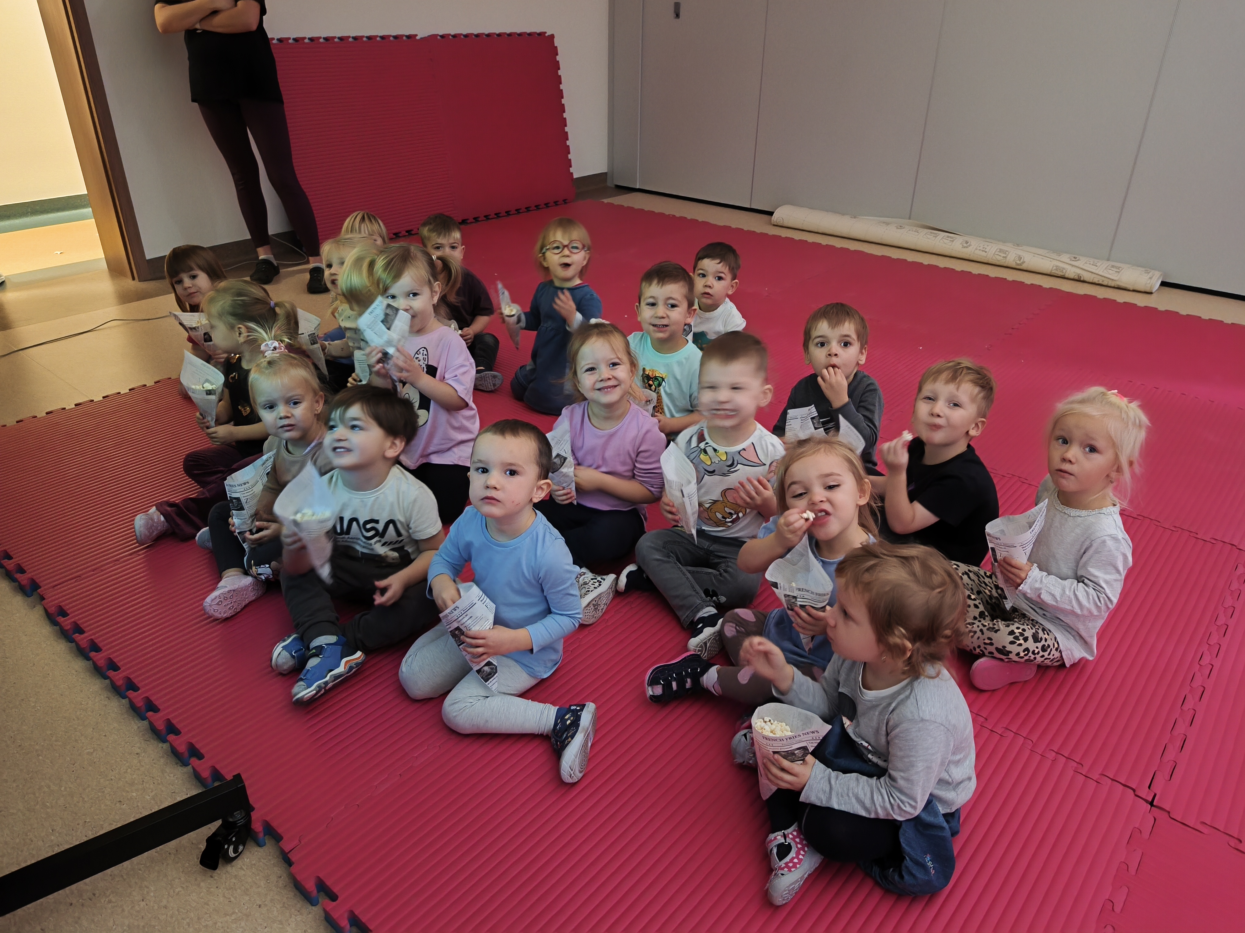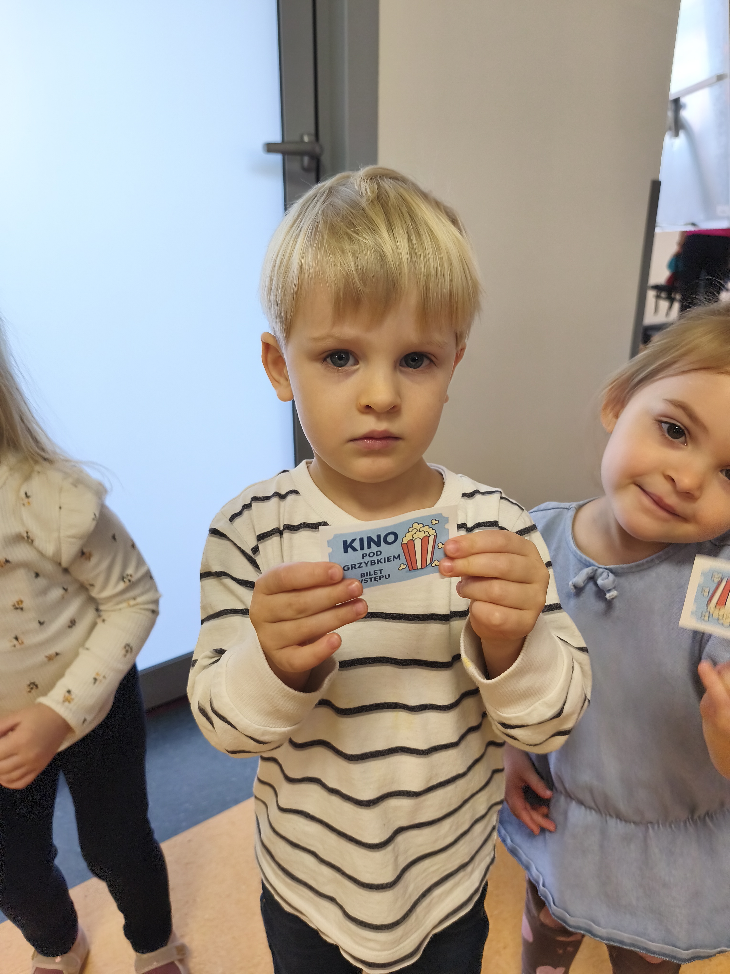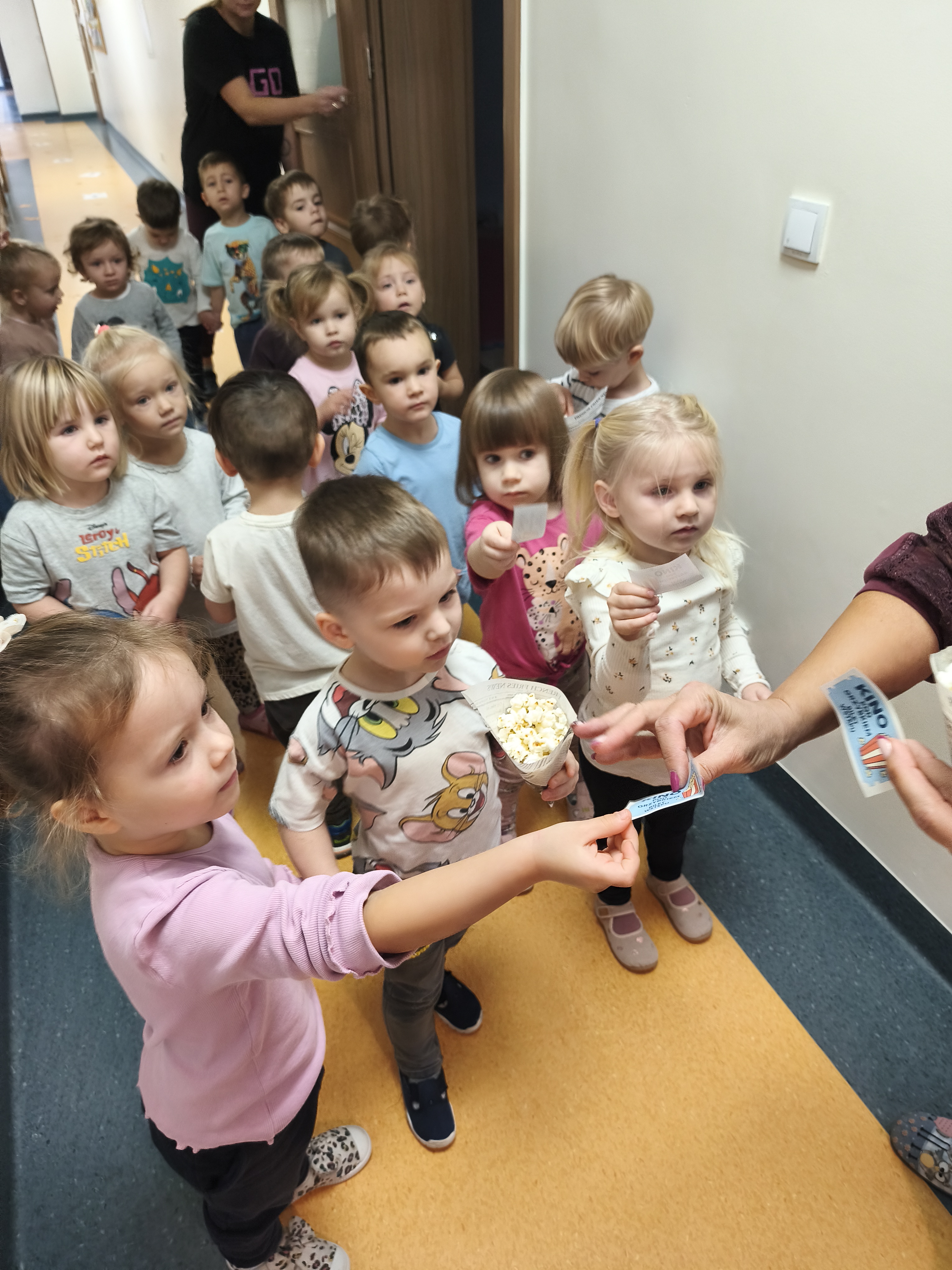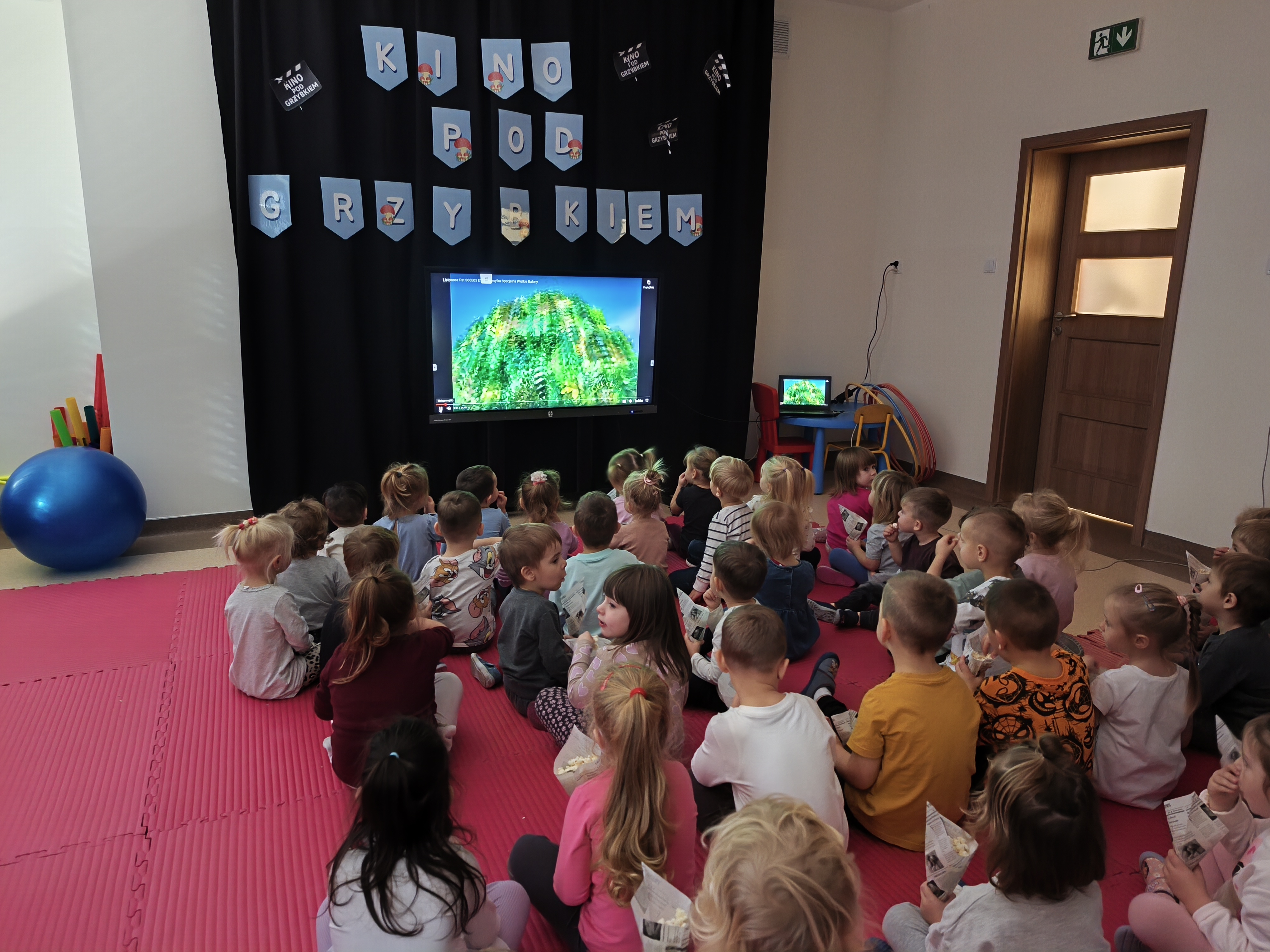 Pani Honorata i Pani Ania przygotowały dla wszystkich przedszkolaków " Kino Pod Grzybkiem". Każdy posiadacz biletu wstępu mógł przejść " Aleją Gwiazd" na końcu której stała ogromna maszyna do popcornu. Zaopatrzeni w kinową przekąskę mogliśmy zająć miejsca najbliżej ekranu. Po seansie udaliśmy się do swojej sali. Czekamy na kolejne, oscarowe projekcje.