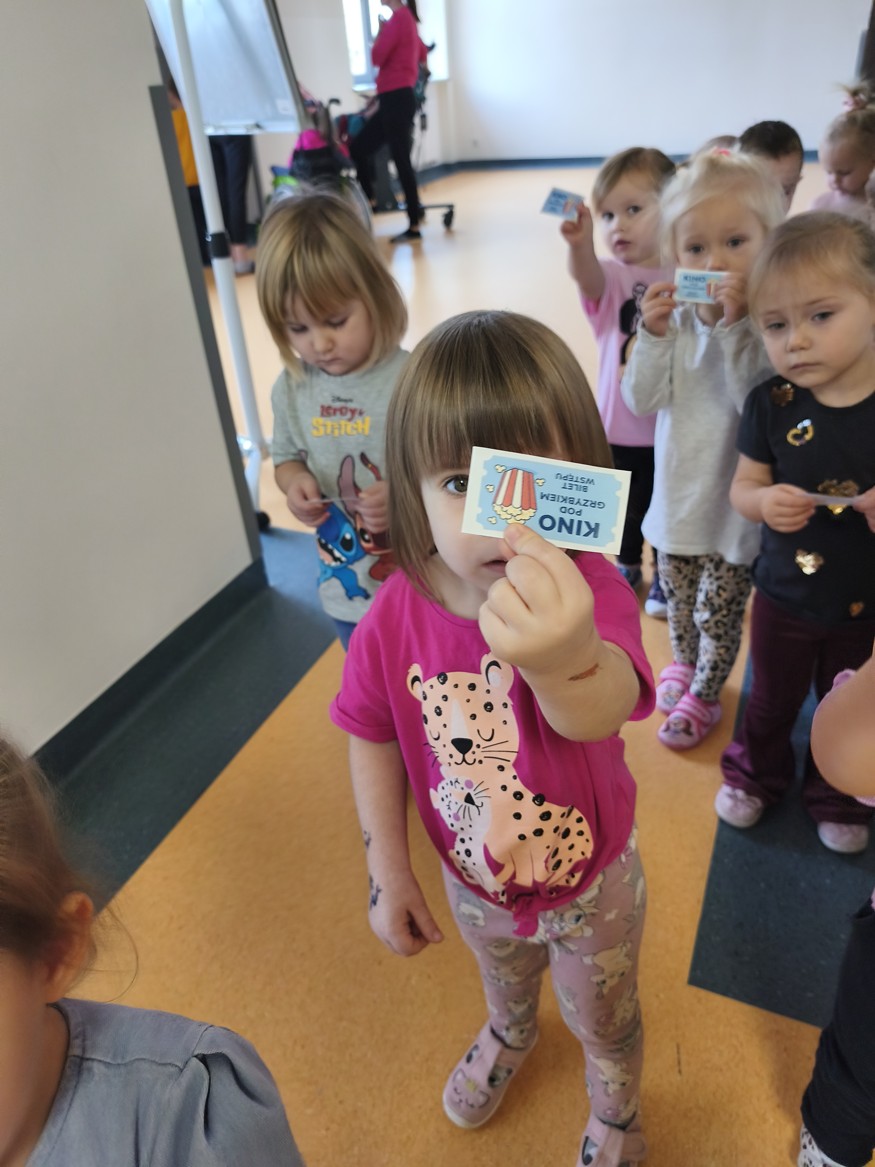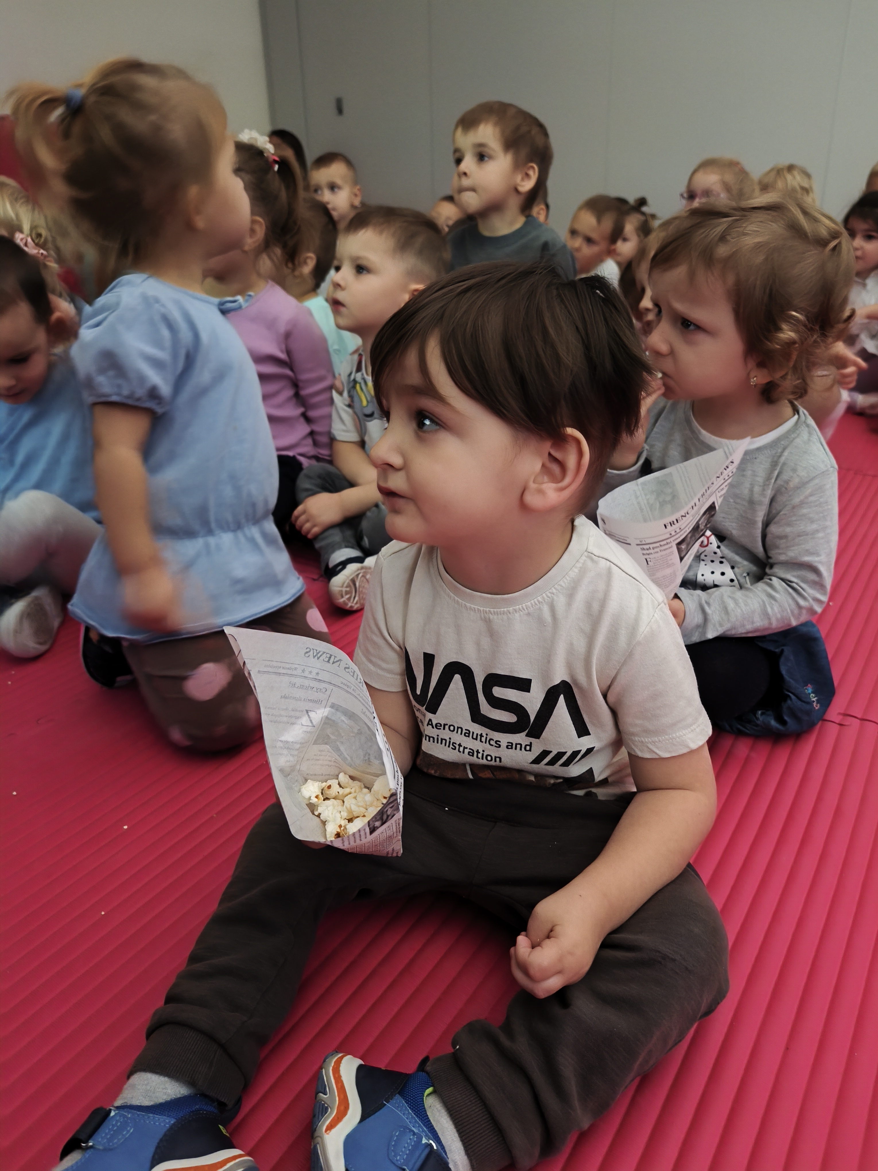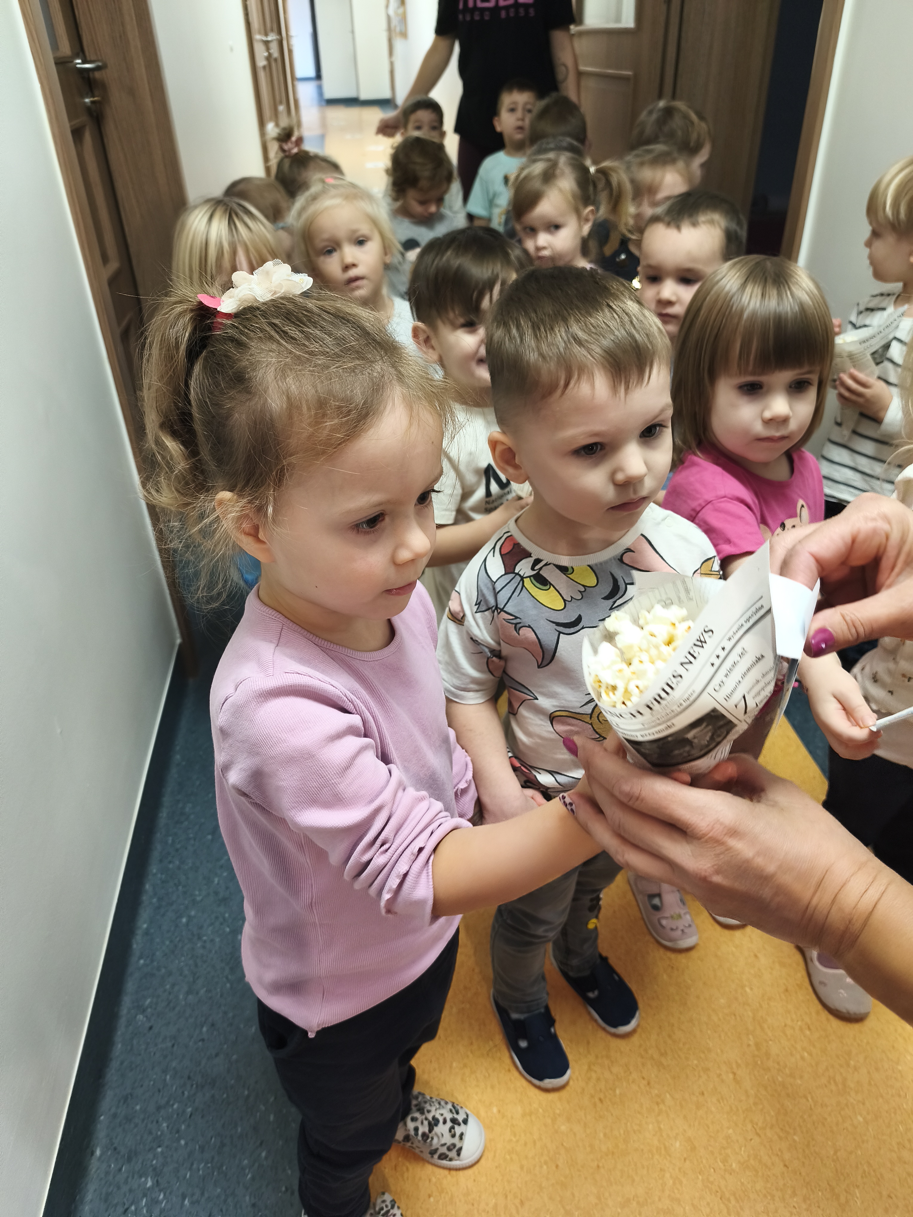 Pani Honorata i Pani Ania przygotowały dla wszystkich przedszkolaków " Kino Pod Grzybkiem". Każdy posiadacz biletu wstępu mógł przejść " Aleją Gwiazd" na końcu której stała ogromna maszyna do popcornu. Zaopatrzeni w kinową przekąskę mogliśmy zająć miejsca najbliżej ekranu. Po seansie udaliśmy się do swojej sali. Czekamy na kolejne, oscarowe projekcje.