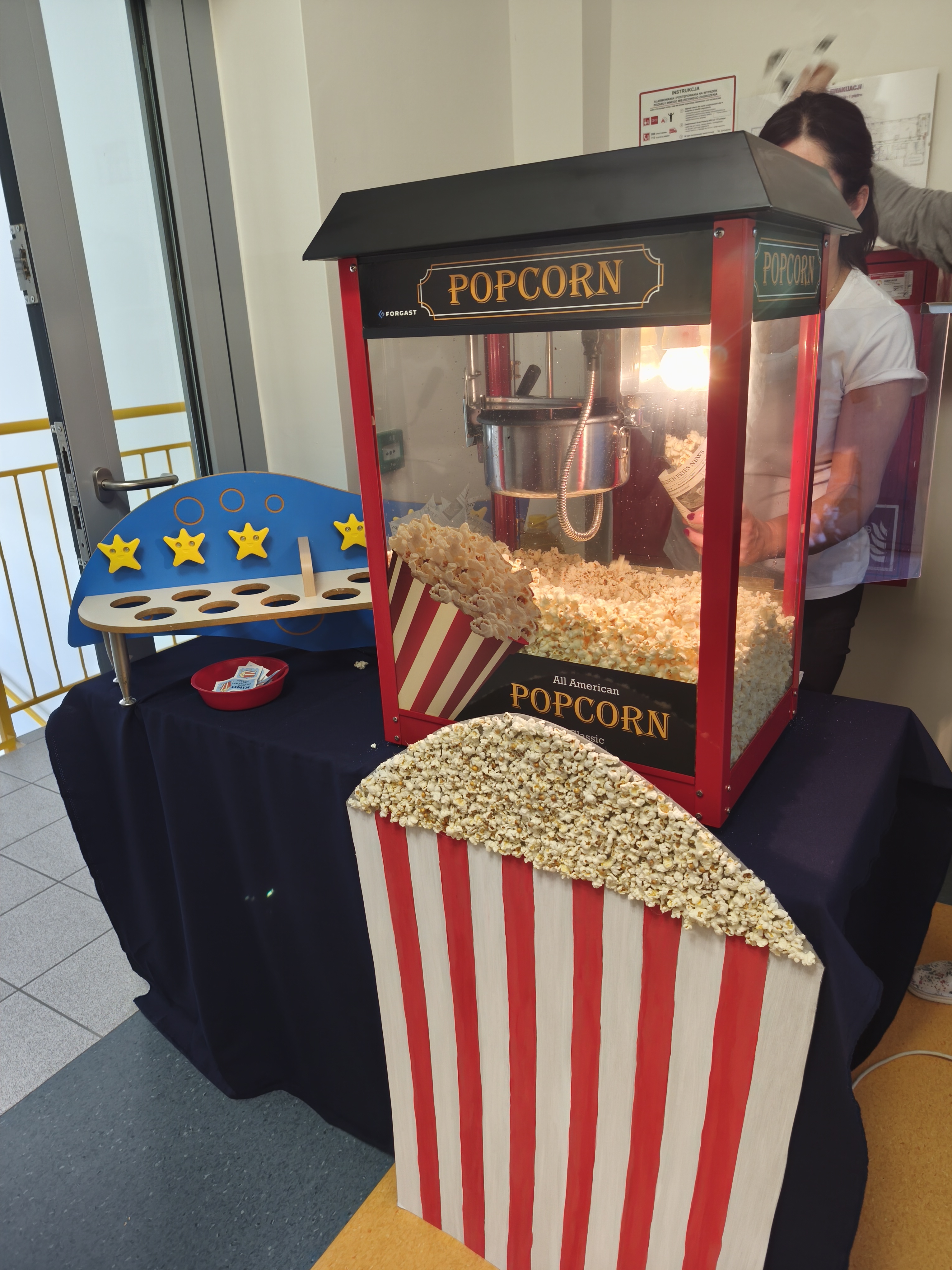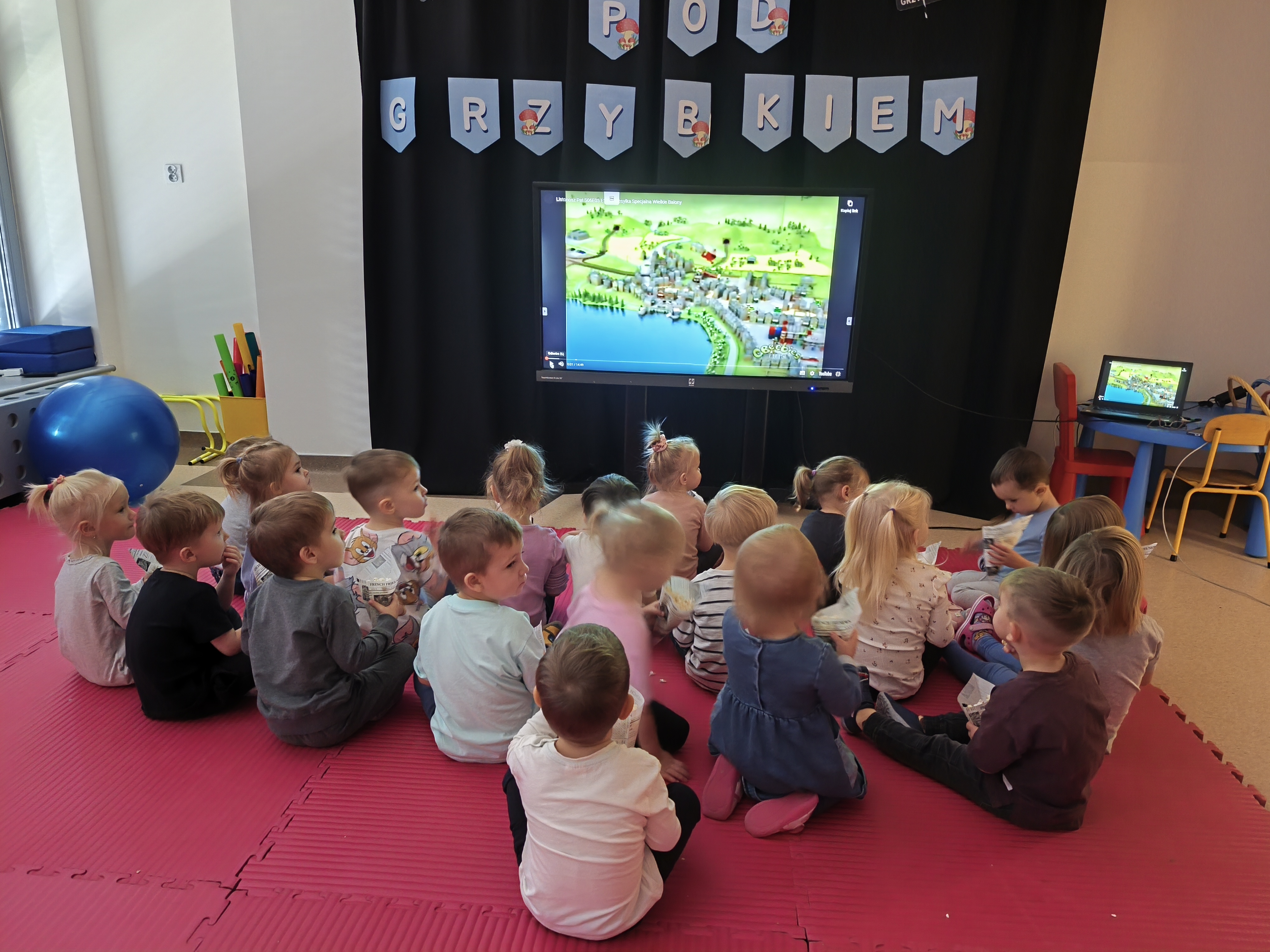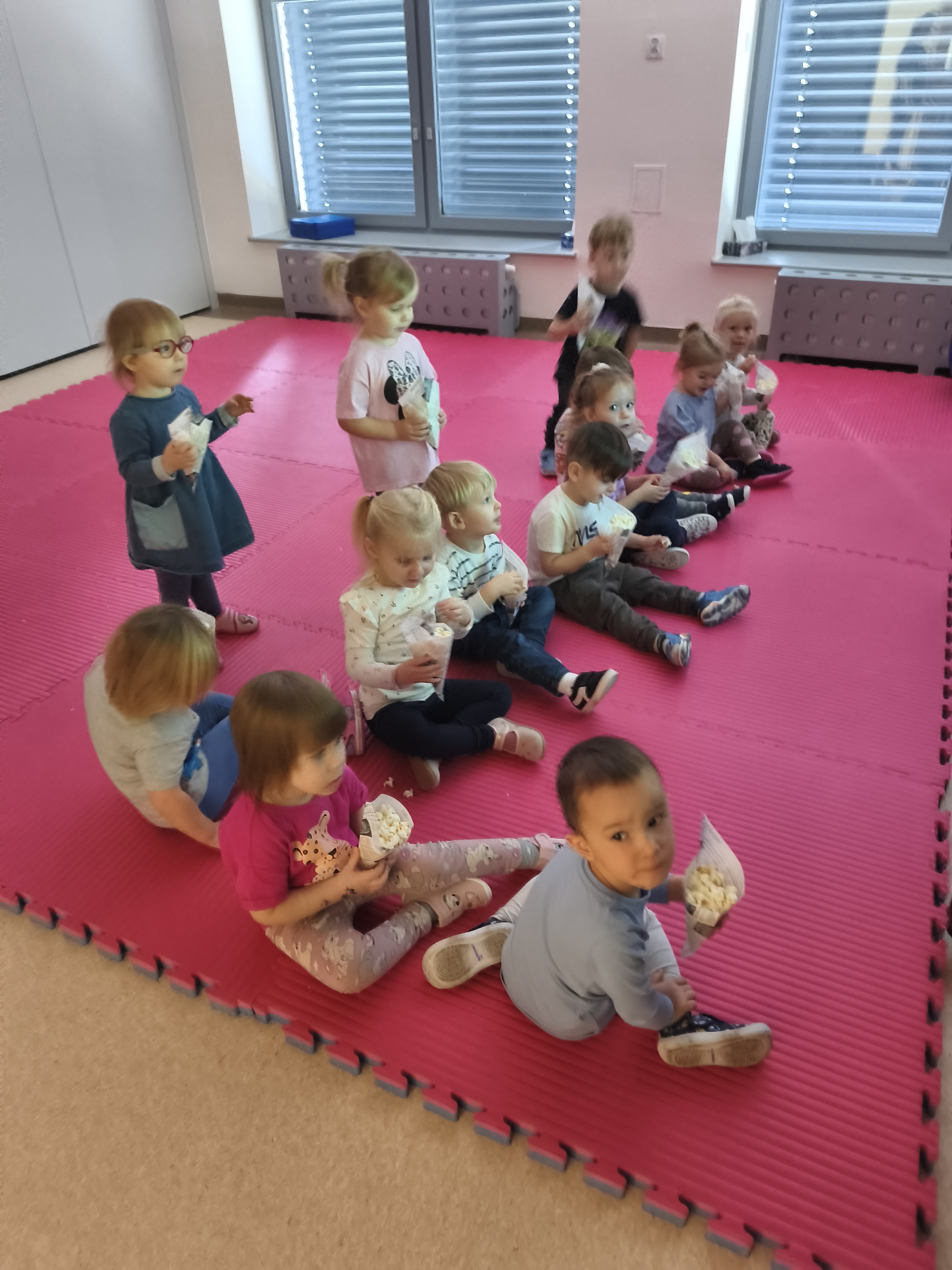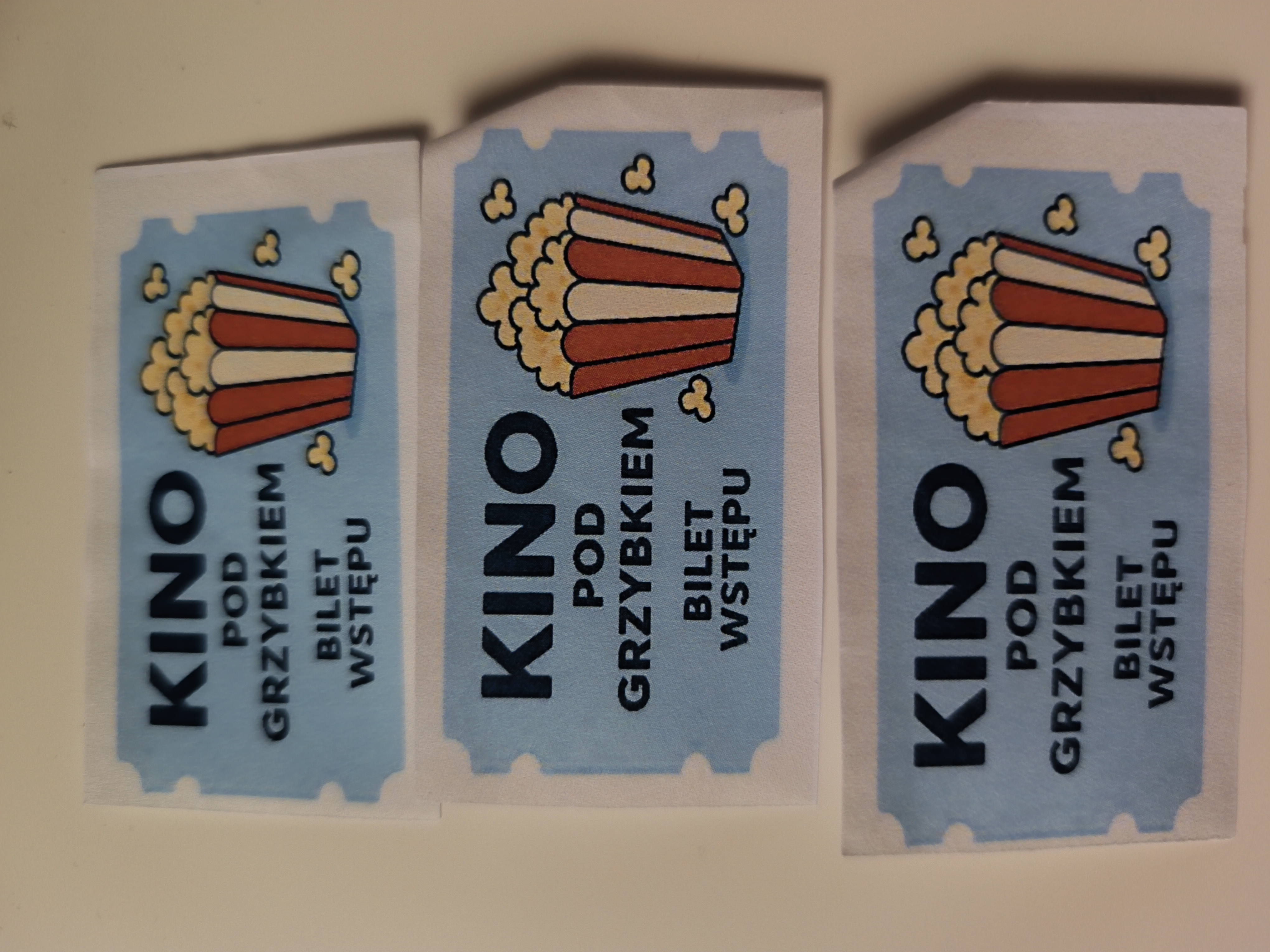 Pani Honorata i Pani Ania przygotowały dla wszystkich przedszkolaków " Kino Pod Grzybkiem". Każdy posiadacz biletu wstępu mógł przejść " Aleją Gwiazd" na końcu której stała ogromna maszyna do popcornu. Zaopatrzeni w kinową przekąskę mogliśmy zająć miejsca najbliżej ekranu. Po seansie udaliśmy się do swojej sali. Czekamy na kolejne, oscarowe projekcje.