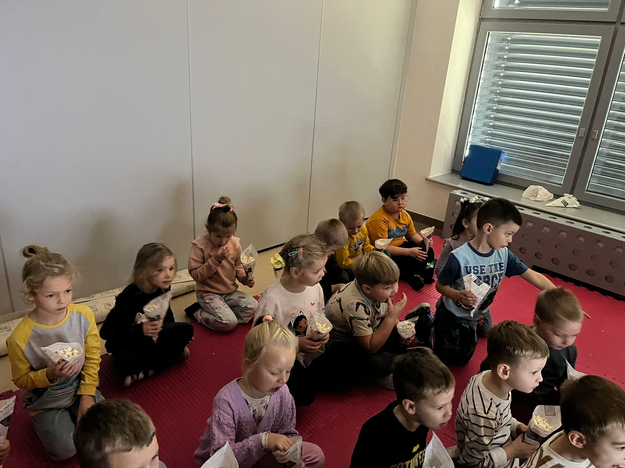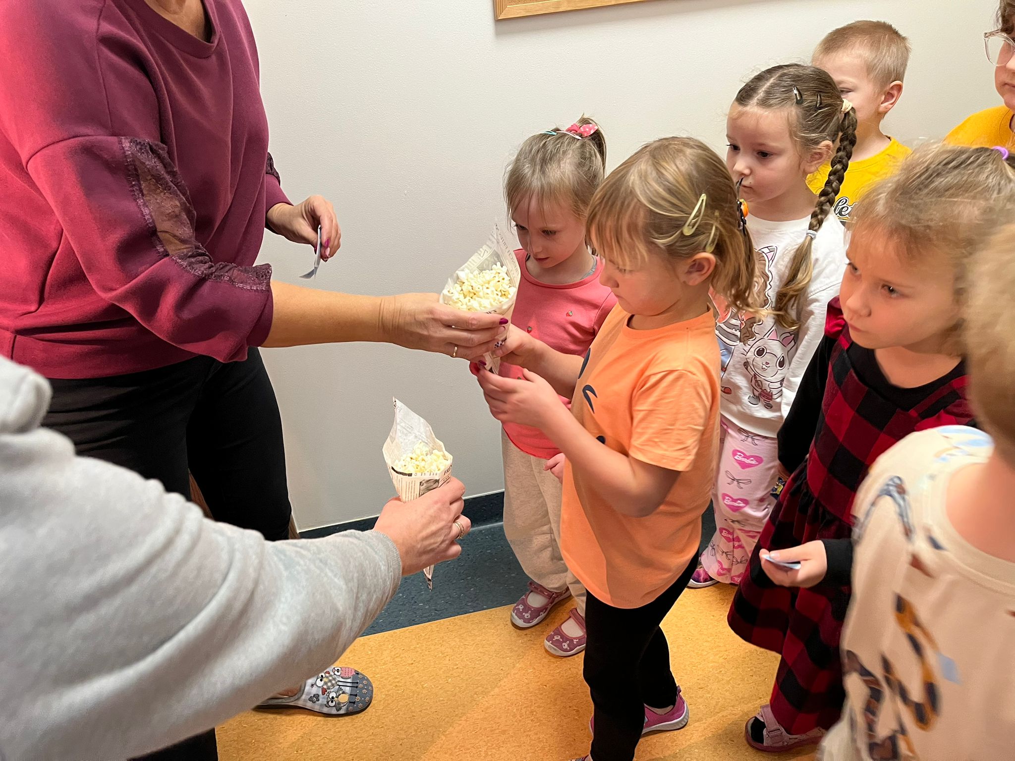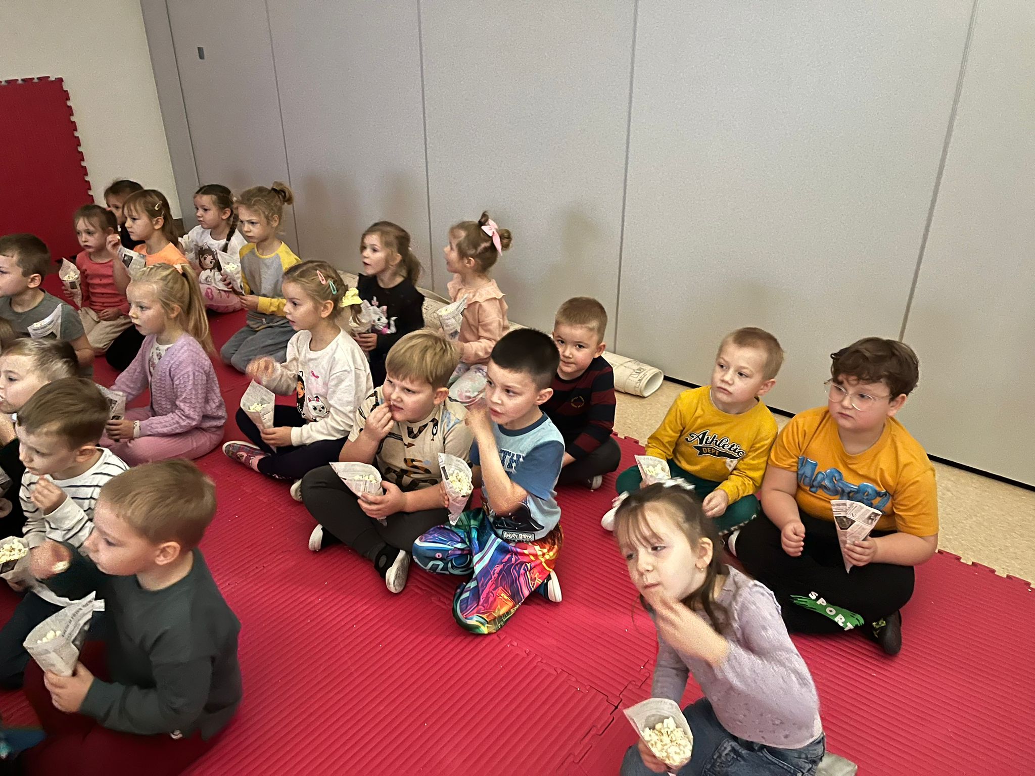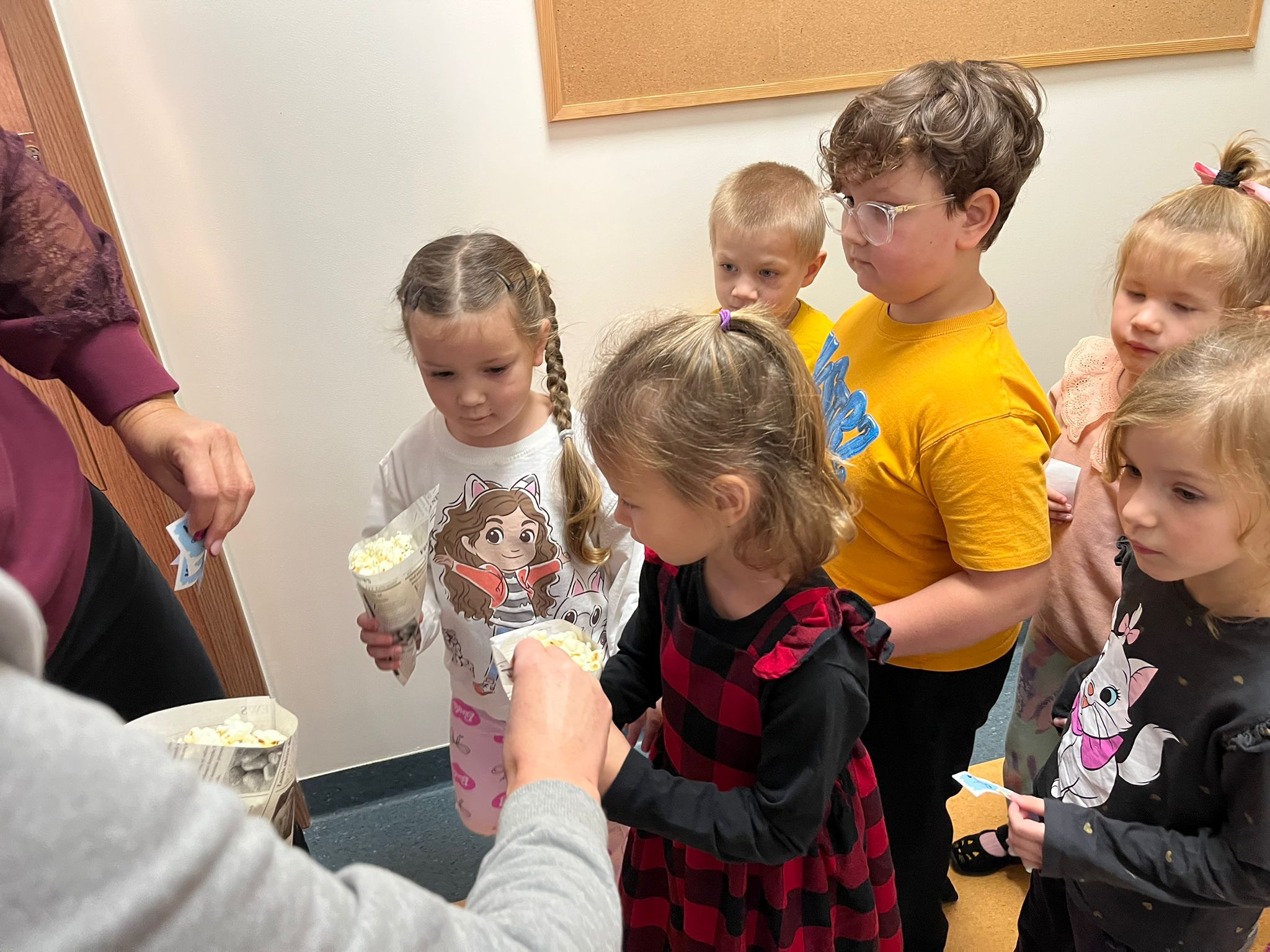 W poniedziałek dzieci otrzymały bilety wstępu do kina " Pod Grzybkiem". Każdy uczestnik po przejściu Alei Gwiazd otrzymał porcje pysznego popcornu. To był bardzo dobry początek tygodnia.