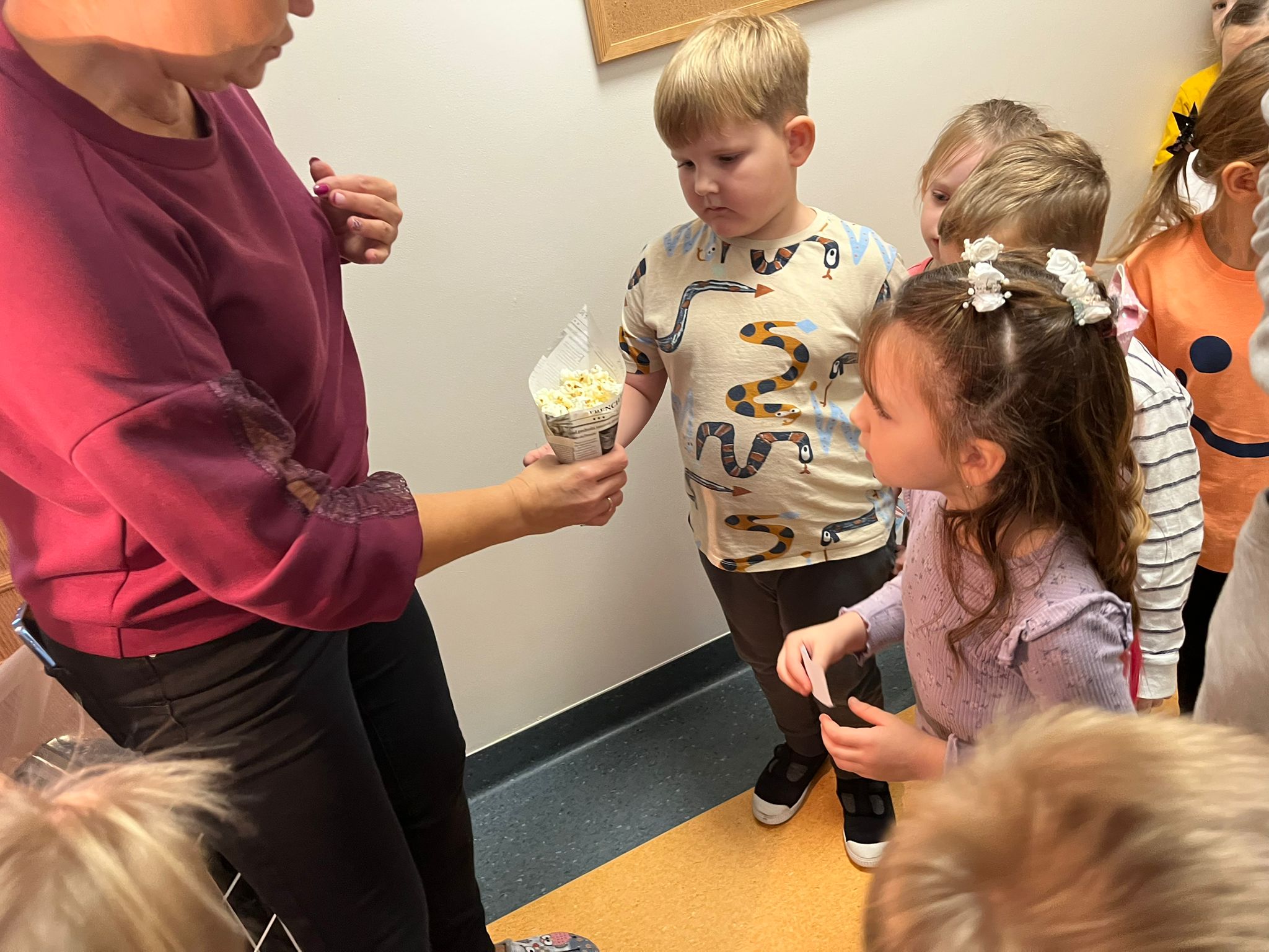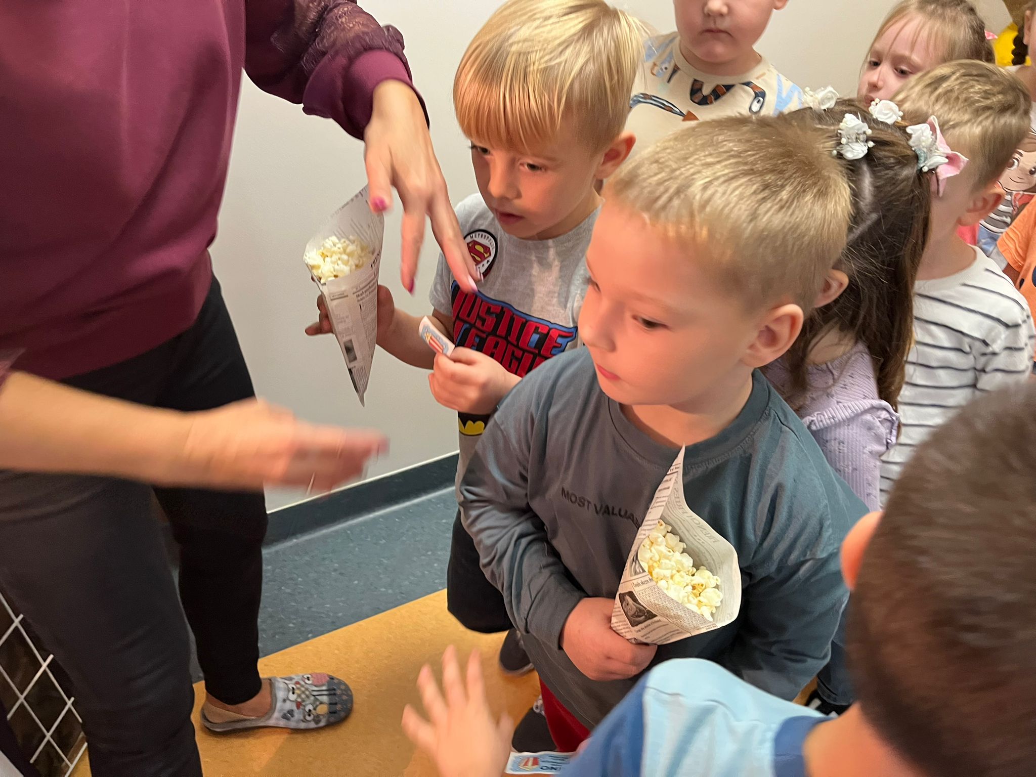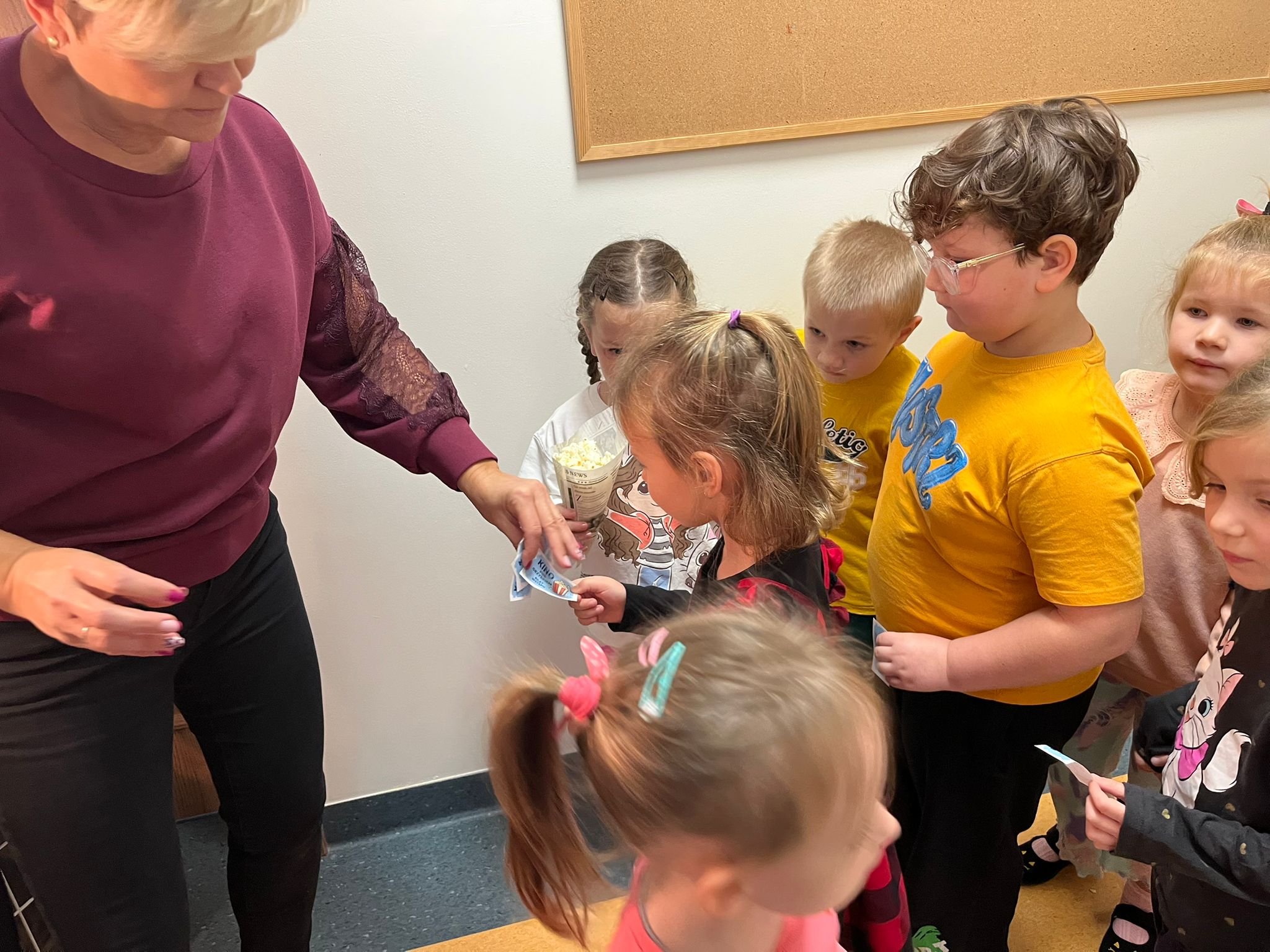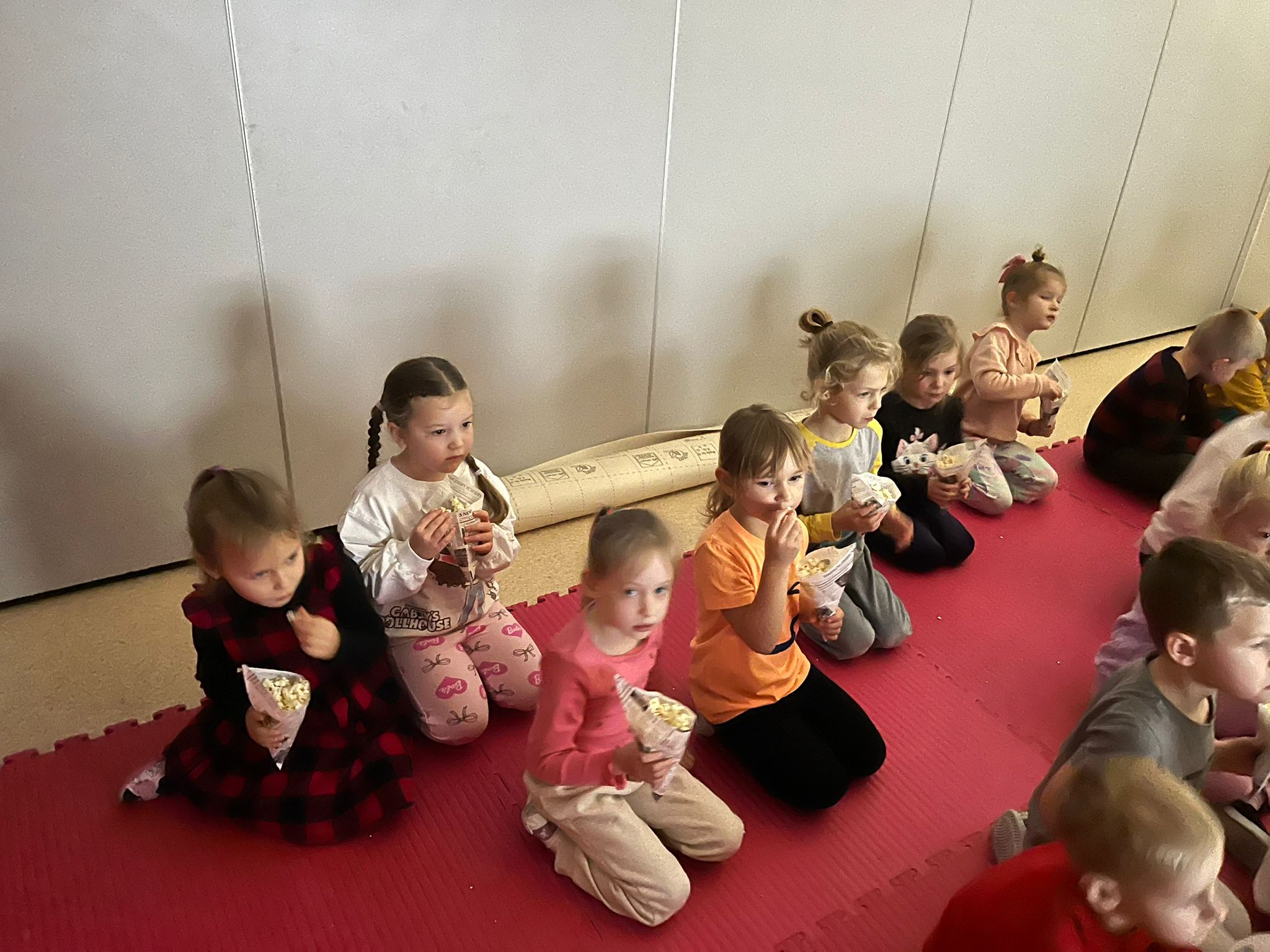 W poniedziałek dzieci otrzymały bilety wstępu do kina " Pod Grzybkiem". Każdy uczestnik po przejściu Alei Gwiazd otrzymał porcje pysznego popcornu. To był bardzo dobry początek tygodnia.