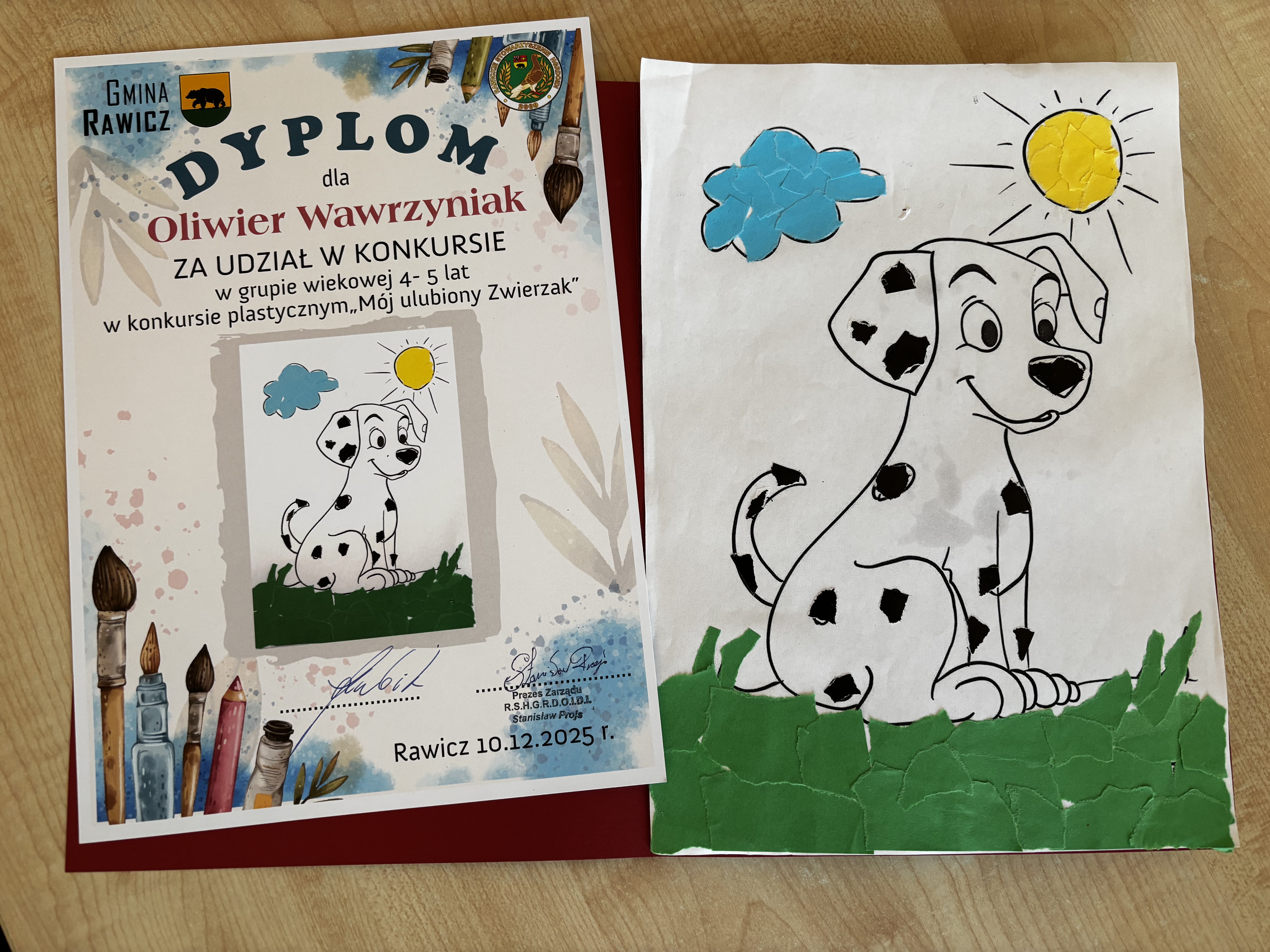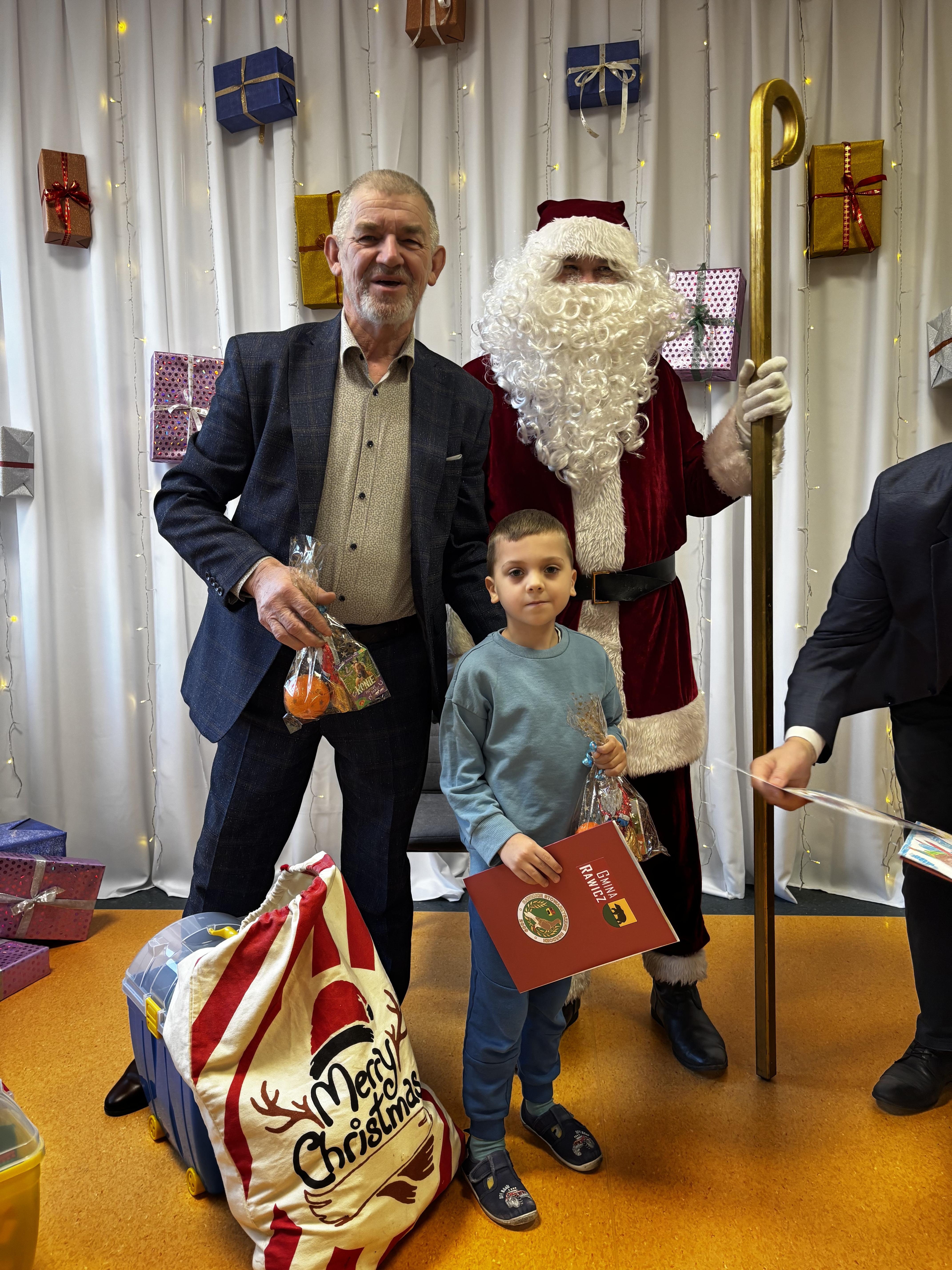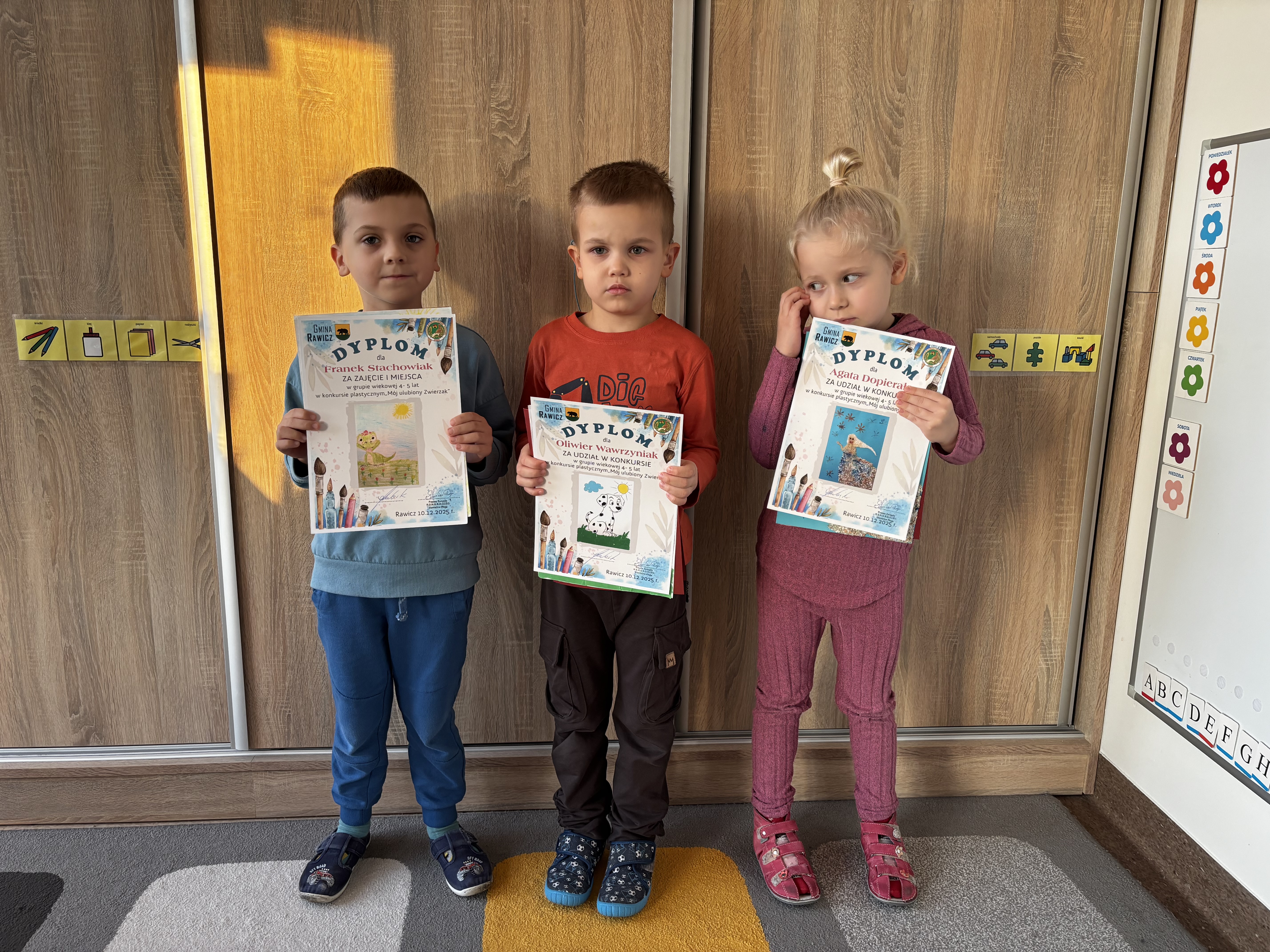 Dzieci z naszej grupy otrzymały dyplomy od Rawickiego Stowarzyszenia Hodowców Gołębi Rasowych, Drobiu Ozdobnego i Drobnego Inwentarza za udział w konkursie „Mój ulubiony zwierzak”. W naszej grupie nagrodzeni zostali: Agatka, Franek oraz Oliwier. Prezenty wręczał Mikołaj, który obiecał, że odwiedzi również naszego Cezarego – obecnie ucznia pierwszej klasy. Uroczyste wręczenie nagród odbyło się w obecności Pani Dyrektor przedszkola, Prezesa Stowarzyszenia oraz Burmistrza Rawicza. Dzieci otrzymały także słodkie upominki. Odwiedziny były dla dzieci miłym zaskoczeniem:)