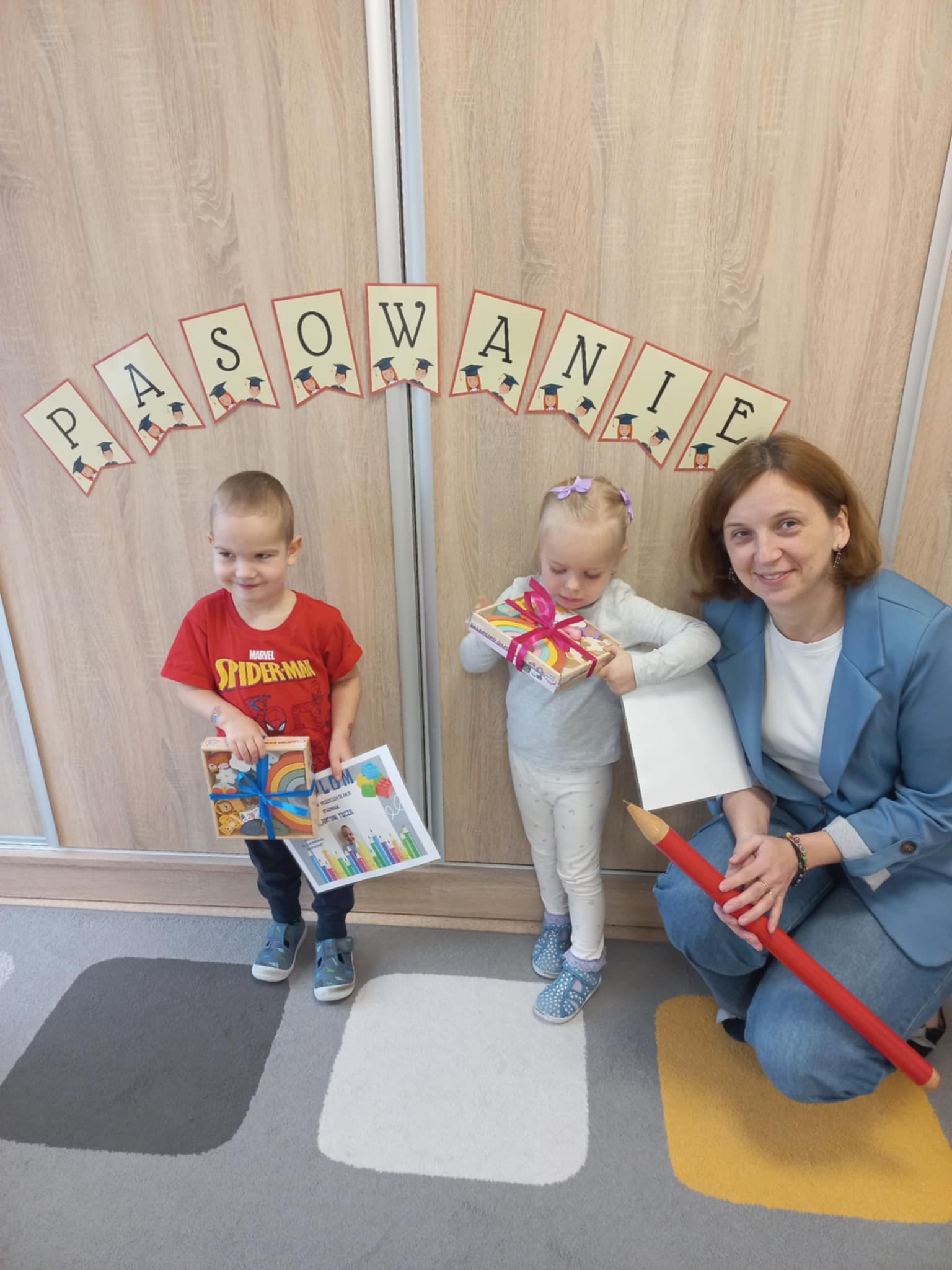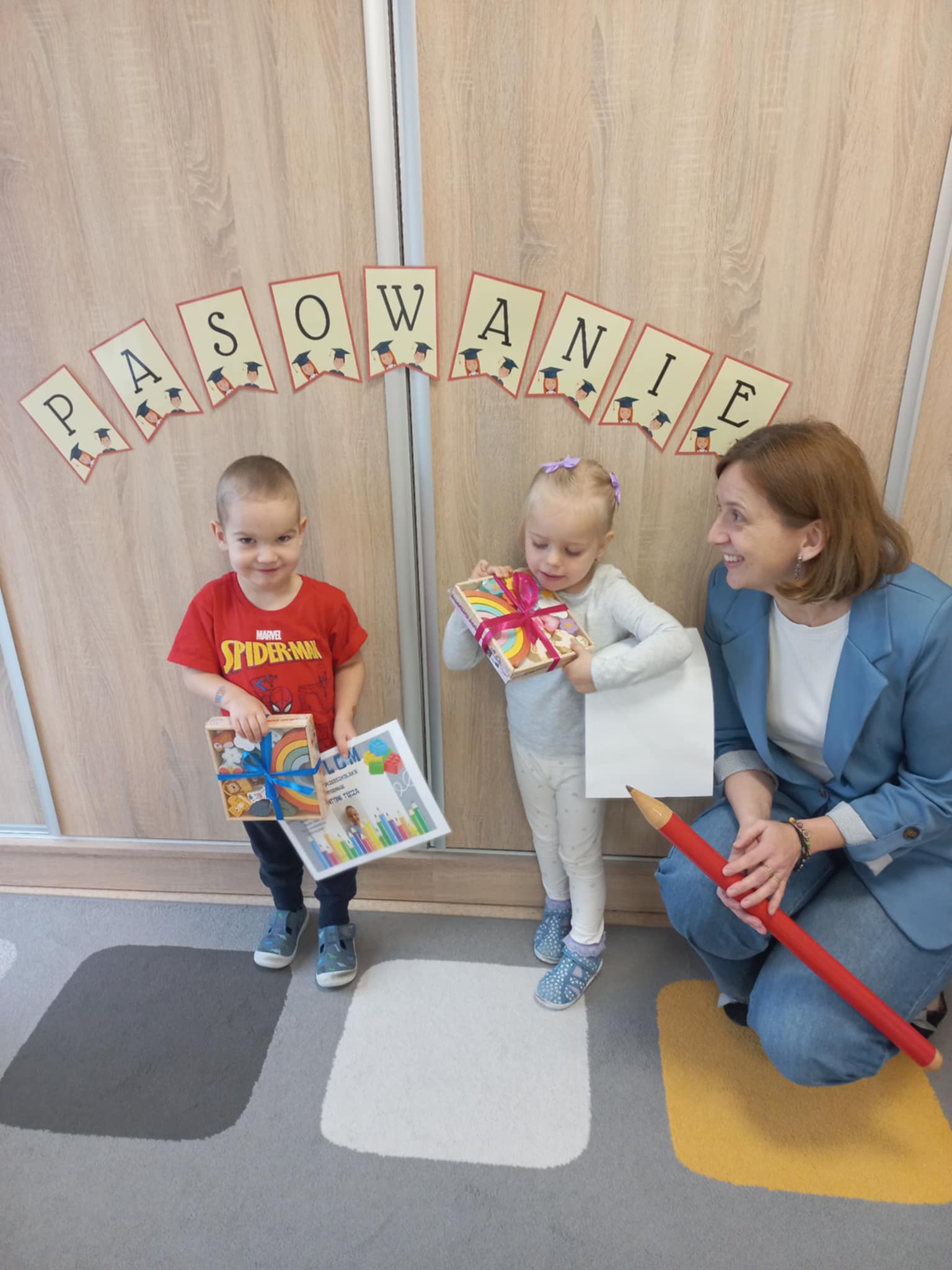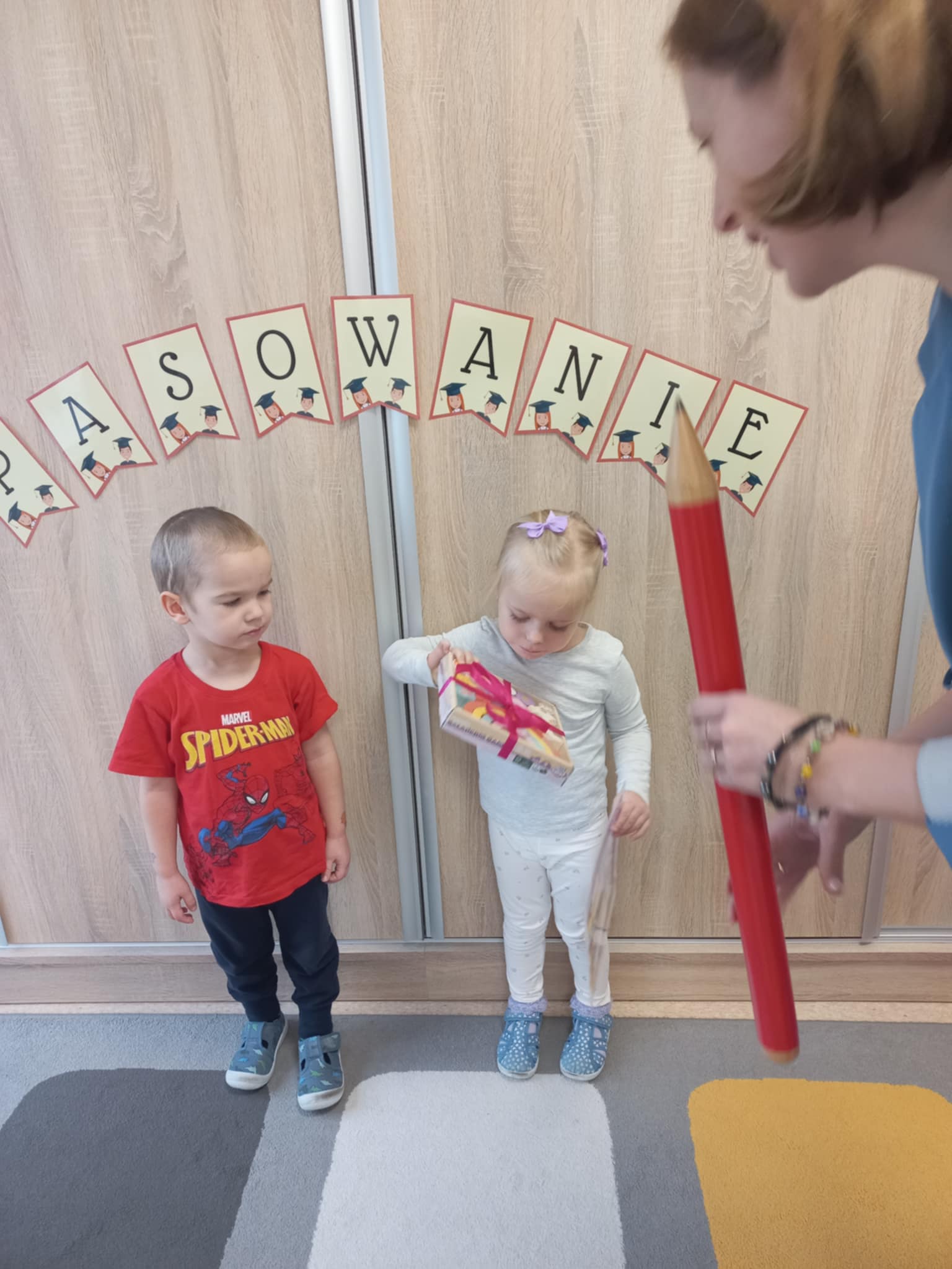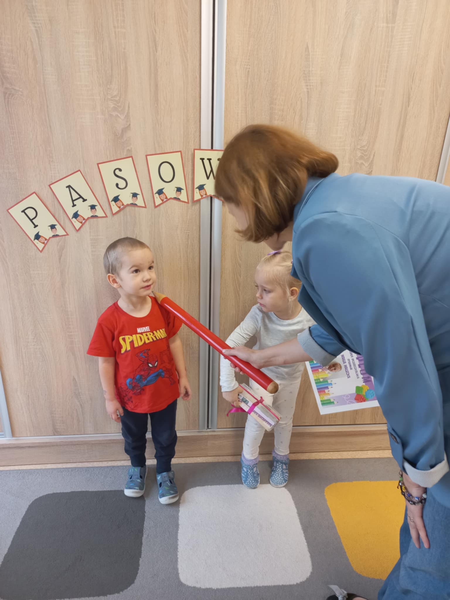 Dziś w naszej grupie odbyło się uroczyste pasowanie na przedszkolaka. To wyjątkowy dzień, ponieważ Antek i Marysia oficjalnie dołączyli do grona przedszkolaków! W uroczystości uczestniczyła pani dyrektor, która dokonała aktu pasowania i pogratulowała dzieciom tego ważnego wydarzenia. To był pełen emocji, radości i wzruszeń dzień – pierwszy tak ważny krok w przedszkolnej przygodzie Antka i Marysi.