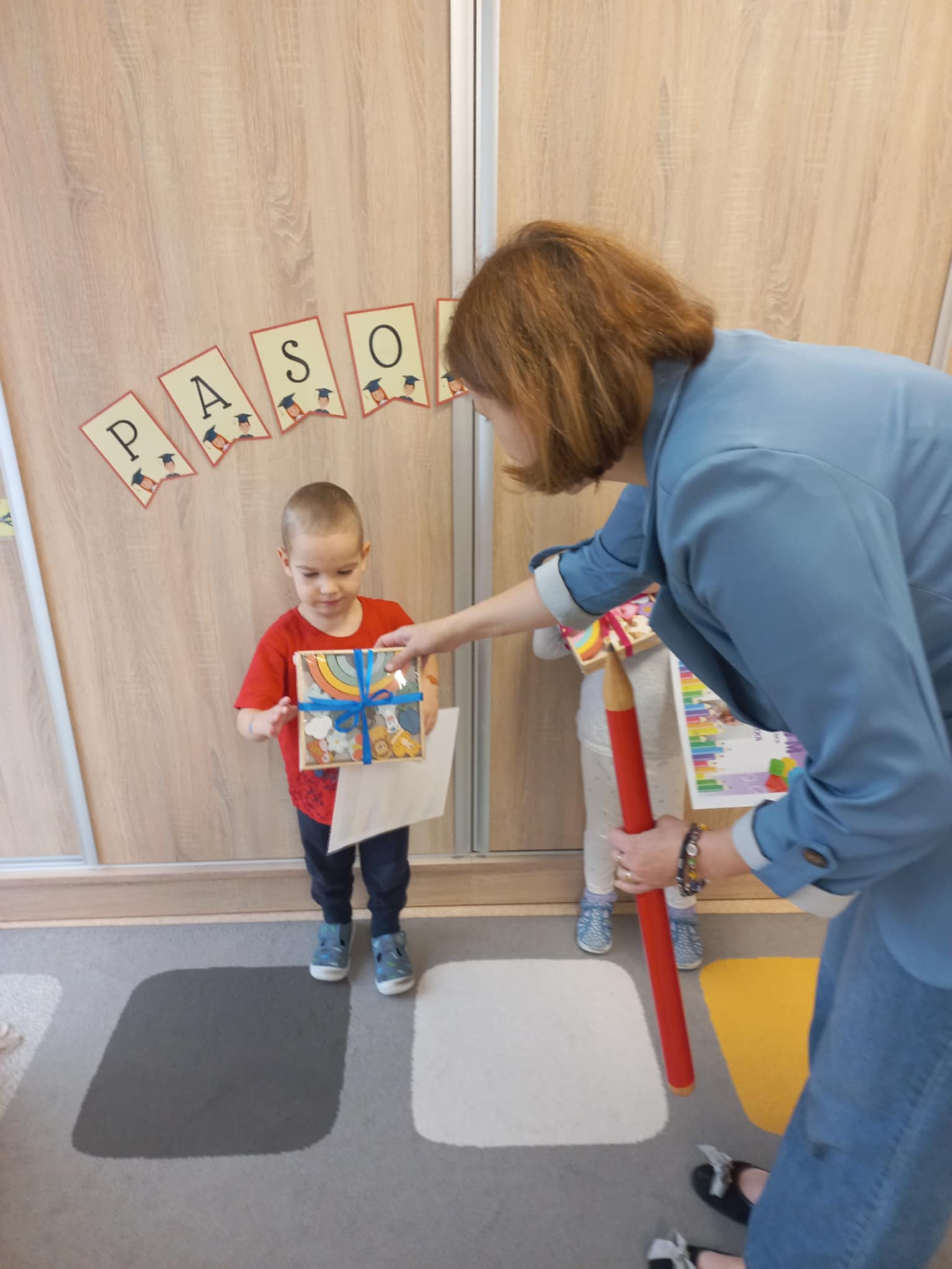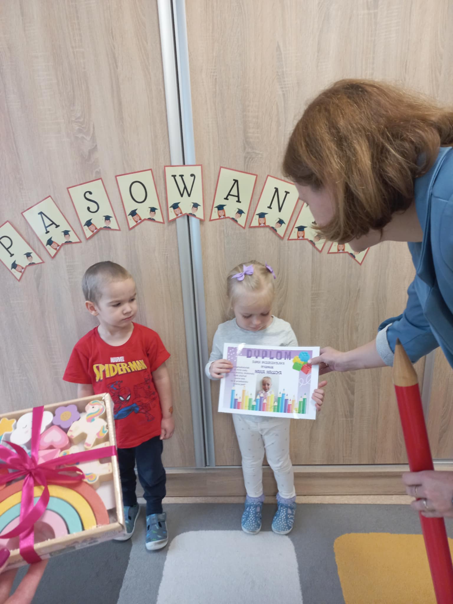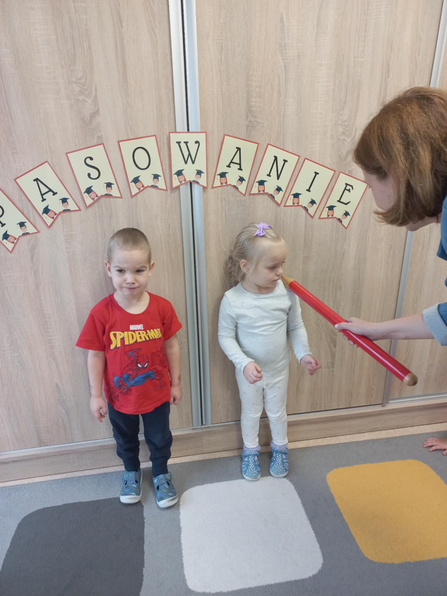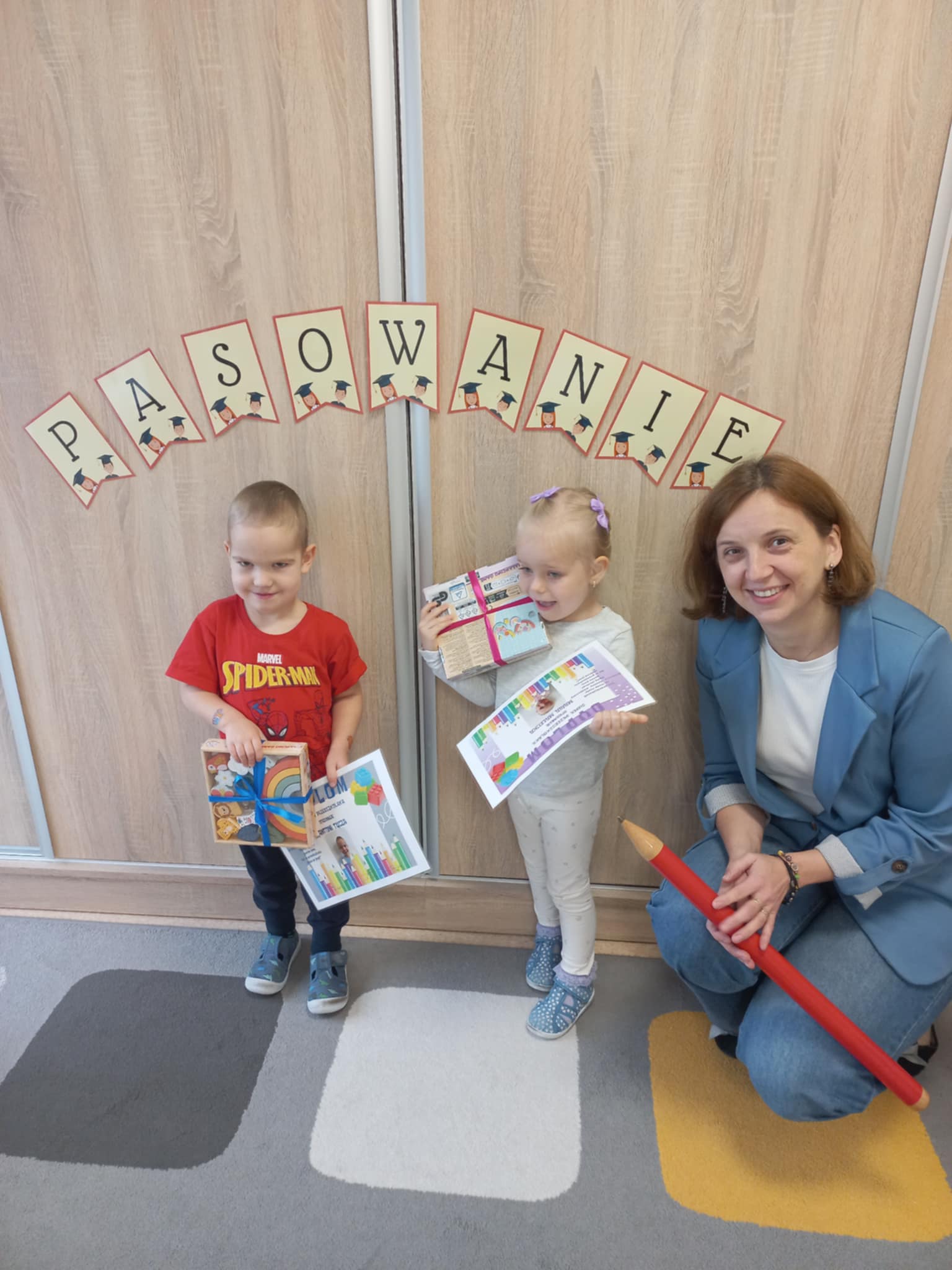 Dziś w naszej grupie odbyło się uroczyste pasowanie na przedszkolaka. To wyjątkowy dzień, ponieważ Antek i Marysia oficjalnie dołączyli do grona przedszkolaków! W uroczystości uczestniczyła pani dyrektor, która dokonała aktu pasowania i pogratulowała dzieciom tego ważnego wydarzenia. To był pełen emocji, radości i wzruszeń dzień – pierwszy tak ważny krok w przedszkolnej przygodzie Antka i Marysi.
