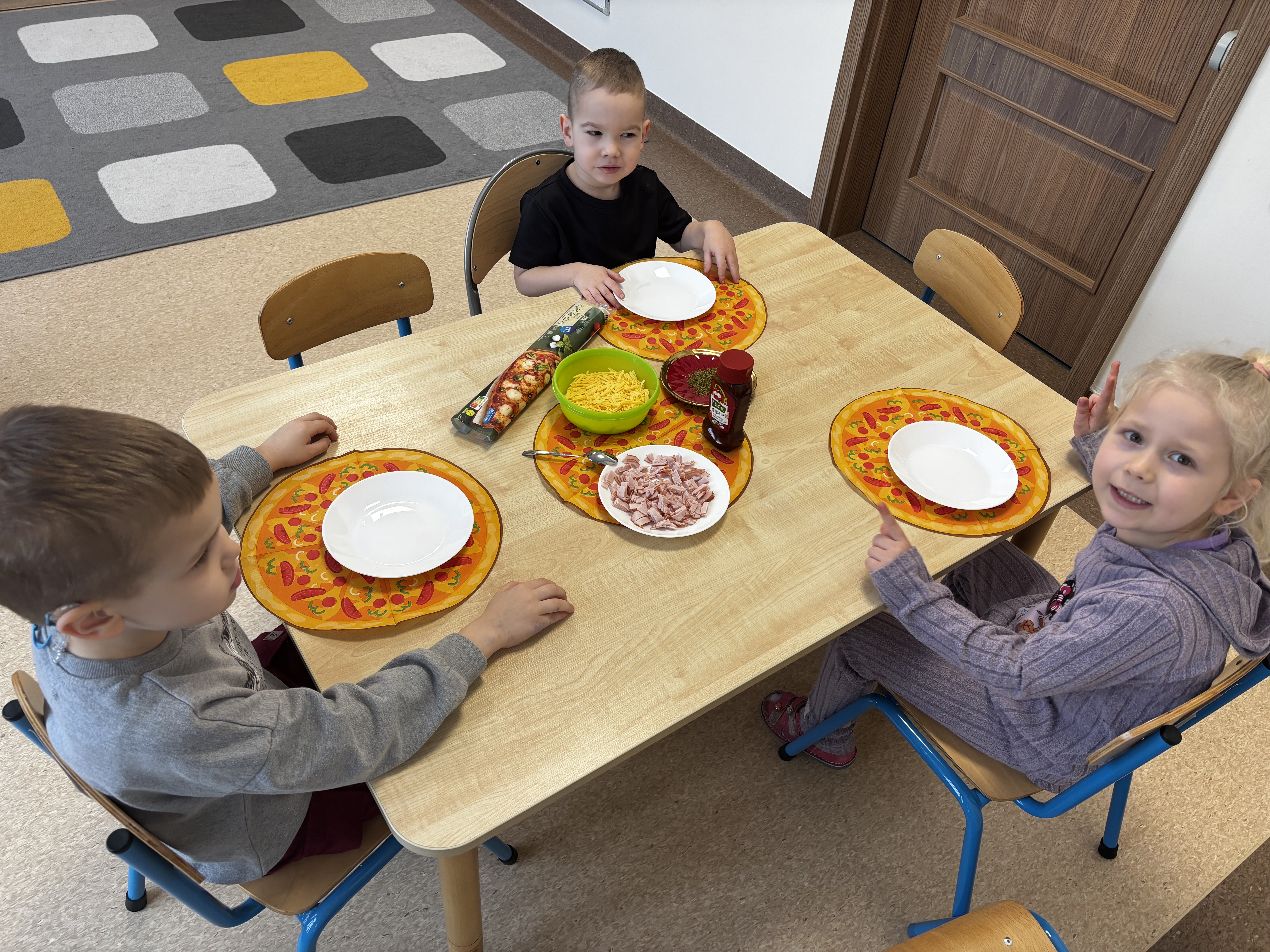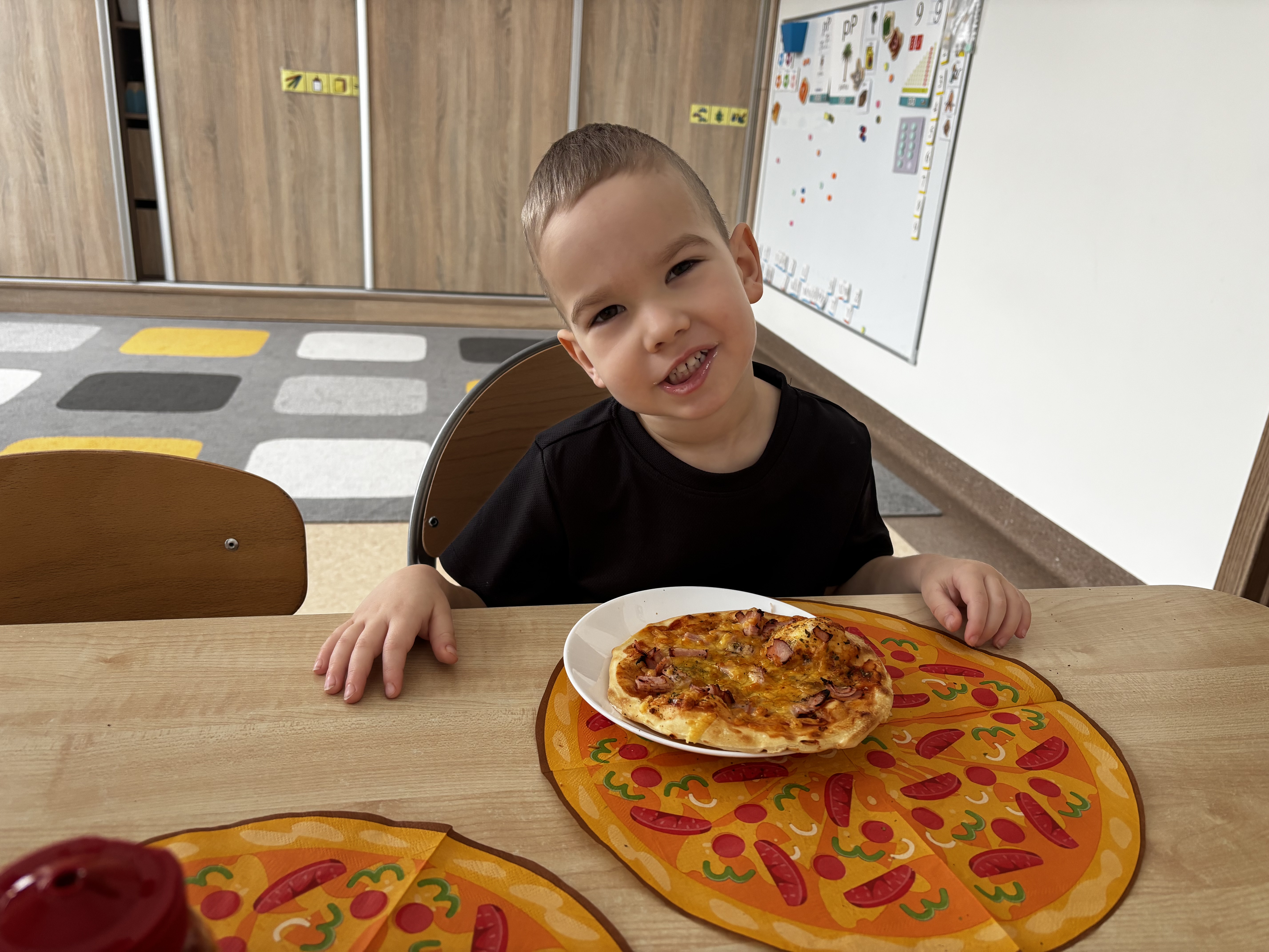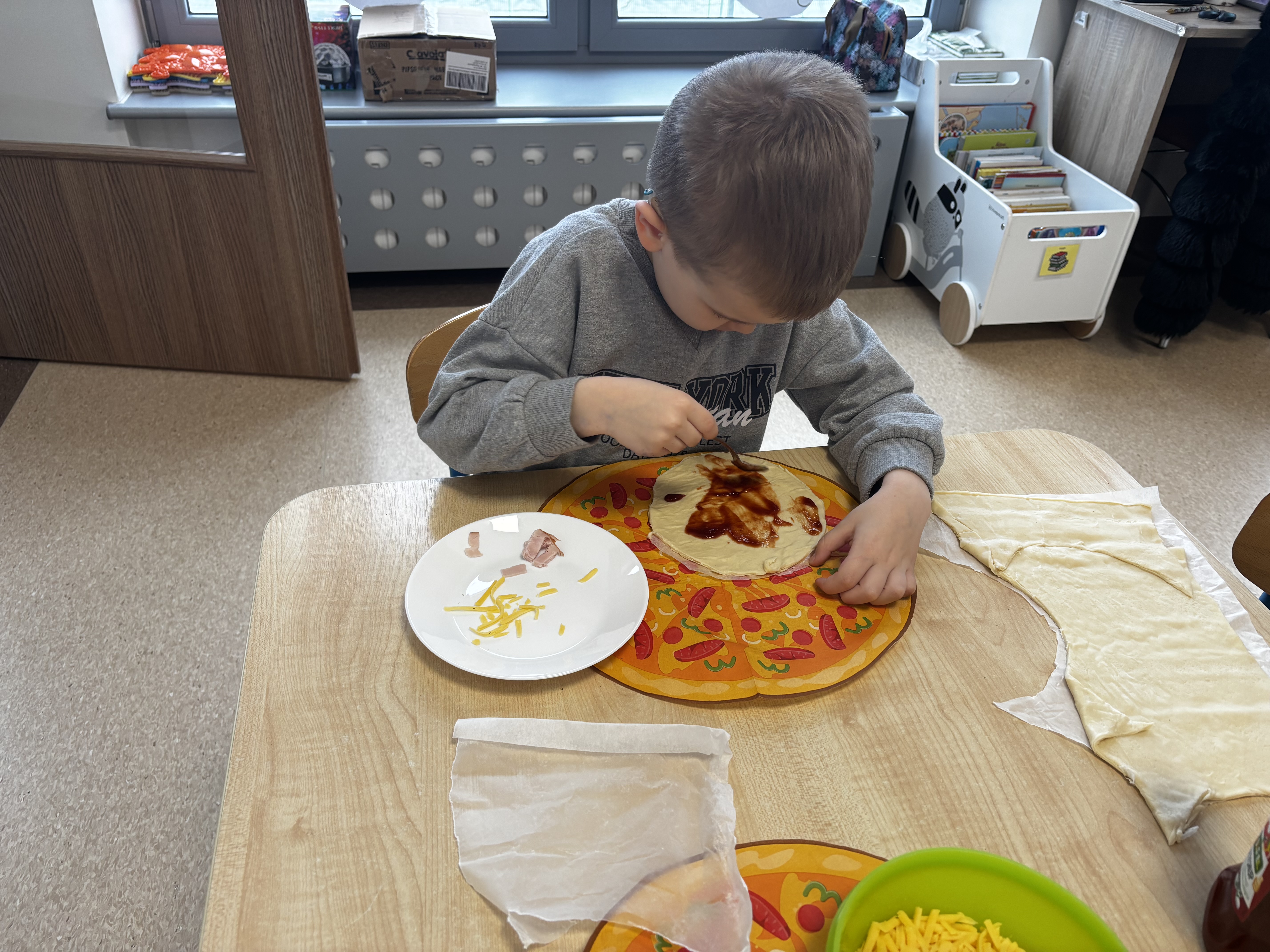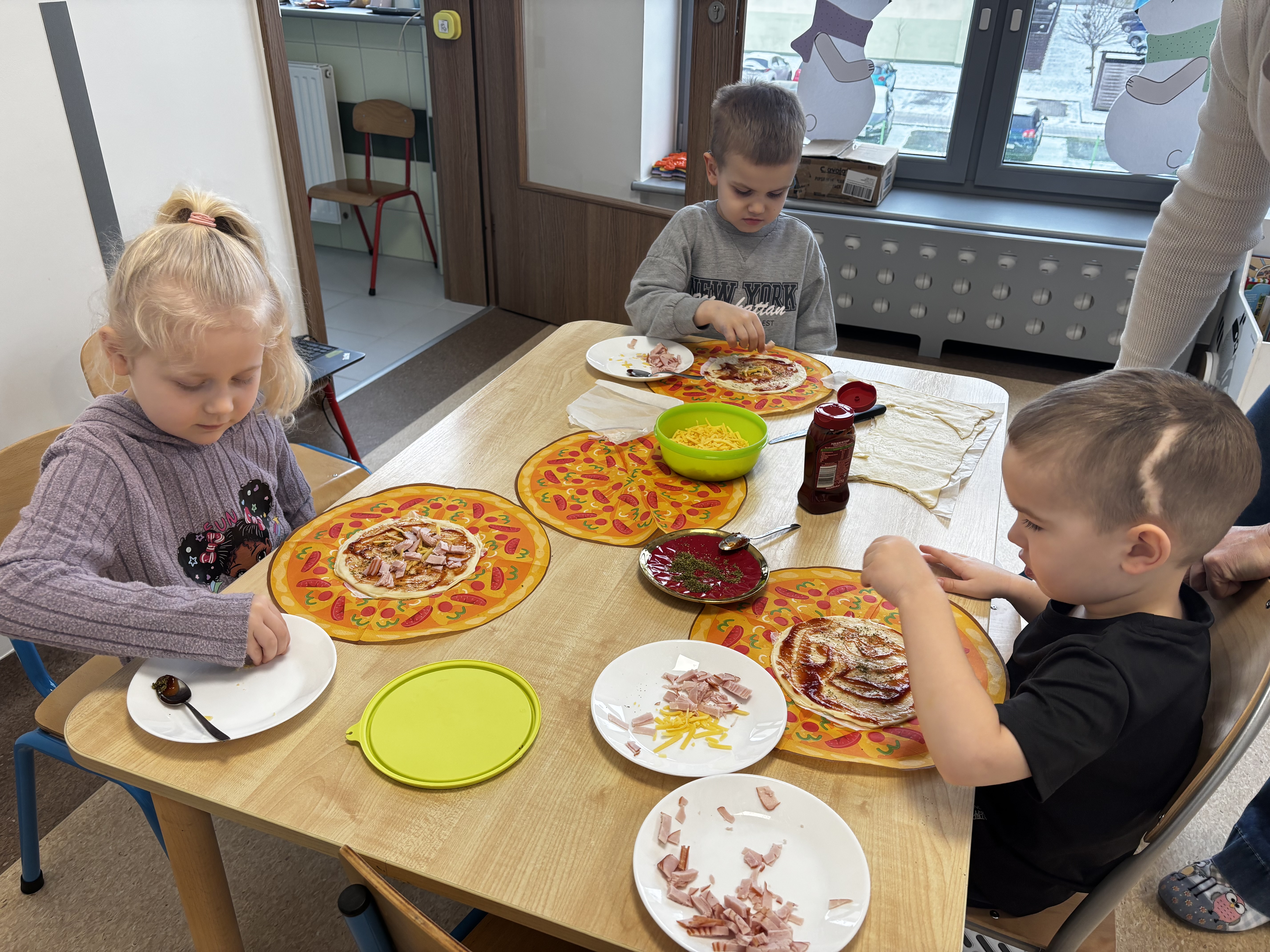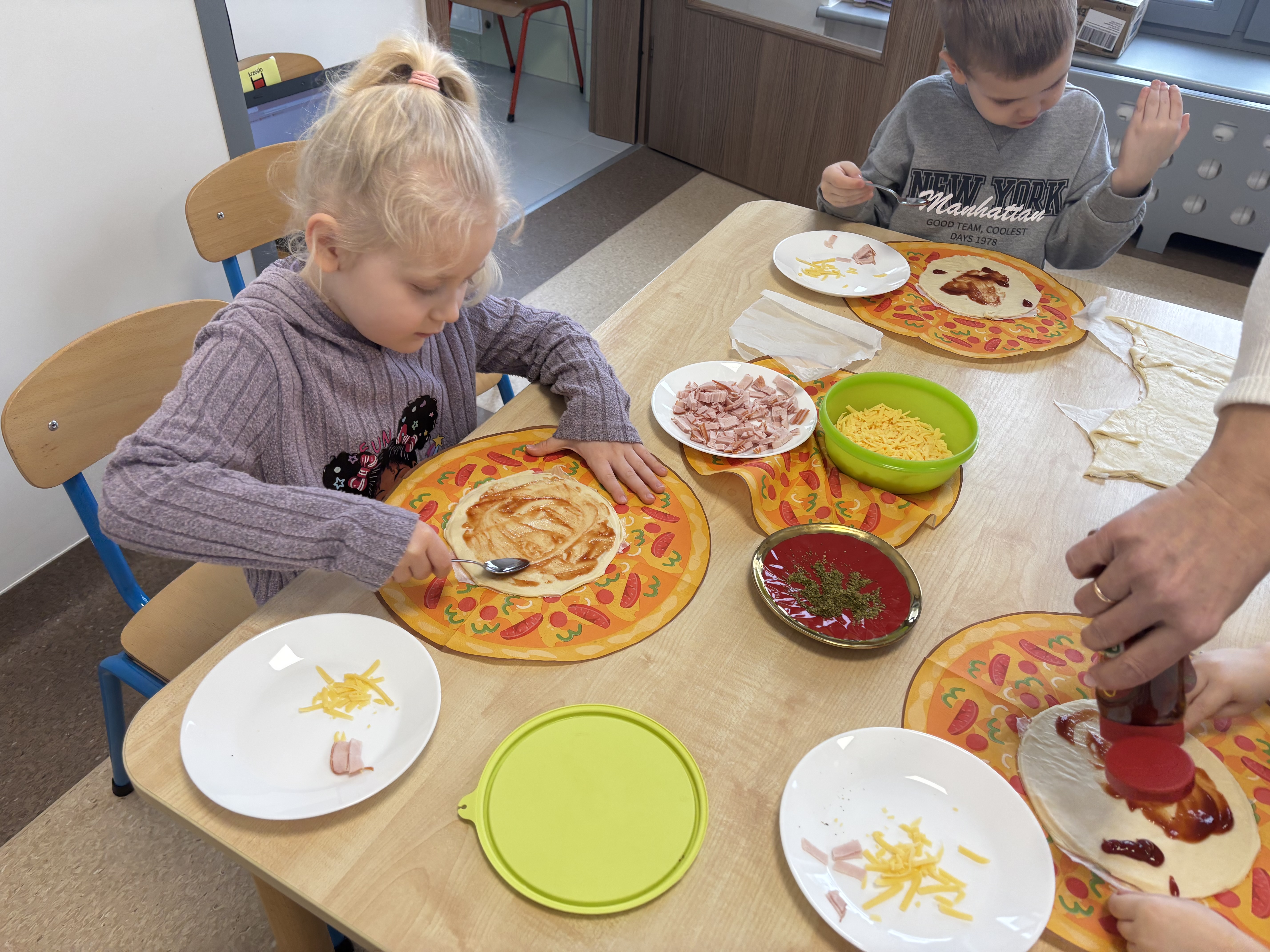 Dzień Pizzy był połączony ze spotkaniem z zoologiem oraz egzotycznymi zwierzętami. Dzieci uczestniczyły w wielozmysłowych aktywnościach – dotykały i oglądały składniki pizzy, poznając ich kolory, faktury i zapachy. Następnie miały okazję zobaczyć z bliska jaszczurkę, żółwia, węża oraz królika. Największym zainteresowaniem cieszyły się wąż i jaszczurka. Dzieci z dużym zaciekawieniem obserwowały zwierzęta oraz podejmowały próby głaskania i bezpośredniego kontaktu, zdobywając nowe doświadczenia sensoryczne w atmosferze bezpieczeństwa i akceptacji.