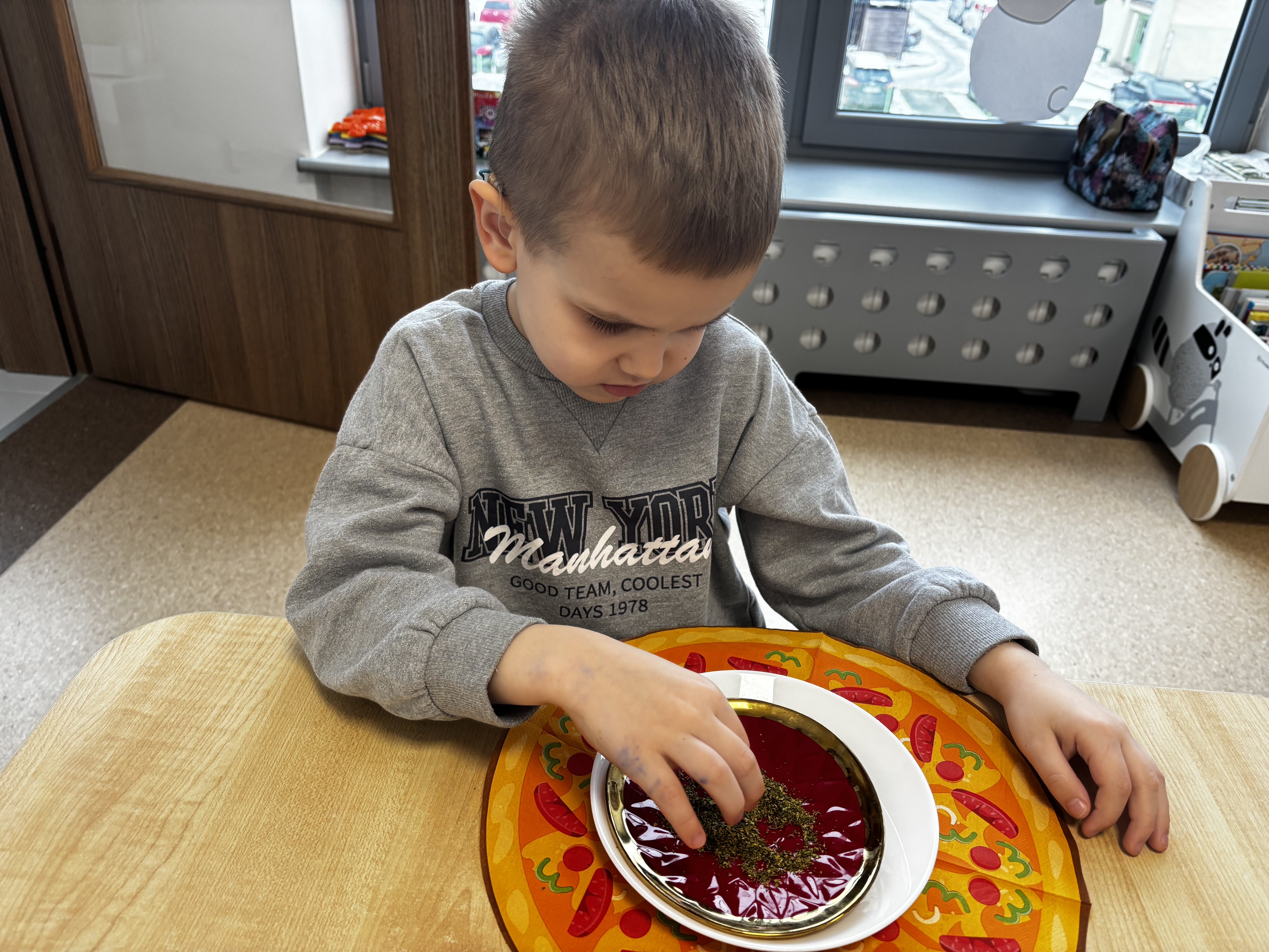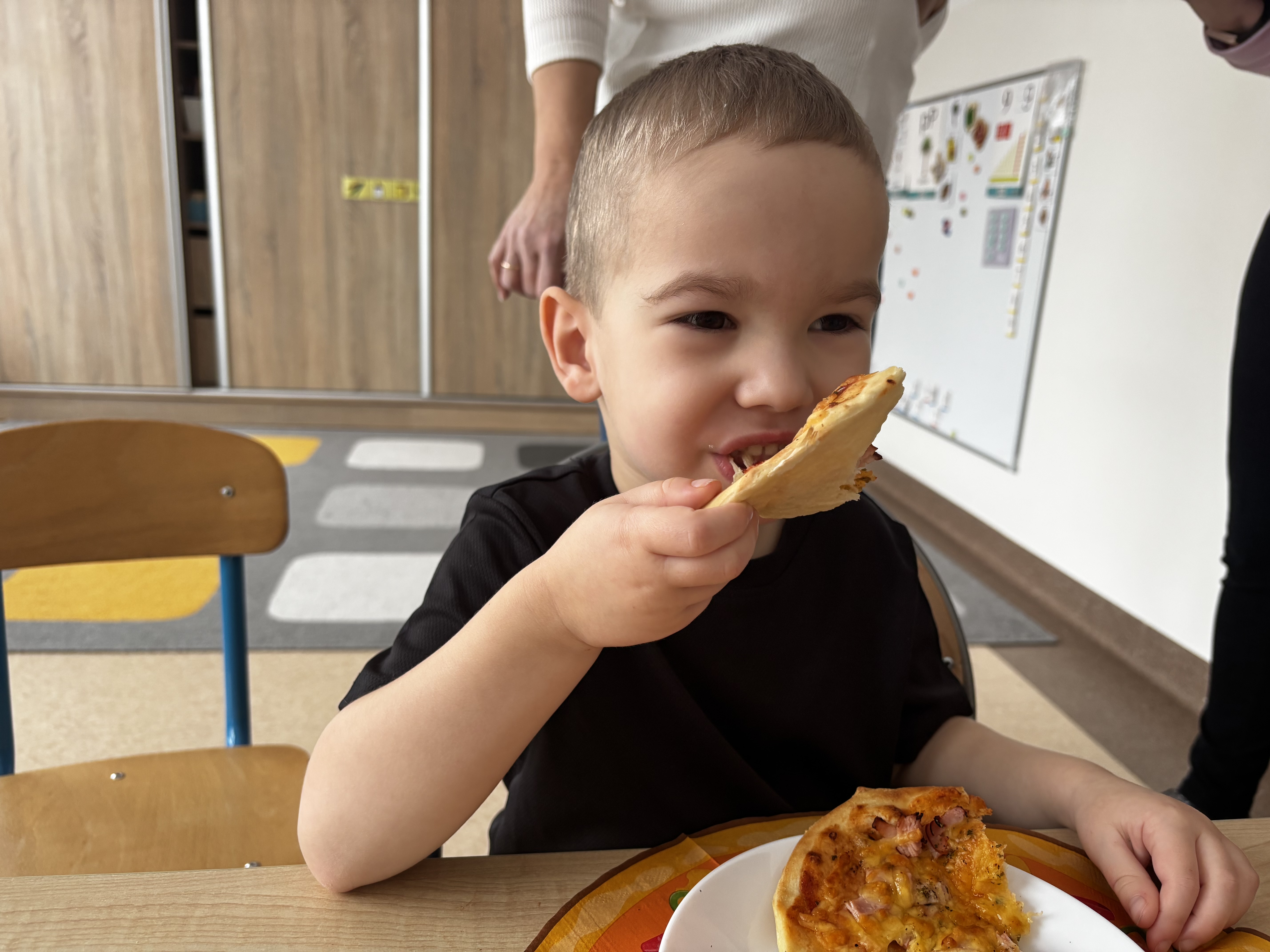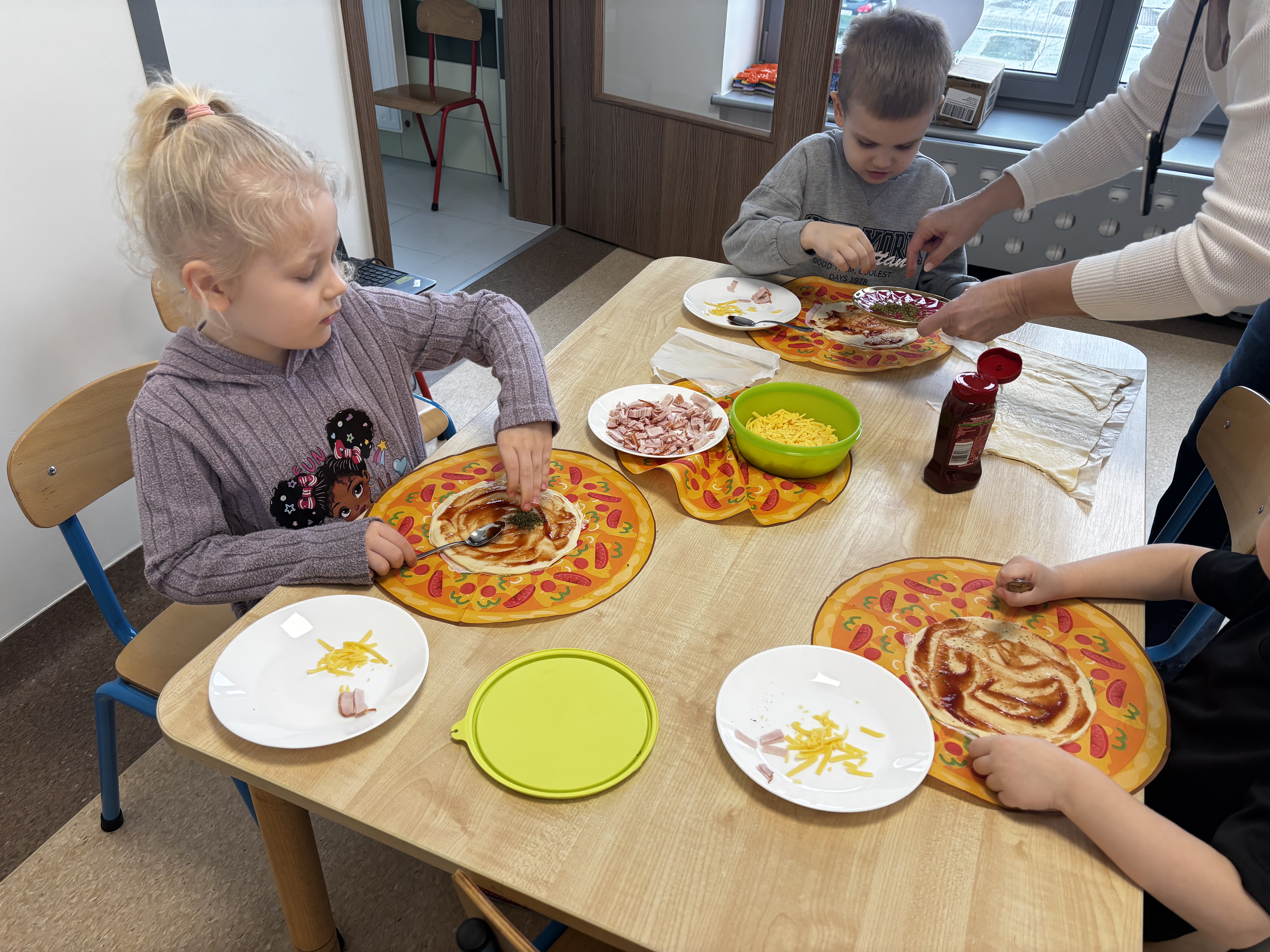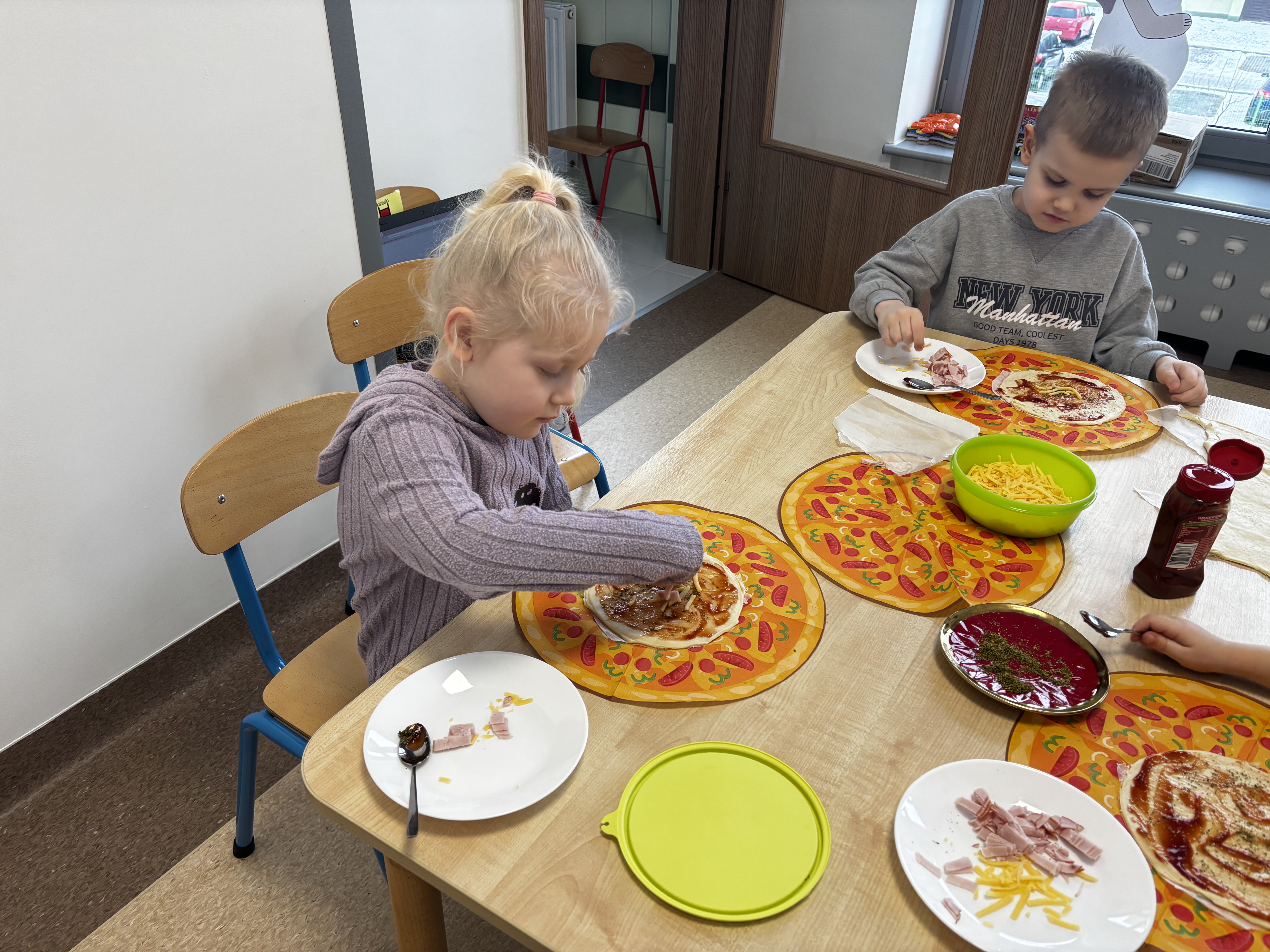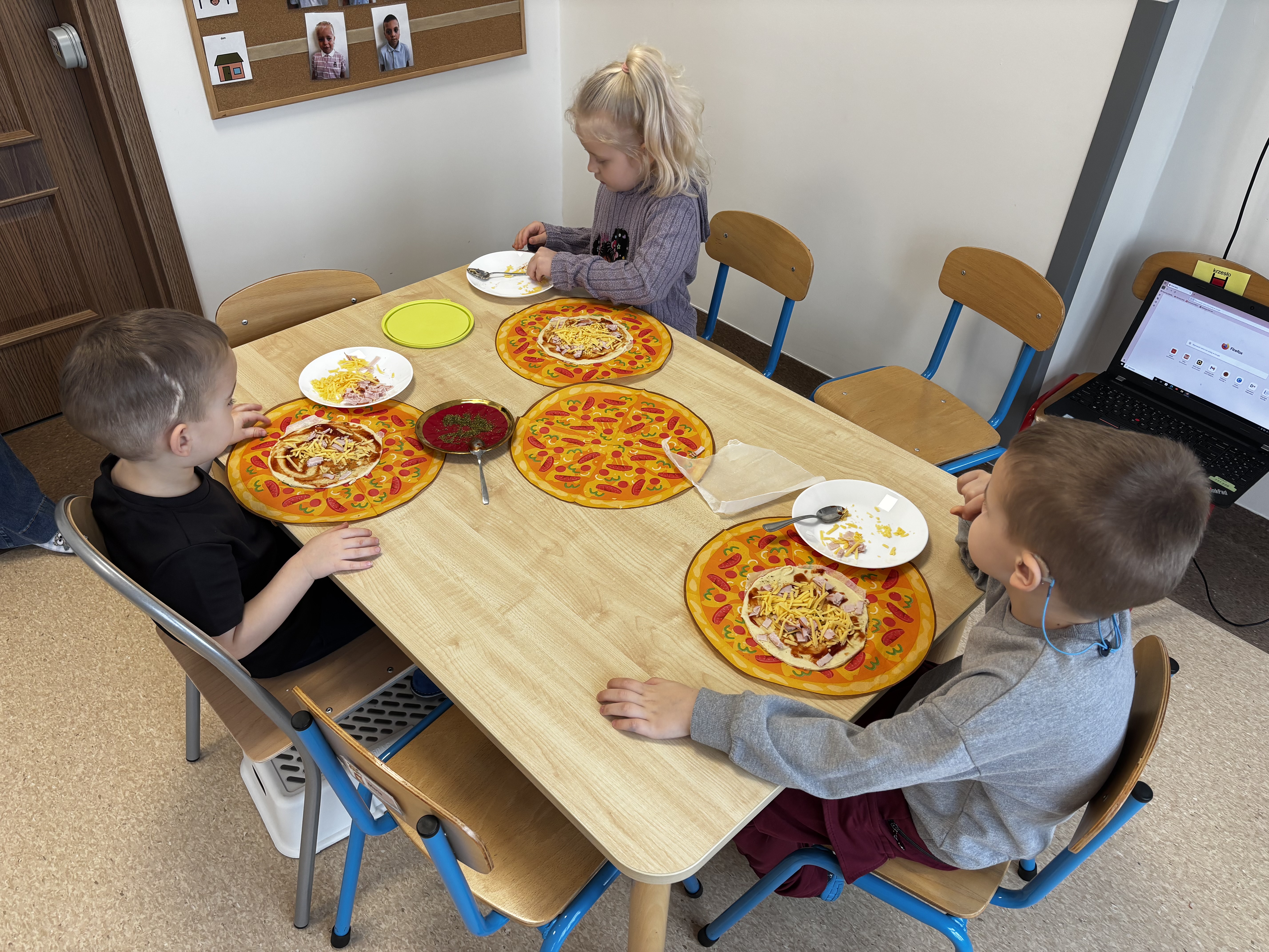 Dzień Pizzy był połączony ze spotkaniem z zoologiem oraz egzotycznymi zwierzętami. Dzieci uczestniczyły w wielozmysłowych aktywnościach – dotykały i oglądały składniki pizzy, poznając ich kolory, faktury i zapachy. Następnie miały okazję zobaczyć z bliska jaszczurkę, żółwia, węża oraz królika. Największym zainteresowaniem cieszyły się wąż i jaszczurka. Dzieci z dużym zaciekawieniem obserwowały zwierzęta oraz podejmowały próby głaskania i bezpośredniego kontaktu, zdobywając nowe doświadczenia sensoryczne w atmosferze bezpieczeństwa i akceptacji.