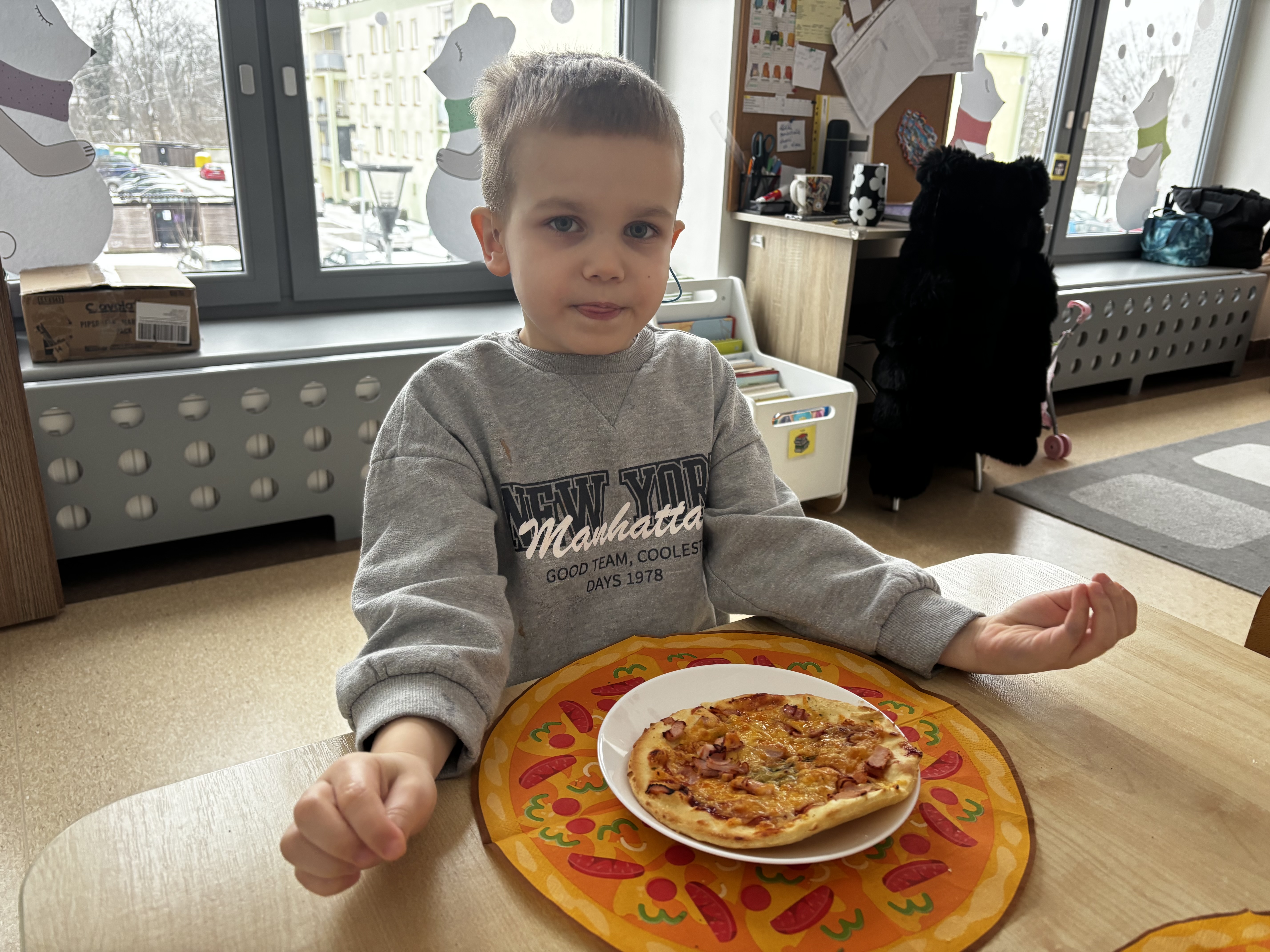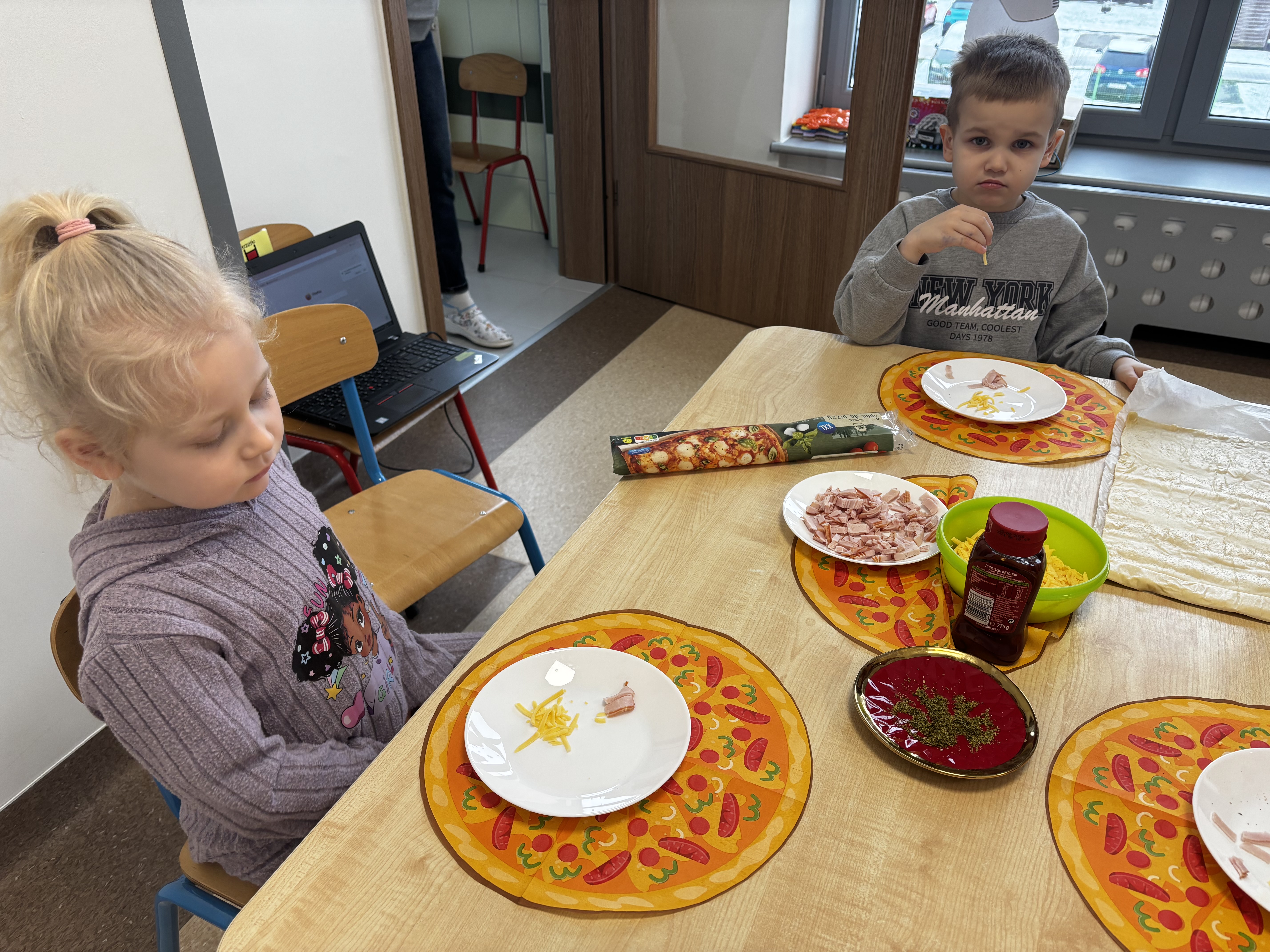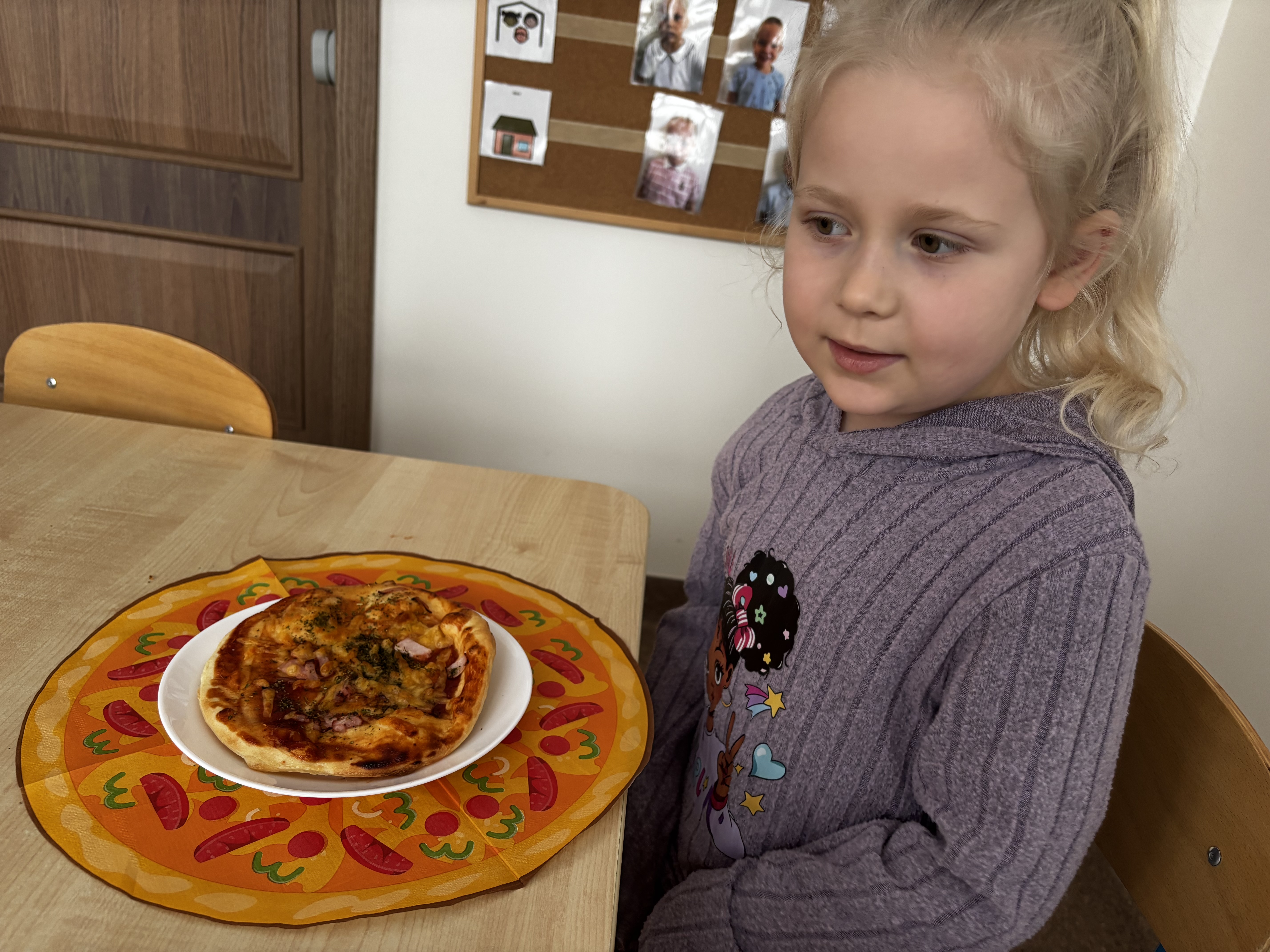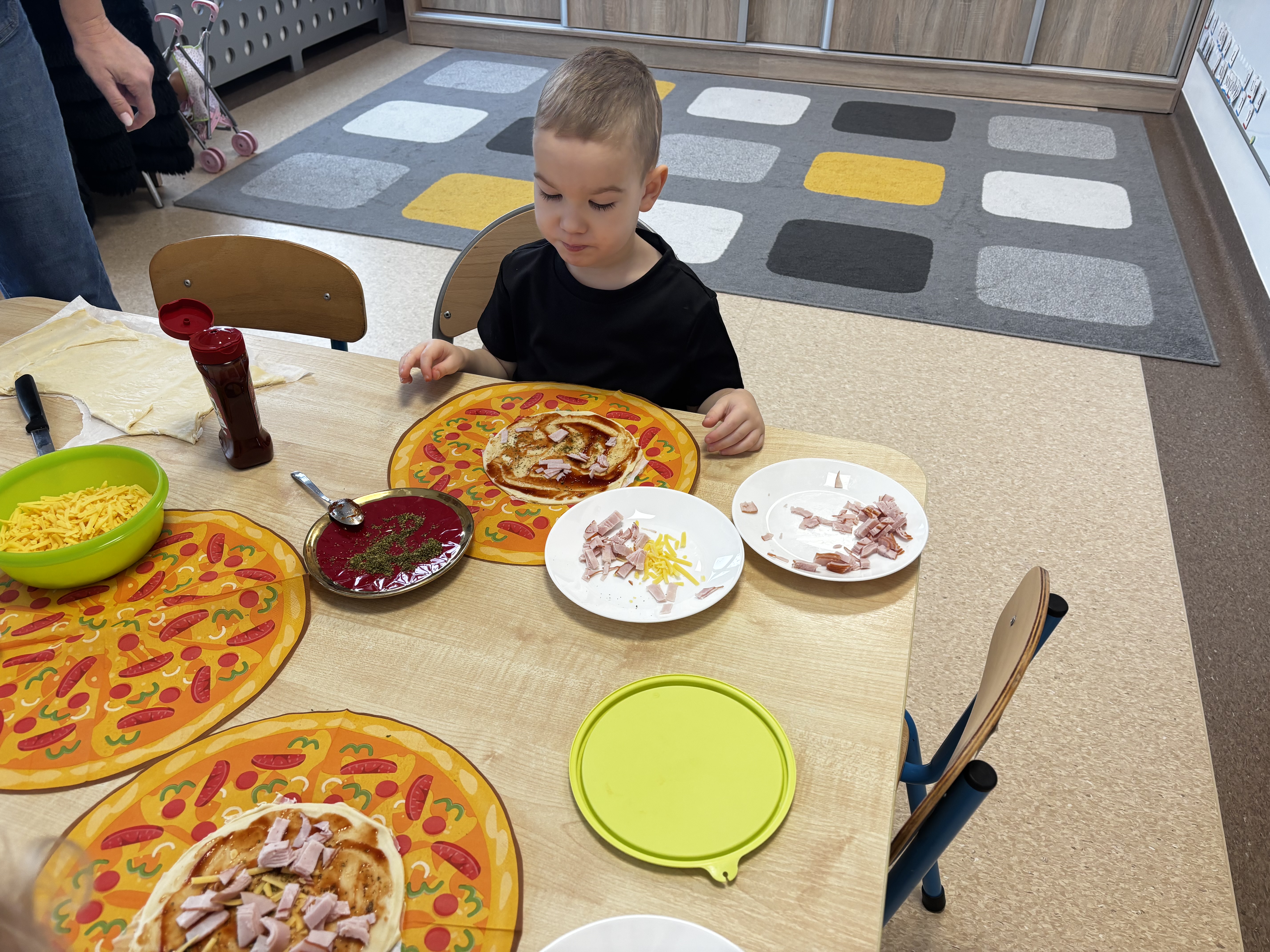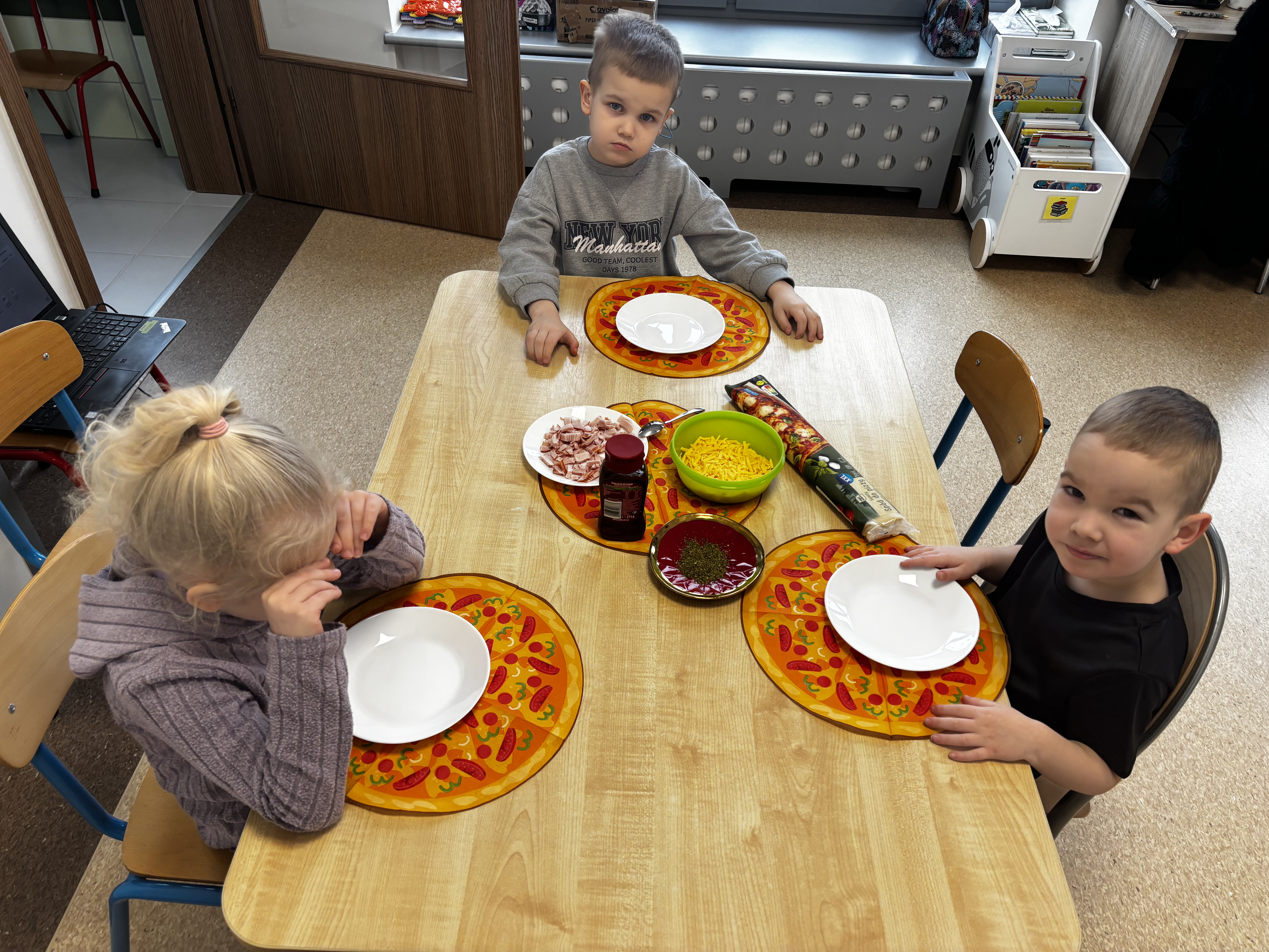 Dzień Pizzy był połączony ze spotkaniem z zoologiem oraz egzotycznymi zwierzętami. Dzieci uczestniczyły w wielozmysłowych aktywnościach – dotykały i oglądały składniki pizzy, poznając ich kolory, faktury i zapachy. Następnie miały okazję zobaczyć z bliska jaszczurkę, żółwia, węża oraz królika. Największym zainteresowaniem cieszyły się wąż i jaszczurka. Dzieci z dużym zaciekawieniem obserwowały zwierzęta oraz podejmowały próby głaskania i bezpośredniego kontaktu, zdobywając nowe doświadczenia sensoryczne w atmosferze bezpieczeństwa i akceptacji.