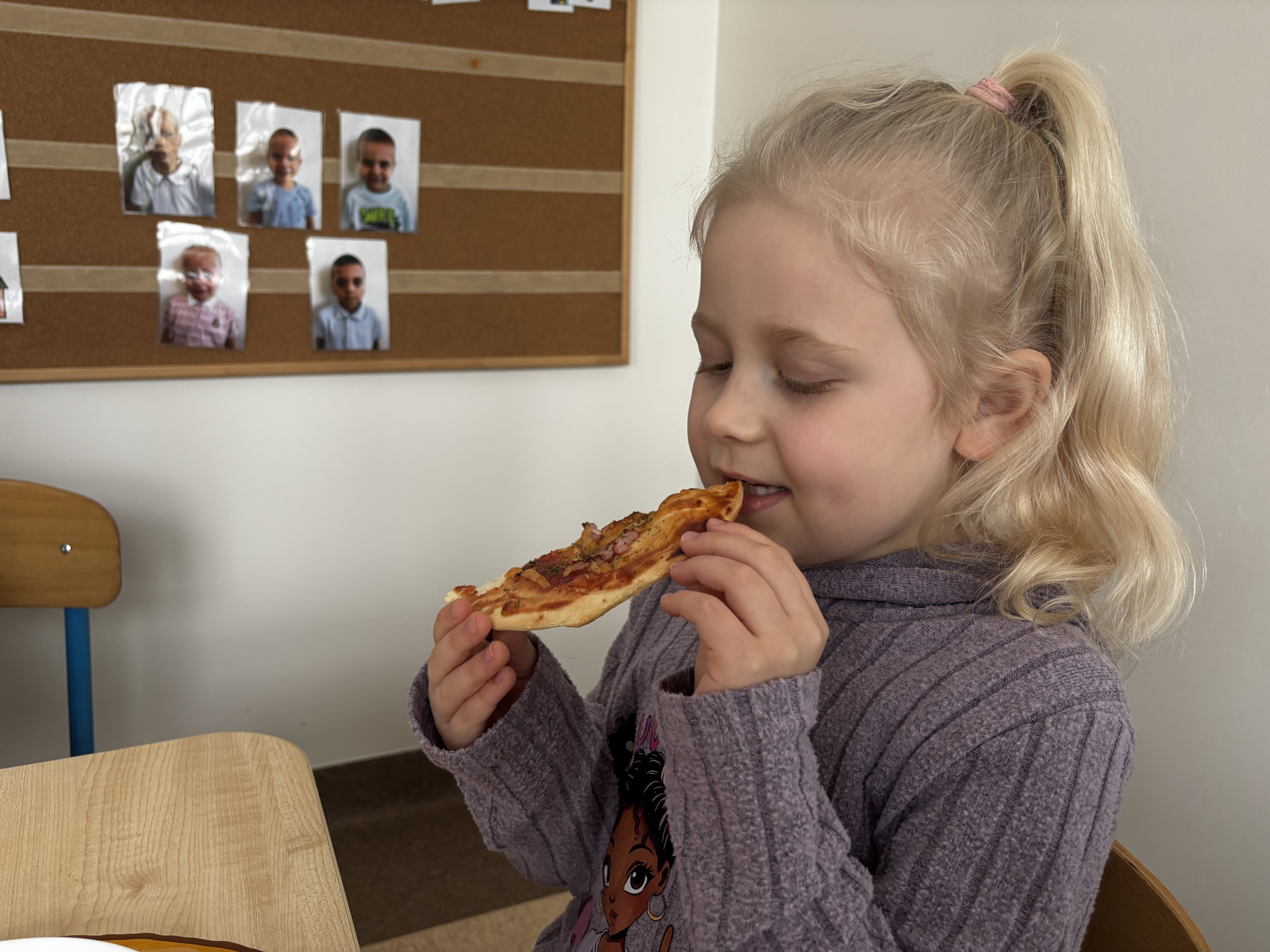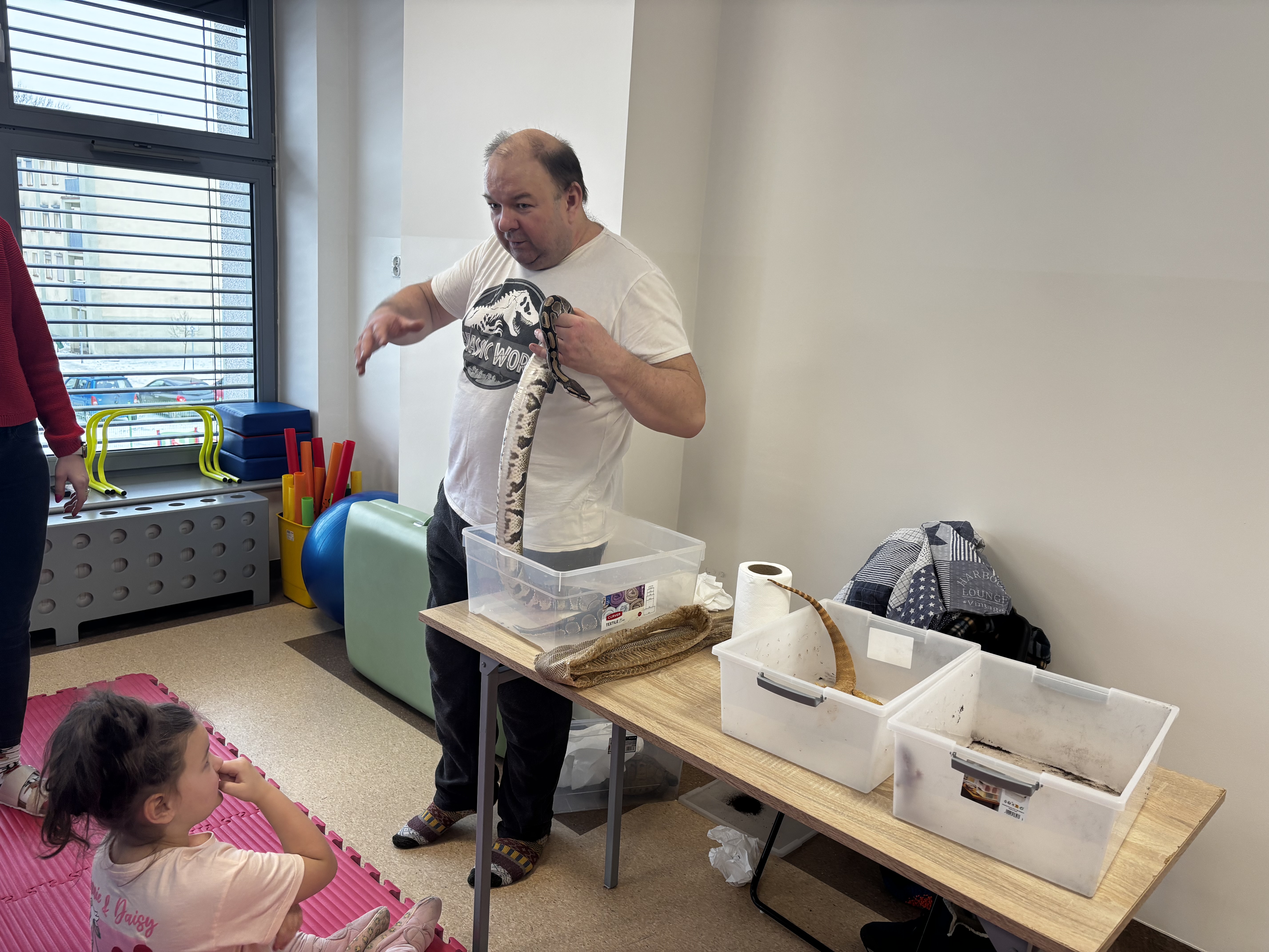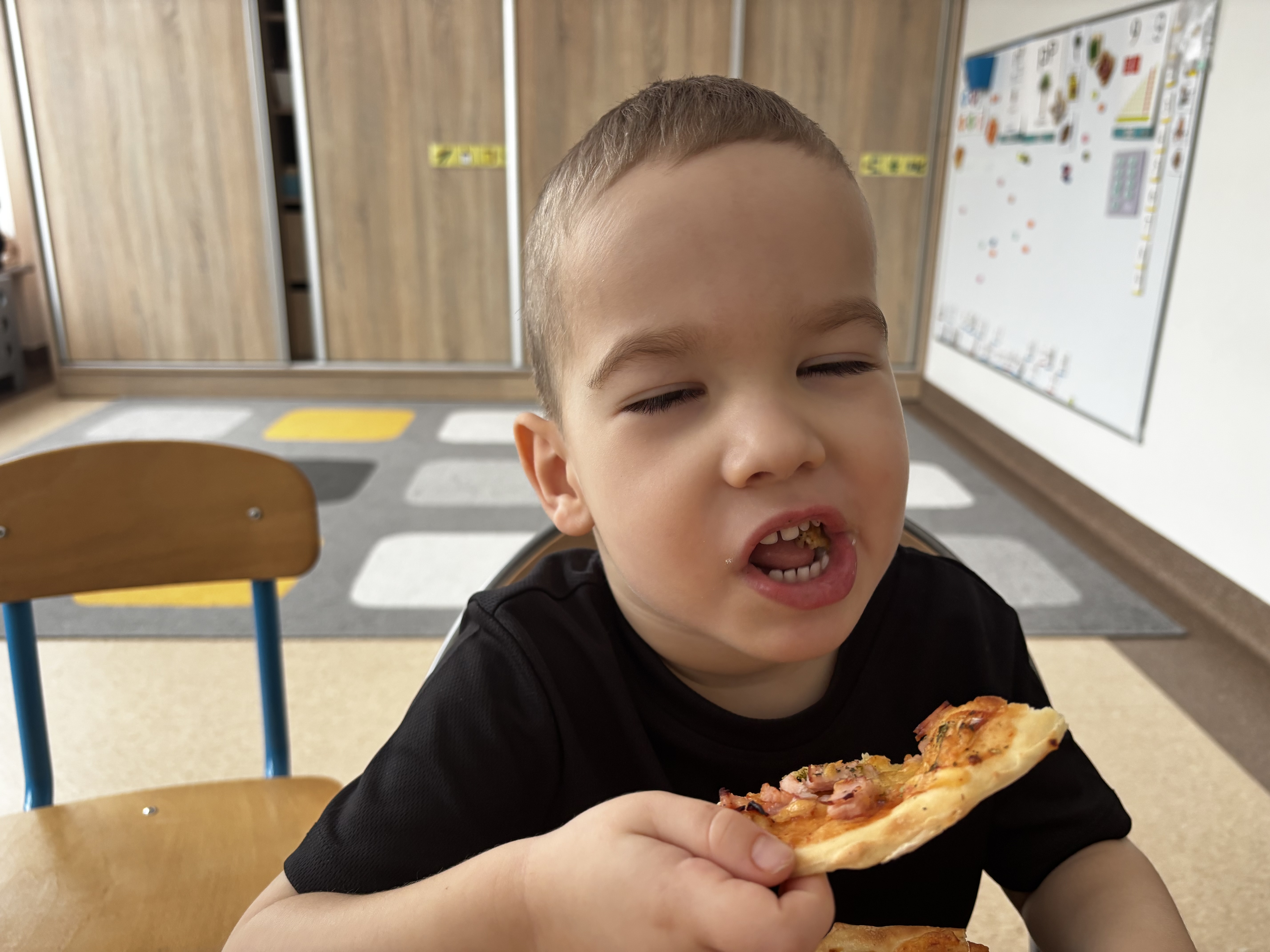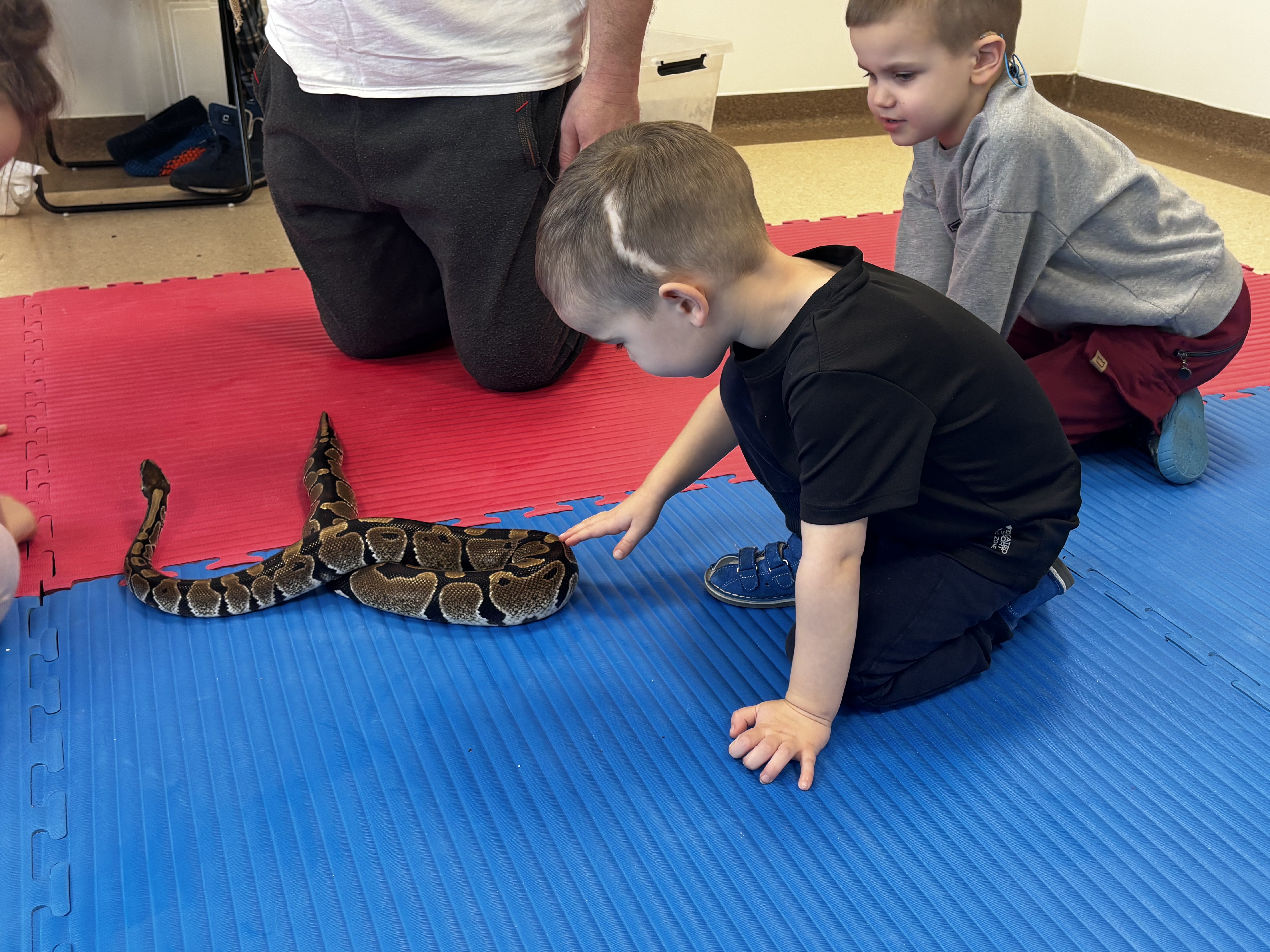 Dzień Pizzy był połączony ze spotkaniem z zoologiem oraz egzotycznymi zwierzętami. Dzieci uczestniczyły w wielozmysłowych aktywnościach – dotykały i oglądały składniki pizzy, poznając ich kolory, faktury i zapachy. Następnie miały okazję zobaczyć z bliska jaszczurkę, żółwia, węża oraz królika. Największym zainteresowaniem cieszyły się wąż i jaszczurka. Dzieci z dużym zaciekawieniem obserwowały zwierzęta oraz podejmowały próby głaskania i bezpośredniego kontaktu, zdobywając nowe doświadczenia sensoryczne w atmosferze bezpieczeństwa i akceptacji.