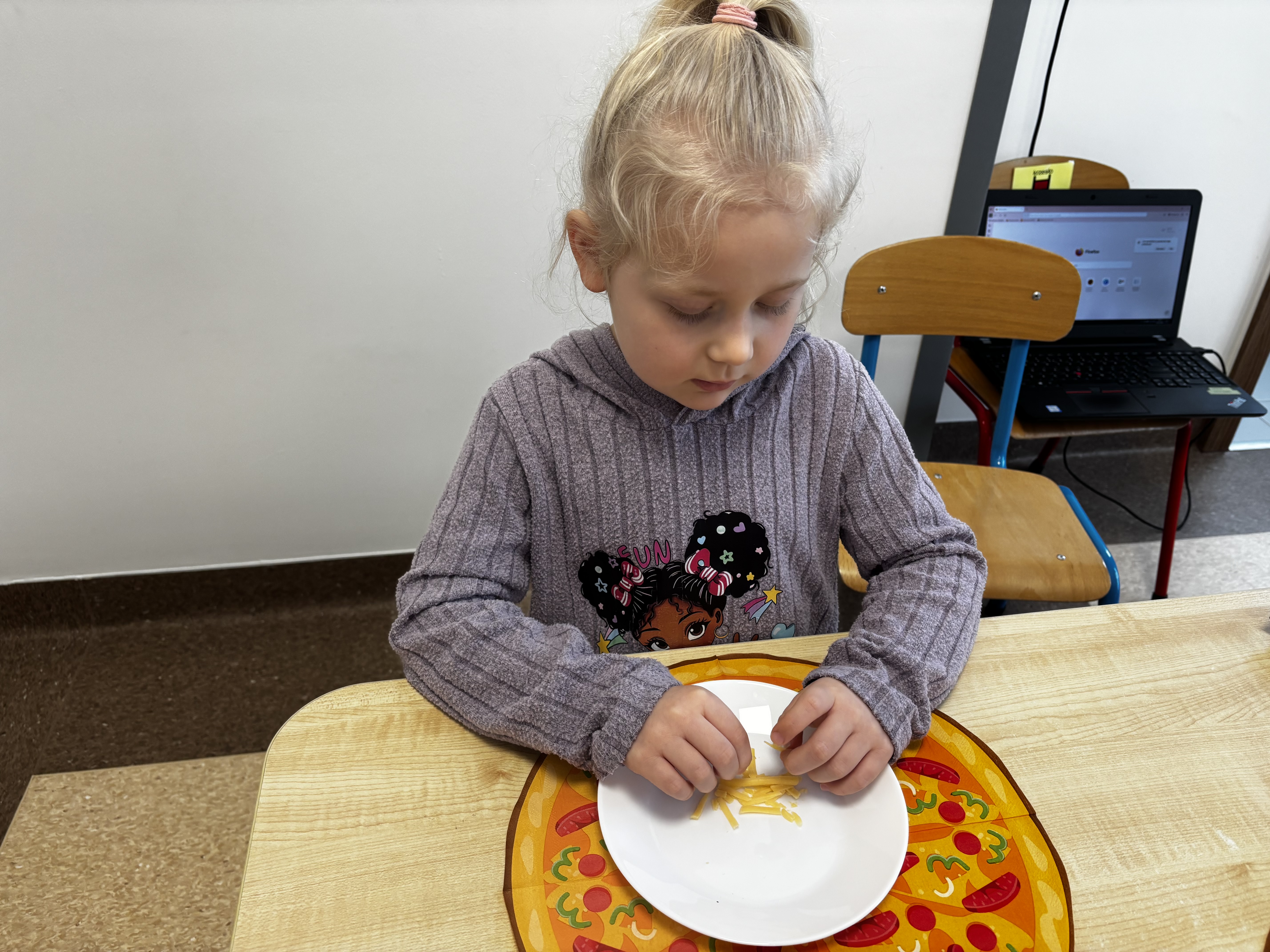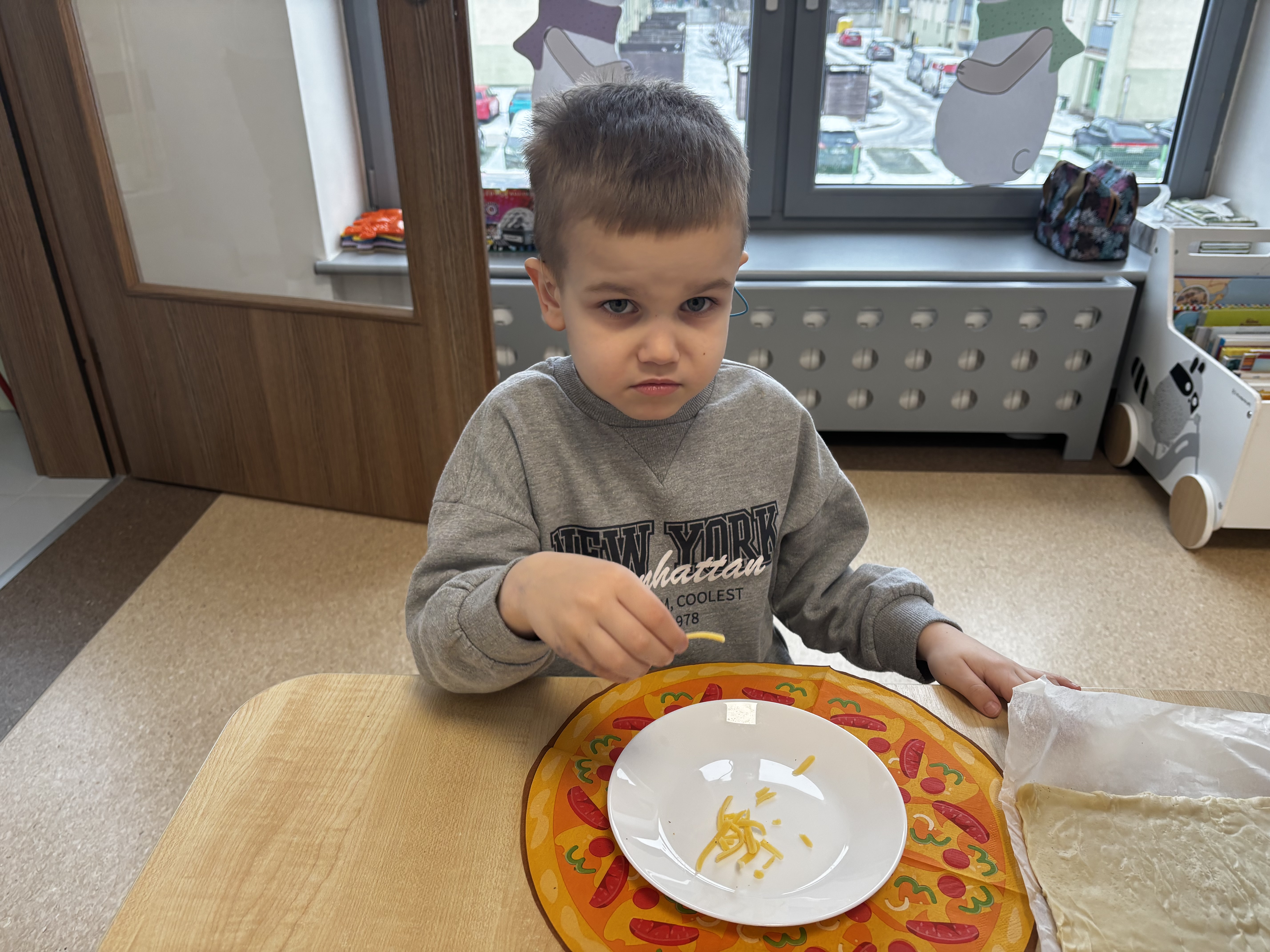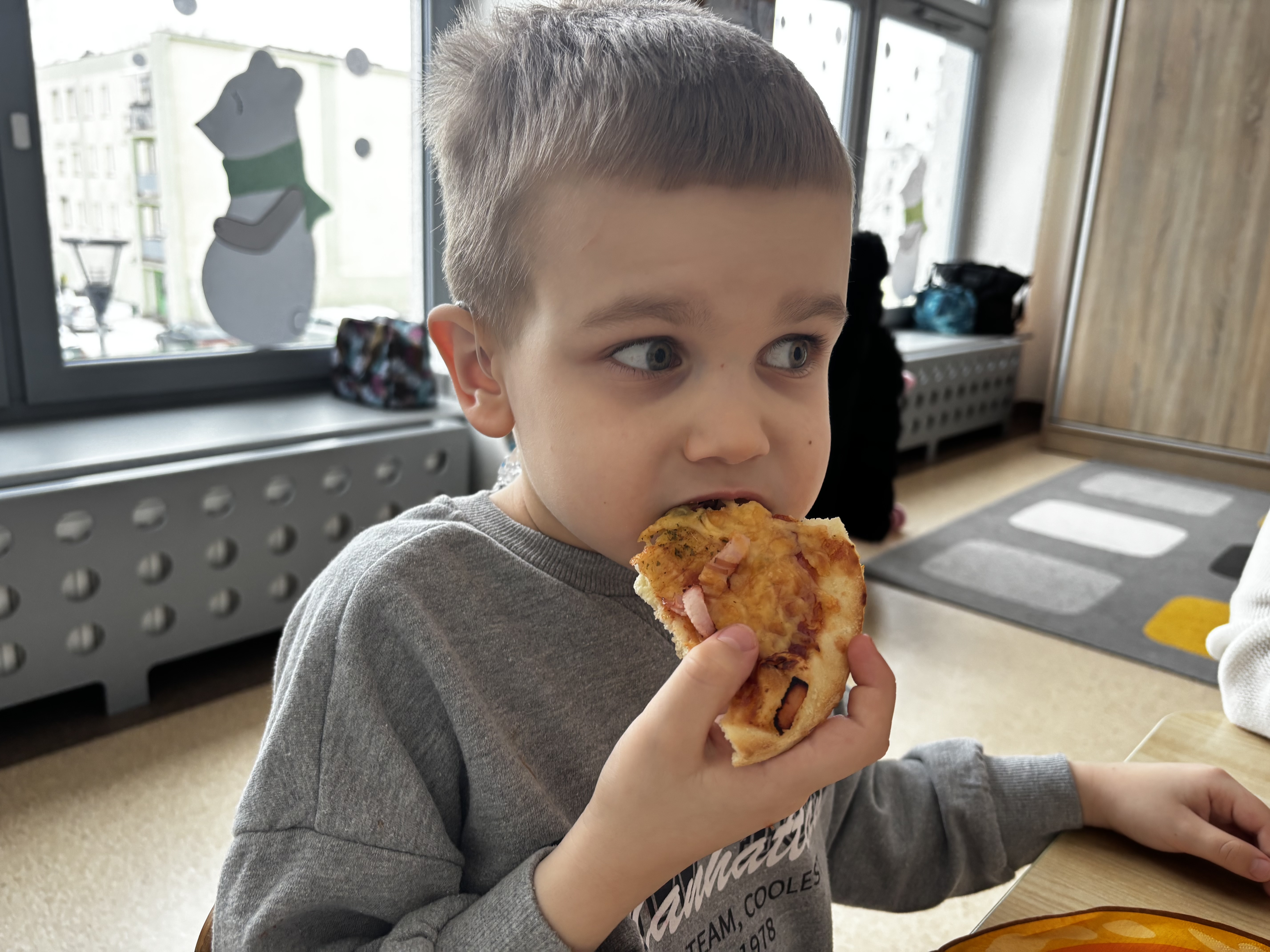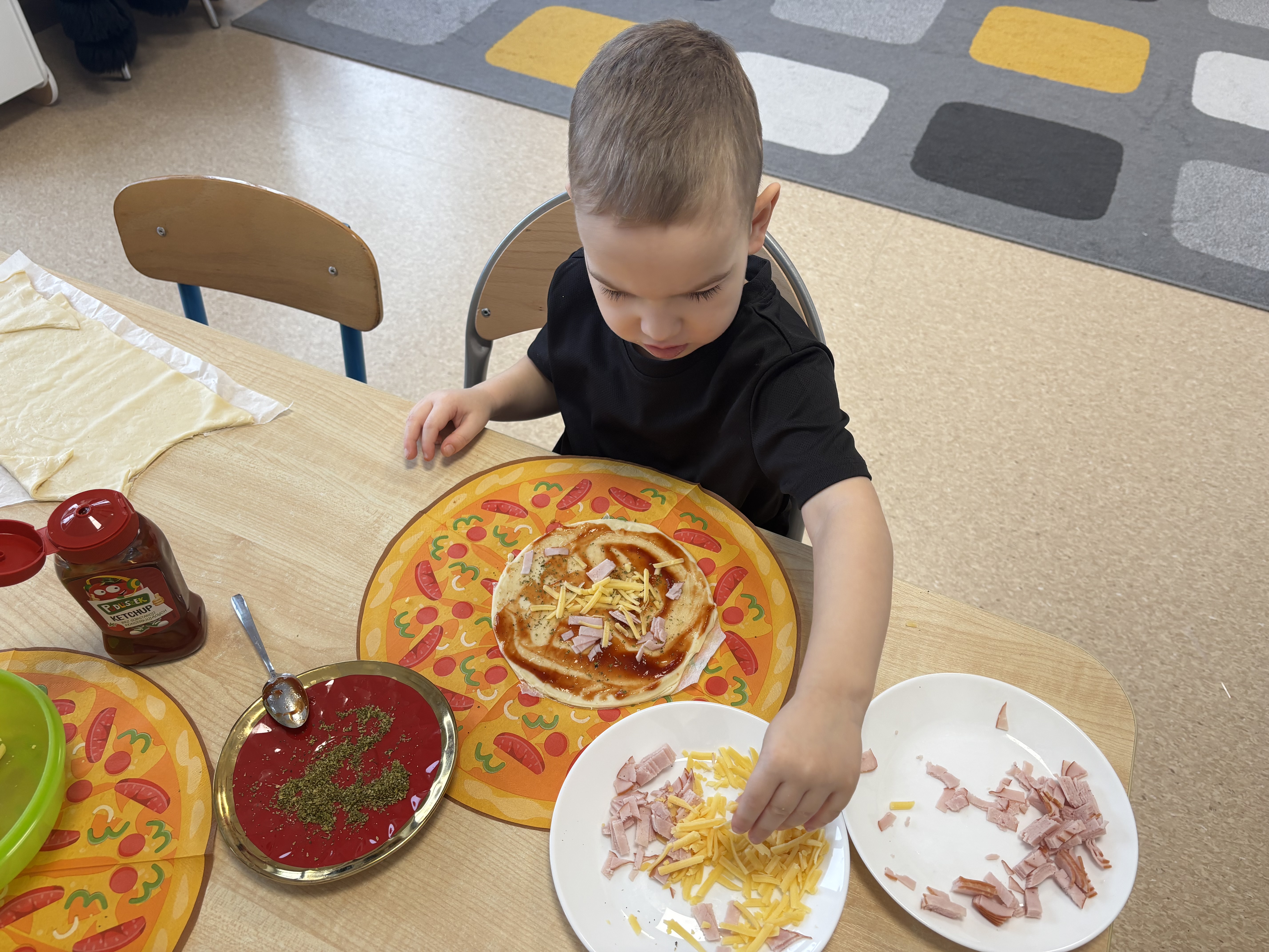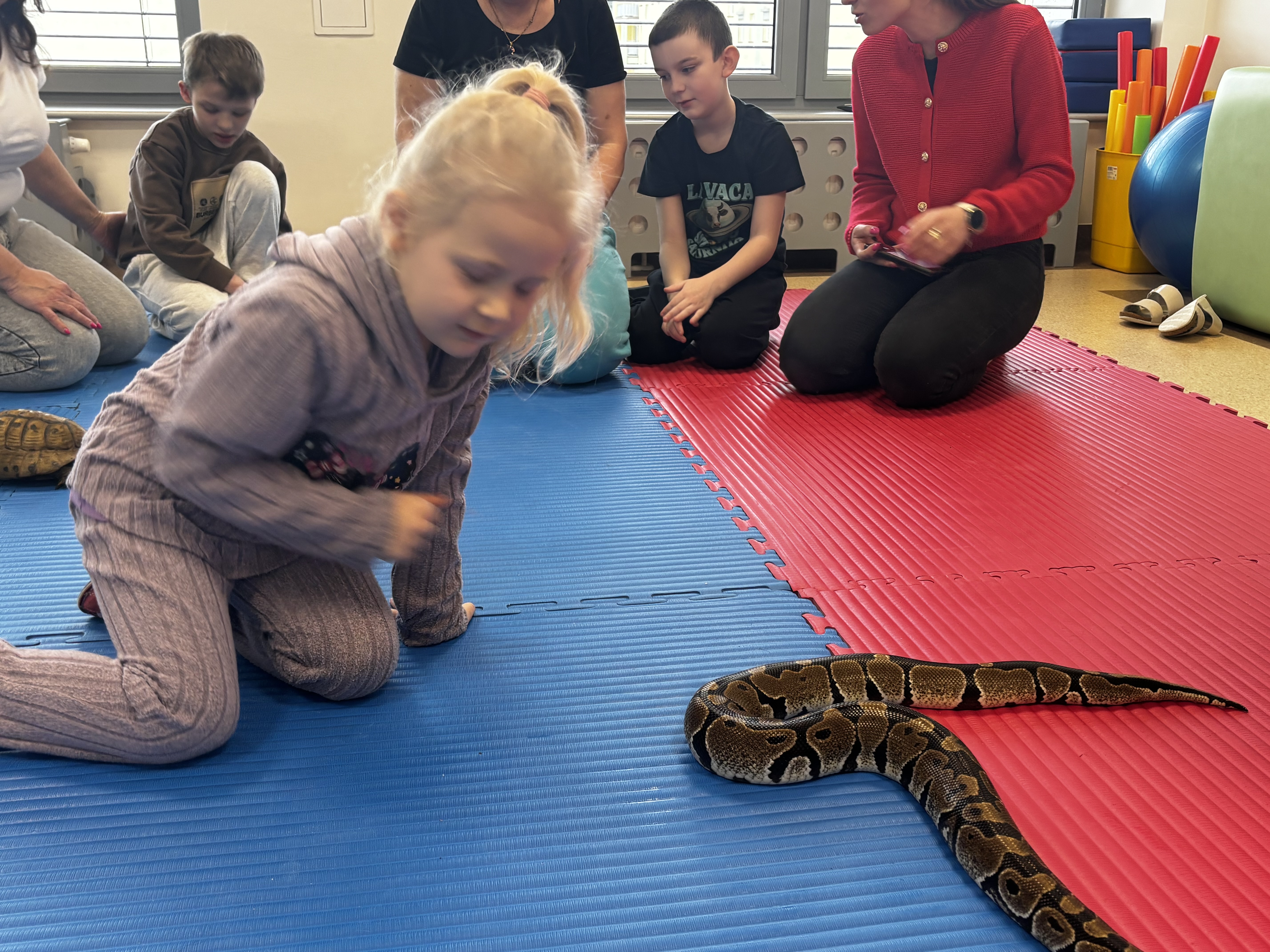 Dzień Pizzy był połączony ze spotkaniem z zoologiem oraz egzotycznymi zwierzętami. Dzieci uczestniczyły w wielozmysłowych aktywnościach – dotykały i oglądały składniki pizzy, poznając ich kolory, faktury i zapachy. Następnie miały okazję zobaczyć z bliska jaszczurkę, żółwia, węża oraz królika. Największym zainteresowaniem cieszyły się wąż i jaszczurka. Dzieci z dużym zaciekawieniem obserwowały zwierzęta oraz podejmowały próby głaskania i bezpośredniego kontaktu, zdobywając nowe doświadczenia sensoryczne w atmosferze bezpieczeństwa i akceptacji.