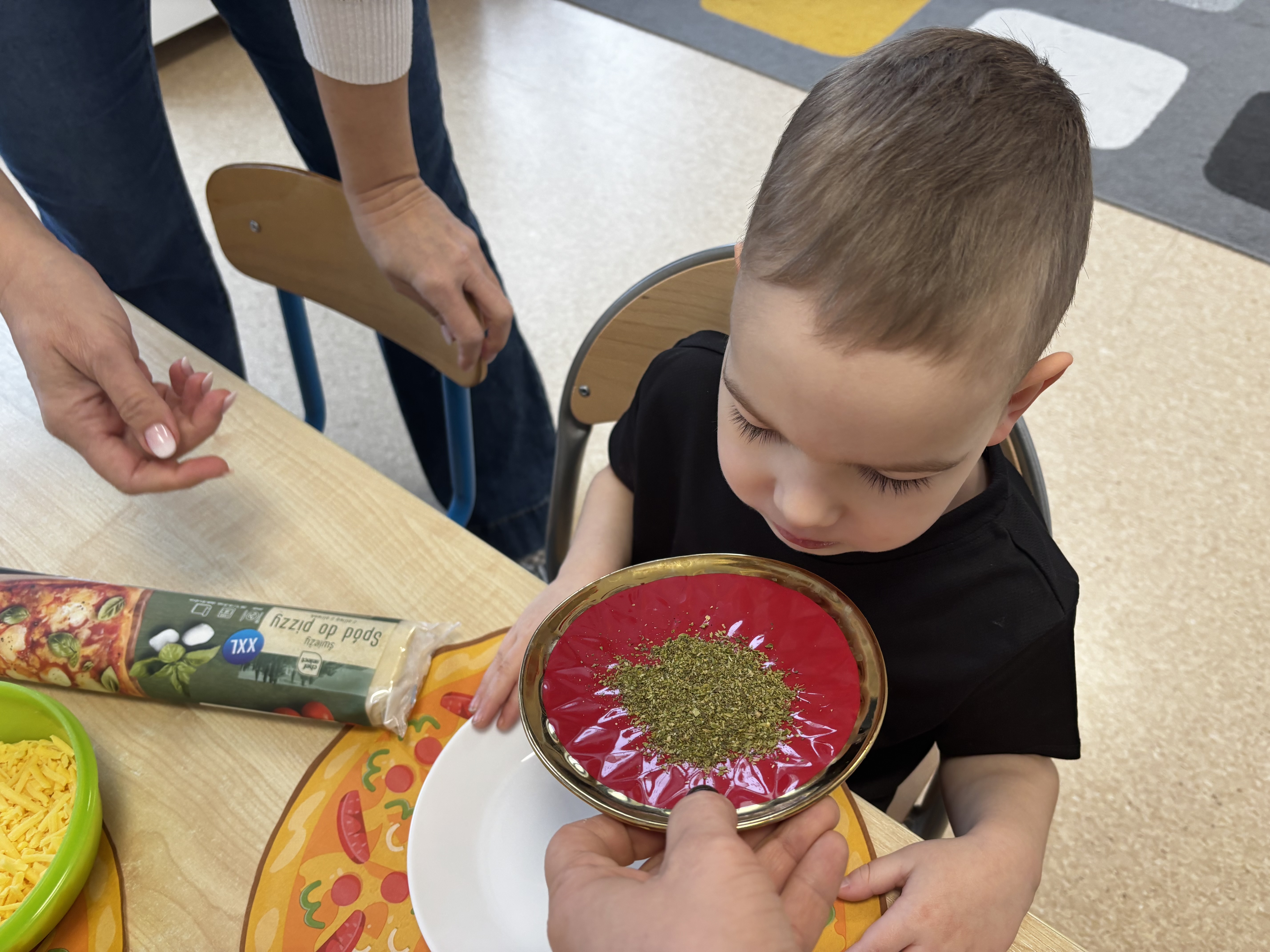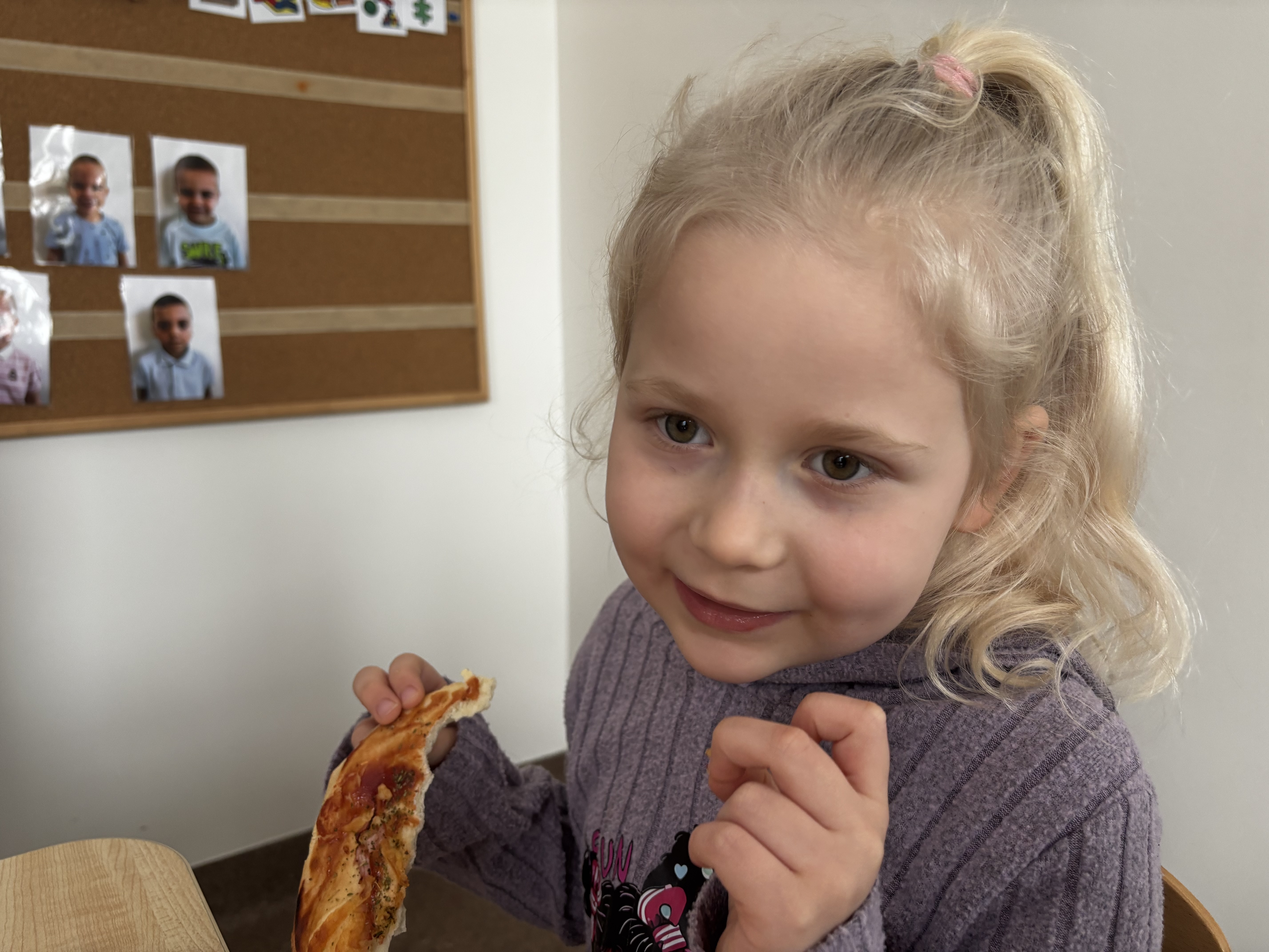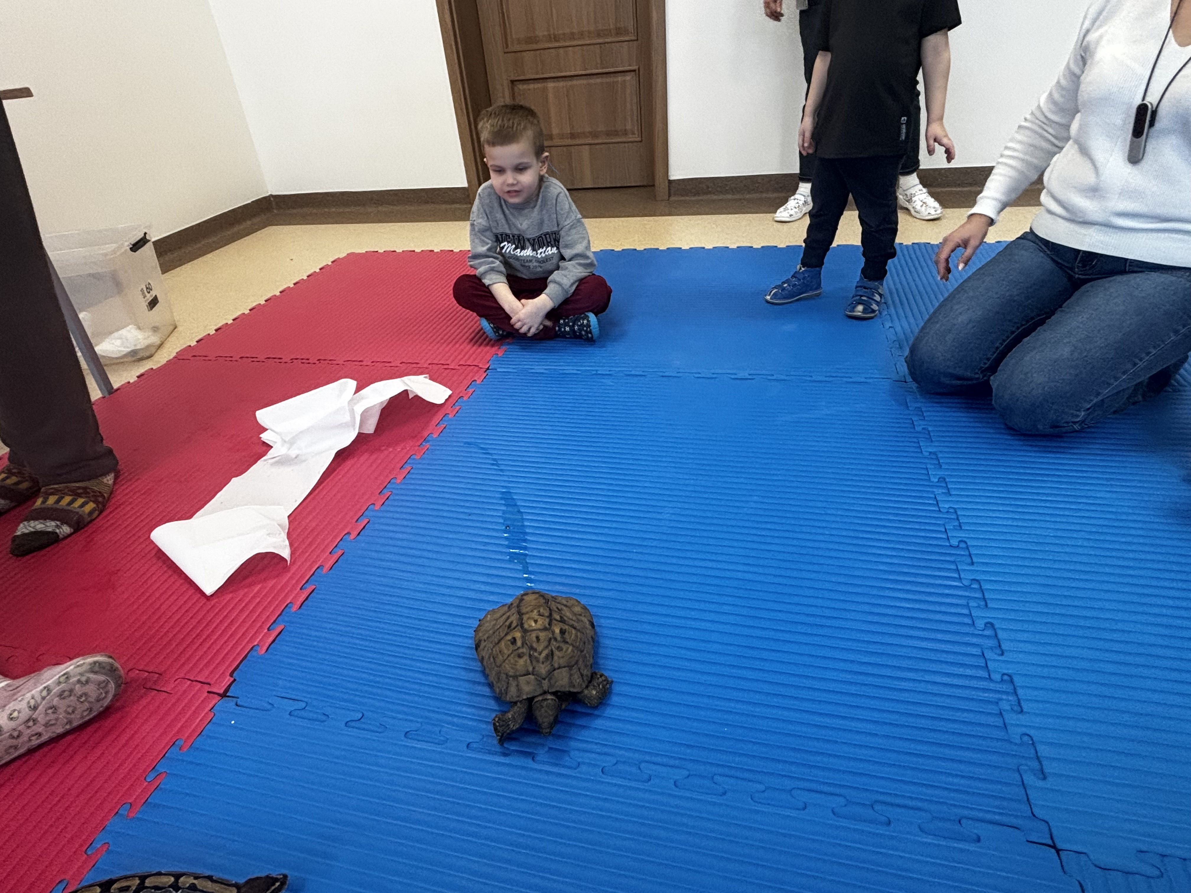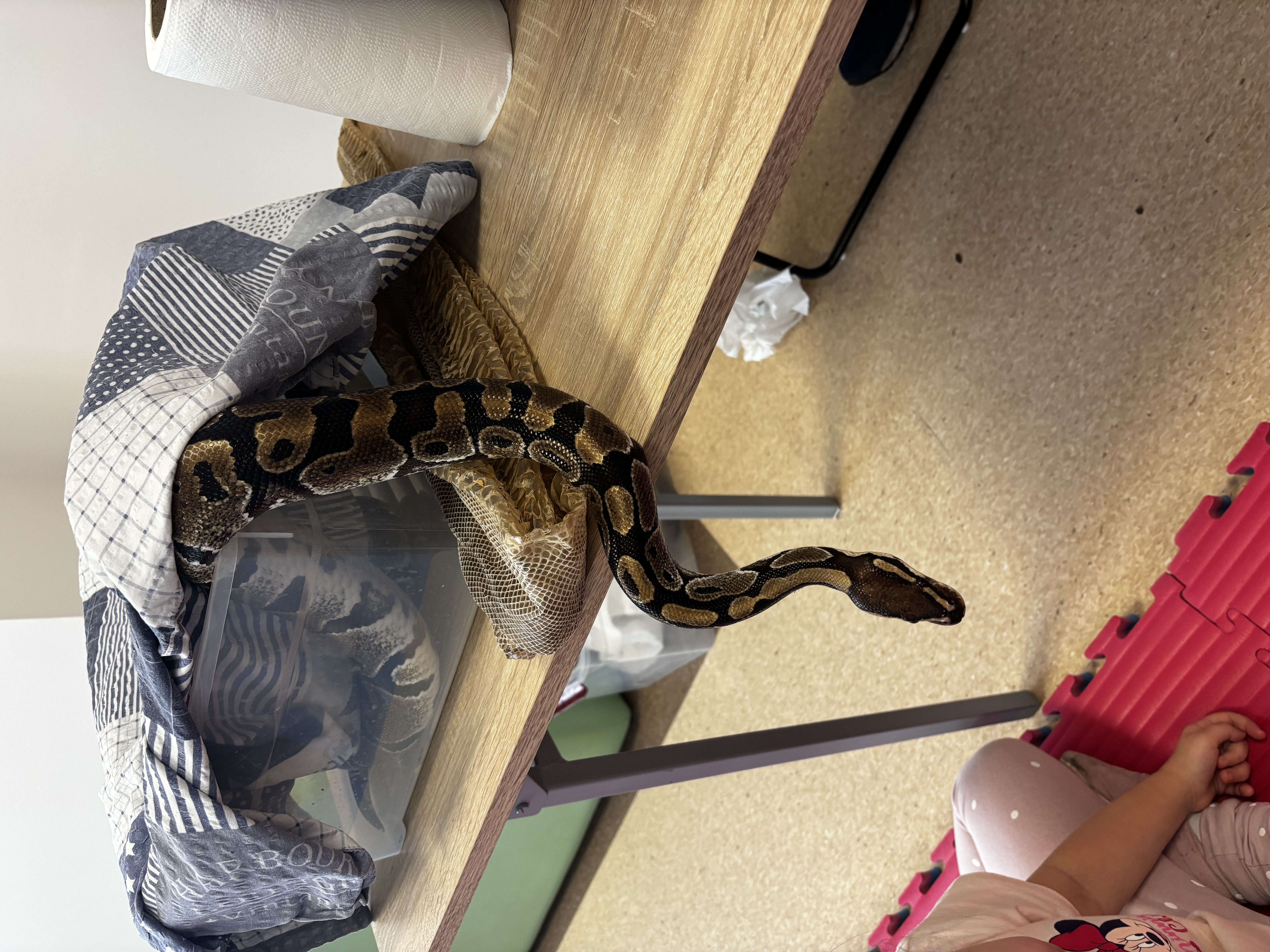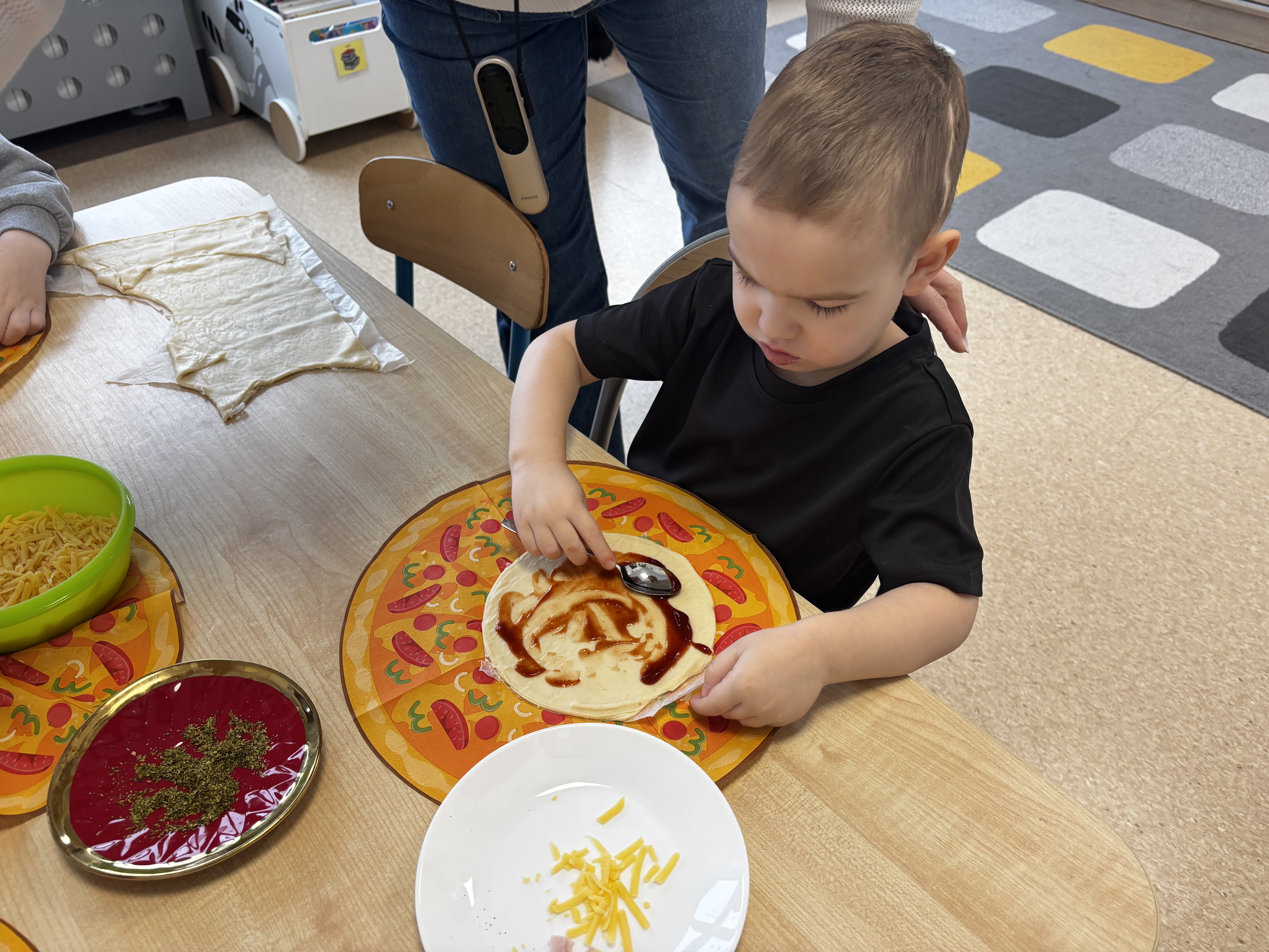 Dzień Pizzy był połączony ze spotkaniem z zoologiem oraz egzotycznymi zwierzętami. Dzieci uczestniczyły w wielozmysłowych aktywnościach – dotykały i oglądały składniki pizzy, poznając ich kolory, faktury i zapachy. Następnie miały okazję zobaczyć z bliska jaszczurkę, żółwia, węża oraz królika. Największym zainteresowaniem cieszyły się wąż i jaszczurka. Dzieci z dużym zaciekawieniem obserwowały zwierzęta oraz podejmowały próby głaskania i bezpośredniego kontaktu, zdobywając nowe doświadczenia sensoryczne w atmosferze bezpieczeństwa i akceptacji.