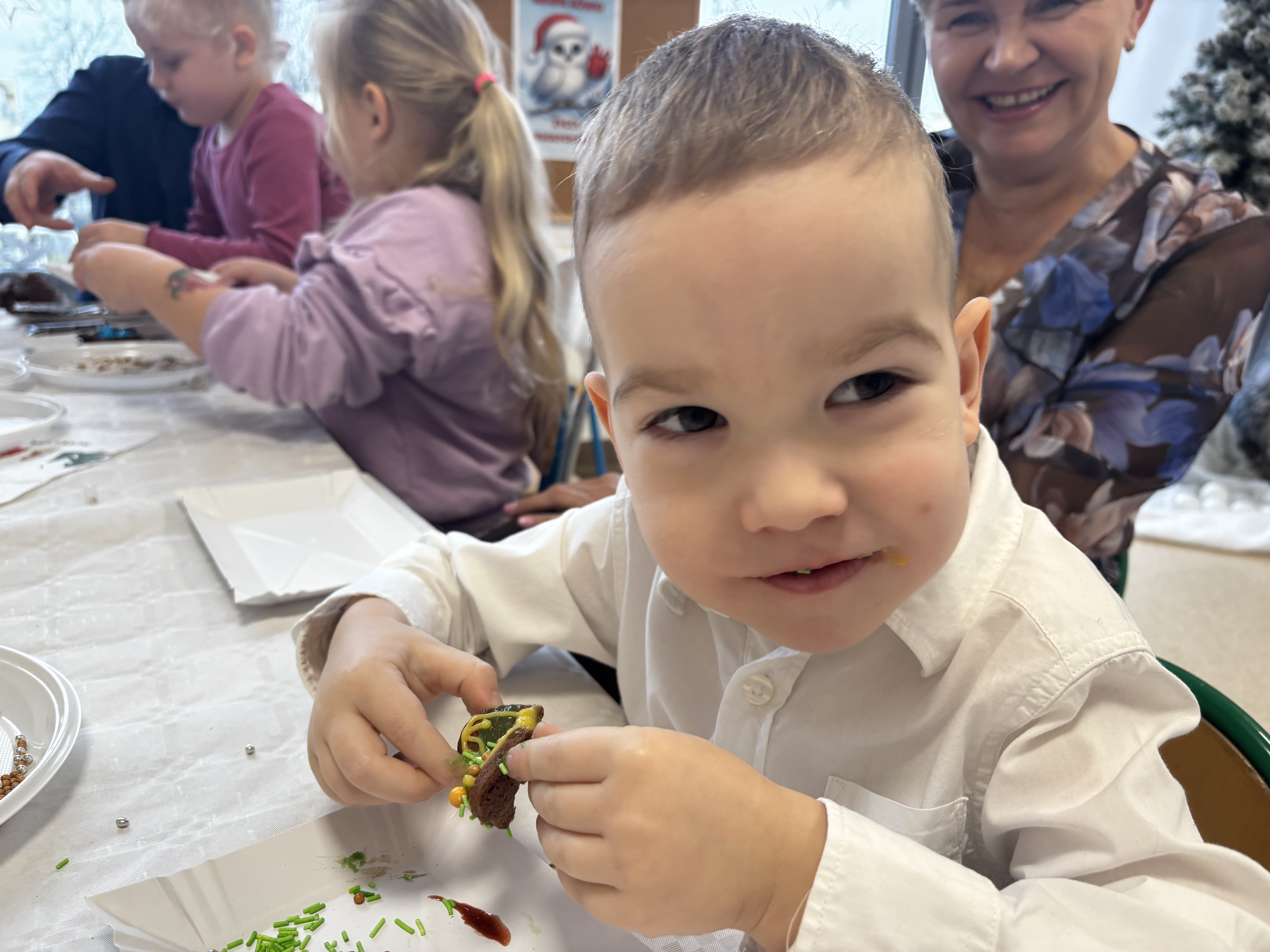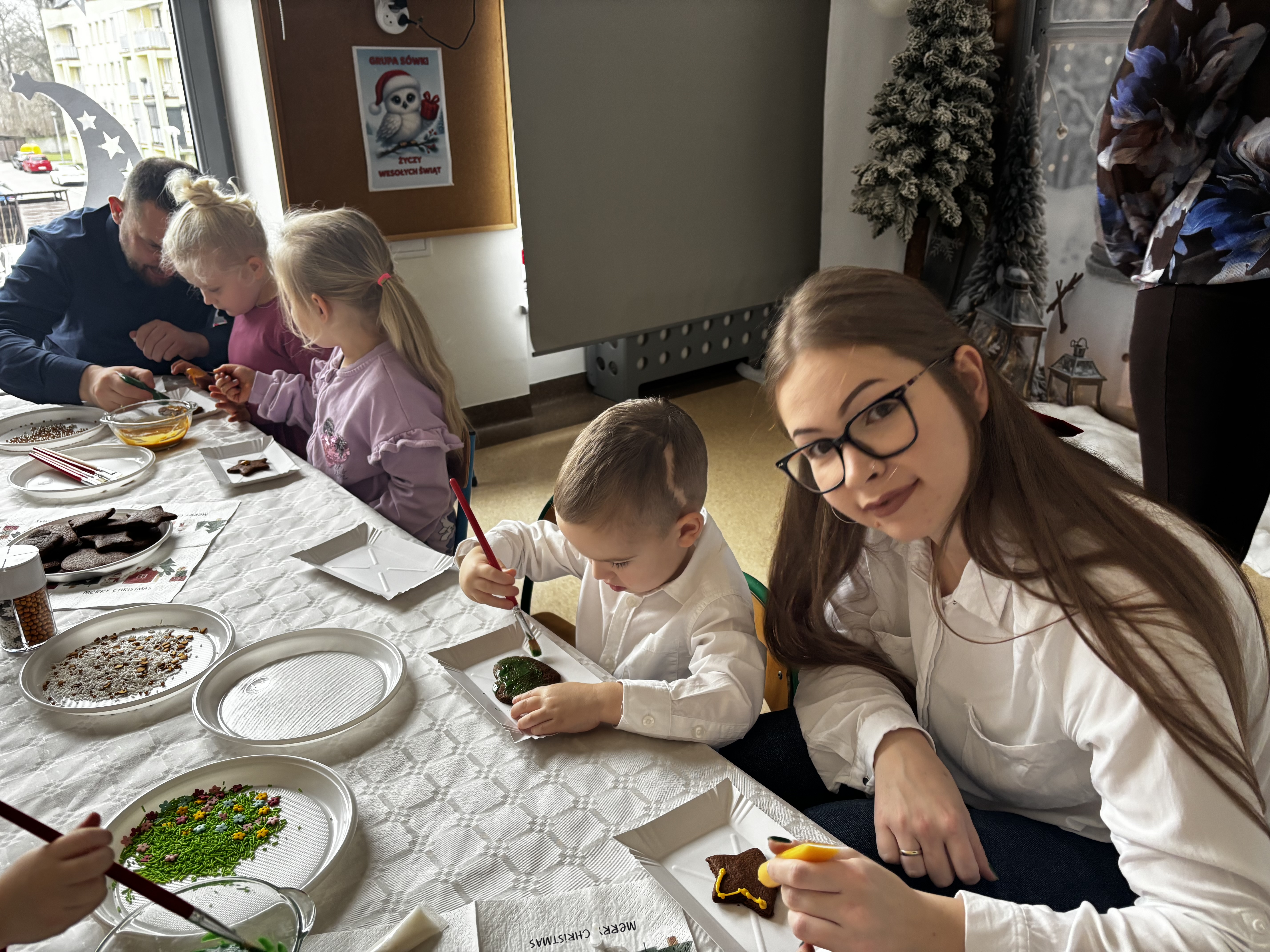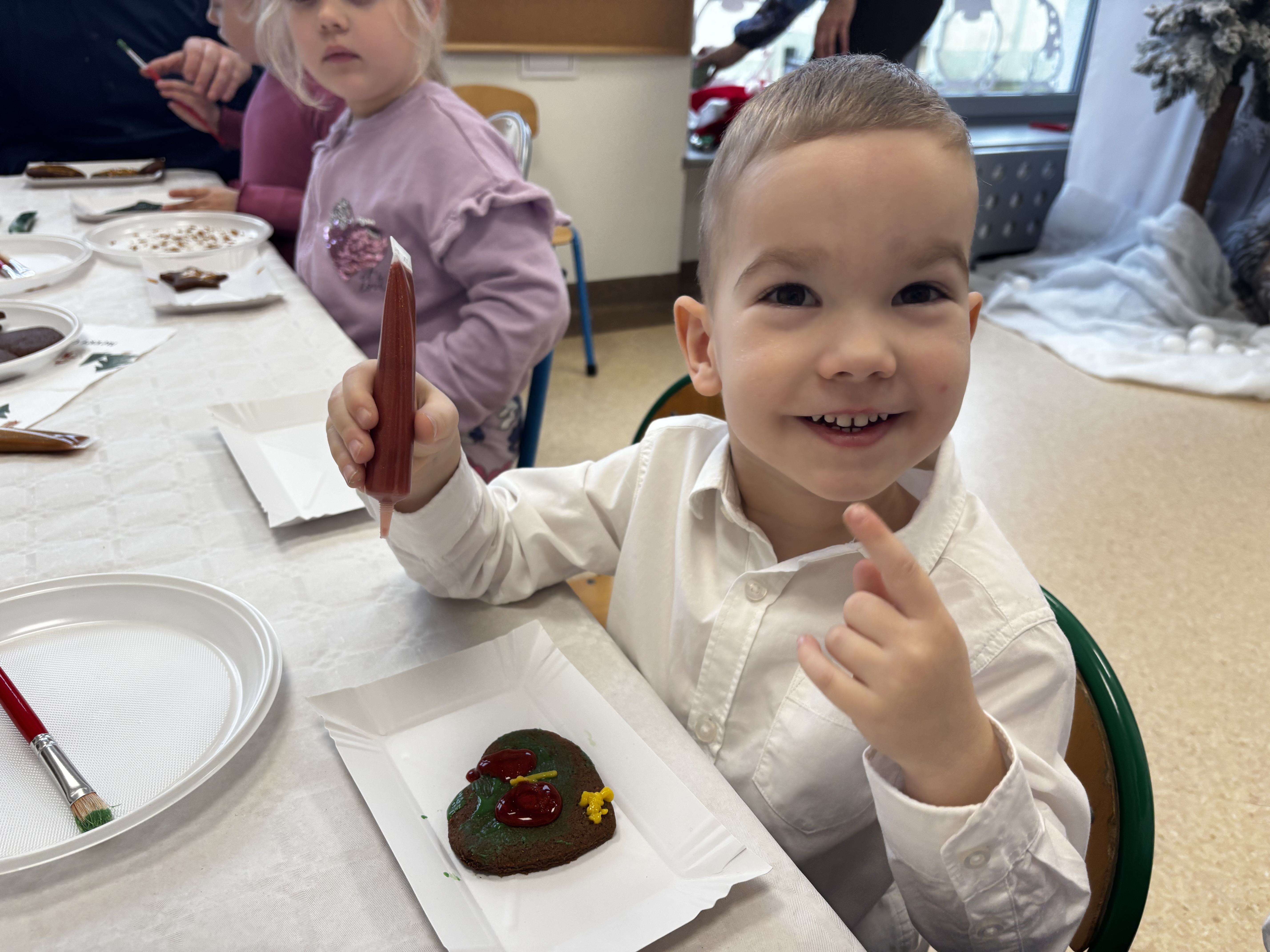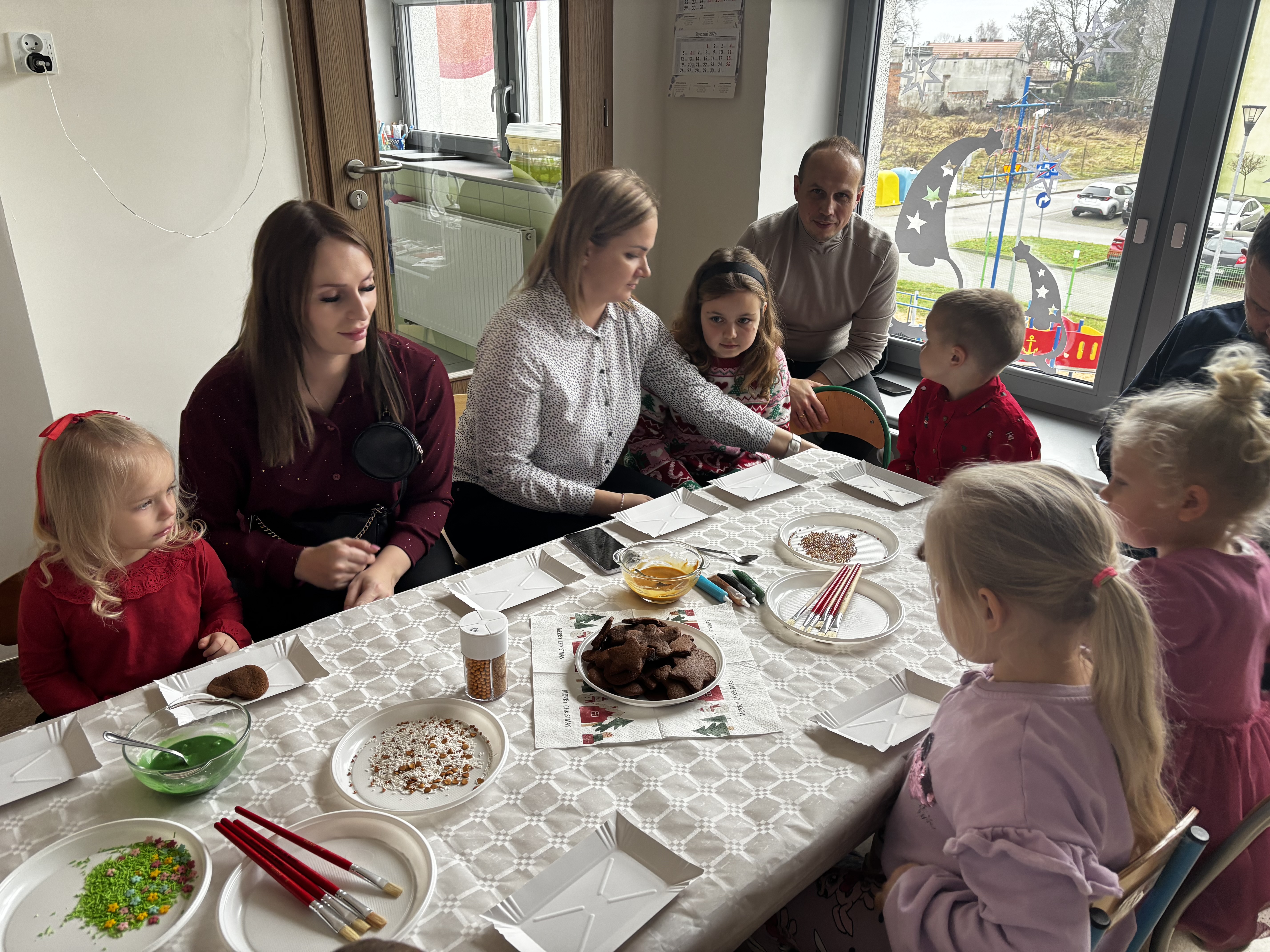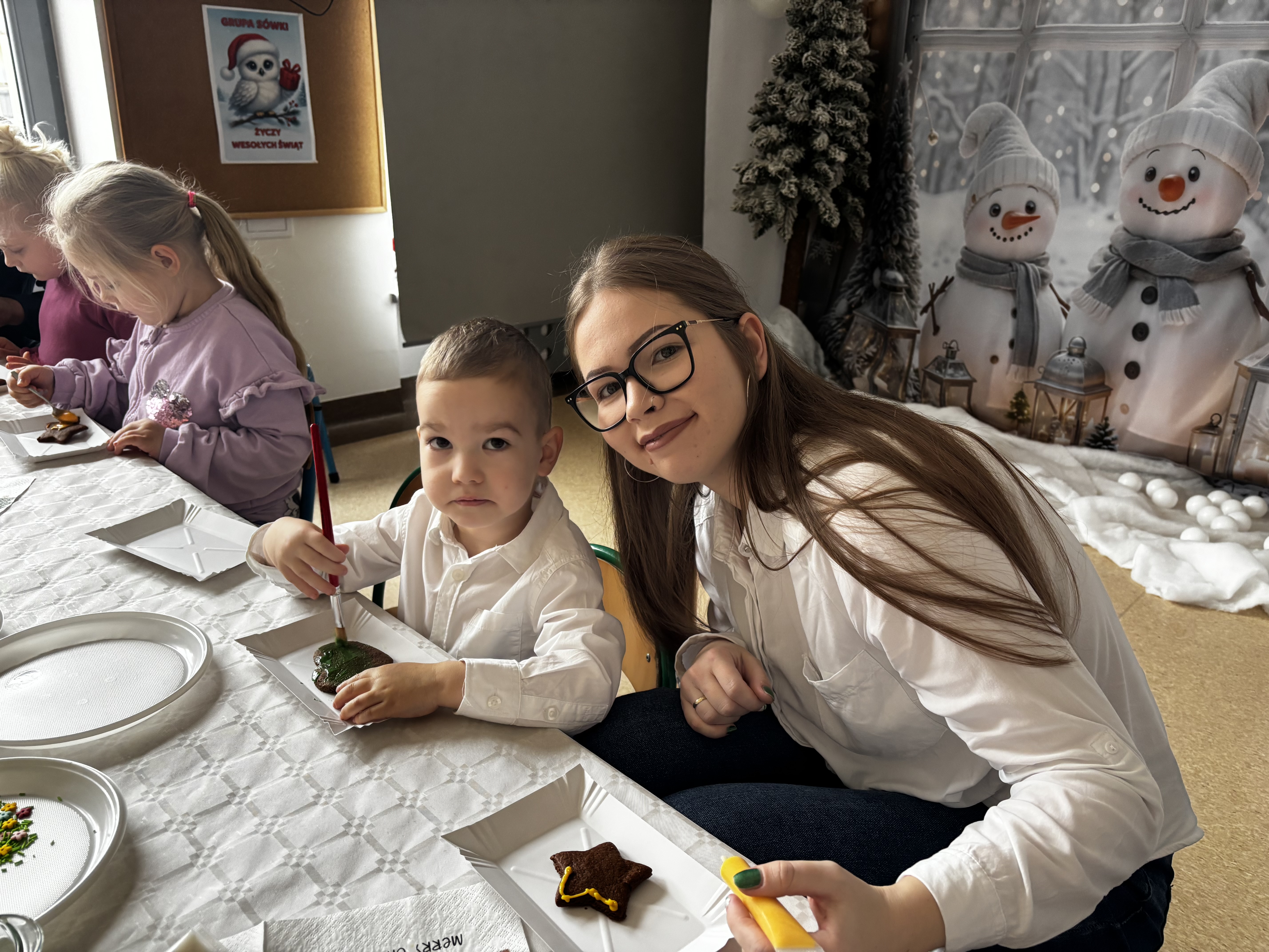 W naszej grupie odbyło się wyjątkowe spotkanie wigilijne z rodzicami. Dzieci zaprezentowały świąteczny występ, który wzruszył i zachwycił wszystkich obecnych. Panie są niezwykle dumne z Sówek-z ich odwagi, zaangażowania i radości, z jaką wystąpili przed rodzicami.Po części artystycznej odbyły się rodzinne warsztaty ozdabiania pierników. To był czas pełen twórczej zabawy, zapachu korzennych przypraw i wspólnego tworzenia małych, słodkich dzieł sztuki. W trakcie spotkania odbyła się także rodzinna sesja zdjęciowa, która stworzyła piękną pamiątkę tego wyjątkowego dnia. Na rodziców czekały również drobne upominki oraz świąteczny poczęstunek.Spotkanie przebiegło w rodzinnej, podniosłej i radosnej atmosferze, wypełnionej uśmiechami i ciepłymi rozmowami. Dziękujemy wszystkim za obecność i wspólne świętowanie!