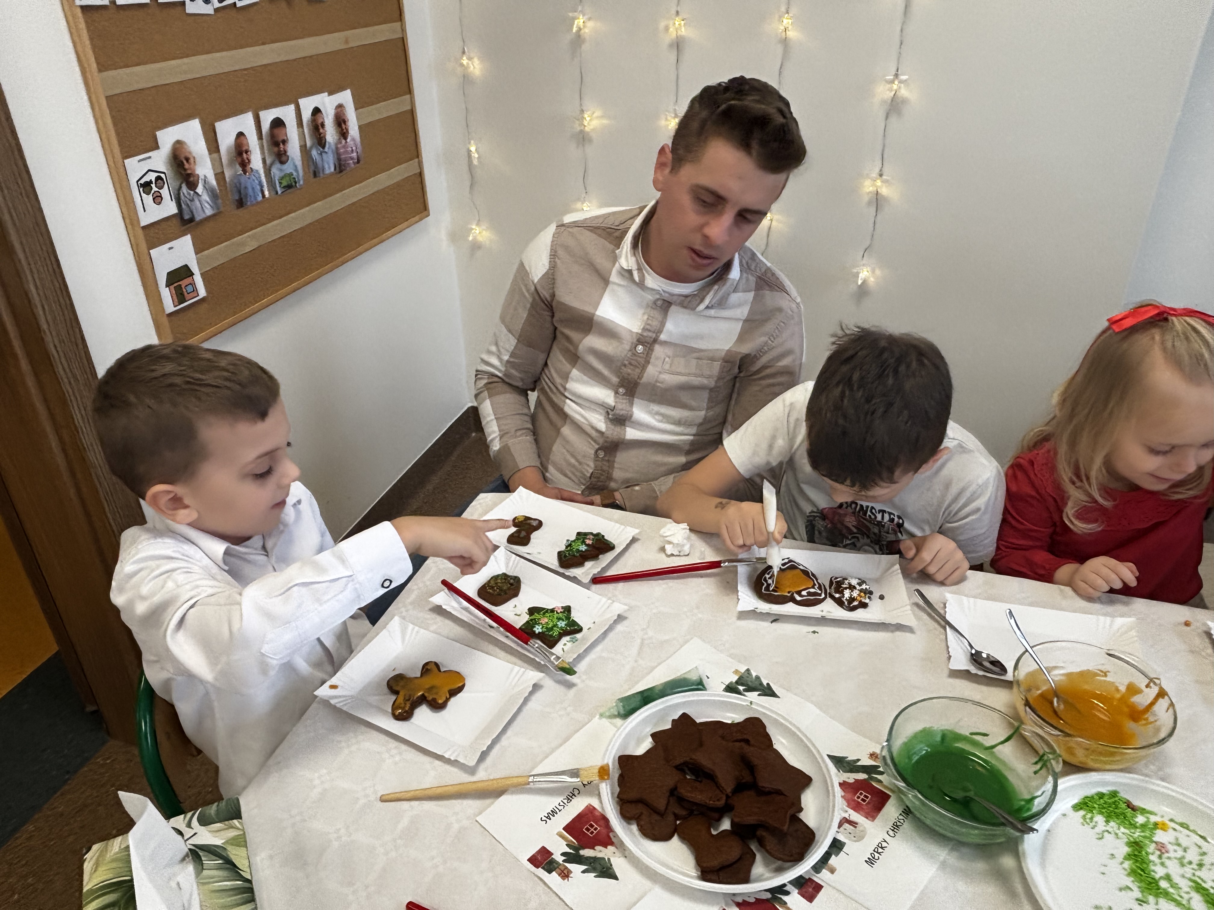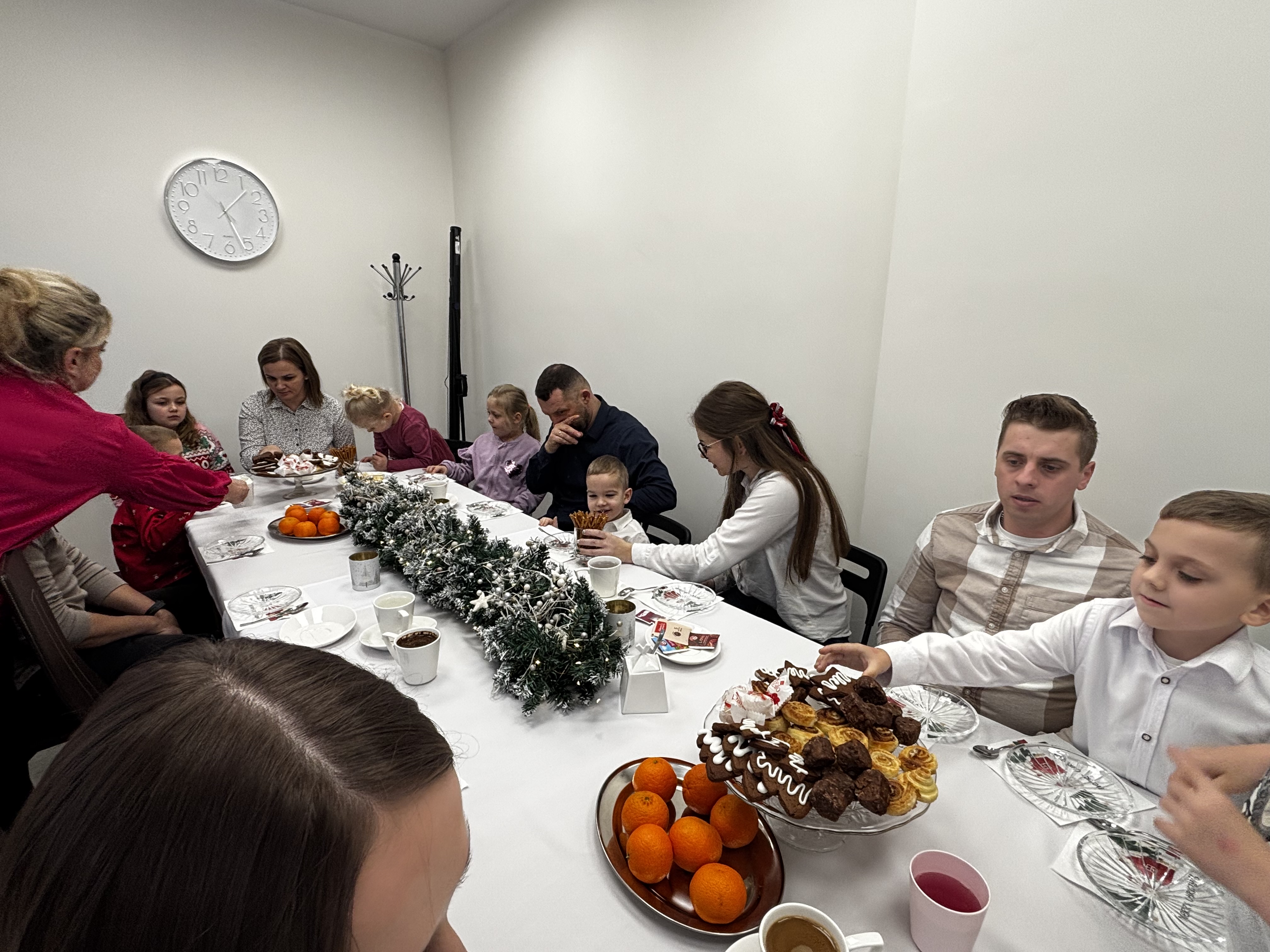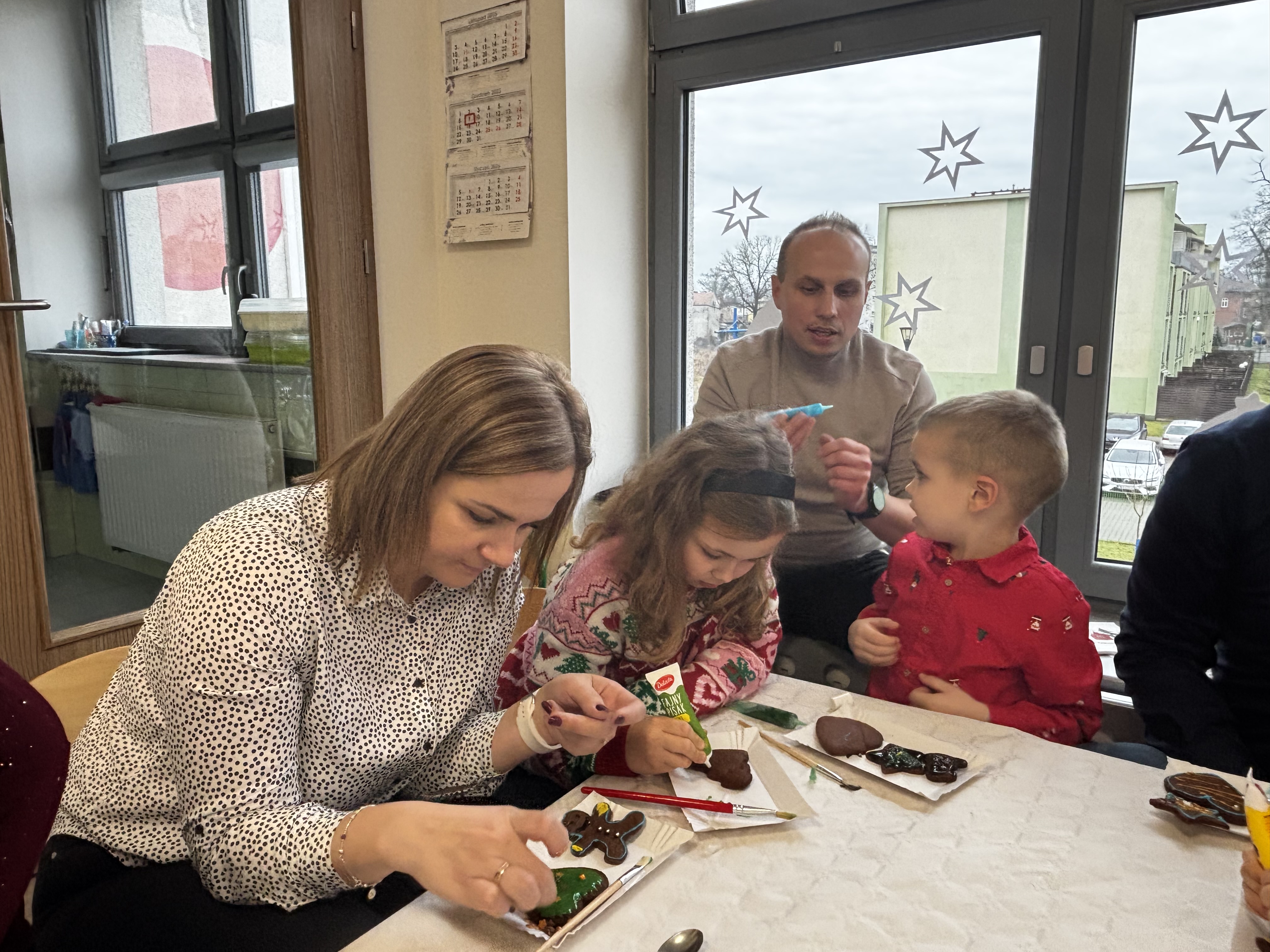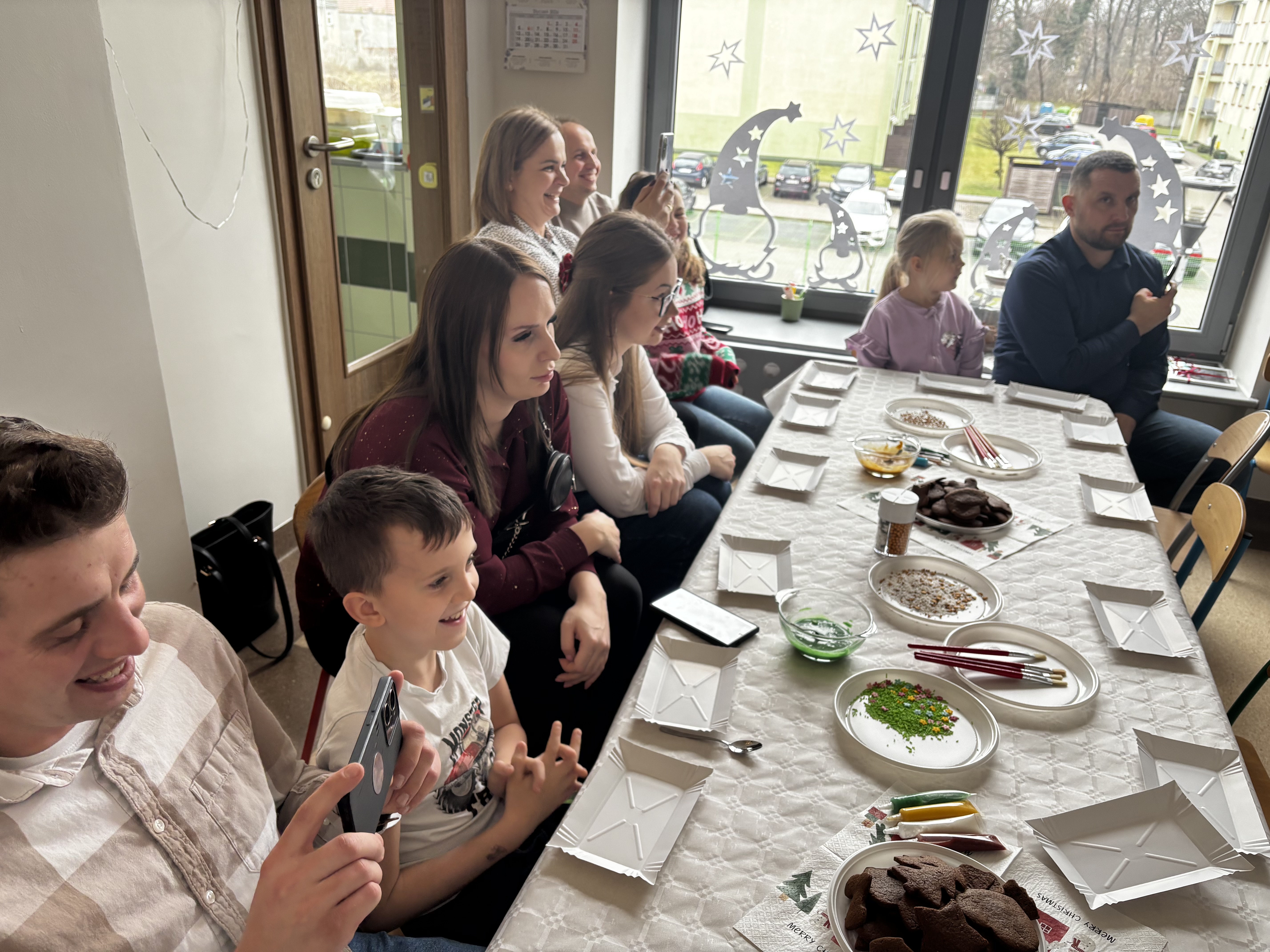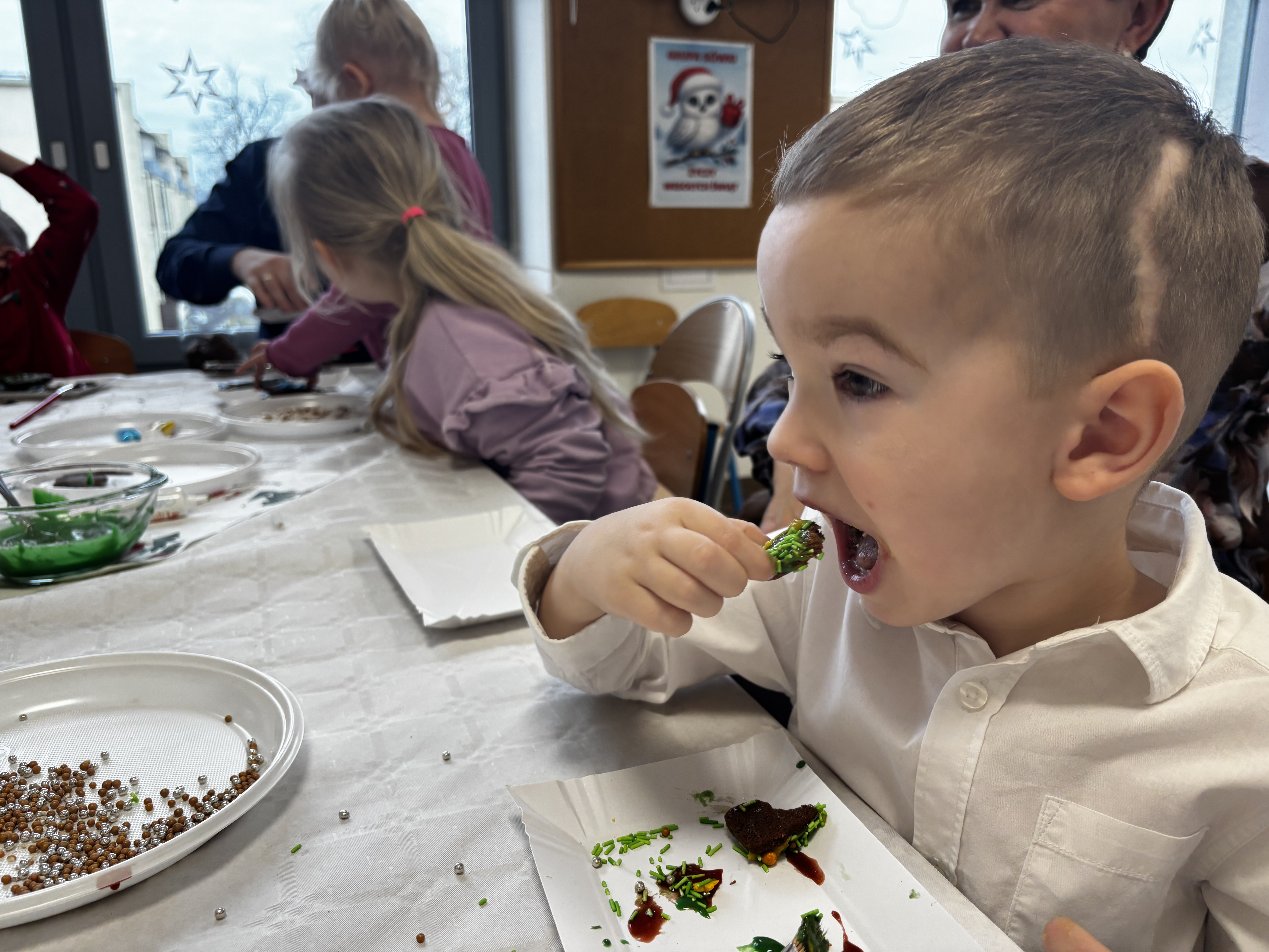 W naszej grupie odbyło się wyjątkowe spotkanie wigilijne z rodzicami. Dzieci zaprezentowały świąteczny występ, który wzruszył i zachwycił wszystkich obecnych. Panie są niezwykle dumne z Sówek-z ich odwagi, zaangażowania i radości, z jaką wystąpili przed rodzicami.Po części artystycznej odbyły się rodzinne warsztaty ozdabiania pierników. To był czas pełen twórczej zabawy, zapachu korzennych przypraw i wspólnego tworzenia małych, słodkich dzieł sztuki. W trakcie spotkania odbyła się także rodzinna sesja zdjęciowa, która stworzyła piękną pamiątkę tego wyjątkowego dnia. Na rodziców czekały również drobne upominki oraz świąteczny poczęstunek.Spotkanie przebiegło w rodzinnej, podniosłej i radosnej atmosferze, wypełnionej uśmiechami i ciepłymi rozmowami. Dziękujemy wszystkim za obecność i wspólne świętowanie!