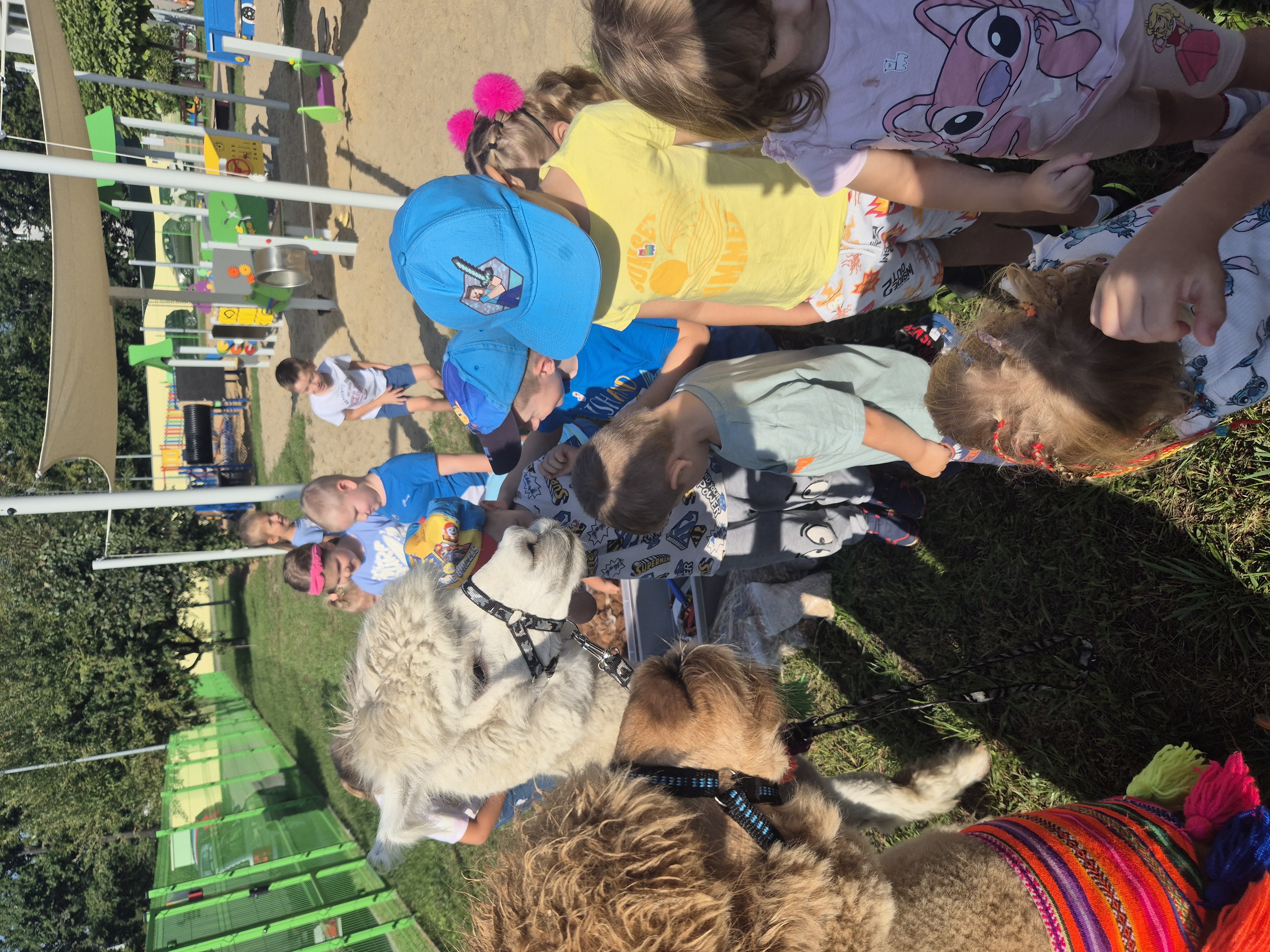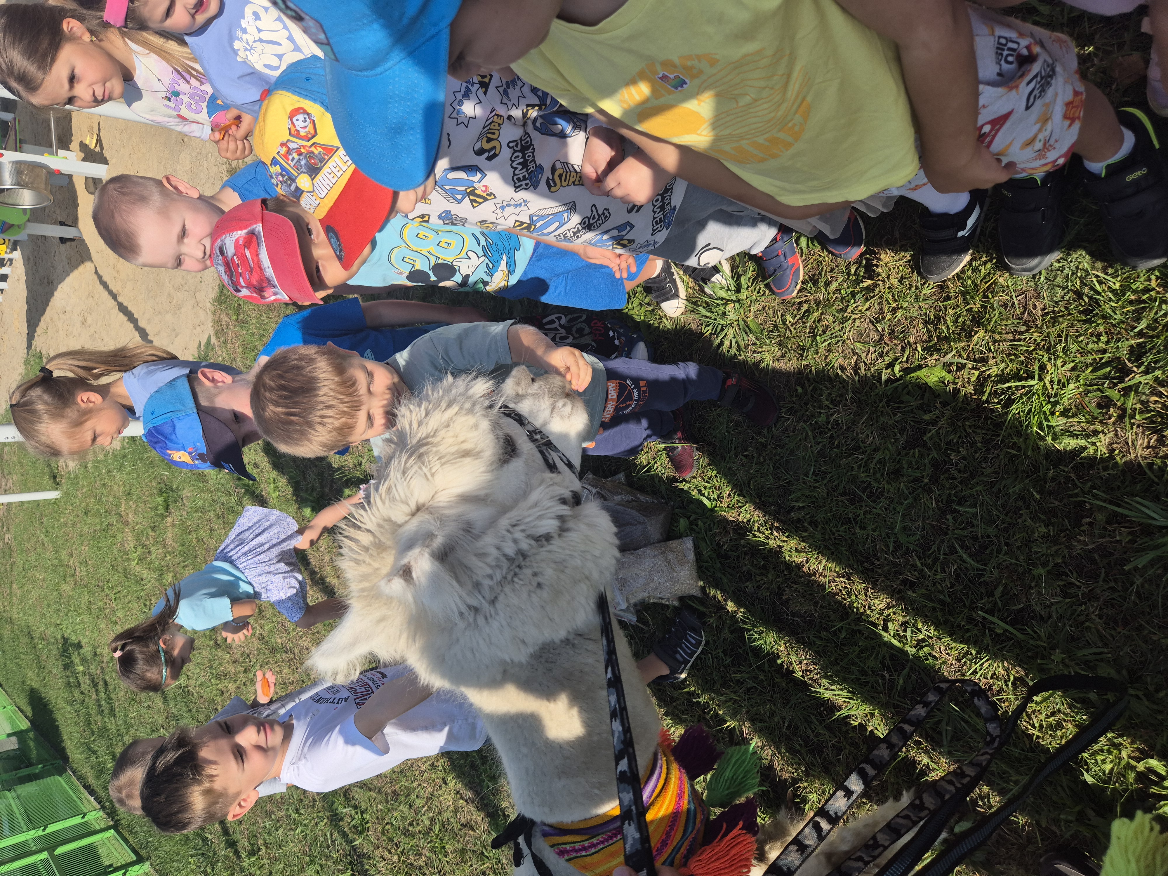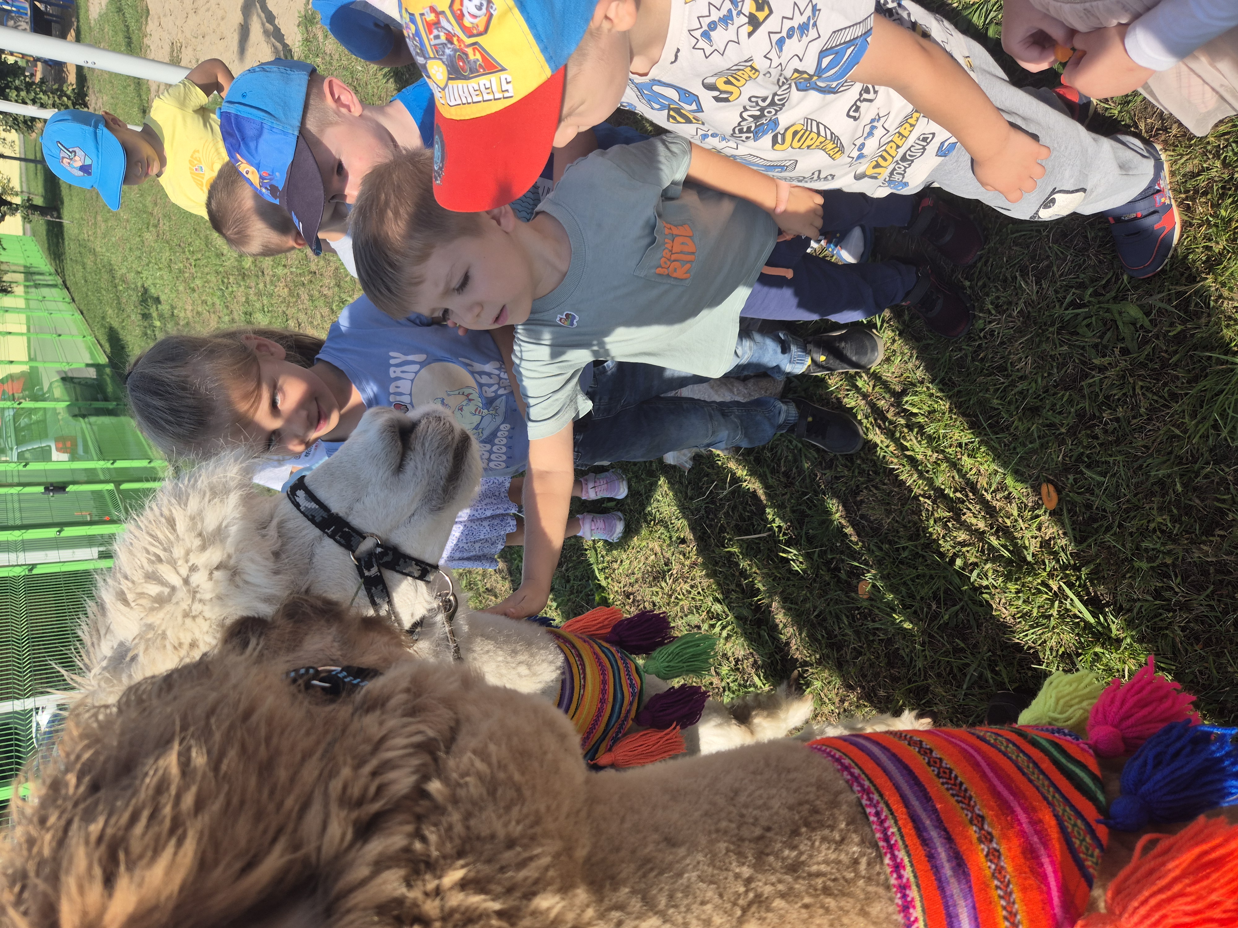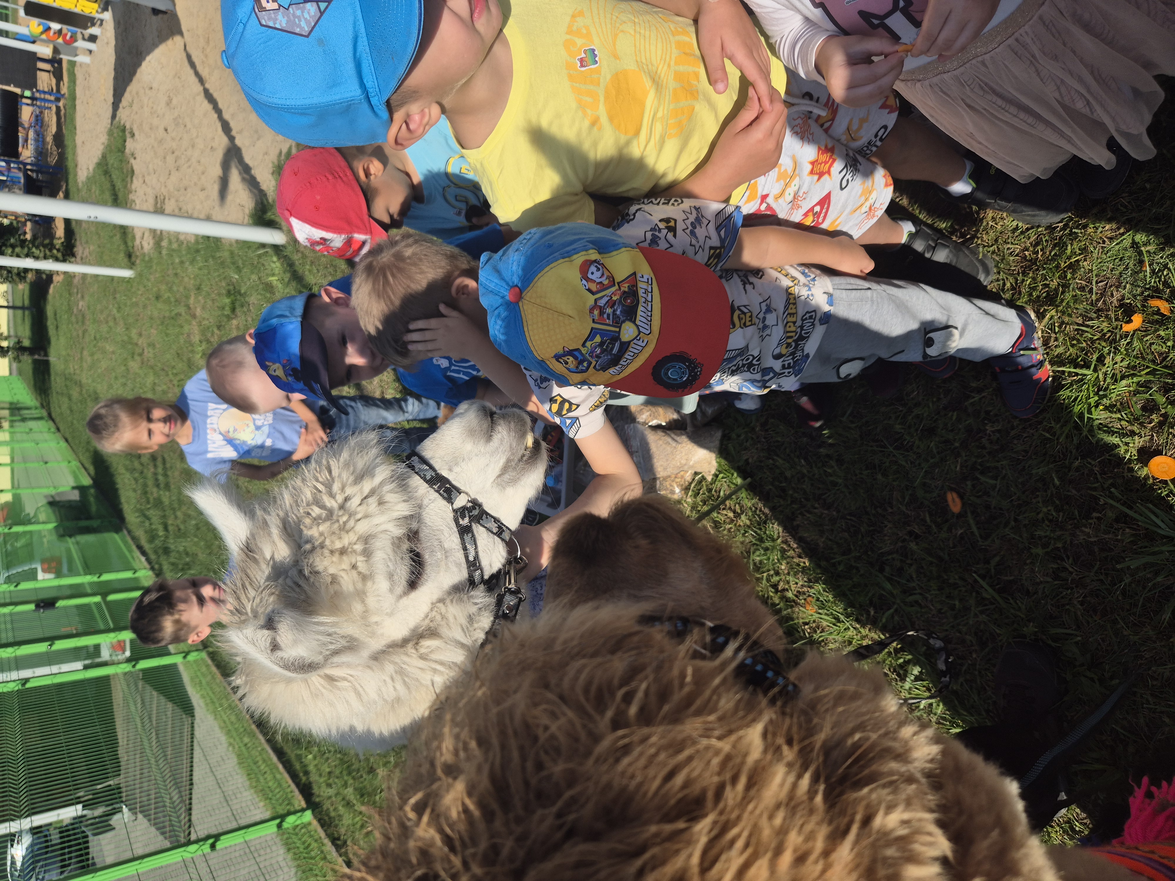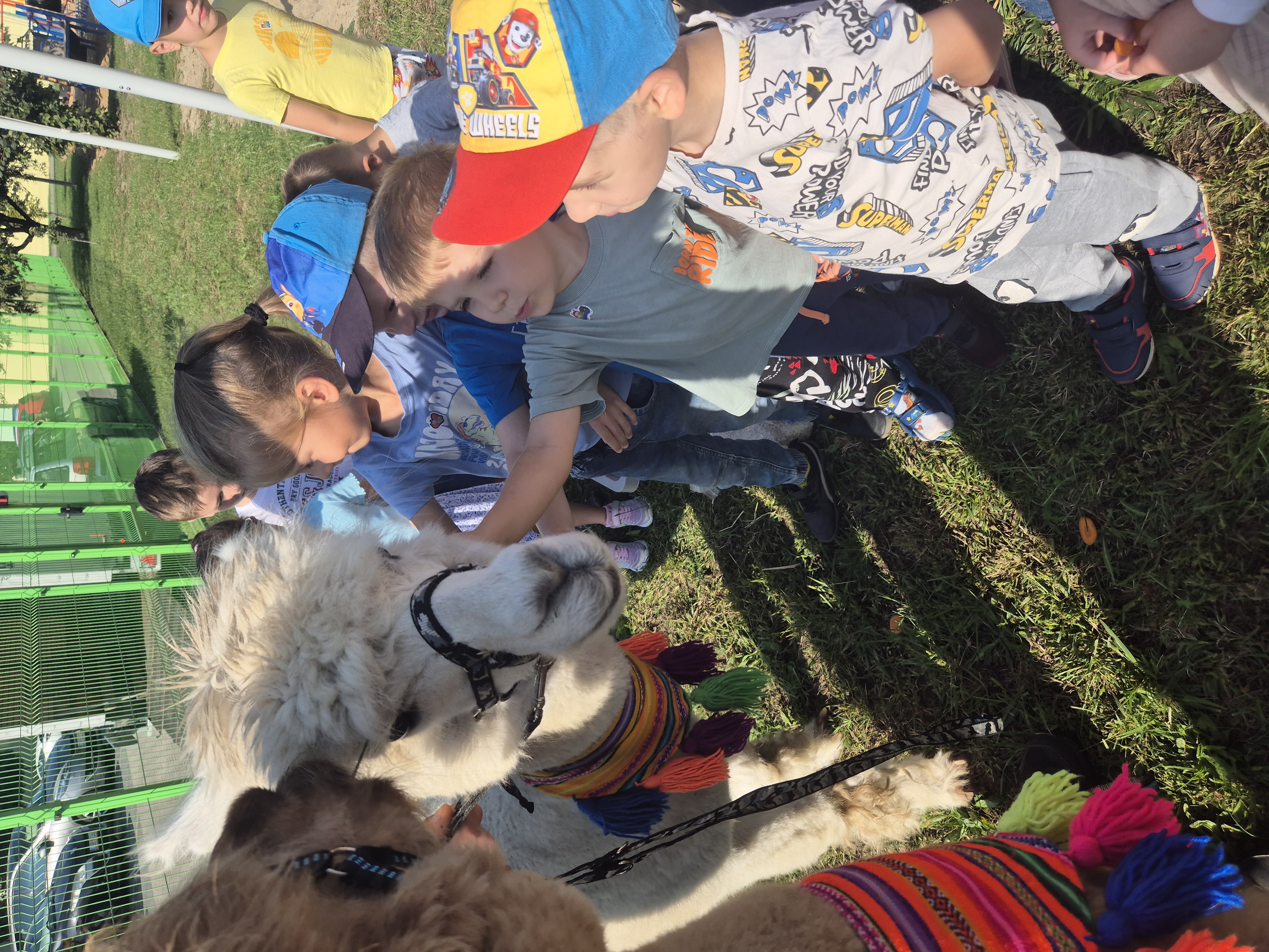 10 września nasze przedszkole odwiedziły alpaki. Alpaki, to zwierzęta o bardzo łagodnym usposobieniu. Są płochliwe i delikatne, zupełnie pozbawione agresji. Szczególnie pozytywnie nastawione są do dzieci. Głaskanie i przytulanie alpak pomaga dzieciom rozluźnić się i otworzyć. Wszystkie przedszkolaki były zachwycone ich wizytą. Śnieżek i Leoś to cudowne alpaki. Spotkanie z nimi było bardzo ciekawą lekcją edukacyjną, podczas której przedszkolaki poznały życie i zwyczaje tych przemiłych zwierząt. Dzieci wysłuchały wielu ciekawostek o alpakach. Każdy miał możliwość nakarmienia zwierzątka jego ulubionym przysmakiem – marchewką.