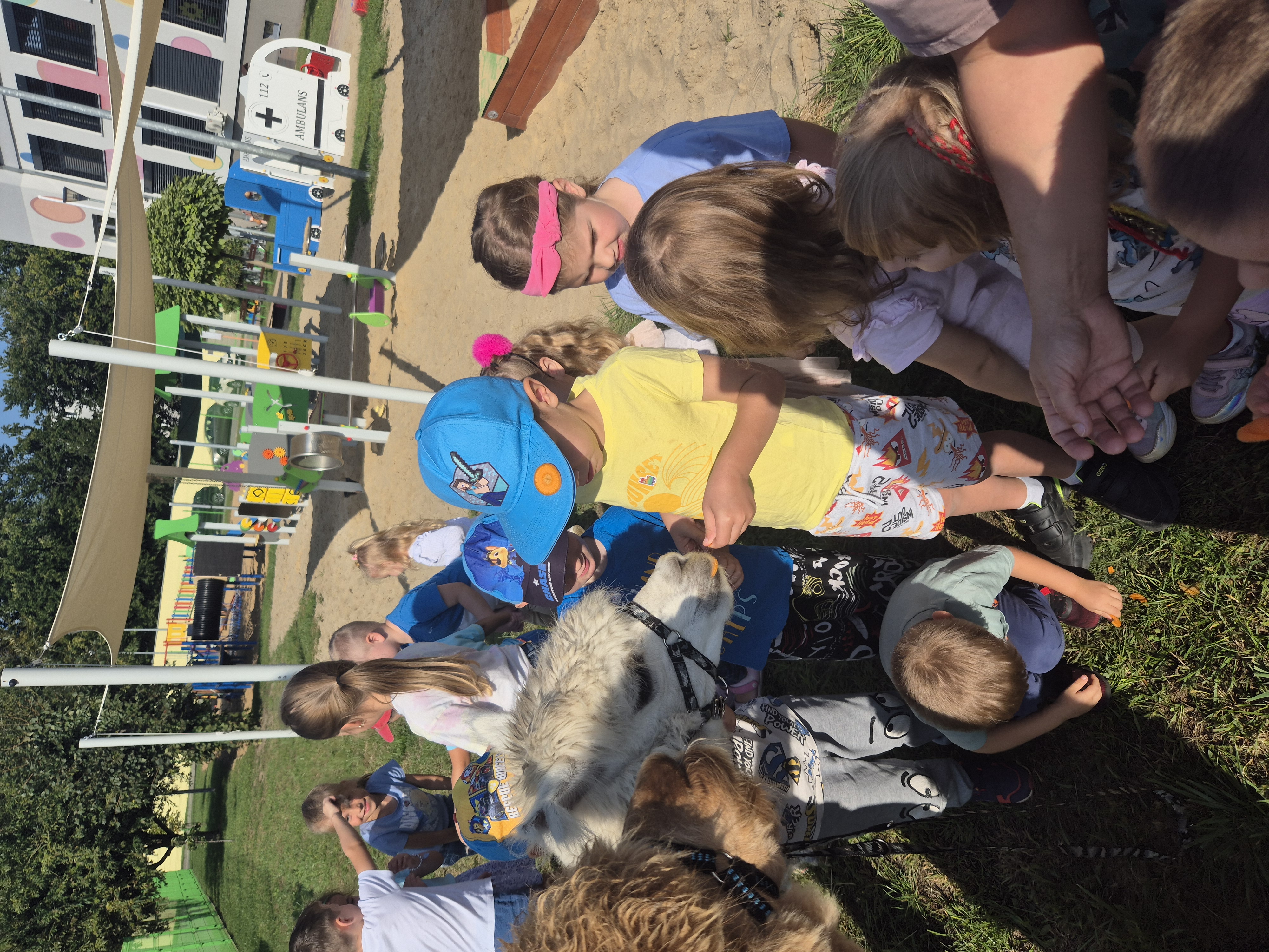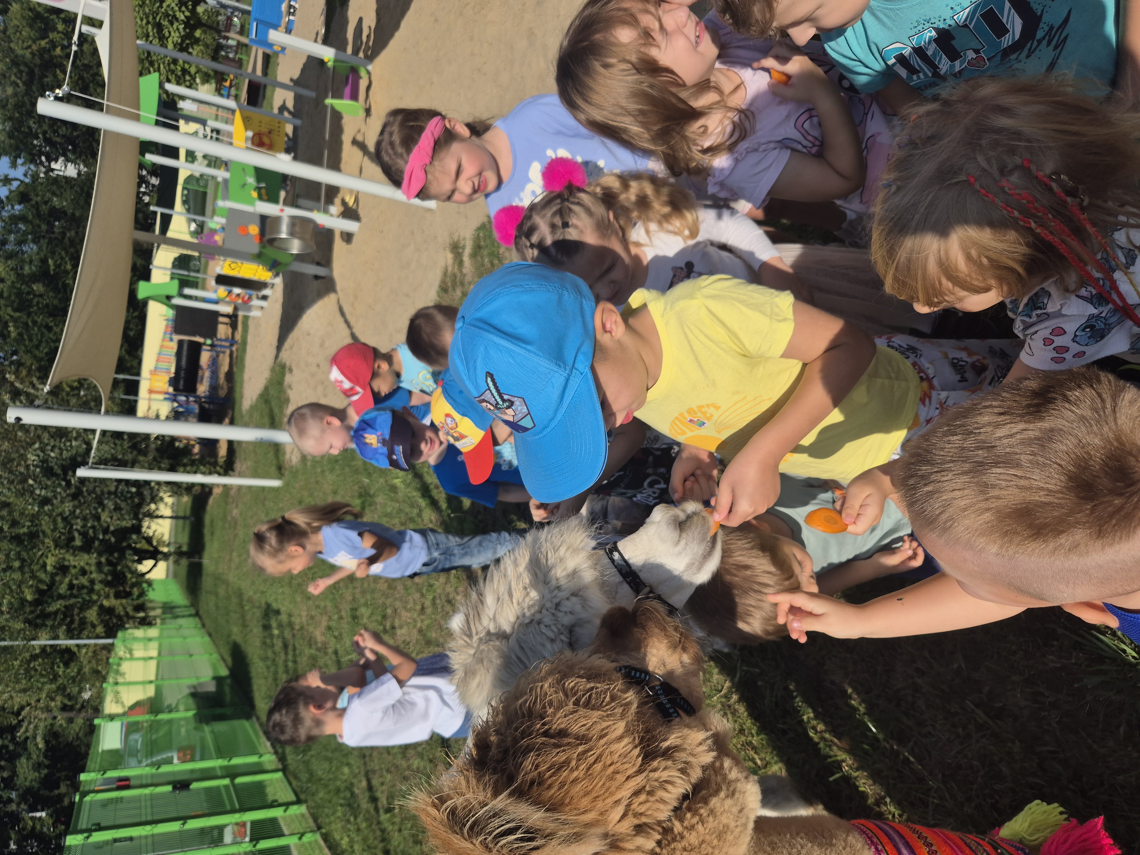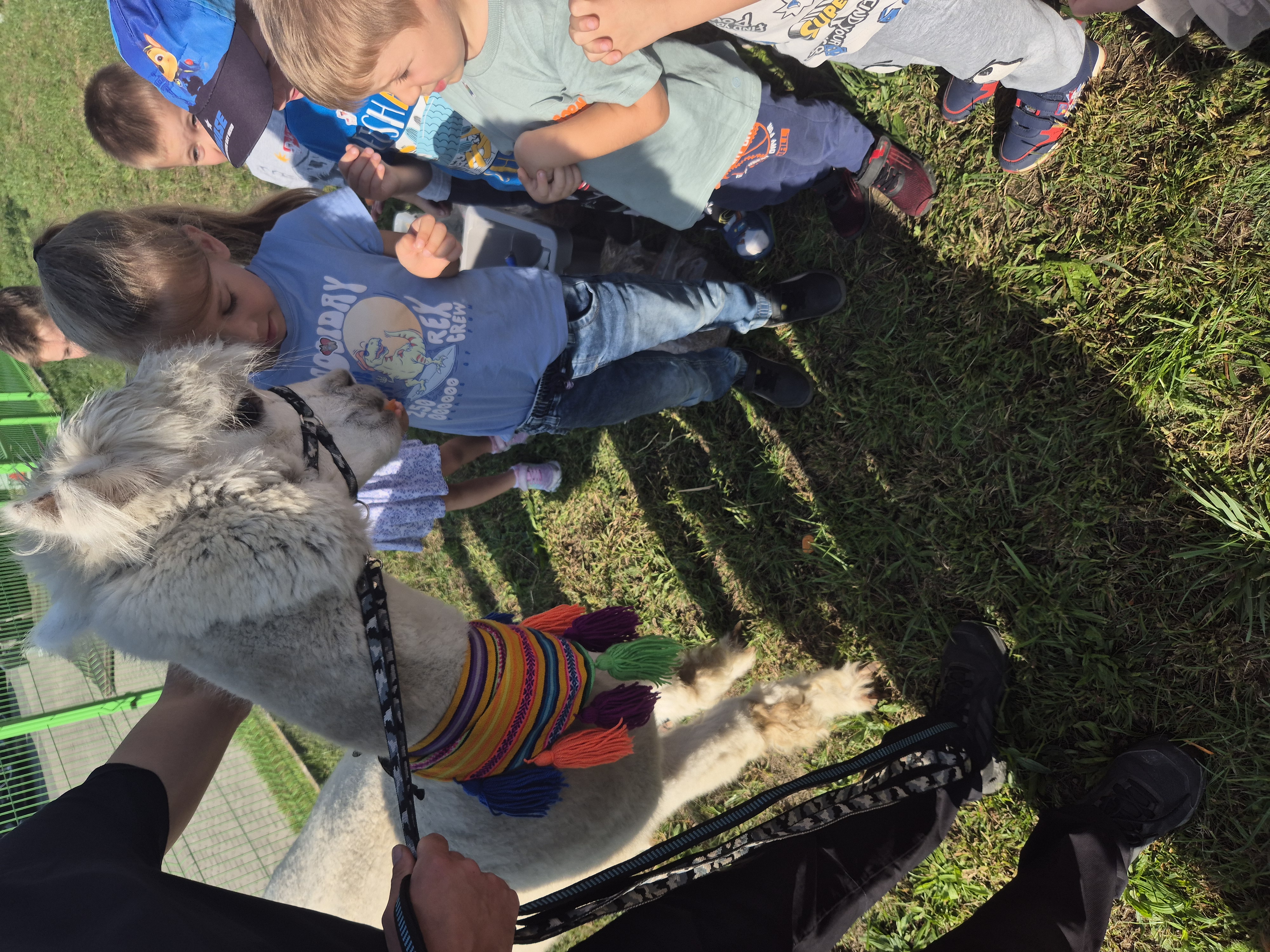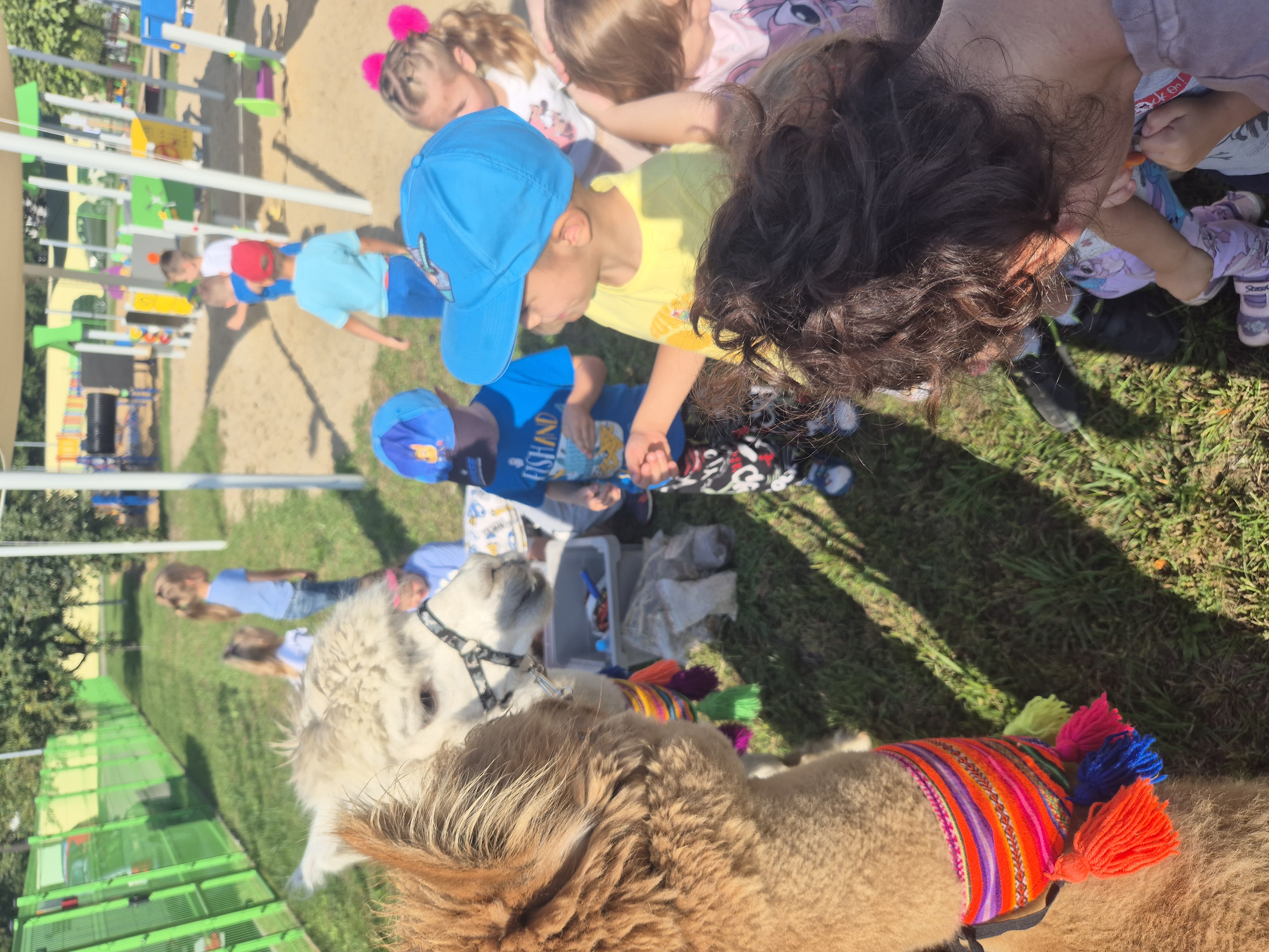 10 września nasze przedszkole odwiedziły alpaki. Alpaki, to zwierzęta o bardzo łagodnym usposobieniu. Są płochliwe i delikatne, zupełnie pozbawione agresji. Szczególnie pozytywnie nastawione są do dzieci. Głaskanie i przytulanie alpak pomaga dzieciom rozluźnić się i otworzyć. Wszystkie przedszkolaki były zachwycone ich wizytą. Śnieżek i Leoś to cudowne alpaki. Spotkanie z nimi było bardzo ciekawą lekcją edukacyjną, podczas której przedszkolaki poznały życie i zwyczaje tych przemiłych zwierząt. Dzieci wysłuchały wielu ciekawostek o alpakach. Każdy miał możliwość nakarmienia zwierzątka jego ulubionym przysmakiem – marchewką.